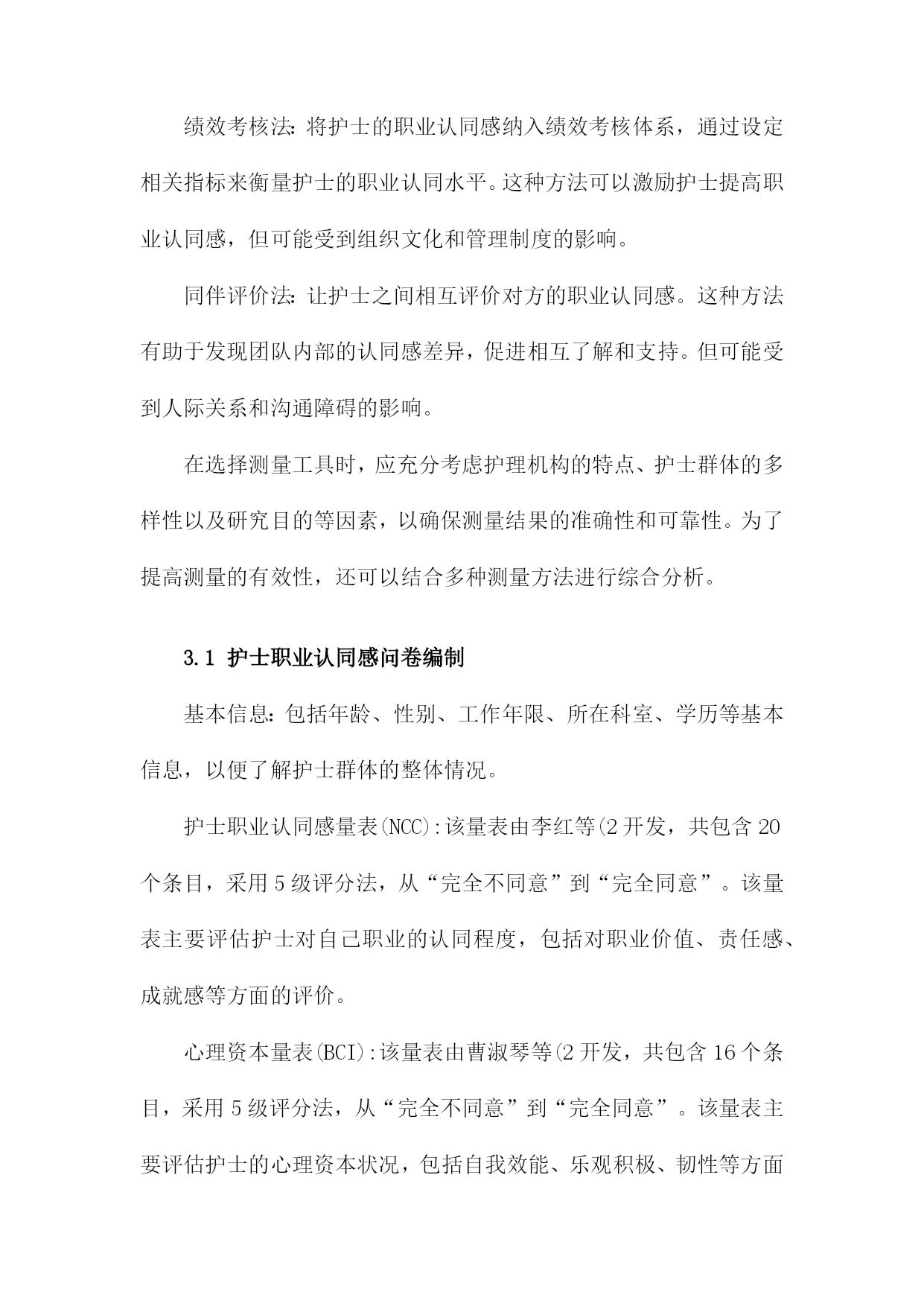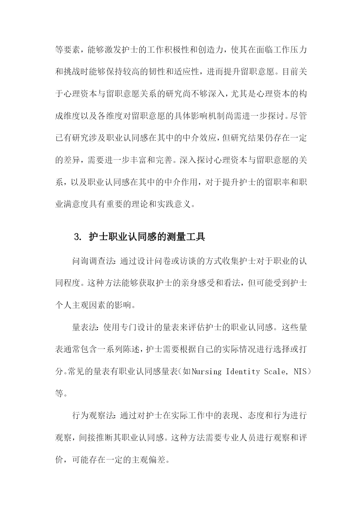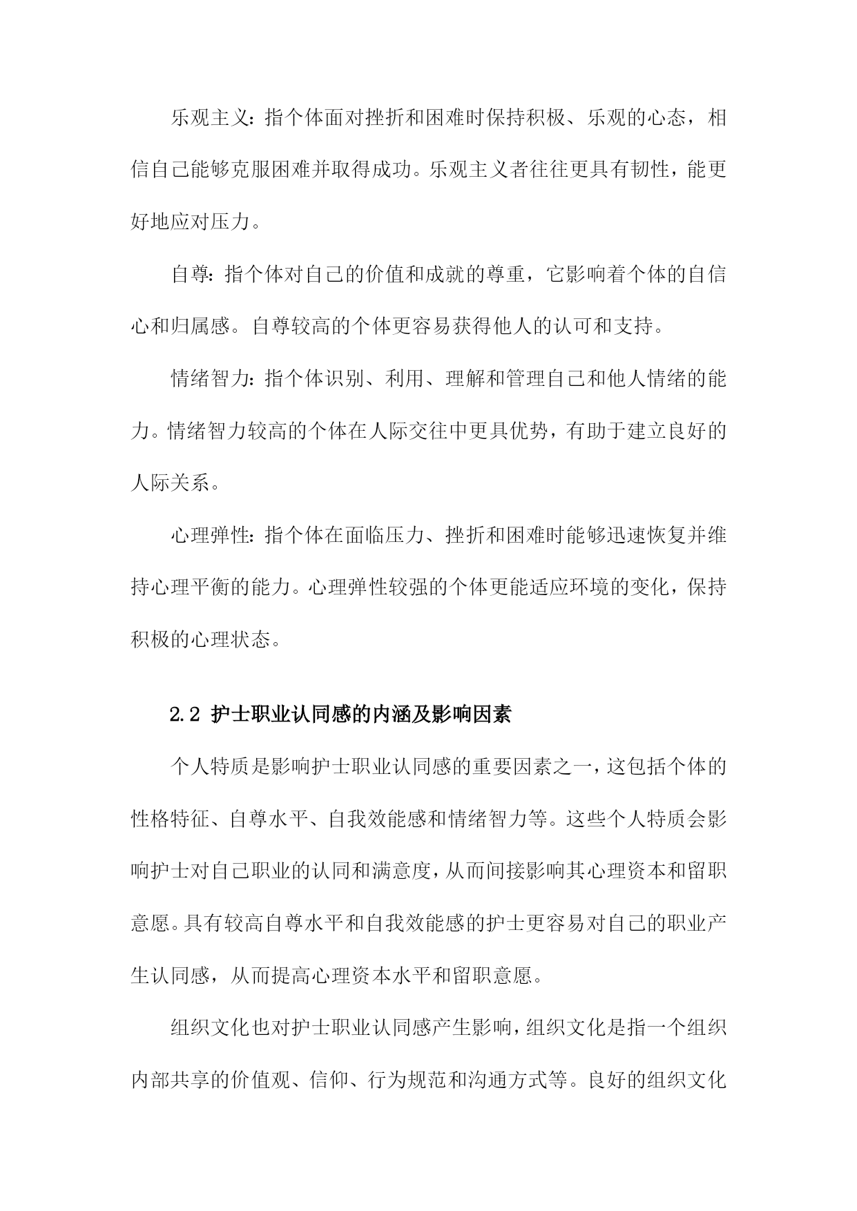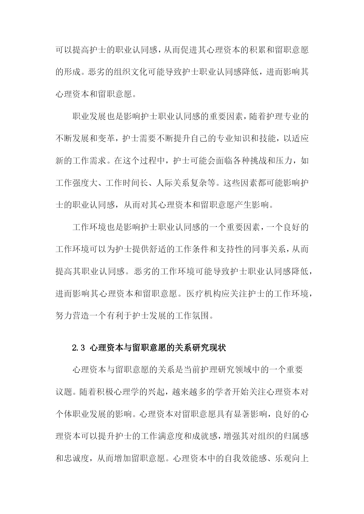 护士职业认同感在心理资本与留职意愿间的中介效应分析1.内容综述护士职业认同感已成为护理领域研究的热点问题,职业认同感是指个体对于所从事职业的肯定性价值判断和情感体验,对个体在职业生涯中的行为具有重要的影响。心理资本是指个体在心理层面上的资源,包括个体的自我效能、乐观主义、心理韧性等。留职意愿是指个体对于继续留在当前职业的意愿程度。护士职业认同感对心理资本和留职意愿具有重要影响,具有较高职业认同感的护士,往往能够更好地应对工作压力,提高工作效率和质量,从而增强心理资本。心理资本较高的护士也能更有效地管理病房,与患者建立良好的关系,提高患者的满意度,进一步降低离职意愿。护士职业认同感在心理资本与留职意愿之间扮演着重要角色,提高护士的职业认同感,有助于提高心理资本水平,从而增强留职意愿。护理管理者应重视护士职业认同感的培养,为护士提供良好的工作环境和职业发展机会,以稳定护理队伍,提高护理质量。1.1研究背景随着社会的发展和医疗水平的提高,护理工作在医疗卫生体系中的地位日益重要。护士作为医疗卫生服务的重要组成部分,承担着为患者提供全面、专业、人性化的护理服务的重要职责。护士职业认同感对个体的工作满意度、留职意愿以及心理资本具有重要的影响。心理资本是指个体在应对工作中的各种压力和挑战时所具备的心理素质,包括自我效能、乐观主义、归因于成功等。探讨护士职业认同感在心理资本与留职意愿间的中介效应对于提高护士的工作满意度、促进护理队伍的稳定和发展具有重要的理论和实践意义。1.2研究目的本研究旨在探讨护士职业认同感在心理资本与留职意愿之间的中介效应。随着医疗行业的迅速发展,护士的留职问题已成为关注的热点。护士的留职意愿直接影响到医院的运营效率和医疗服务质量,心理资本作为员工内心世界的重要组成部分,对于员工的工作态度和职业行为有着显著的影响。而职业认同感作为个人对职业的认同和归属感,对于激发员工的工作积极性和提高工作满意度具有重要作用。本研究旨在通过分析护士心理资本、职业认同感和留职意愿之间的关系,探究职业认同感在心理资本影响留职意愿过程中的中介效应,为提升护士留职率和职业满意度提供理论支持和实践指导。通过本研究,期望能够揭示心理资本、职业认同感和留职意愿之间的内在联系,为医疗机构制定有效的护士留才策略提供科学依据。1.3研究意义护士职业认同感作为心理资本的重要组成部分,对于护士的离职率具有重要影响。高职业认同感的护士更可能长期留在护理行业,为患者提供稳定、优质的护理服务。本研究通过探讨护士职业认同感在心理资本与留职意愿之间的中介效应,旨在为护理管理者提供科学依据,以提升护士的工作满意度和留职意愿,进而降低离职率,提高护理服务质量。研究护士职业认同感对留职意愿的影响,有助于理解护士这一特殊职业群体的内心需求和期望。了解护士如何看待自己的职业,以及他们认为哪些因素能够增强自己的职业认同感,有助于护理管理者制定更有针对性的政策,满足护士的合理需求,从而提高他们的留职意愿。研究护士职业认同感在心理资本与留职意愿之间的中介效应,有助于揭示心理资本对留职意愿的影响机制。心理资本包括自尊、自信、乐观等多个维度,这些维度对护士的职业认同感产生积极影响。通过探究职业认同感在心理资本各维度与留职意愿之间的中介效应,可以更深入地理解心理资本对留职意愿的影响路径和作用机制,为护理管理者提供更为有效的激励措施和管理策略。研究护士职业认同感在心理资本与留职意愿之间的中介效应,有助于推动护理行业的发展。随着医疗技术的不断进步和社会对护理服务需求的日益增长,护理行业面临着巨大的挑战和机遇。提高护士的职业认同感和留职意愿,有助于稳定护理人才队伍,提高护理服务质量,为护理行业的持续发展提供有力保障。这也有助于提升整个医疗行业的形象和声誉,吸引更多优秀人才投身护理事业。1.4研究方法本研究采用问卷调查法和结构方程模型相结合的方法进行实证分析。通过编制护士职业认同感、心理资本和留职意愿的量表,对参与调查的护士进行问卷调查,收集相关数据。运用结构方程模型对收集到的数据进行分析,以探讨护士职业认同感在心理资本与留职意愿间的中介效应。编制护士职业认同感、心理资本和留职意愿的量表。通过文献综述和专家访谈等方法,确定各量表的指标体系和评分标准。确保量表具有良好的测量学性质和较高的信度、效度。对参与调查的护士进行问卷调查。采用匿名方式,发放问卷并指导护士填写。在规定的时间内收回问卷,对回收的问卷进行数据整理和分析。利用SPSS软件对收集到的数据进行统计分析。对护士职业认同感、心理资本和留职意愿的相关性进行检验;其次,运用多元回归分析探讨护士职业认同感在心理资本与留职意愿间的中介效应。通过AMOS软件建立结构方程模型,对收集到的数据进行拟合分析。模型包括路径系数