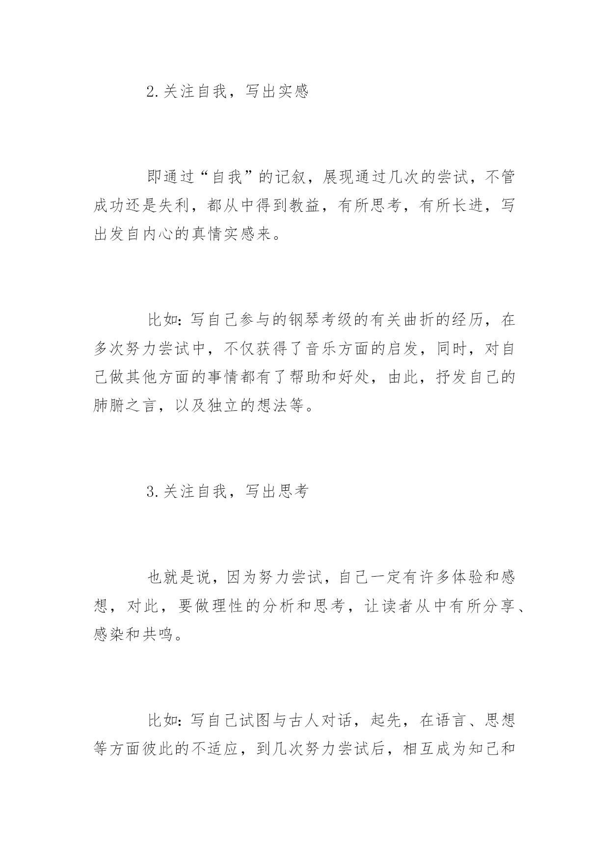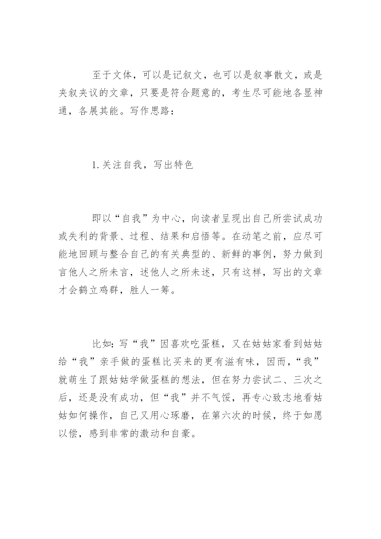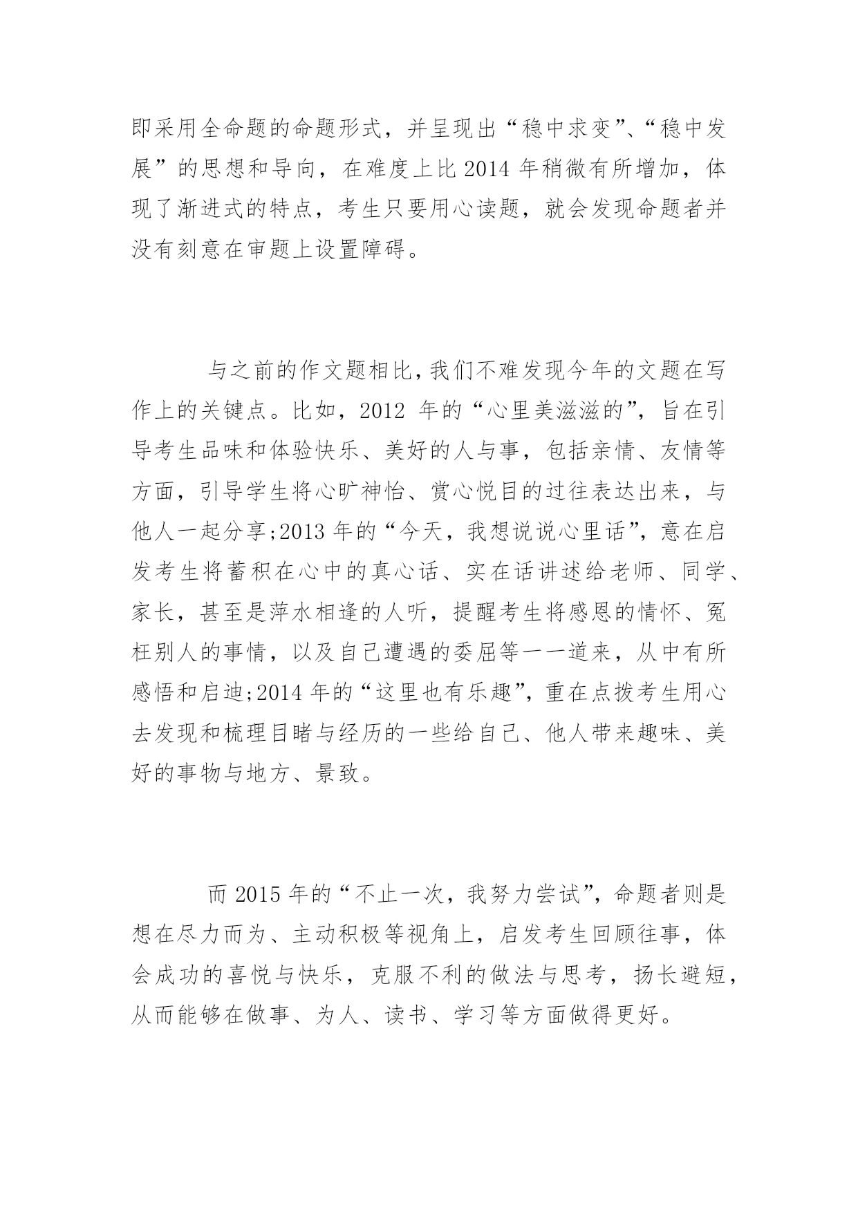 历年上海中考作文真题赏析一路上,望着远处的阳光灿烂,我努力尝试,忘却砂砾带来的疼痛;小编收集了历年中考作文真题赏析,欢迎阅读。【真题】题目:不止一次,我努力尝试要求:(1)写一篇600字左右的文章。(2)不得透露个人相关信息。(3)不得抄袭。(60分)【解读】2015年上海卷的命题形式延续了近几年的命题格局,即采用全命题的命题形式,并呈现出“稳中求变”、“稳中发展”的思想和导向,在难度上比2014年稍微有所增加,体现了渐进式的特点,考生只要用心读题,就会发现命题者并没有刻意在审题上设置障碍。与之前的作文题相比,我们不难发现今年的文题在写作上的关键点。比如,2012年的“心里美滋滋的”,旨在引导考生品味和体验快乐、美好的人与事,包括亲情、友情等方面,引导学生将心旷神怡、赏心悦目的过往表达出来,与他人一起分享;2013年的“今天,我想说说心里话”,意在启发考生将蓄积在心中的真心话、实在话讲述给老师、同学、家长,甚至是萍水相逢的人听,提醒考生将感恩的情怀、冤枉别人的事情,以及自己遭遇的委屈等一一道来,从中有所感悟和启迪;2014年的“这里也有乐趣”,重在点拨考生用心去发现和梳理目睹与经历的一些给自己、他人带来趣味、美好的事物与地方、景致。而2015年的“不止一次,我努力尝试”,命题者则是想在尽力而为、主动积极等视角上,启发考生回顾往事,体会成功的喜悦与快乐,克服不利的做法与思考,扬长避短,从而能够在做事、为人、读书、学习等方面做得更好。至于文体,可以是记叙文,也可以是叙事散文,或是夹叙夹议的文章,只要是符合题意的,考生尽可能地各显神通,各展其能。写作思路:1.关注自我,写出特色即以“自我”为中心,向读者呈现出自己所尝试成功或失利的背景、过程、结果和启悟等。在动笔之前,应尽可能地回顾与整合自己的有关典型的、新鲜的事例,努力做到言他人之所未言,述他人之所未述,只有这样,写出的文章才会鹤立鸡群,胜人一筹。比如:写“我”因喜欢吃蛋糕,又在姑姑家看到姑姑给“我”亲手做的蛋糕比买来的更有滋有味,因而,“我”就萌生了跟姑姑学做蛋糕的想法,但在努力尝试二、三次之后,还是没有成功,但“我”并不气馁,再专心致志地看姑姑如何操作,自己又用心琢磨,在第六次的时候,终于如愿以偿,感到非常的激动和自豪。2.关注自我,写出实感即通过“自我”的记叙,展现通过几次的尝试,不管成功还是失利,都从中得到教益,有所思考,有所长进,写出发自内心的真情实感来。比如:写自己参与的钢琴考级的有关曲折的经历,在多次努力尝试中,不仅获得了音乐方面的启发,同时,对自己做其他方面的事情都有了帮助和好处,由此,抒发自己的肺腑之言,以及独立的想法等。3.关注自我,写出思考也就是说,因为努力尝试,自己一定有许多体验和感想,对此,要做理性的分析和思考,让读者从中有所分享、感染和共鸣。比如:写自己试图与古人对话,起先,在语言、思想等方面彼此的不适应,到几次努力尝试后,相互成为知己和挚友,无话不谈,畅所欲言,各抒己见。【误区】误区一:审题不当。对于本道作文的写作,大部分考生审题是准确的,因而,能够扣题选材、立意,但也有一些考生,因对核心词“尝试”理解不欠当,导致偏题或扣题不紧而失分。误区二:选材不准。即有部分考生所选素材不够准确,明显带有套作、宿构之嫌,影响了得分、误区三:语言不畅。有的是引用欠当,不理解所引用古诗文和名人名言的意思;有的是生造词语,或是运用了网络语言,上下文的语意不够自然衔接、贯通和流畅。这是在构思和行文过程中表现出了的不足与缺失。误区四:立意不深。部分考生只是泛泛地记叙了自己两次或多次努力尝试的事例,但没有很好地揭示出其中蕴涵的深刻道理,显得肤浅,这实际上也是构思、谋篇缺乏整体设计的问题与失误。【范文】不止一次,我努力尝试一路上,望着远处的阳光灿烂,我努力尝试,忘却砂砾带来的疼痛;一路上,面对困难和挫折,我努力尝试,穿越丛生的荆棘,想要到达山顶。不止一次,我努力尝试。当我的指尖触上黑键白键,我就知道,我不是一个音乐天才,我必须付出比别人更多的努力。很快,我就遇到了困难。我发现别的同学指下流淌出的,是清澈的小溪,向前向前,最终汇入大海;我的琴声却总是遇见石头和高山的阻隔,断断续续。于是,我开始努力尝试。我尝试把一首曲子分成很多的小部分,然后一部分一部分去练。把每一小部分都练熟,最后连贯起来,就是一曲完整的歌。我努力地练,一段一段乐声融在空气里,一次一次忍着手的酸疼,一遍一遍甩过手后继续执著地练习。日复一日,终于,我的小溪,经过坎坎坷坷,居然也流入了一片汪洋。那一次次的努力尝试,连起一个个音符,把汗水,变成了微笑。可是后来,同学们都说我只是连贯,曲调却毫无变化。甚至还有人嘲笑我,说我根本不懂什么是弹琴。我难过,我困惑