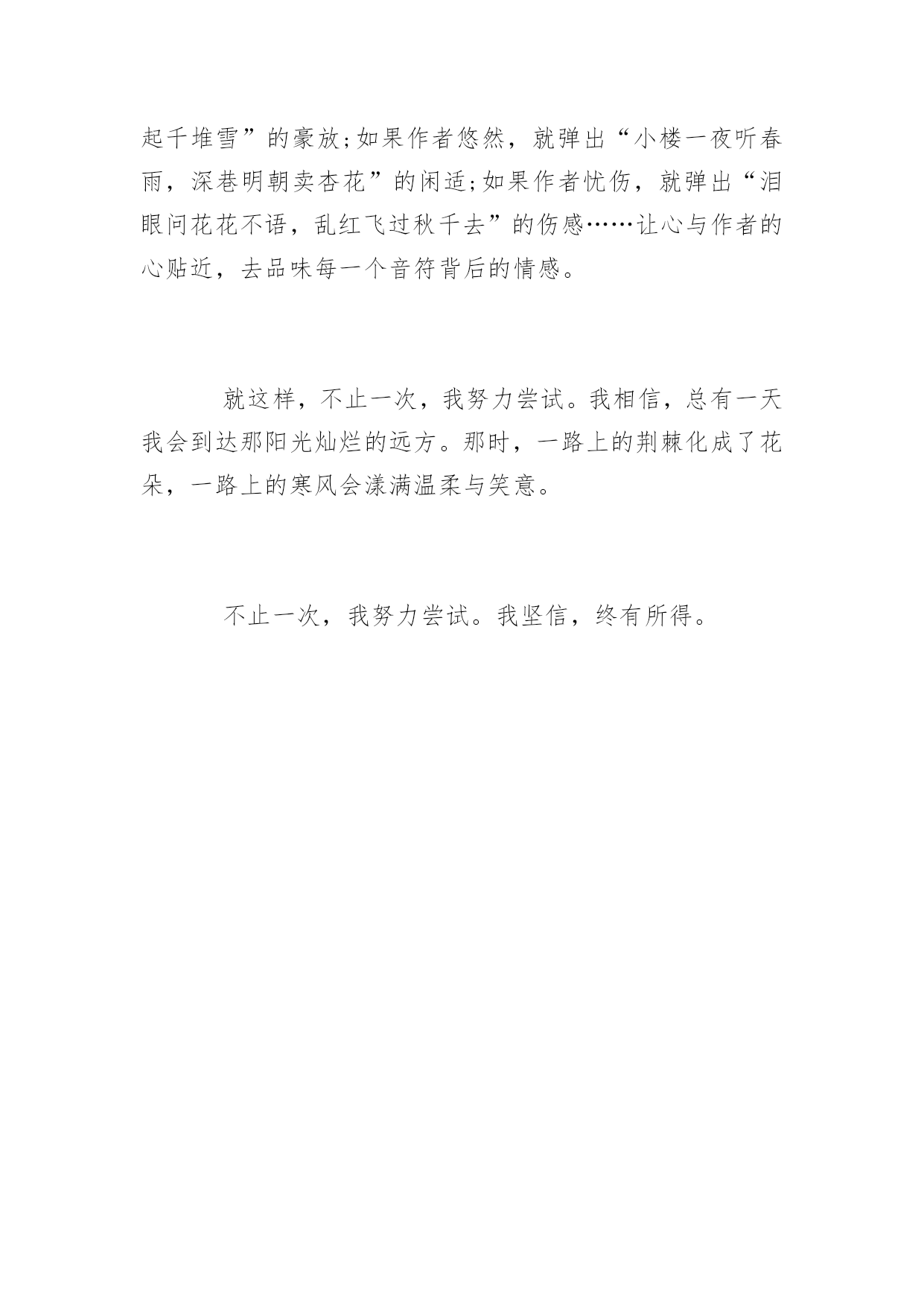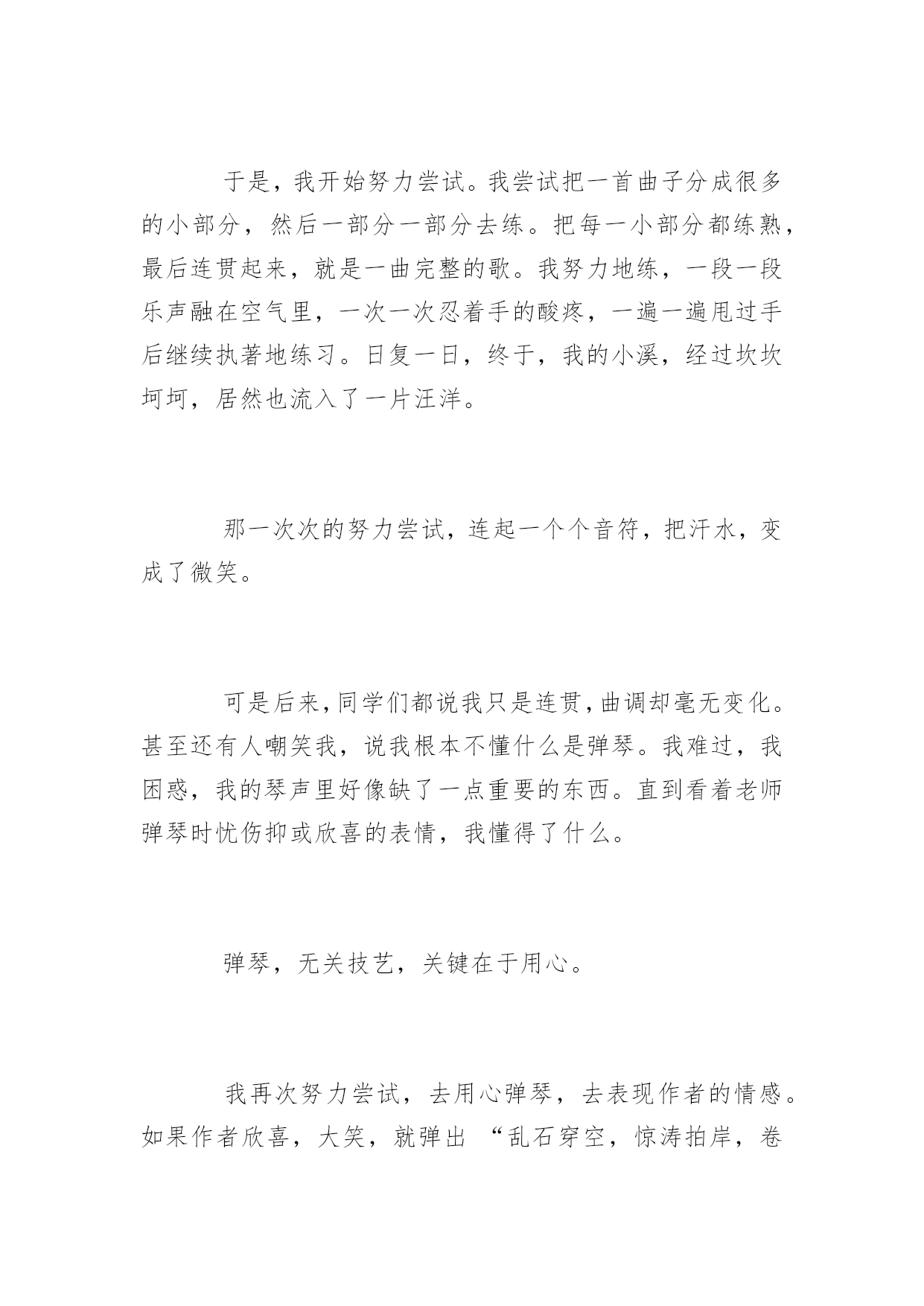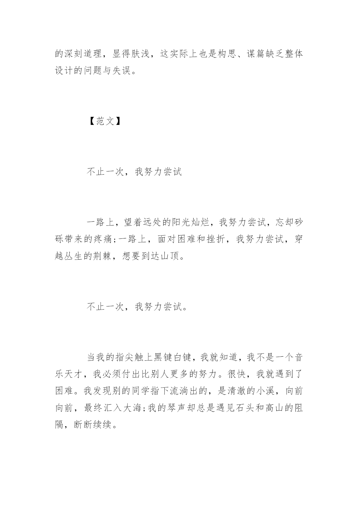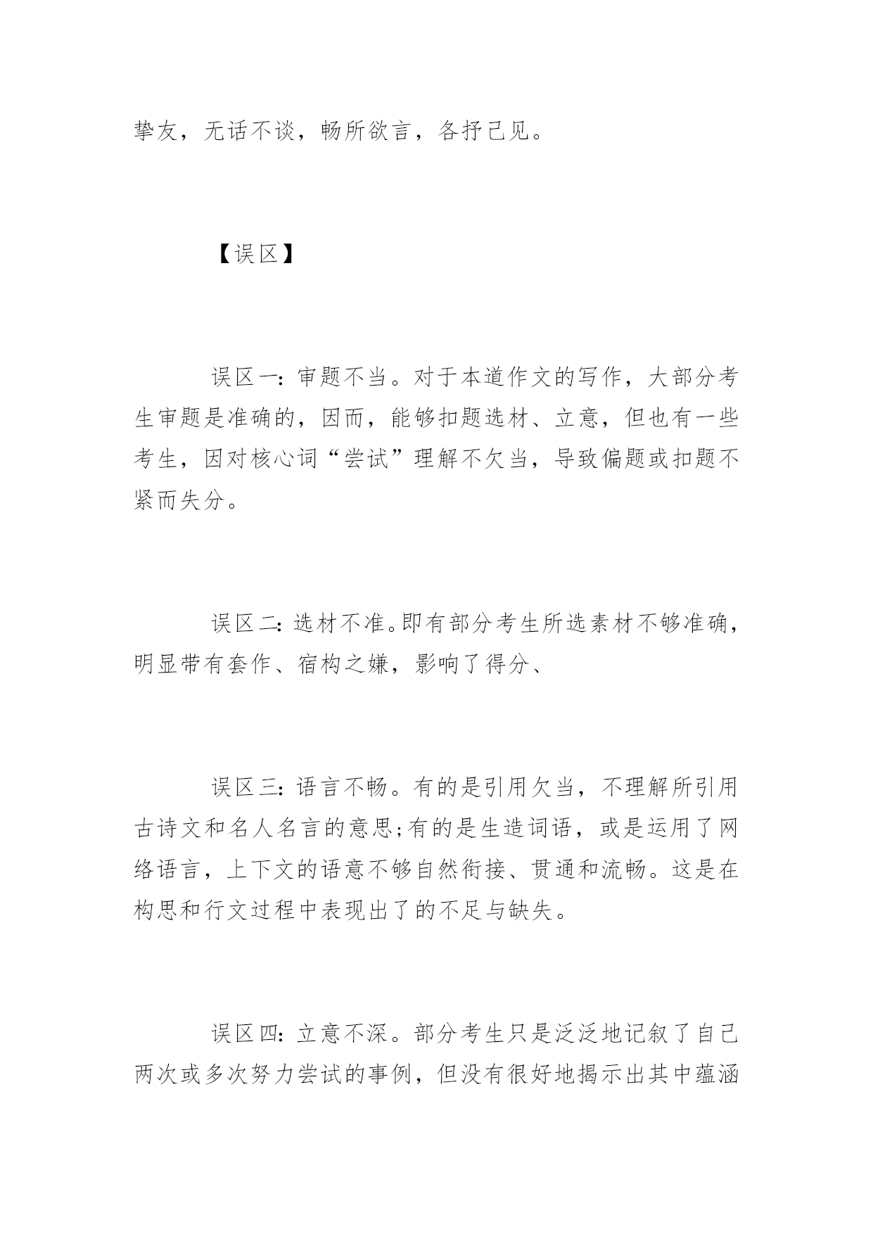 历年上海中考作文真题赏析一路上,望着远处的阳光灿烂,我努力尝试,忘却砂砾带来的疼痛;小编收集了历年中考作文真题赏析,欢迎阅读。【真题】题目:不止一次,我努力尝试要求:(1)写一篇600字左右的文章。(2)不得透露个人相关信息。(3)不得抄袭。(60分)【解读】2015年上海卷的命题形式延续了近几年的命题格局,即采用全命题的命题形式,并呈现出“稳中求变”、“稳中发展”的思想和导向,在难度上比2014年稍微有所增加,体现了渐进式的特点,考生只要用心读题,就会发现命题者并没有刻意在审题上设置障碍。与之前的作文题相比,我们不难发现今年的文题在写作上的关键点。比如,2012年的“心里美滋滋的”,旨在引导考生品味和体验快乐、美好的人与事,包括亲情、友情等方面,引导学生将心旷神怡、赏心悦目的过往表达出来,与他人一起分享;2013年的“今天,我想说说心里话”,意在启发考生将蓄积在心中的真心话、实在话讲述给老师、同学、家长,甚至是萍水相逢的人听,提醒考生将感恩的情怀、冤枉别人的事情,以及自己遭遇的委屈等一一道来,从中有所感悟和启迪;2014年的“这里也有乐趣”,重在点拨考生用心去发现和梳理目睹与经历的一些给自己、他人带来趣味、美好的事物与地方、景致。而2015年的“不止一次,我努力尝试”,命题者则是想在尽力而为、主动积极等视角上,启发考生回顾往事,体会成功的喜悦与快乐,克服不利的做法与思考,扬长避短,从而能够在做事、为人、读书、学习等方面做得更好。至于文体,可以是记叙文,也可以是叙事散文,或是夹叙夹议的文章,只要是符合题意的,考生尽可能地各显神通,各展其能。写作思路:1.关注自我,写出特色即以“自我”为中心,向读者呈现出自己所尝试成功或失利的背景、过程、结果和启悟等。在动笔之前,应尽可能地回顾与整合自己的有关典型的、新鲜的事例,努力做到言他人之所未言,述他人之所未述,只有这样,写出的文章才会鹤立鸡群,胜人一筹。比如:写“我”因喜欢吃蛋糕,又在姑姑家看到姑姑给“我”亲手做的蛋糕比买来的更有滋有味,因而,“我”就萌生了跟姑姑学做蛋糕的想法,但在努力尝试二、三次之后,还是没有成功,但“我”并不气馁,再专心致志地看姑姑如何操作,自己又用心琢磨,在第六次的时候,终于如愿以偿,感到非常的激动和自豪。2.关注自我,写出实感即通过“自我”的记叙,展现通过几次的尝试,不管成功还是失利,都从中得到教益,有所思考,有所长进,写出发自内心的真情实感来。比如:写自己参与的钢琴考级的有关曲折的经历,在多次努力尝试中,不仅获得了音乐方面的启发,同时,对自己做其他方面的事情都有了帮助和好处,由此,抒发自己的肺腑之言,以及独立的想法等。3.关注自我,写出思考也就是说,因为努力尝试,自己一定有许多体验和感想,对此,要做理性的分析和思考,让读者从中有所分享、感染和共鸣。比如:写自己试图与古人对话,起先,在语言、思想等方面彼此的不适应,到几次努力尝试后,相互成为知己和挚友,无话不谈,畅所欲言,各抒己见。【误区】误区一:审题不当。对于本道作文的写作,大部分考生审题是准确的,因而,能够扣题选材、立意,但也有一些考生,因对核心词“尝试”理解不欠当,导致偏题或扣题不紧而失分。误区二:选材不准。即有部分考生所选素材不够准确,明显带有套作、宿构之嫌,影响了得分、误区三:语言不畅。有的是引用欠当,不理解所引用古诗文和名人名言的意思;有的是生造词语,或是运用了网络语言,上下文的语意不够自然衔接、贯通和流畅。这是在构思和行文过程中表现出了的不足与缺失。误区四:立意不深。部分考生只是泛泛地记叙了自己两次或多次努力尝试的事例,但没有很好地揭示出其中蕴涵的深刻道理,显得肤浅,这实际上也是构思、谋篇缺乏整体设计的问题与失误。【范文】不止一次,我努力尝试一路上,望着远处的阳光灿烂,我努力尝试,忘却砂砾带来的疼痛;一路上,面对困难和挫折,我努力尝试,穿越丛生的荆棘,想要到达山顶。不止一次,我努力尝试。当我的指尖触上黑键白键,我就知道,我不是一个音乐天才,我必须付出比别人更多的努力。很快,我就遇到了困难。我发现别的同学指下流淌出的,是清澈的小溪,向前向前,最终汇入大海;我的琴声却总是遇见石头和高山的阻隔,断断续续。于是,我开始努力尝试。我尝试把一首曲子分成很多的小部分,然后一部分一部分去练。把每一小部分都练熟,最后连贯起来,就是一曲完整的歌。我努力地练,一段一段乐声融在空气里,一次一次忍着手的酸疼,一遍一遍甩过手后继续执著地练习。日复一日,终于,我的小溪,经过坎坎坷坷,居然也流入了一片汪洋。那一次次的努力尝试,连起一个个音符,把汗水,变成了微笑。可是后来,同学们都说我只是连贯,曲调却毫无变化。甚至还有人嘲笑我,说我根本不懂什么是弹琴。我难过,我困惑