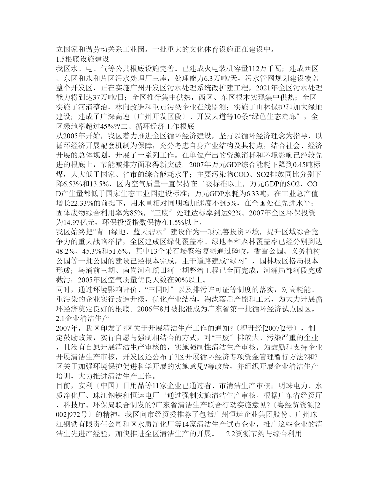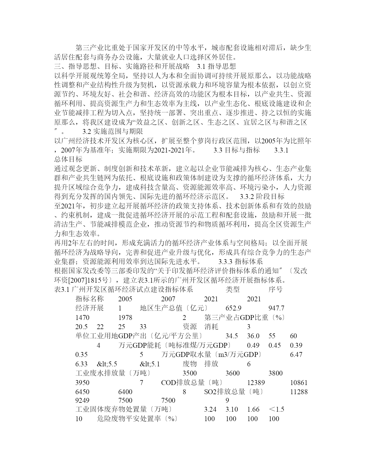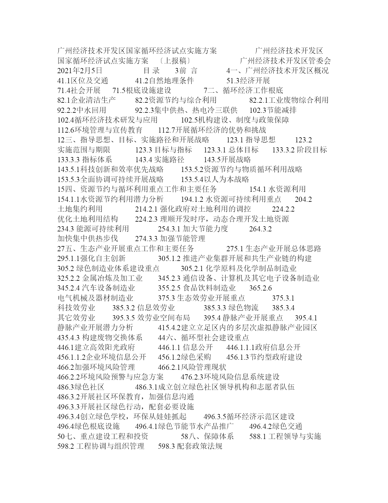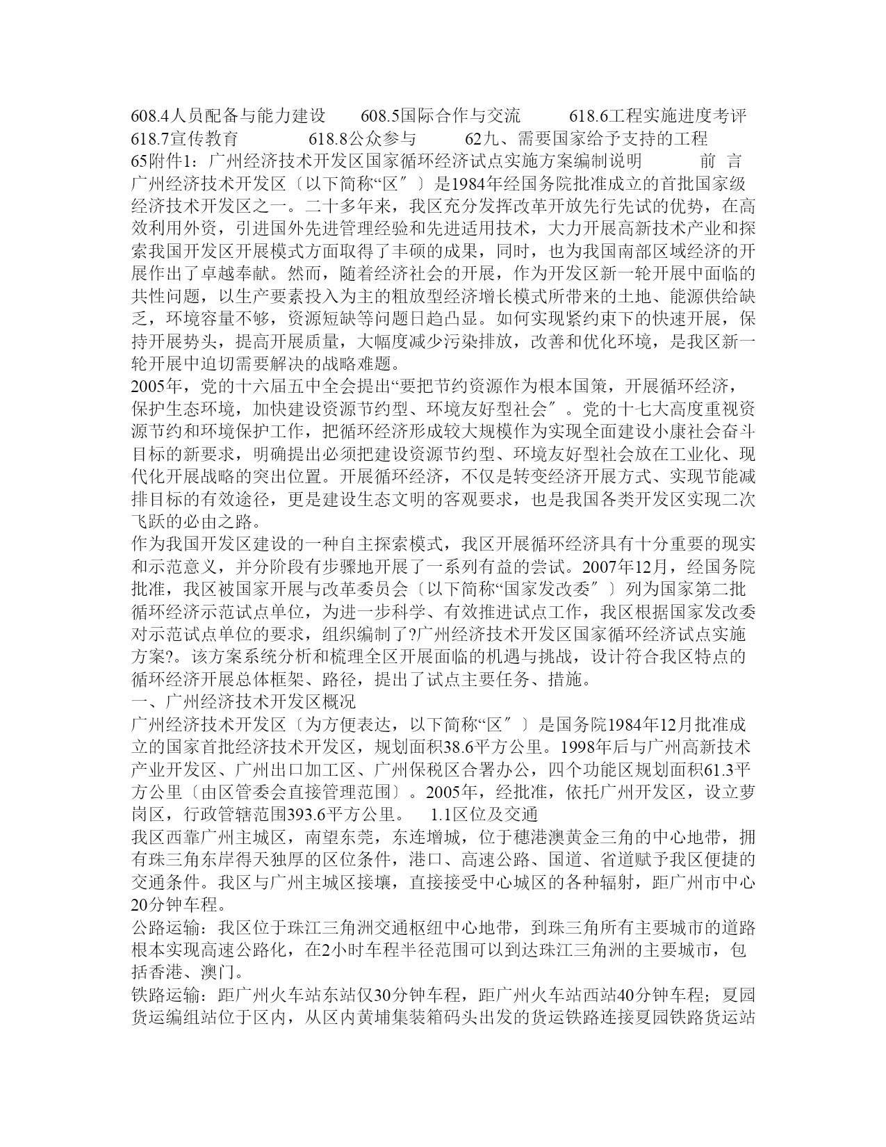 广州经济技术开发区国家循环经济试点实施方案(上报稿)【完整版】(文档可以直接使用,也可根据实际需要修订后使用,可编辑放心下载)广州经济技术开发区国家循环经济试点实施方案广州经济技术开发区国家循环经济试点实施方案〔上报稿〕广州经济技术开发区管委会2021年2月5日目录3前言4一、广州经济技术开发区概况41.1区位及交通41.2自然地理条件51.3经济开展71.4社会开展71.5根底设施建设7二、循环经济工作根底82.1企业清洁生产82.2资源节约与综合利用82.2.1工业废物综合利用92.2.2中水回用92.2.3集中供热、热电冷三联供102.3节能减排102.4循环经济技术研发与应用102.5机构建设、制度与政策保障112.6环境管理与宣传教育112.7开展循环经济的优势和挑战12三、指导思想、目标、实施路径和开展战略123.1指导思想123.2实施范围与期限123.3目标与指标123.3.1总体目标133.3.2阶段目标133.3.3指标体系143.4实施路径143.5开展战略143.5.1科技创新和效率优先战略153.5.2资源节约与物质循环利用战略153.5.3全面协调可持续开展战略153.5.4以人为本战略15四、资源节约与循环利用重点工作和主要任务154.1水资源利用154.1.1水资源节约利用潜力分析194.1.2水资源可持续利用重点204.2土地集约利用214.2.1强化政府对土地利用的调控224.2.2优化土地利用结构224.2.3理顺开发时序,动态合理开发土地资源234.3能源可持续利用254.3.1加大节能力度264.3.2加快集中供热步伐274.3.3加强节能管理27五、生态产业开展重点工作和主要任务275.1生态产业开展总体思路295.1.1强化自主创新305.1.2推进产业集群开展和共生产业链的构建305.2绿色制造业体系建设重点305.2.1化学原料及化学制品制造业325.2.2金属冶炼及加工业345.2.3通信设备、计算机及其它电子设备制造业345.2.4汽车设备制造业355.2.5食品饮料制造业365.2.6电气机械及器材制造业375.3生态效劳业开展重点375.3.1科技效劳业385.3.2信息效劳业385.3.3绿色物流385.3.4其它效劳业395.3.5效劳业空间布局395.4静脉产业开展重点395.4.1静脉产业开展潜力分析415.4.2建立立足区内的多层次虚拟静脉产业园区435.4.3构建废物交换体系44六、循环型社会建设重点446.1建立高效阳光政府446.1.1信息公开446.1.1.1政府信息公开456.1.1.2企业环境信息公开456.1.2绿色采购456.1.3节约型政府建设466.2加强环境风险管理466.2.1风险管理现状466.2.2环境风险预警与应急方案476.2.3环境风险信息系统建设486.3绿色社区486.3.1成立创立绿色社区领导机构和志愿者队伍486.3.2开展社区环保教育,加强信息沟通496.3.3开展社区绿色行动,配套必要设施496.3.4创立绿色学校,环保从娃娃抓起496.3.5循环经济示范区建设496.4绿色根底设施496.4.1绿色节能节水产品推广496.4.2绿色交通50七、重点建设工程和投资58八、保障体系588.1工程领导与实施598.2工程协调与组织管理598.3配套政策法规608.4人员配备与能力建设608.5国际合作与交流618.6工程实施进度考评618.7宣传教育618.8公众参与62九、需要国家给予支持的工程65附件1:广州经济技术开发区国家循环经济试点实施方案编制说明前言广州经济技术开发区〔以下简称“区〞〕是1984年经国务院批准成立的首批国家级经济技术开发区之一。二十多年来,我区充分发挥改革开放先行先试的优势,在高效利用外资,引进国外先进管理经验和先进适用技术,大力开展高新技术产业和探索我国开发区开展模式方面取得了丰硕的成果,同时,也为我国南部区域经济的开展作出了卓越奉献。然而,随着经济社会的开展,作为开发区新一轮开展中面临的共性问题,以生产要素投入为主的粗放型经济增长模式所带来的土地、能源供给缺乏,环境容量不够,资源短缺等问题日趋凸显。如何实现紧约束下的快速开展,保持开展势头,提高开展质量,大