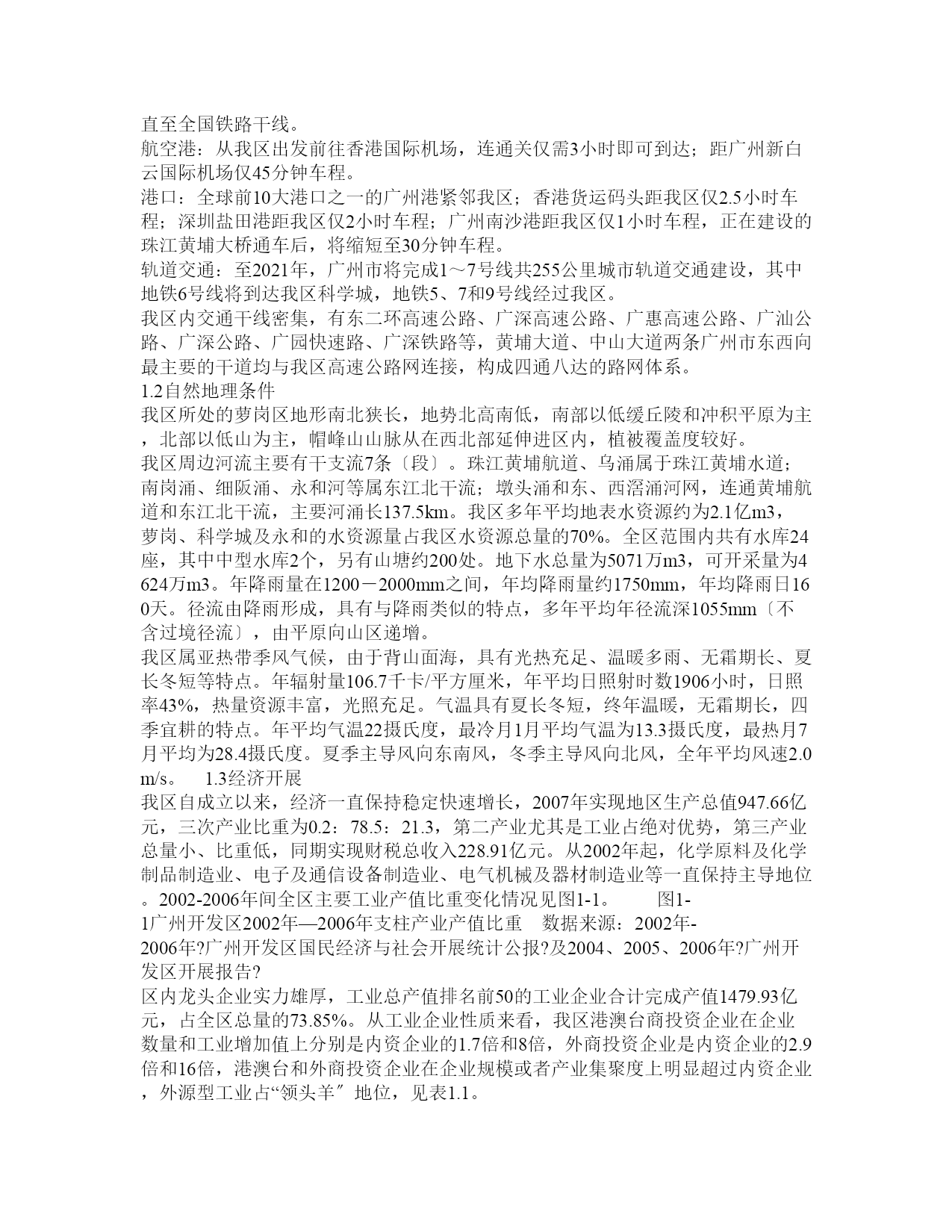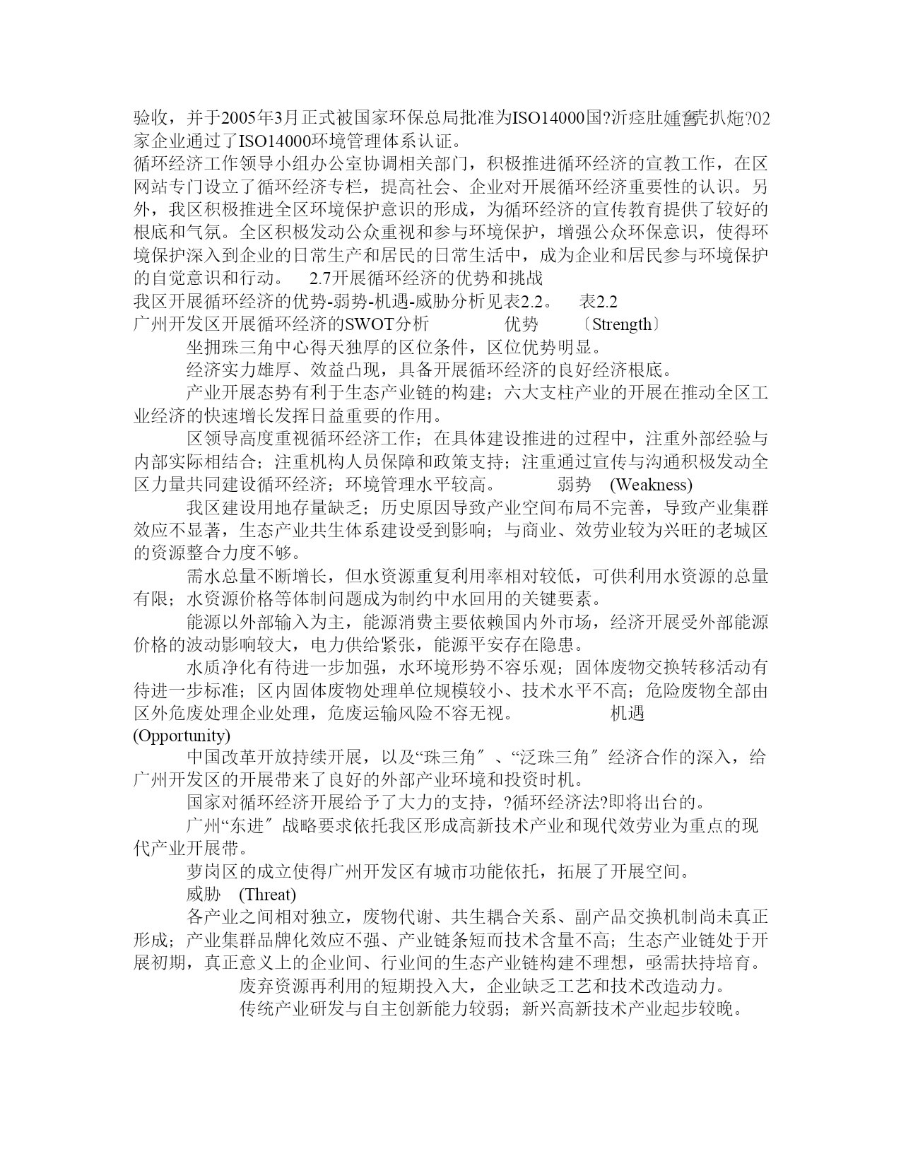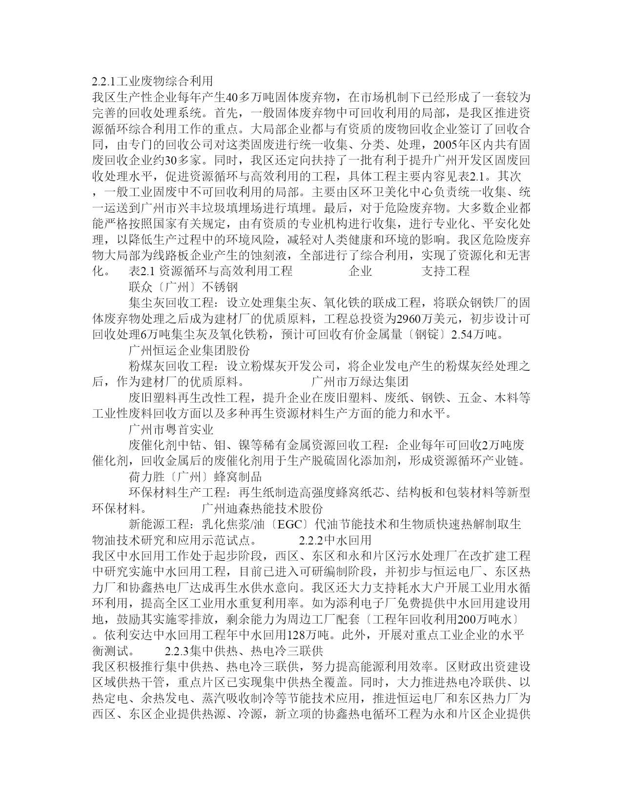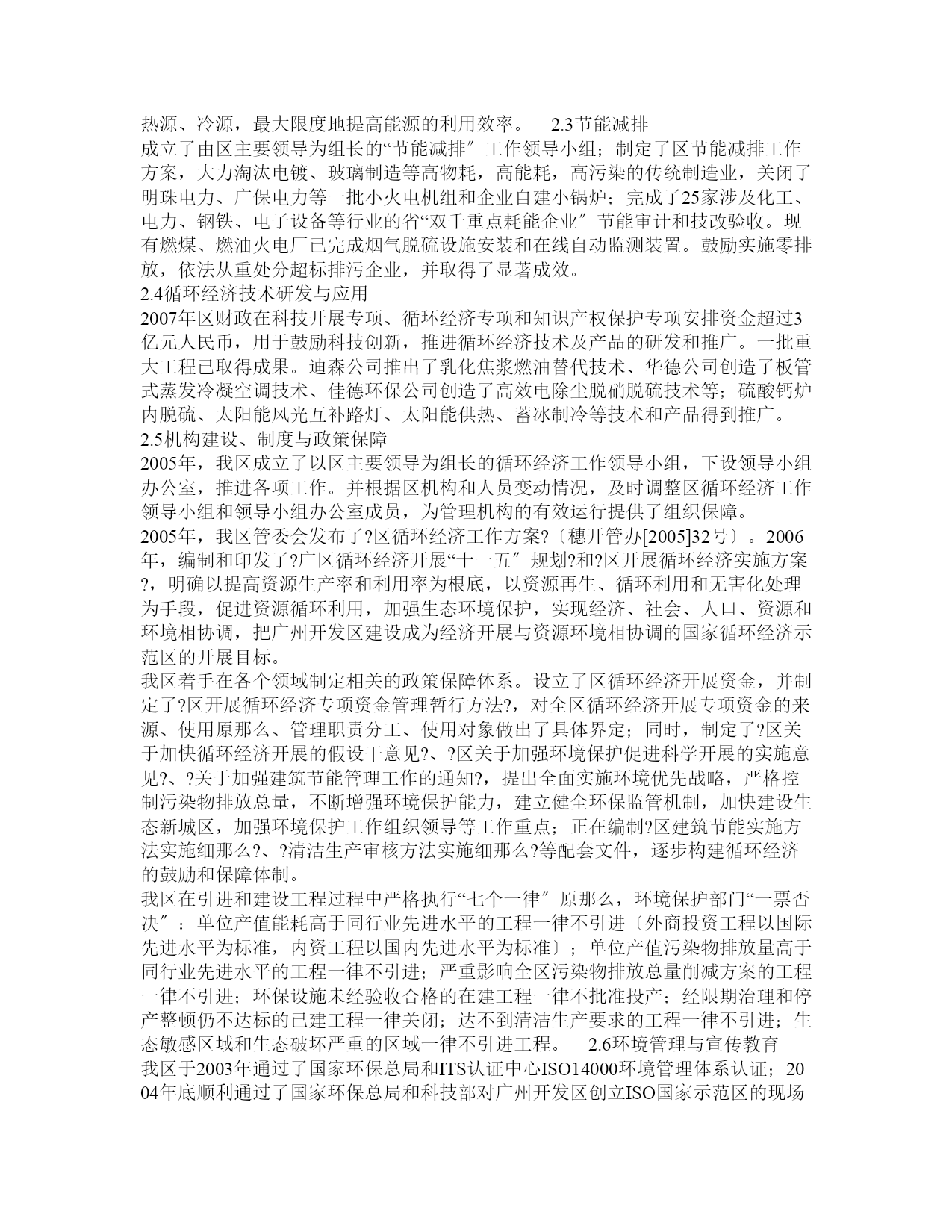 广州经济技术开发区国家循环经济试点实施方案(上报稿)【完整版】(文档可以直接使用,也可根据实际需要修订后使用,可编辑放心下载)广州经济技术开发区国家循环经济试点实施方案广州经济技术开发区国家循环经济试点实施方案〔上报稿〕广州经济技术开发区管委会2021年2月5日目录3前言4一、广州经济技术开发区概况41.1区位及交通41.2自然地理条件51.3经济开展71.4社会开展71.5根底设施建设7二、循环经济工作根底82.1企业清洁生产82.2资源节约与综合利用82.2.1工业废物综合利用92.2.2中水回用92.2.3集中供热、热电冷三联供102.3节能减排102.4循环经济技术研发与应用102.5机构建设、制度与政策保障112.6环境管理与宣传教育112.7开展循环经济的优势和挑战12三、指导思想、目标、实施路径和开展战略123.1指导思想123.2实施范围与期限123.3目标与指标123.3.1总体目标133.3.2阶段目标133.3.3指标体系143.4实施路径143.5开展战略143.5.1科技创新和效率优先战略153.5.2资源节约与物质循环利用战略153.5.3全面协调可持续开展战略153.5.4以人为本战略15四、资源节约与循环利用重点工作和主要任务154.1水资源利用154.1.1水资源节约利用潜力分析194.1.2水资源可持续利用重点204.2土地集约利用214.2.1强化政府对土地利用的调控224.2.2优化土地利用结构224.2.3理顺开发时序,动态合理开发土地资源234.3能源可持续利用254.3.1加大节能力度264.3.2加快集中供热步伐274.3.3加强节能管理27五、生态产业开展重点工作和主要任务275.1生态产业开展总体思路295.1.1强化自主创新305.1.2推进产业集群开展和共生产业链的构建305.2绿色制造业体系建设重点305.2.1化学原料及化学制品制造业325.2.2金属冶炼及加工业345.2.3通信设备、计算机及其它电子设备制造业345.2.4汽车设备制造业355.2.5食品饮料制造业365.2.6电气机械及器材制造业375.3生态效劳业开展重点375.3.1科技效劳业385.3.2信息效劳业385.3.3绿色物流385.3.4其它效劳业395.3.5效劳业空间布局395.4静脉产业开展重点395.4.1静脉产业开展潜力分析415.4.2建立立足区内的多层次虚拟静脉产业园区435.4.3构建废物交换体系44六、循环型社会建设重点446.1建立高效阳光政府446.1.1信息公开446.1.1.1政府信息公开456.1.1.2企业环境信息公开456.1.2绿色采购456.1.3节约型政府建设466.2加强环境风险管理466.2.1风险管理现状466.2.2环境风险预警与应急方案476.2.3环境风险信息系统建设486.3绿色社区486.3.1成立创立绿色社区领导机构和志愿者队伍486.3.2开展社区环保教育,加强信息沟通496.3.3开展社区绿色行动,配套必要设施496.3.4创立绿色学校,环保从娃娃抓起496.3.5循环经济示范区建设496.4绿色根底设施496.4.1绿色节能节水产品推广496.4.2绿色交通50七、重点建设工程和投资58八、保障体系588.1工程领导与实施598.2工程协调与组织管理598.3配套政策法规608.4人员配备与能力建设608.5国际合作与交流618.6工程实施进度考评618.7宣传教育618.8公众参与62九、需要国家给予支持的工程65附件1:广州经济技术开发区国家循环经济试点实施方案编制说明前言广州经济技术开发区〔以下简称“区〞〕是1984年经国务院批准成立的首批国家级经济技术开发区之一。二十多年来,我区充分发挥改革开放先行先试的优势,在高效利用外资,引进国外先进管理经验和先进适用技术,大力开展高新技术产业和探索我国开发区开展模式方面取得了丰硕的成果,同时,也为我国南部区域经济的开展作出了卓越奉献。然而,随着经济社会的开展,作为开发区新一轮开展中面临的共性问题,以生产要素投入为主的粗放型经济增长模式所带来的土地、能源供给缺乏,环境容量不够,资源短缺等问题日趋凸显。如何实现紧约束下的快速开展,保持开展势头,提高开展质量,大