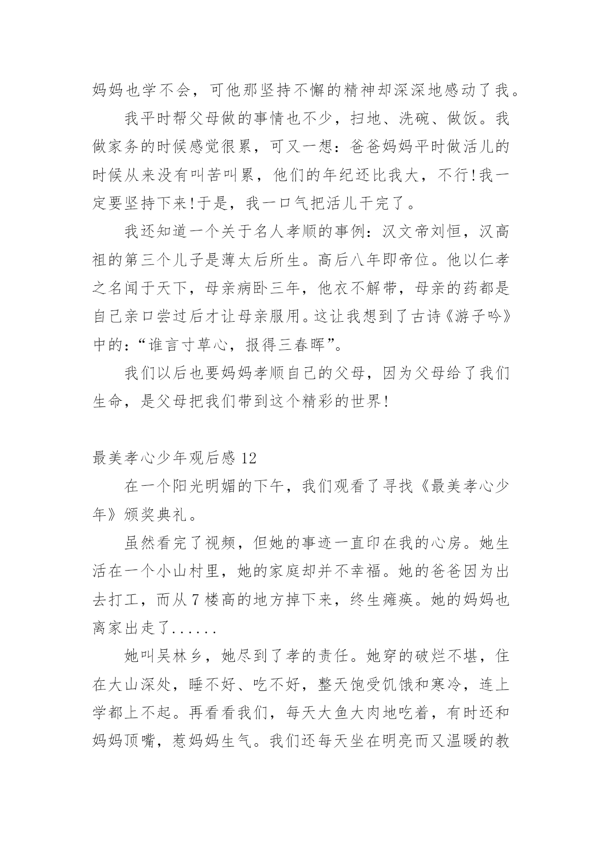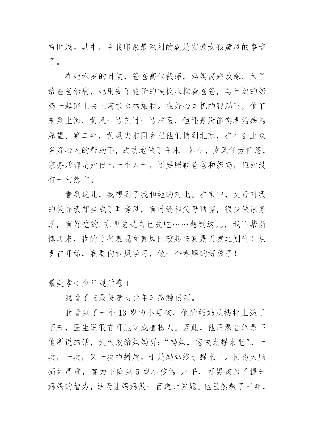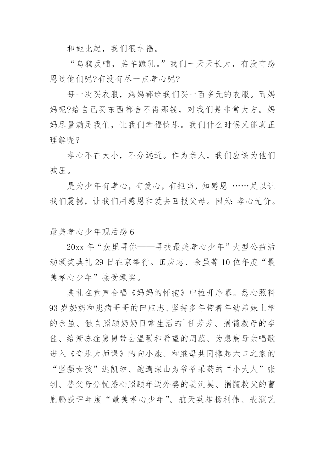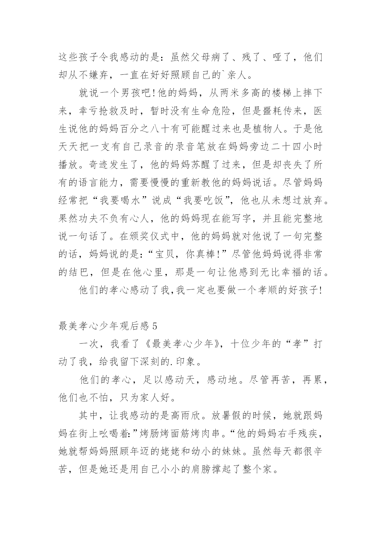最美孝心少年观后感【荐】最美孝心少年观后感细细品味一部作品以后,相信你会有不少感想吧,这时候十分有必须要写一篇观后感了!观后感你想好怎么写了吗?以下是小编精心整理的最美孝心少年观后感,欢迎阅读与收藏。最美孝心少年观后感1赵文龙、黄凤、吴林香、徐泌烨、林章雨、何秀巡、高雨欣、路玉婷、龙花、邵帅、王秀芹,这十一颗闪闪发光的红星,从黑龙江亮到湖南,从北到南,到处都有这11位最美孝心少年的身影。赵文龙的母亲身患尿毒症,每周两次透析,这是维持他母亲生命唯一的办法。赵文龙每次把母亲送到医院再去上学,放学再把母亲接回来。如今,他已经走了3000多公里,磨破了二十多双鞋。古人云:“乌鸦有反哺之孝,羊有跪乳之恩。板车女孩黄凤。他的父亲外出打工的'时候,不慎落到了楼下,脊椎骨粉碎性骨折。她偶然听到了上海一家医院能治这种病,她就推着一个板车,带着父亲去治病。看看我们,基本上都是衣来伸手饭来张口的小皇帝,洗个袜子都是一件大事,就不用说帮父母打扫卫生、做饭,甚至于送父母去医院治病。我们没有他们的坎坷,但是我们依然要孝敬父母,不惹父母生气,不随意乱花钱,不大吵大闹,做一些力所能及的事情。让我们行动起来,让孝心一直在我们的身边继续。最美孝心少年观后感2今天晚上,老师组织我们全班同学一起观看了“众里寻你—寻找最美孝心少年”颁奖典礼。看完后,我非常感动,因为节目里的小朋友都太爱太爱自己的父母了。其中有一名小女孩叫XX。她曾经有一个幸福的家,妈妈养猪料理家务,爸爸做零工,一家人的生活虽然平淡,也不富裕,但是很幸福和谐。然尔有一天,母亲得了白血病,需要很多钱,妈妈为了这个家而一度放弃。懂事的小XX每天开导安慰母亲。母亲也强忍着病痛坚持绣了一幅名叫“旭日东升”的十字绣,送给女儿做为嫁妆。小XX内心深知这份礼物的.厚重,也知道母亲的苦心。不仅卖掉了自己心爱的礼物,还努力向记者求助,希望能挽救母亲的生命,到最后也不能如愿以偿。XX的美是令人赞叹的心灵美,是世界上真正的美。我们要以小XX为榜样,发扬“百善孝为先”的中华传统美德。最美孝心少年观后感3今天,我们观看了《寻找最美孝心少年颁奖典礼》,节目里,最令我感动的就是吴林香了。吴林香的爸爸很早就去世了,妈妈得了癌症,奶奶浑身瘫痪,弟弟妹妹年幼,13岁的吴林香就成了家里的顶梁柱。这个年龄本来应该在温暖的'家庭里,享受父母的疼爱,可是,现在这个家庭沉寂在痛苦的世界里。洗衣服、做饭、照顾弟弟妹妹等等一切家务活都落在了吴林香的身上。但是,她从来没有抱怨,也没有消极,每天都坚强的用微笑来面对这些困难。后来,妈妈胃癌复发,一度不想活了,吴林香就鼓励妈妈说:“你一定不要放弃,一定要坚强的活下去,我们需要你,这个家离不开你”。妈妈都感动的哭了。看看吴林香他们,再看看自己,从小爸爸妈妈对我疼爱有加,我几乎是衣来伸手饭来张口,有时为了一点小事就和妈妈顶嘴,心里非常惭愧。我今后一定要多孝顺父母,自己能做的事自己做,还要帮妈妈干一些力所能及的家务活。我现在最重要的任务就是好好学习,健康快乐的成长,这也是我对父母最好的回报。最美孝心少年观后感4今天我们在学校观看了《寻找最美孝心少年》的颁奖仪式。他们都出生在贫困家庭,而且他们的父母有的身亡,有的残疾,有的从楼梯上摔下来不会说话了,还有的甚至因为夫妻一方去世、而另一方得了精神病至今还在医院里躺着。这些孩子令我感动的是:虽然父母病了、残了、哑了,他们却从不嫌弃,一直在好好照顾自己的`亲人。就说一个男孩吧!他的妈妈,从两米多高的楼梯上摔下来,幸亏抢救及时,暂时没有生命危险,但是噩耗传来,医生说他的妈妈百分之八十有可能醒过来也是植物人。于是他天天把一支有自己录音的录音笔放在妈妈旁边二十四小时播放。奇迹发生了,他的妈妈苏醒了过来,但是却丧失了所有的语言能力,需要慢慢的重新教他的妈妈说话。尽管妈妈经常把“我要喝水”说成“我要吃饭”,他也从未想过放弃。果然功夫不负有心人,他的妈妈现在能写字,并且能完整地说一句话了。在颁奖仪式中,他的妈妈就对他说了一句完整的话,妈妈说的是:“宝贝,你真棒!”尽管他妈妈说得非常的结巴,但是在他心里,那是一句让他感到无比幸福的话。他们的孝心感动了我,我一定也要做一个孝顺的好孩子!最美孝心少年观后感5一次,我看了《最美孝心少年》,十位少年的“孝”打动了我,给我留下深刻的.印象。他们的孝心,足以感动天,感动地。尽管再苦,再累,他们也不怕,只为家人好。其中,让我感动的是高雨欣。放暑假的时候,她就跟妈妈在街上吆喝着:”烤肠烤面筋烤肉串。“他的妈妈右手残疾,她就帮妈妈照顾年迈的姥姥和幼小的妹妹。虽然每天都很辛苦,但是她还是用自己小小的肩膀撑起了整个家。和她比起,我们很幸福。“乌鸦反哺,羔羊跪乳。”我们一天天长大,有没有感恩过他们呢?有没有尽一点孝心呢?每一次买衣服,妈妈都给我们买一百多元的衣