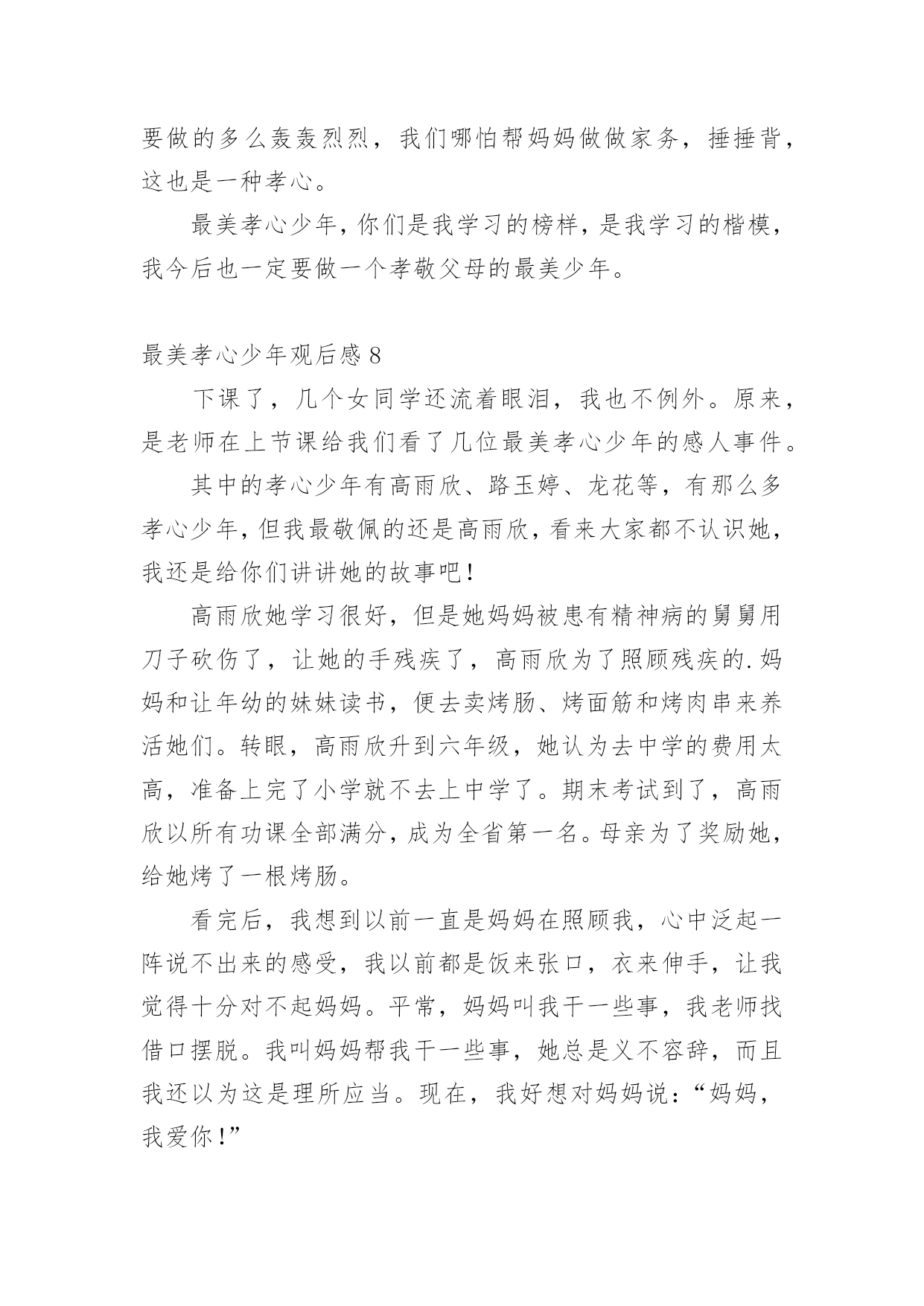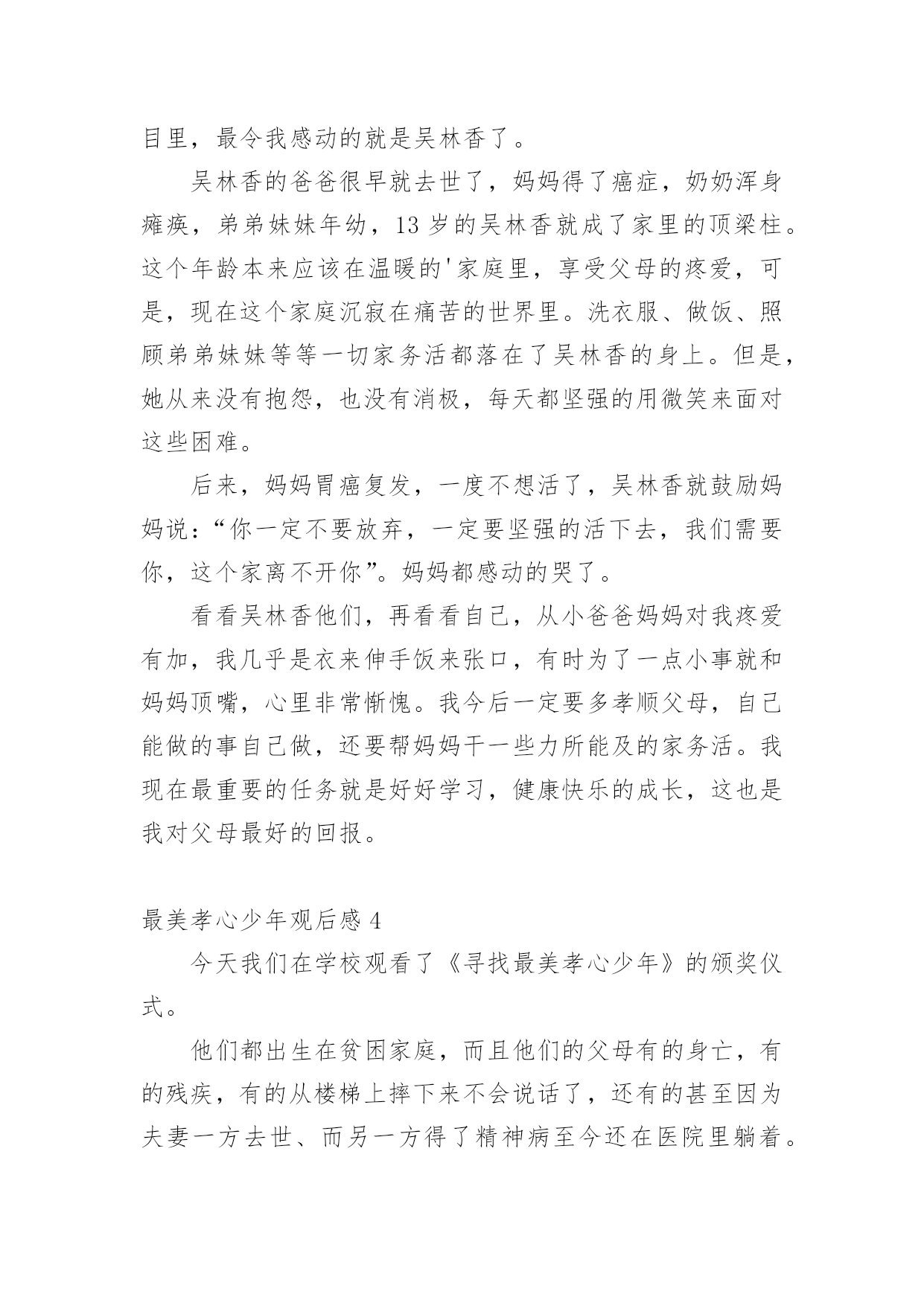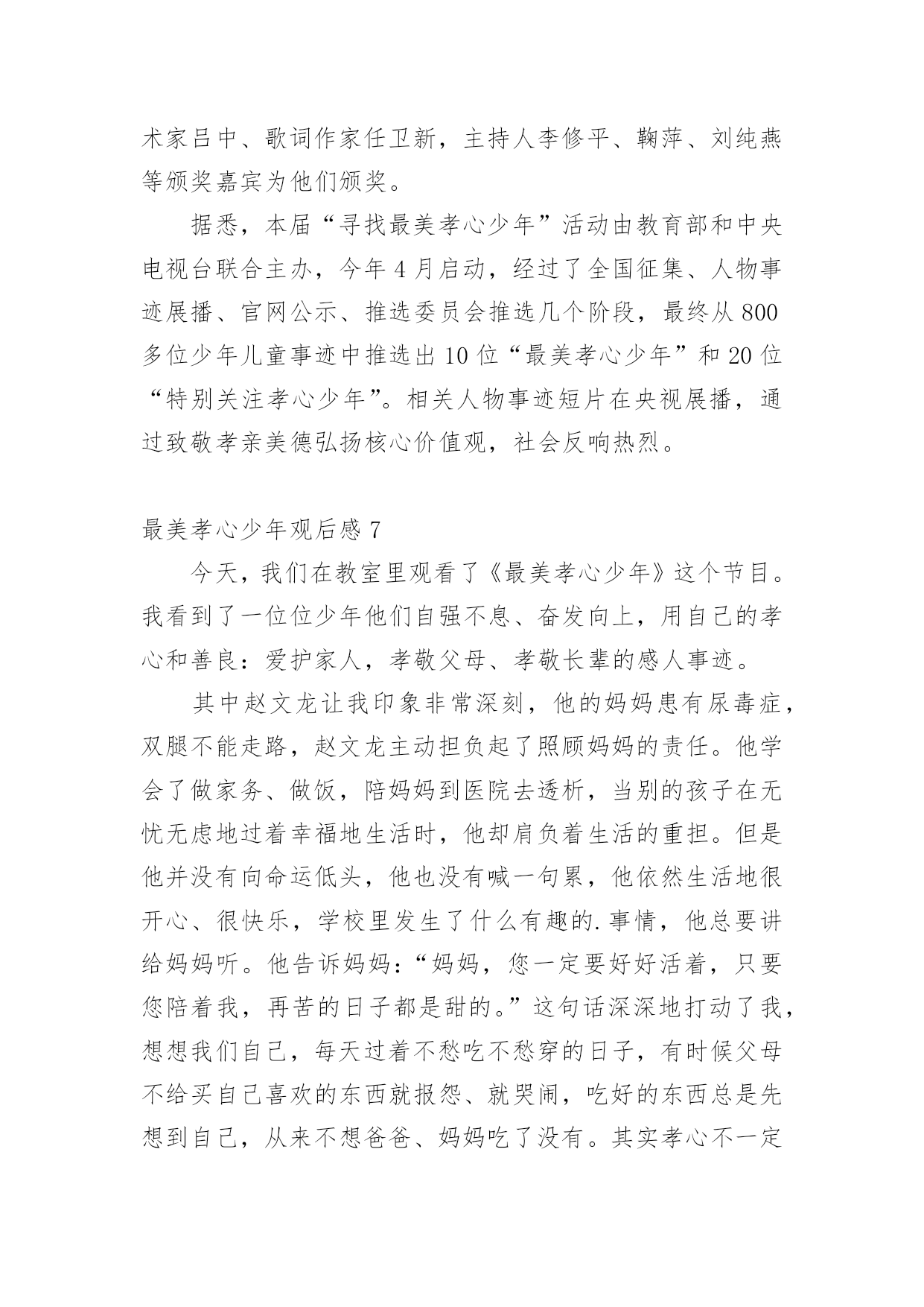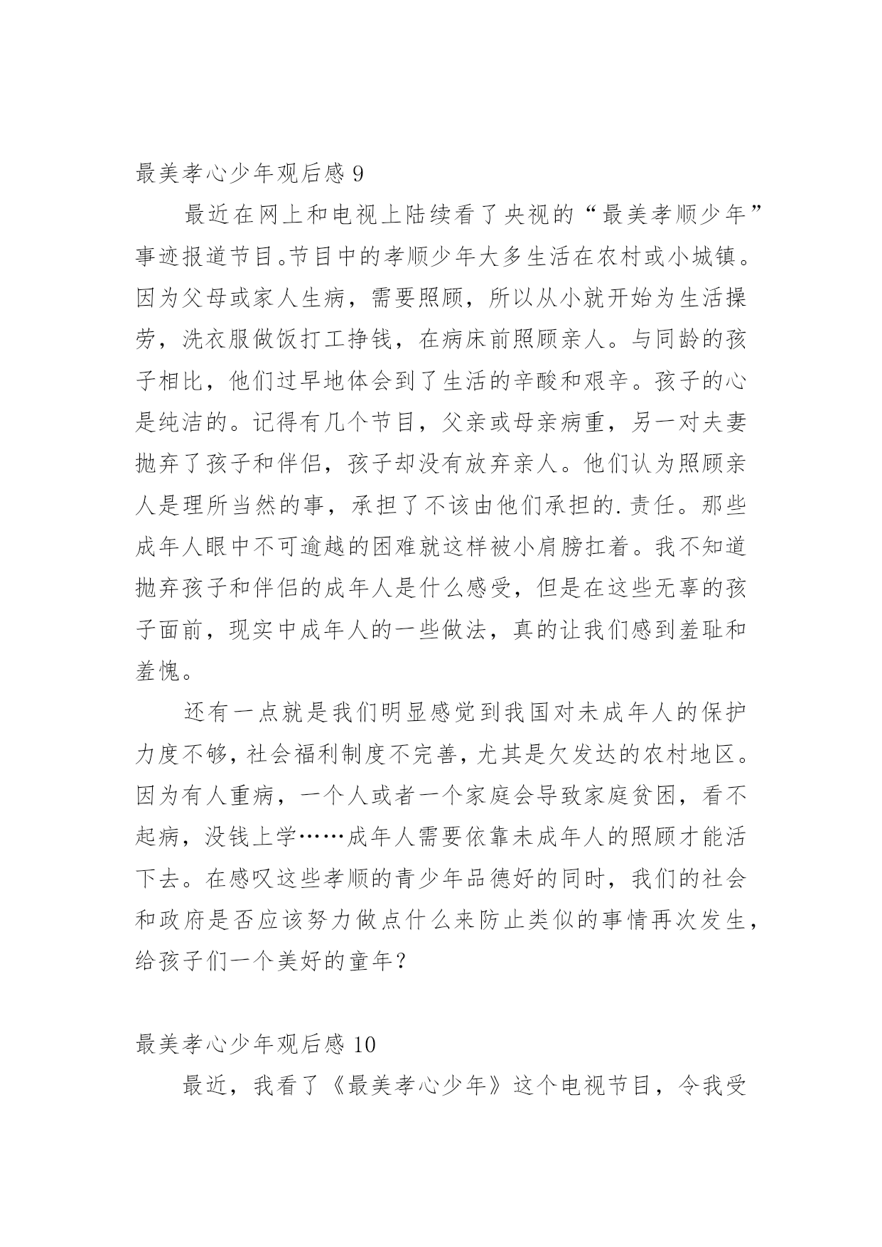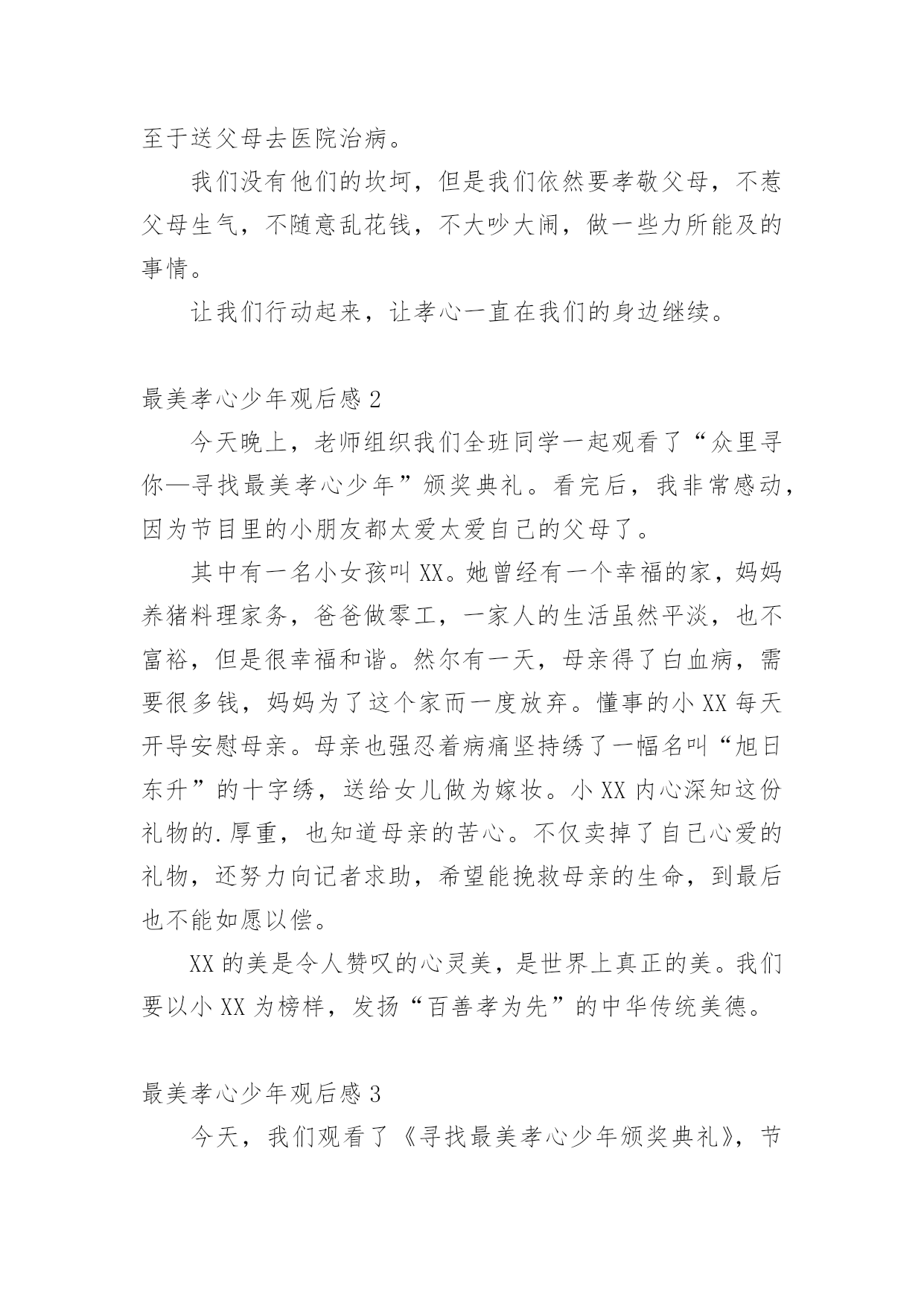 最美孝心少年观后感【荐】最美孝心少年观后感细细品味一部作品以后,相信你会有不少感想吧,这时候十分有必须要写一篇观后感了!观后感你想好怎么写了吗?以下是小编精心整理的最美孝心少年观后感,欢迎阅读与收藏。最美孝心少年观后感1赵文龙、黄凤、吴林香、徐泌烨、林章雨、何秀巡、高雨欣、路玉婷、龙花、邵帅、王秀芹,这十一颗闪闪发光的红星,从黑龙江亮到湖南,从北到南,到处都有这11位最美孝心少年的身影。赵文龙的母亲身患尿毒症,每周两次透析,这是维持他母亲生命唯一的办法。赵文龙每次把母亲送到医院再去上学,放学再把母亲接回来。如今,他已经走了3000多公里,磨破了二十多双鞋。古人云:“乌鸦有反哺之孝,羊有跪乳之恩。板车女孩黄凤。他的父亲外出打工的'时候,不慎落到了楼下,脊椎骨粉碎性骨折。她偶然听到了上海一家医院能治这种病,她就推着一个板车,带着父亲去治病。看看我们,基本上都是衣来伸手饭来张口的小皇帝,洗个袜子都是一件大事,就不用说帮父母打扫卫生、做饭,甚至于送父母去医院治病。我们没有他们的坎坷,但是我们依然要孝敬父母,不惹父母生气,不随意乱花钱,不大吵大闹,做一些力所能及的事情。让我们行动起来,让孝心一直在我们的身边继续。最美孝心少年观后感2今天晚上,老师组织我们全班同学一起观看了“众里寻你—寻找最美孝心少年”颁奖典礼。看完后,我非常感动,因为节目里的小朋友都太爱太爱自己的父母了。其中有一名小女孩叫XX。她曾经有一个幸福的家,妈妈养猪料理家务,爸爸做零工,一家人的生活虽然平淡,也不富裕,但是很幸福和谐。然尔有一天,母亲得了白血病,需要很多钱,妈妈为了这个家而一度放弃。懂事的小XX每天开导安慰母亲。母亲也强忍着病痛坚持绣了一幅名叫“旭日东升”的十字绣,送给女儿做为嫁妆。小XX内心深知这份礼物的.厚重,也知道母亲的苦心。不仅卖掉了自己心爱的礼物,还努力向记者求助,希望能挽救母亲的生命,到最后也不能如愿以偿。XX的美是令人赞叹的心灵美,是世界上真正的美。我们要以小XX为榜样,发扬“百善孝为先”的中华传统美德。最美孝心少年观后感3今天,我们观看了《寻找最美孝心少年颁奖典礼》,节目里,最令我感动的就是吴林香了。吴林香的爸爸很早就去世了,妈妈得了癌症,奶奶浑身瘫痪,弟弟妹妹年幼,13岁的吴林香就成了家里的顶梁柱。这个年龄本来应该在温暖的'家庭里,享受父母的疼爱,可是,现在这个家庭沉寂在痛苦的世界里。洗衣服、做饭、照顾弟弟妹妹等等一切家务活都落在了吴林香的身上。但是,她从来没有抱怨,也没有消极,每天都坚强的用微笑来面对这些困难。后来,妈妈胃癌复发,一度不想活了,吴林香就鼓励妈妈说:“你一定不要放弃,一定要坚强的活下去,我们需要你,这个家离不开你”。妈妈都感动的哭了。看看吴林香他们,再看看自己,从小爸爸妈妈对我疼爱有加,我几乎是衣来伸手饭来张口,有时为了一点小事就和妈妈顶嘴,心里非常惭愧。我今后一定要多孝顺父母,自己能做的事自己做,还要帮妈妈干一些力所能及的家务活。我现在最重要的任务就是好好学习,健康快乐的成长,这也是我对父母最好的回报。最美孝心少年观后感4今天我们在学校观看了《寻找最美孝心少年》的颁奖仪式。他们都出生在贫困家庭,而且他们的父母有的身亡,有的残疾,有的从楼梯上摔下来不会说话了,还有的甚至因为夫妻一方去世、而另一方得了精神病至今还在医院里躺着。这些孩子令我感动的是:虽然父母病了、残了、哑了,他们却从不嫌弃,一直在好好照顾自己的`亲人。就说一个男孩吧!他的妈妈,从两米多高的楼梯上摔下来,幸亏抢救及时,暂时没有生命危险,但是噩耗传来,医生说他的妈妈百分之八十有可能醒过来也是植物人。于是他天天把一支有自己录音的录音笔放在妈妈旁边二十四小时播放。奇迹发生了,他的妈妈苏醒了过来,但是却丧失了所有的语言能力,需要慢慢的重新教他的妈妈说话。尽管妈妈经常把“我要喝水”说成“我要吃饭”,他也从未想过放弃。果然功夫不负有心人,他的妈妈现在能写字,并且能完整地说一句话了。在颁奖仪式中,他的妈妈就对他说了一句完整的话,妈妈说的是:“宝贝,你真棒!”尽管他妈妈说得非常的结巴,但是在他心里,那是一句让他感到无比幸福的话。他们的孝心感动了我,我一定也要做一个孝顺的好孩子!最美孝心少年观后感5一次,我看了《最美孝心少年》,十位少年的“孝”打动了我,给我留下深刻的.印象。他们的孝心,足以感动天,感动地。尽管再苦,再累,他们也不怕,只为家人好。其中,让我感动的是高雨欣。放暑假的时候,她就跟妈妈在街上吆喝着:”烤肠烤面筋烤肉串。“他的妈妈右手残疾,她就帮妈妈照顾年迈的姥姥和幼小的妹妹。虽然每天都很辛苦,但是她还是用自己小小的肩膀撑起了整个家。和她比起,我们很幸福。“乌鸦反哺,羔羊跪乳。”我们一天天长大,有没有感恩过他们呢?有没有尽一点孝心呢?每一次买衣服,妈妈都给我们买一百多元的衣