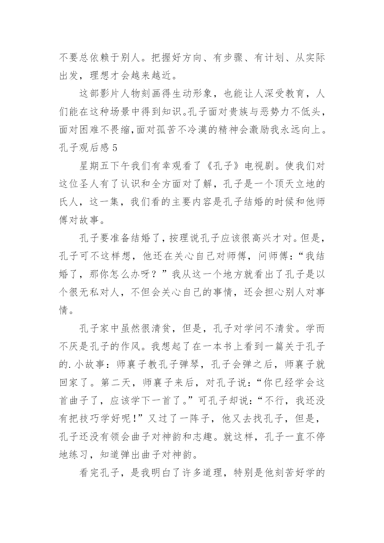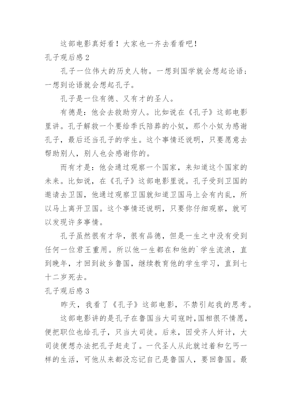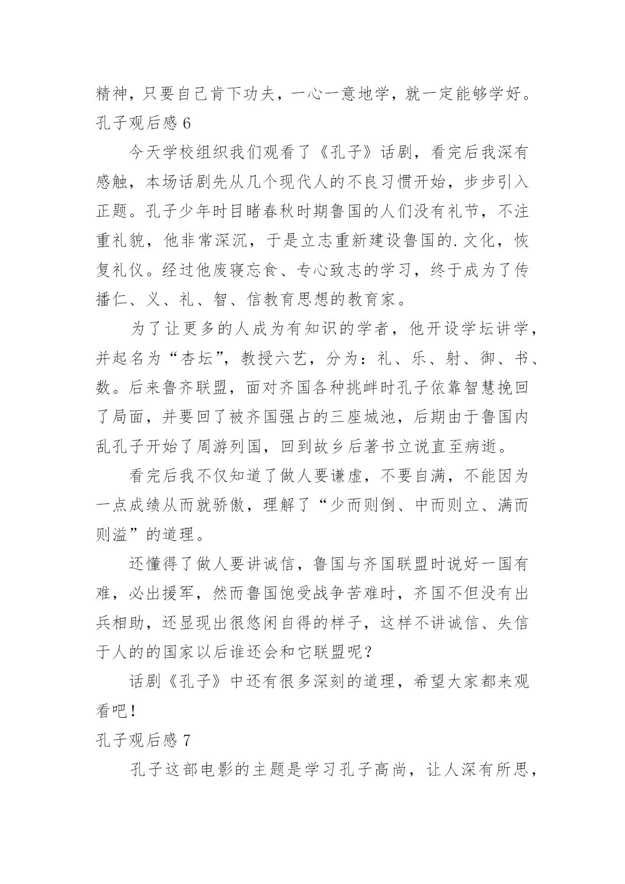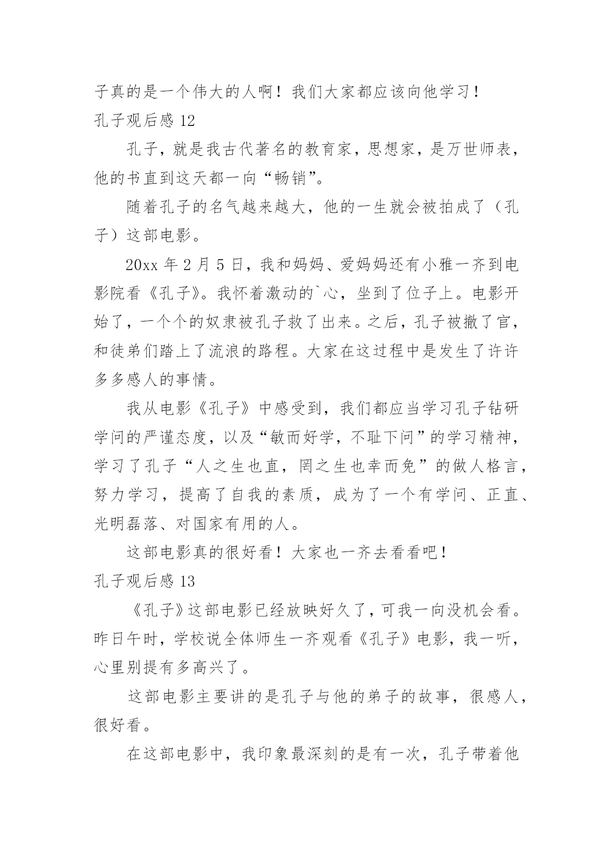 孔子观后感孔子观后感看完一部作品以后,相信你一定有很多值得分享的收获,是时候静下心来好好写写观后感了。可能你现在毫无头绪吧,下面是小编收集整理的孔子观后感,仅供参考,欢迎大家阅读。孔子观后感1孔子,是我古代著名的教育家,思想家,是万世师表,他的书直到这天都一向“畅销”。随着孔子的名气越来越大,他的一生就被拍成了(孔子)这部电影。2月5日,我和妈妈、爱妈妈还有小雅一齐到电影院看《孔子》。此时我怀着激动的'心,坐到了位子上。电影开始了,一个个奴隶被孔子救了出来。之后,孔子被撤了官,和徒弟们踏上了流浪的路程。大家在过程中发生了许多感人的事情。我从电影《孔子》中感受到,我们应当学习孔子钻研学问的严谨态度,以及“敏而好学,不耻下问”的学习精神,学习孔子“人之生也直,罔之生也幸而免”的做人格言,努力学习,提高自我的素质,成为一个有学问、正直、光明磊落、对国家有用的人。这部电影真好看!大家也一齐去看看吧!孔子观后感2孔子一位伟大的历史人物。一想到国学就会想起论语;一想到论语就会想起孔子。孔子是一位有德、又有才的圣人。有德是:他会去救助穷人。比如说在《孔子》这部电影里讲。孔子解救一个要给季氏陪葬的小奴,那个小奴为感谢孔子,最后还当孔子的学生。这个事情还说明,只要愿意去帮助别人,别人也会感谢你的。而有才是:他会通过观察一个国家,来知道这个国家的未来。比如说,在《孔子》这部电影里说。孔子受到卫国的邀请去卫国,他通过观察卫国就知道卫国马上会有内乱,所以马上离开卫国。这个事情还说明,只要你仔细观察,就可以发现许多事情。孔子虽然很有才华,很有品德,但是一生之中没有受到任何一位君王重用。所以他一生都在和他的`学生流浪,直到晚年,才回到故乡鲁国,继续教育他的学生学习,直到七十二岁死去。孔子观后感3昨天,我看了《孔子》这部电影,不禁引起我的思考。这部电影讲的是孔子在鲁国当大司寇时,国相很不情愿,便把职位也给孔子,只当大司徒。后来,因受齐人奸计,大司徒便想办法把孔子赶走了。一代圣人从此就过着和乞丐一样的生活,可他从来都没忘记自己是鲁国人,要回鲁国。最后,功夫不负有心人,孔子终于回到了鲁国。看完后,我发现,自己和孔子差太多了,就拿耐心来说,我有一次去游乐场,我去玩过山车,发现排了很长的队,我只好硬着头皮排队,途中多次都想放弃,可爸爸说:“现在还好,以后还有很多都要等更长时间。”说完,挡着我,不让我离开,最后,因为爸爸挡着我,我才玩到了过山车,而孔子却一直想着要回鲁国,从不忘记,我真是自愧不如。孔子的弟子的'品德也很高尚:颜回为了救经书被冻死,子路死前也不忘夫子的教诲,戴好帽子,堂堂正正的死去……我一定学习孔子和他的子弟,做一个正人君子!孔子观后感4孔子,可谓是家喻户晓,但我们也只知道他大体的一些作品和事迹,这部影片让我们更加了解了这位伟人的一生。孔子从政,希望实现自己的社会理想,却被现实无情地抛弃。孔子一心只想实现自己的理想,对可能的困难估计不足,最终只能黯然离去。孔子到了晚年,认清了理想与现实的差距。他最能影响社会的,是教育弟子,而不是从政。他的弟子有各种各样的才干,可以将他的思想传到更多的地方。孔子把精力放在讲学上,能够影响更多的`人,意义要远大于参政。在实际生活中,我们也经常会抱怨身边的事不如自己所愿、不合理等等,还喜欢去描绘一个理想的情境。可是,这些都于事无补。现实摆在这里,我们也只有从思想上转变,亲自去行动,不要总依赖于别人。把握好方向、有步骤、有计划、从实际出发,理想才会越来越近。这部影片人物刻画得生动形象,也能让人深受教育,人们能在这种场景中得到知识。孔子面对贵族与恶势力不低头,面对困难不畏缩,面对孤苦不冷漠的精神会激励我永远向上。孔子观后感5星期五下午我们有幸观看了《孔子》电视剧。使我们对这位圣人有了认识和全方面对了解,孔子是一个顶天立地的氏人,这一集,我们看的主要内容是孔子结婚的时候和他师傅对故事。孔子要准备结婚了,按理说孔子应该很高兴才对。但是,孔子可不这样想,他还在关心自己对师傅,问师傅:“我结婚了,那你怎么办呀?”我从这一个地方就看出了孔子是以个很无私对人,不但会关心自己的事情,还会担心别人对事情。孔子家中虽然很清贫,但是,孔子对学问不清贫。学而不厌是孔子的作风。我想起了在一本书上看到一篇关于孔子的.小故事:师襄子教孔子弹琴,孔子会弹之后,师襄子就回家了。第二天,师襄子来后,对孔子说:“你已经学会这首曲子了,应该学下一首了。”可孔子却说:“不行,我还没有把技巧学好呢!”又过了一阵子,他又去找孔子,但是,孔子还没有领会曲子对神韵和志趣。就这样,孔子一直不停地练习,知道弹出曲子对神韵。看完孔子,是我明白了许多道理,特别是他刻苦好学的精神,只要自己肯下功夫,一心一意地学,就一定能够学好。孔子观后感6今天学校组织我们观看了《孔子》话剧,看完后