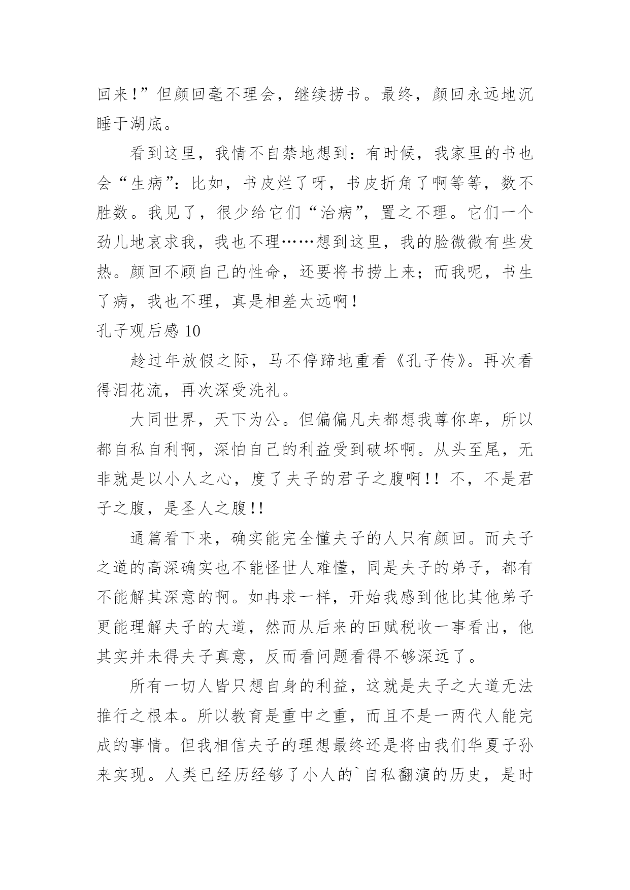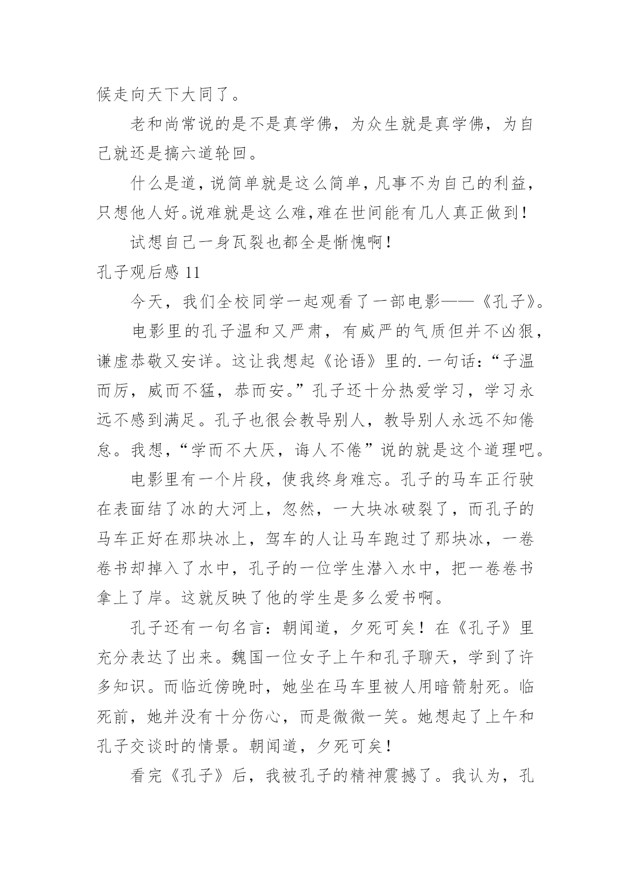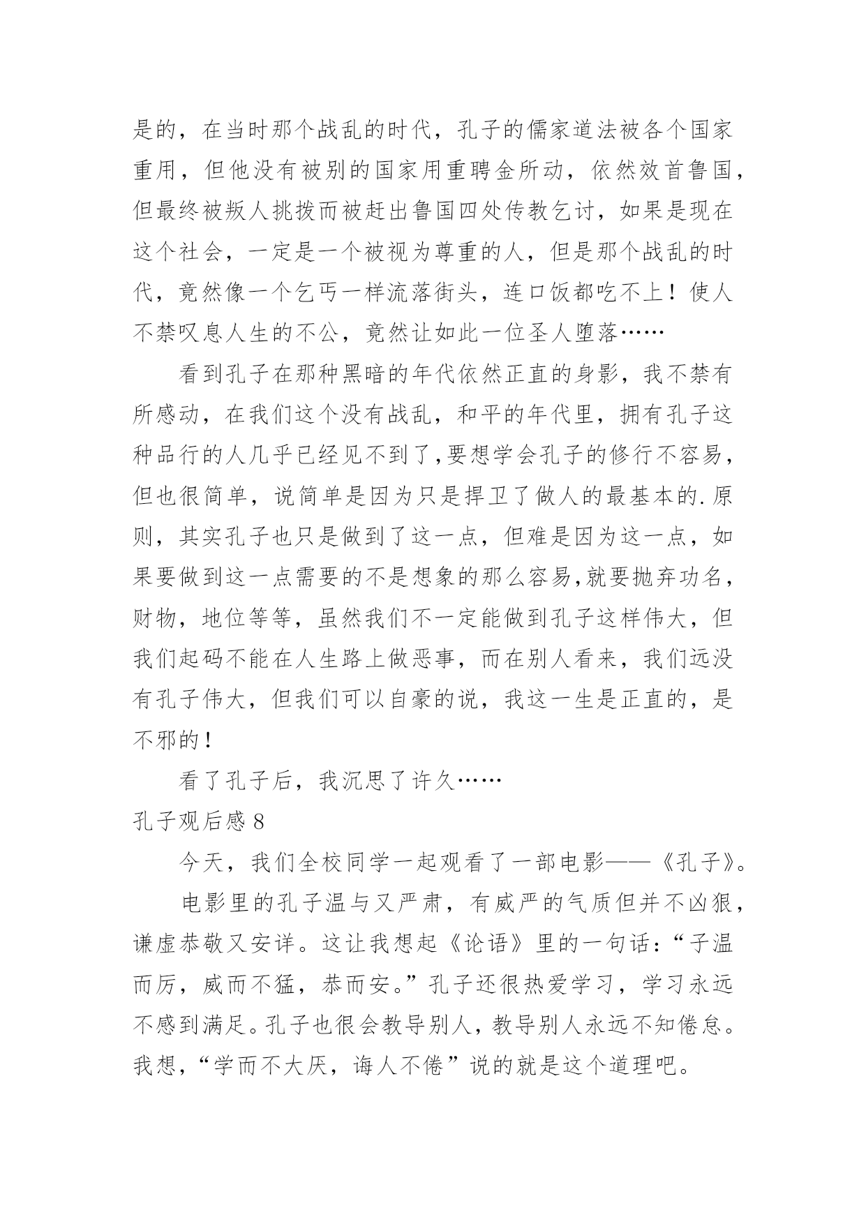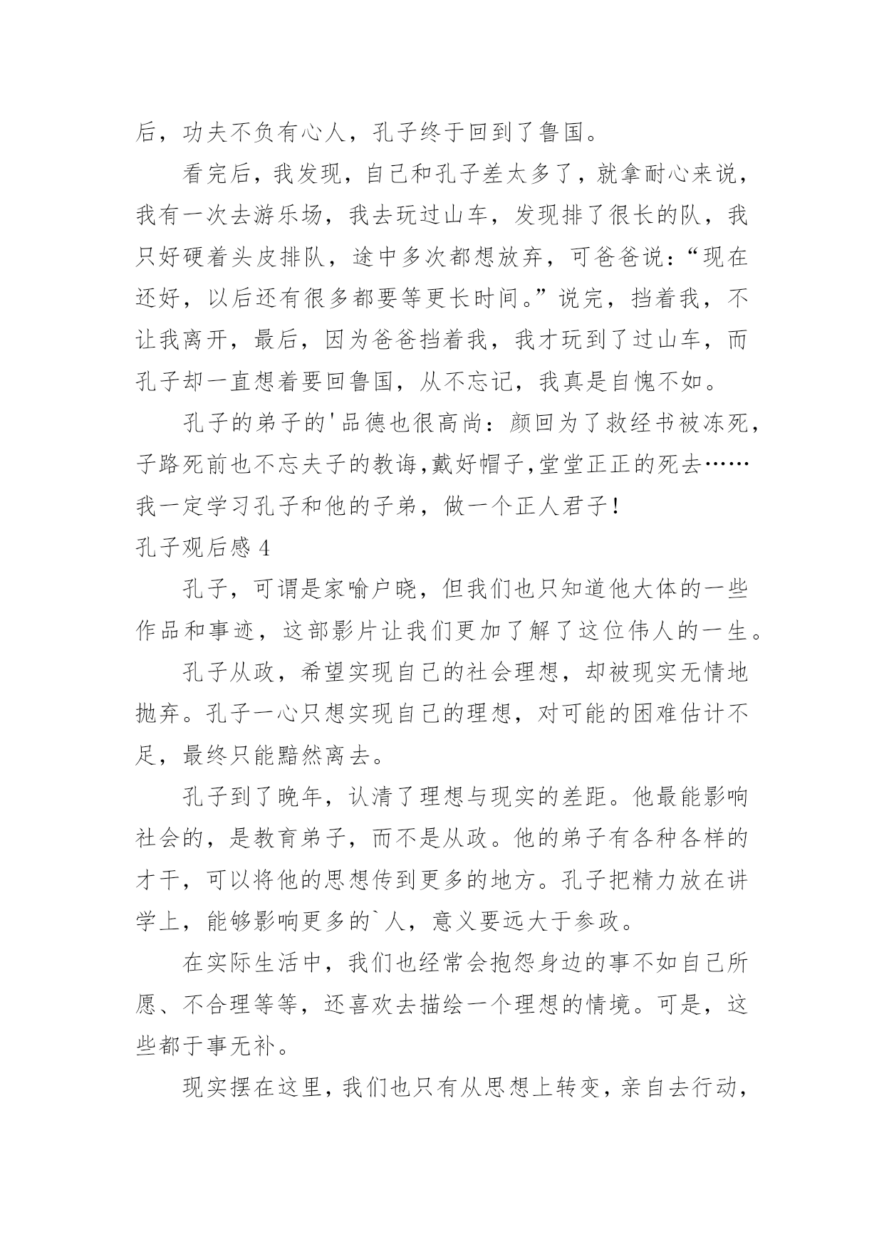 孔子观后感孔子观后感看完一部作品以后,相信你一定有很多值得分享的收获,是时候静下心来好好写写观后感了。可能你现在毫无头绪吧,下面是小编收集整理的孔子观后感,仅供参考,欢迎大家阅读。孔子观后感1孔子,是我古代著名的教育家,思想家,是万世师表,他的书直到这天都一向“畅销”。随着孔子的名气越来越大,他的一生就被拍成了(孔子)这部电影。2月5日,我和妈妈、爱妈妈还有小雅一齐到电影院看《孔子》。此时我怀着激动的'心,坐到了位子上。电影开始了,一个个奴隶被孔子救了出来。之后,孔子被撤了官,和徒弟们踏上了流浪的路程。大家在过程中发生了许多感人的事情。我从电影《孔子》中感受到,我们应当学习孔子钻研学问的严谨态度,以及“敏而好学,不耻下问”的学习精神,学习孔子“人之生也直,罔之生也幸而免”的做人格言,努力学习,提高自我的素质,成为一个有学问、正直、光明磊落、对国家有用的人。这部电影真好看!大家也一齐去看看吧!孔子观后感2孔子一位伟大的历史人物。一想到国学就会想起论语;一想到论语就会想起孔子。孔子是一位有德、又有才的圣人。有德是:他会去救助穷人。比如说在《孔子》这部电影里讲。孔子解救一个要给季氏陪葬的小奴,那个小奴为感谢孔子,最后还当孔子的学生。这个事情还说明,只要愿意去帮助别人,别人也会感谢你的。而有才是:他会通过观察一个国家,来知道这个国家的未来。比如说,在《孔子》这部电影里说。孔子受到卫国的邀请去卫国,他通过观察卫国就知道卫国马上会有内乱,所以马上离开卫国。这个事情还说明,只要你仔细观察,就可以发现许多事情。孔子虽然很有才华,很有品德,但是一生之中没有受到任何一位君王重用。所以他一生都在和他的`学生流浪,直到晚年,才回到故乡鲁国,继续教育他的学生学习,直到七十二岁死去。孔子观后感3昨天,我看了《孔子》这部电影,不禁引起我的思考。这部电影讲的是孔子在鲁国当大司寇时,国相很不情愿,便把职位也给孔子,只当大司徒。后来,因受齐人奸计,大司徒便想办法把孔子赶走了。一代圣人从此就过着和乞丐一样的生活,可他从来都没忘记自己是鲁国人,要回鲁国。最后,功夫不负有心人,孔子终于回到了鲁国。看完后,我发现,自己和孔子差太多了,就拿耐心来说,我有一次去游乐场,我去玩过山车,发现排了很长的队,我只好硬着头皮排队,途中多次都想放弃,可爸爸说:“现在还好,以后还有很多都要等更长时间。”说完,挡着我,不让我离开,最后,因为爸爸挡着我,我才玩到了过山车,而孔子却一直想着要回鲁国,从不忘记,我真是自愧不如。孔子的弟子的'品德也很高尚:颜回为了救经书被冻死,子路死前也不忘夫子的教诲,戴好帽子,堂堂正正的死去……我一定学习孔子和他的子弟,做一个正人君子!孔子观后感4孔子,可谓是家喻户晓,但我们也只知道他大体的一些作品和事迹,这部影片让我们更加了解了这位伟人的一生。孔子从政,希望实现自己的社会理想,却被现实无情地抛弃。孔子一心只想实现自己的理想,对可能的困难估计不足,最终只能黯然离去。孔子到了晚年,认清了理想与现实的差距。他最能影响社会的,是教育弟子,而不是从政。他的弟子有各种各样的才干,可以将他的思想传到更多的地方。孔子把精力放在讲学上,能够影响更多的`人,意义要远大于参政。在实际生活中,我们也经常会抱怨身边的事不如自己所愿、不合理等等,还喜欢去描绘一个理想的情境。可是,这些都于事无补。现实摆在这里,我们也只有从思想上转变,亲自去行动,不要总依赖于别人。把握好方向、有步骤、有计划、从实际出发,理想才会越来越近。这部影片人物刻画得生动形象,也能让人深受教育,人们能在这种场景中得到知识。孔子面对贵族与恶势力不低头,面对困难不畏缩,面对孤苦不冷漠的精神会激励我永远向上。孔子观后感5星期五下午我们有幸观看了《孔子》电视剧。使我们对这位圣人有了认识和全方面对了解,孔子是一个顶天立地的氏人,这一集,我们看的主要内容是孔子结婚的时候和他师傅对故事。孔子要准备结婚了,按理说孔子应该很高兴才对。但是,孔子可不这样想,他还在关心自己对师傅,问师傅:“我结婚了,那你怎么办呀?”我从这一个地方就看出了孔子是以个很无私对人,不但会关心自己的事情,还会担心别人对事情。孔子家中虽然很清贫,但是,孔子对学问不清贫。学而不厌是孔子的作风。我想起了在一本书上看到一篇关于孔子的.小故事:师襄子教孔子弹琴,孔子会弹之后,师襄子就回家了。第二天,师襄子来后,对孔子说:“你已经学会这首曲子了,应该学下一首了。”可孔子却说:“不行,我还没有把技巧学好呢!”又过了一阵子,他又去找孔子,但是,孔子还没有领会曲子对神韵和志趣。就这样,孔子一直不停地练习,知道弹出曲子对神韵。看完孔子,是我明白了许多道理,特别是他刻苦好学的精神,只要自己肯下功夫,一心一意地学,就一定能够学好。孔子观后感6今天学校组织我们观看了《孔子》话剧,看完后