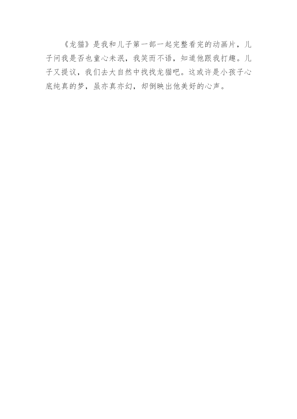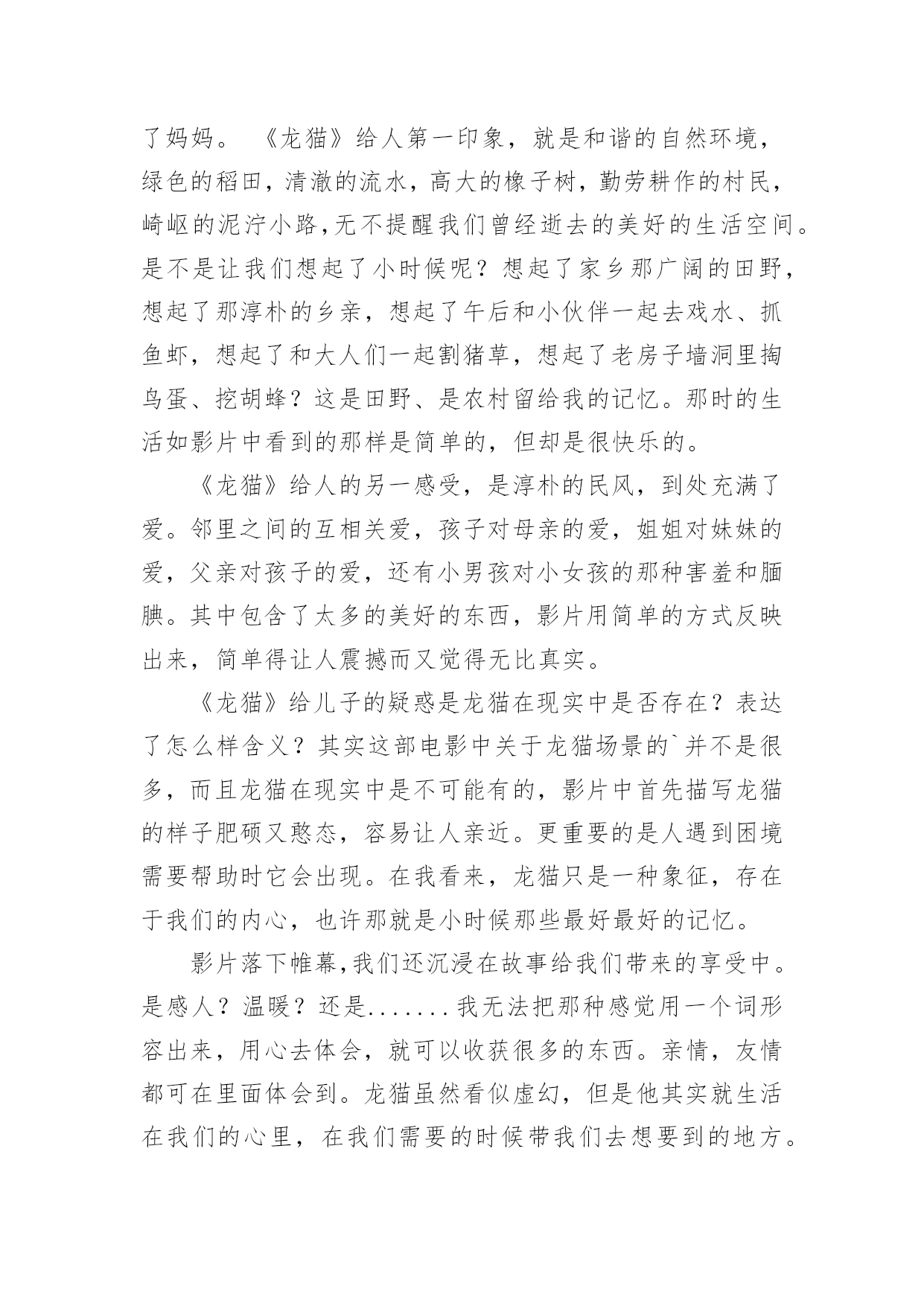 龙猫观后感龙猫观后感当观看完一部影视作品后,一定有不少感悟吧,写一份观后感,记录收获与付出。可能你现在毫无头绪吧,下面是小编为大家整理的龙猫观后感,希望对大家有所帮助。现在的孩子都成熟得较早,可我那将要上五年级的儿子,可以说是“童心未泯”,每做完作业,搞完运动,就沉浸在动画的世界里。《熊出没》、《大耳朵图图》、《猪猪侠》都是他的最爱,总免不了我们的唠叨或训斥,说这是在浪费时间。然而,在这个暑假,我和儿子一起观看了一部动画片,彻底改变了我的看法。这是一部根据日本漫画家宫崎骏的漫画改编来的动画电影,名为《龙猫》,它让我感受到什么叫真正的童话。甚至让我走进了童话的世界里,勾起了对小时候生活乐趣、天马行空遐想的回忆。影片讲述了一个简单而又温馨、天真的故事,念小学的小月和四岁的妹妹小梅,在妈妈住院期间,跟着爸爸搬到郊外的一间旧屋住,在那个被人戏称为“鬼屋”的新家里,她们的生活有了许多有趣的新发现,包括传说中的龙猫。有一天,思念妈妈的小梅决定去医院探望她,却在途中迷路了,大龙猫出现帮助了小月找到了妹妹,并带小月和小妹去看望了妈妈。《龙猫》给人第一印象,就是和谐的自然环境,绿色的稻田,清澈的流水,高大的橡子树,勤劳耕作的村民,崎岖的泥泞小路,无不提醒我们曾经逝去的美好的生活空间。是不是让我们想起了小时候呢?想起了家乡那广阔的田野,想起了那淳朴的乡亲,想起了午后和小伙伴一起去戏水、抓鱼虾,想起了和大人们一起割猪草,想起了老房子墙洞里掏鸟蛋、挖胡蜂?这是田野、是农村留给我的记忆。那时的生活如影片中看到的那样是简单的,但却是很快乐的。《龙猫》给人的另一感受,是淳朴的民风,到处充满了爱。邻里之间的互相关爱,孩子对母亲的爱,姐姐对妹妹的爱,父亲对孩子的爱,还有小男孩对小女孩的那种害羞和腼腆。其中包含了太多的美好的东西,影片用简单的方式反映出来,简单得让人震撼而又觉得无比真实。《龙猫》给儿子的疑惑是龙猫在现实中是否存在?表达了怎么样含义?其实这部电影中关于龙猫场景的`并不是很多,而且龙猫在现实中是不可能有的,影片中首先描写龙猫的样子肥硕又憨态,容易让人亲近。更重要的是人遇到困境需要帮助时它会出现。在我看来,龙猫只是一种象征,存在于我们的内心,也许那就是小时候那些最好最好的记忆。影片落下帷幕,我们还沉浸在故事给我们带来的享受中。是感人?温暖?还是.......我无法把那种感觉用一个词形容出来,用心去体会,就可以收获很多的东西。亲情,友情都可在里面体会到。龙猫虽然看似虚幻,但是他其实就生活在我们的心里,在我们需要的时候带我们去想要到的地方。《龙猫》是我和儿子第一部一起完整看完的动画片,儿子问我是否也童心未泯,我笑而不语,知道他跟我打趣。儿子又提议,我们去大自然中找找龙猫吧。这或许是小孩子心底纯真的梦,虽亦真亦幻,却倒映出他美好的心声。
