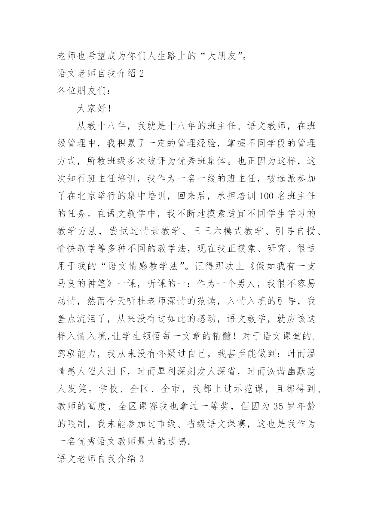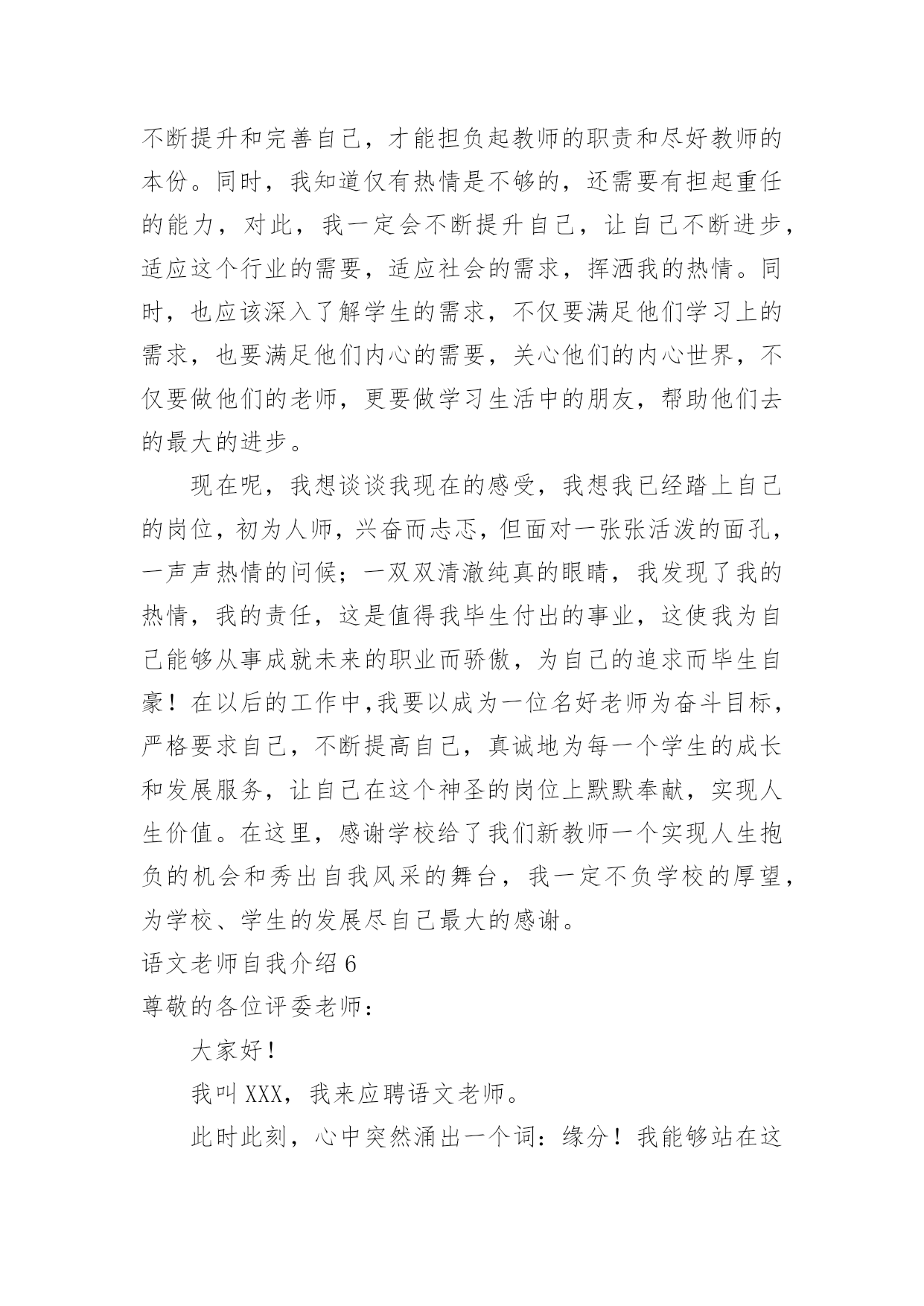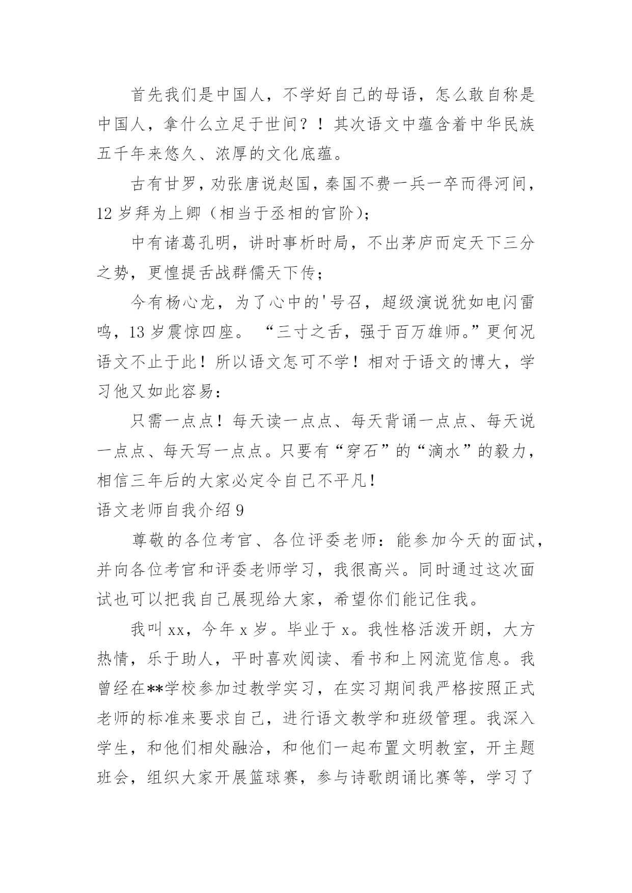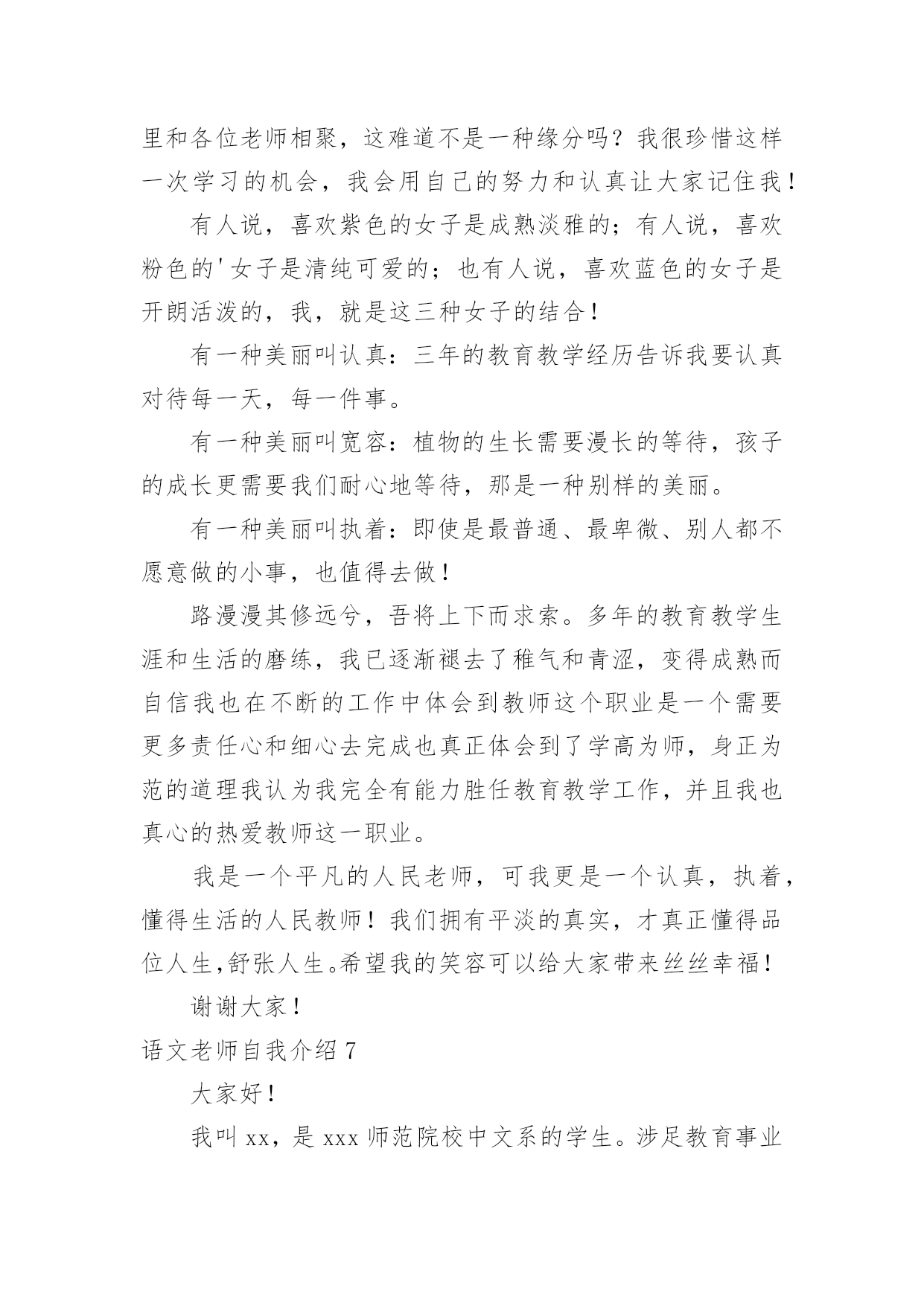 语文老师自我介绍【热门】语文老师自我介绍15篇当来到一个陌生环境中,我们有必要进行适当的自我介绍,自我介绍可以给陌生人留下一个好的印象。写自我介绍可不能随随便便哦,下面是小编为大家收集的语文老师自我介绍,供大家参考借鉴,希望可以帮助到有需要的朋友。语文老师自我介绍1同学们:欢迎你们从小学生升到初中,来到南高乡中学,我将担任你们本学期的语文老师,我姓李,大家可以称呼我李老师。同学们,来到初中,就意味着你们不再是一个需要被人呵护的小孩子,而是真正意义上独立的“人”你们在这三年中,将会成熟,长大,树立正确的人生观,价值观,树立自己伟大的理想,如果说属于现在阶段的你们是一颗小树苗的话,老师就是辛勤的园丁,用手中的希望之水,去浇灌你们茁壮成长,为你们修枝剪叶,是你们健康,快乐的成长。在你们初中课程中,有一门可以带给你们领略祖国美好风光,感受世界神奇现象,同时又使你体验到人生中各种酸,甜,苦,辣的学科,那就是语文。不要惊讶老师所说的内容,在本学期里,你们将会在老师的带领下,去感受神奇的云朵,它将会告诉你天气的变化多端,这就是我们以后会学到的一篇非常有意的的关于地理现象的科学小品文《看云识天气》,还会感受到古代先哲在做人和学习上为我们留下的宝贵经验,“三人行,必有我师焉”,对,这就是《论语》十则,除了这些,我们还会坐上飞机,出一趟国,去看一看外国的皇帝的愚昧与无知,这篇文章就是咱们同学非常喜欢的童话作家安徒生的《皇帝的新装》,这些还远远不够说明语文的魅力,同学们,只要你们认真学习语文,你就会发现整个世界就会出现你的面前,怎么样,听了老师介绍这么多关于语文的内容,一定对语文产生了浓厚的兴趣了吧,兴趣是一切认知的来源,希望你们保持这份好奇心,去慢慢揭开语文的面纱吧,你会发现语文就在你身边,就在生活中的每一处细节中。下面,给同学们提几点小小的要求,希望促进咱们本学期的`语文课可以更好的顺利完成。第一点,我希望同学们上课认真听讲,积极思考老师所问的每一个问题,勇于展现自己,第二,上课积极记笔记,学会听课,对于老师重复多遍的话,要熟记于心,这肯定是考试中的重点。第三点,就是要保质保量的按时完成作业,我想大家从小学就应该明白这一点,最后一点,算是老师对你们提出的一个额外要求,希望大家在上语文课时,尽量说普通话,咱们语文课培养的是规范用语,而且咱们以后走上社会,普通话是你们找工作以及其他等等所要求掌握的一项最基础的素质,所以希望大家在上课时多用普通话交流。一学期的时间说长不长,说短不短,我相信只要同学们和我积极配合,愉快相处,我们一定会学好语文这一门学科,老师也希望成为你们人生路上的“大朋友”。语文老师自我介绍2各位朋友们:大家好!从教十八年,我就是十八年的班主任、语文教师,在班级管理中,我积累了一定的管理经验,掌握不同学段的管理方式,所教班级多次被评为优秀班集体。也正因为这样,这次知行班主任培训,我作为一名一线的班主任,被选派参加了在北京举行的集中培训,回来后,承担培训100名班主任的任务。在语文教学中,我不断地摸索适宜不同学生学习的教学方法,尝试过情景教学、三三六模式教学、引导自授、愉快教学等多种不同的教学法,现在我正摸索、研究、很适用于我的“语文情感教学法”。记得那次上《假如我有一支马良的神笔》一课,听课的一:作为一个男人,我很不容易动情,然而今天听杜老师深情的范读,入情入境的引导,我差点流泪了,从来没有过如此的感动,语文教学,就应该这样入情入境,让学生领悟每一文章的精髓!对于语文课堂的.驾驭能力,我从来没有怀疑过自己,我甚至能做到:时而温情感人催人泪下,时而犀利深刻发人深省,时而诙谐幽默惹人发笑。学校、全区、全市,我都上过示范课,且都得到、教师的高度,全区课赛我也拿过一等奖,但因为35岁年龄的限制,我未能参加过市级、省级语文课赛,这也是我作为一名优秀语文教师最大的遗憾。语文老师自我介绍3尊敬的领导:很高兴有机会可以参加这次面试,我叫xxx毕业于xxx师范大学广西大学小学教育语文专业。毕业而后一直从事管理工作小学语文教育工作。致力于小学语文教学实践并较有成效。在工作中通过自己的努力和各学科老师的帮助,逐步形成了自己的石蜊‘师生相处和谐,“情知互动,寓教寓乐”的教学风格,立足于共鸣的师生情感,利用语文的独特魅力和特性吸引、感染学生自觉自愿、主动积极并富有创造性地在无拘无束、轻松愉快的'氛围中参与语文活动。在理科活动中鼓励学生张扬个性,发挥潜能,培养引导激发学生对培养语文的天分。自从教以来,我连续数年在全县优质课和优秀论文评选活动中获奖,今年暑假,我又在xx高等师范专科学校参加了省级骨干教师的培训,聆听名家教诲,和来自全省各地老师交流教学学术交流经验,从中让我看到了自己的渺小和不足,在以后的工作中,我将虚心学习,积极进取。“路漫漫其修远兮,吾将上下