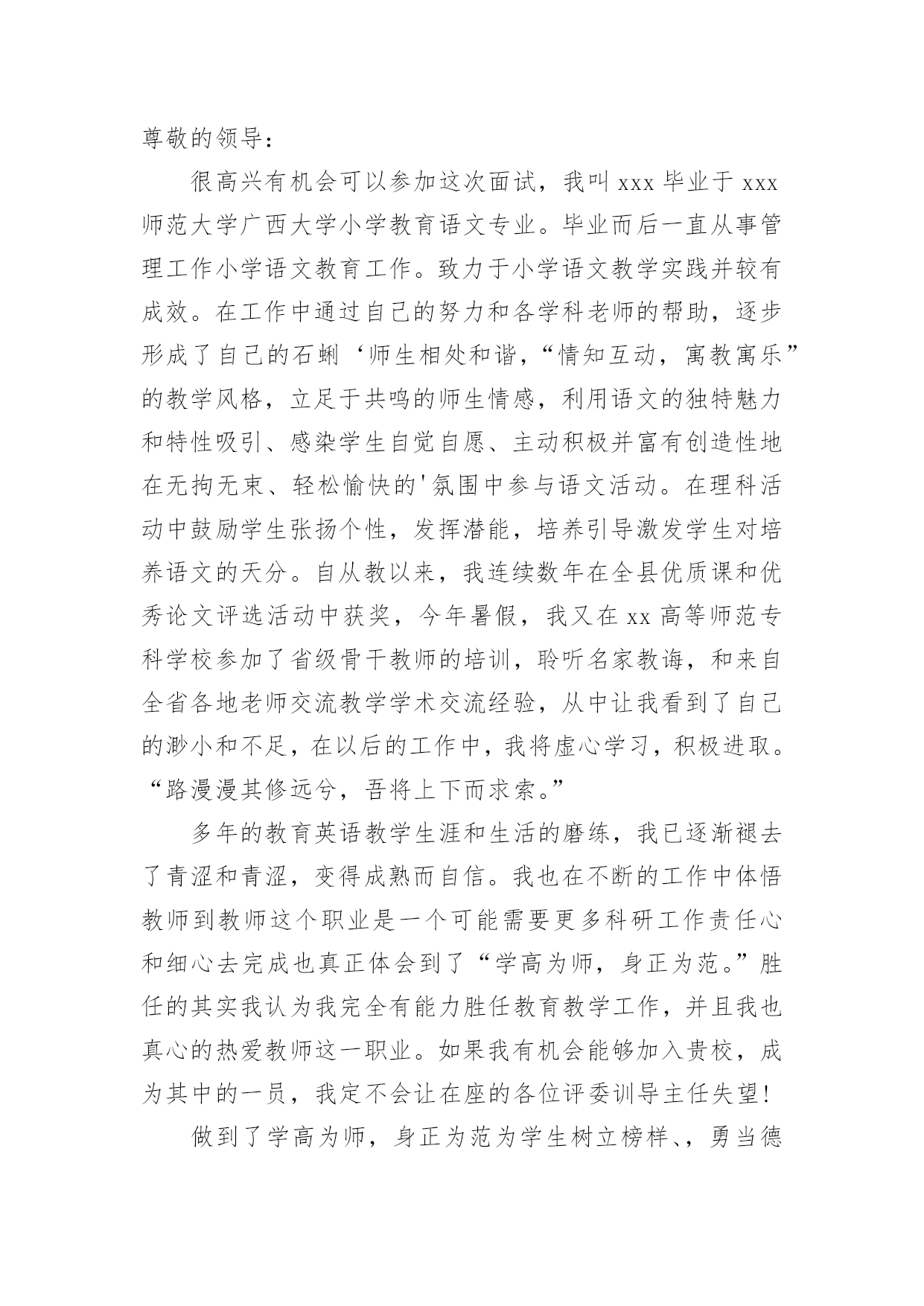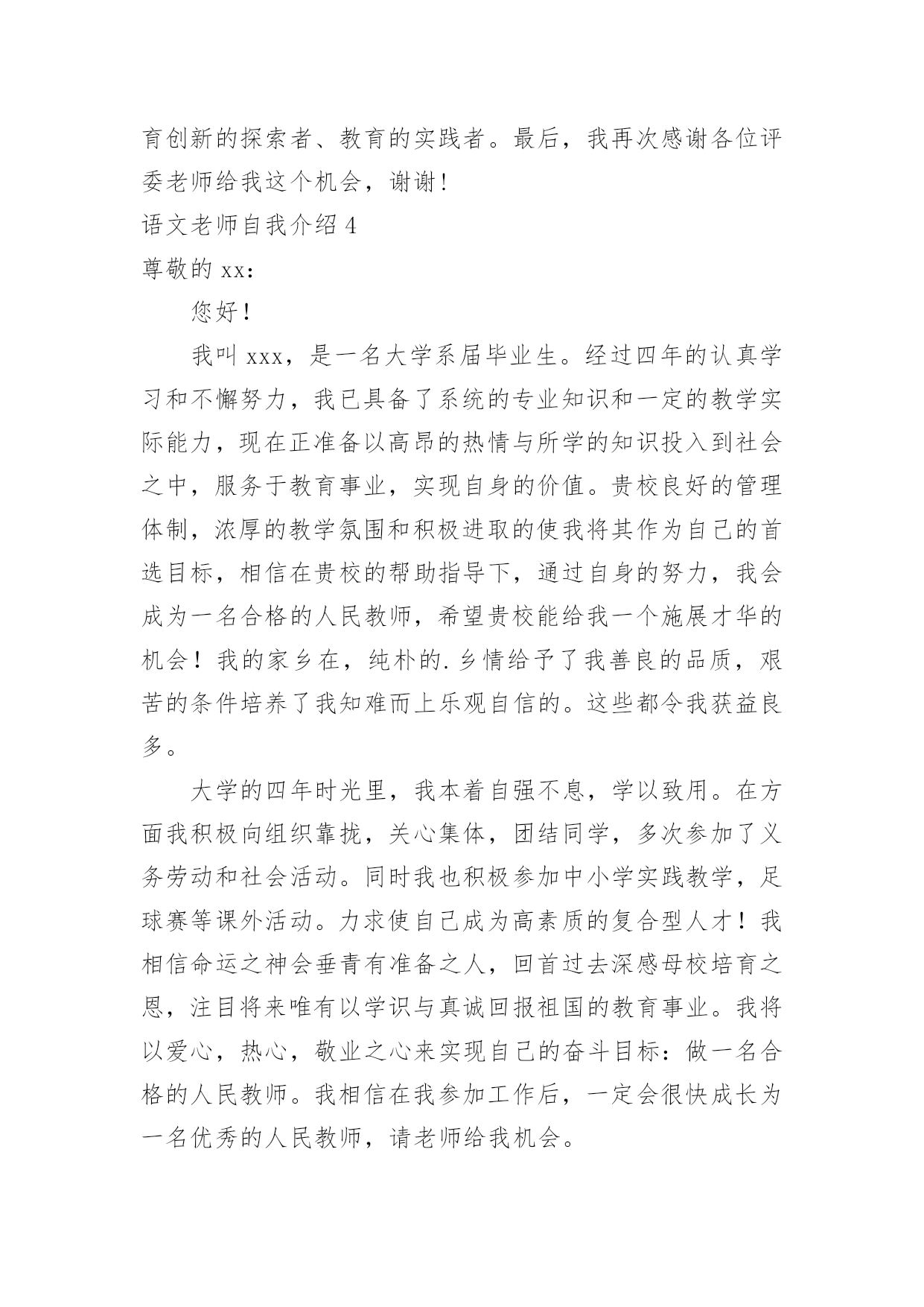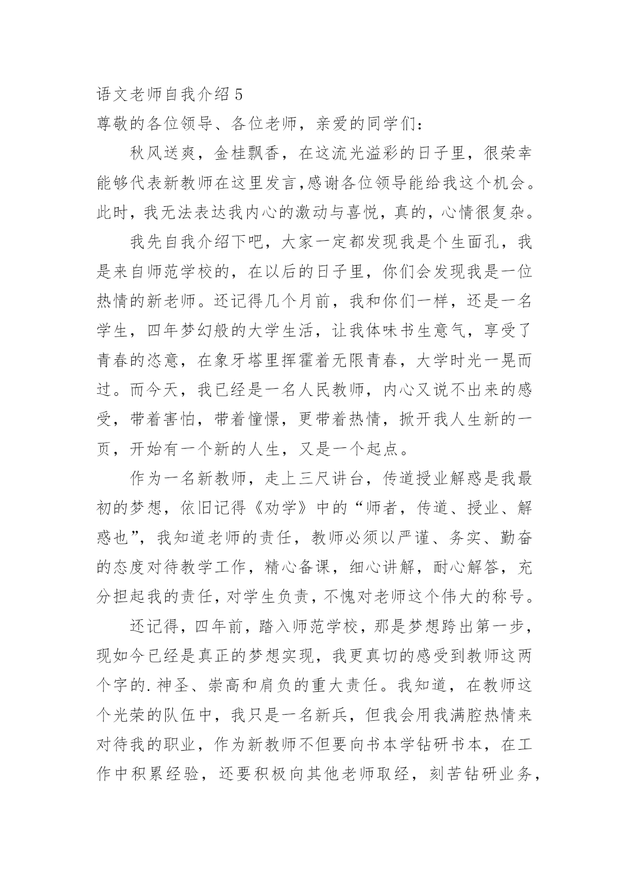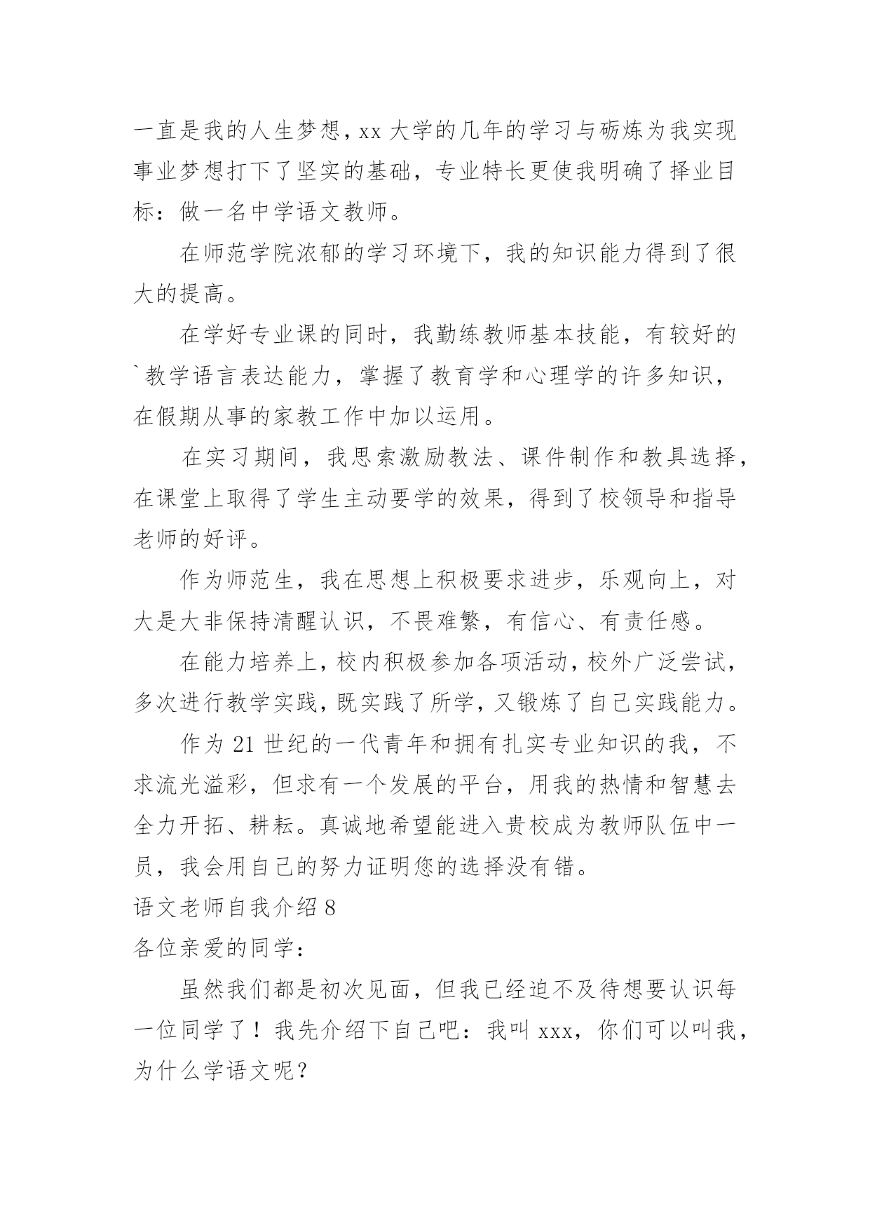 语文老师自我介绍【热门】语文老师自我介绍15篇当来到一个陌生环境中,我们有必要进行适当的自我介绍,自我介绍可以给陌生人留下一个好的印象。写自我介绍可不能随随便便哦,下面是小编为大家收集的语文老师自我介绍,供大家参考借鉴,希望可以帮助到有需要的朋友。语文老师自我介绍1同学们:欢迎你们从小学生升到初中,来到南高乡中学,我将担任你们本学期的语文老师,我姓李,大家可以称呼我李老师。同学们,来到初中,就意味着你们不再是一个需要被人呵护的小孩子,而是真正意义上独立的“人”你们在这三年中,将会成熟,长大,树立正确的人生观,价值观,树立自己伟大的理想,如果说属于现在阶段的你们是一颗小树苗的话,老师就是辛勤的园丁,用手中的希望之水,去浇灌你们茁壮成长,为你们修枝剪叶,是你们健康,快乐的成长。在你们初中课程中,有一门可以带给你们领略祖国美好风光,感受世界神奇现象,同时又使你体验到人生中各种酸,甜,苦,辣的学科,那就是语文。不要惊讶老师所说的内容,在本学期里,你们将会在老师的带领下,去感受神奇的云朵,它将会告诉你天气的变化多端,这就是我们以后会学到的一篇非常有意的的关于地理现象的科学小品文《看云识天气》,还会感受到古代先哲在做人和学习上为我们留下的宝贵经验,“三人行,必有我师焉”,对,这就是《论语》十则,除了这些,我们还会坐上飞机,出一趟国,去看一看外国的皇帝的愚昧与无知,这篇文章就是咱们同学非常喜欢的童话作家安徒生的《皇帝的新装》,这些还远远不够说明语文的魅力,同学们,只要你们认真学习语文,你就会发现整个世界就会出现你的面前,怎么样,听了老师介绍这么多关于语文的内容,一定对语文产生了浓厚的兴趣了吧,兴趣是一切认知的来源,希望你们保持这份好奇心,去慢慢揭开语文的面纱吧,你会发现语文就在你身边,就在生活中的每一处细节中。下面,给同学们提几点小小的要求,希望促进咱们本学期的`语文课可以更好的顺利完成。第一点,我希望同学们上课认真听讲,积极思考老师所问的每一个问题,勇于展现自己,第二,上课积极记笔记,学会听课,对于老师重复多遍的话,要熟记于心,这肯定是考试中的重点。第三点,就是要保质保量的按时完成作业,我想大家从小学就应该明白这一点,最后一点,算是老师对你们提出的一个额外要求,希望大家在上语文课时,尽量说普通话,咱们语文课培养的是规范用语,而且咱们以后走上社会,普通话是你们找工作以及其他等等所要求掌握的一项最基础的素质,所以希望大家在上课时多用普通话交流。一学期的时间说长不长,说短不短,我相信只要同学们和我积极配合,愉快相处,我们一定会学好语文这一门学科,老师也希望成为你们人生路上的“大朋友”。语文老师自我介绍2各位朋友们:大家好!从教十八年,我就是十八年的班主任、语文教师,在班级管理中,我积累了一定的管理经验,掌握不同学段的管理方式,所教班级多次被评为优秀班集体。也正因为这样,这次知行班主任培训,我作为一名一线的班主任,被选派参加了在北京举行的集中培训,回来后,承担培训100名班主任的任务。在语文教学中,我不断地摸索适宜不同学生学习的教学方法,尝试过情景教学、三三六模式教学、引导自授、愉快教学等多种不同的教学法,现在我正摸索、研究、很适用于我的“语文情感教学法”。记得那次上《假如我有一支马良的神笔》一课,听课的一:作为一个男人,我很不容易动情,然而今天听杜老师深情的范读,入情入境的引导,我差点流泪了,从来没有过如此的感动,语文教学,就应该这样入情入境,让学生领悟每一文章的精髓!对于语文课堂的.驾驭能力,我从来没有怀疑过自己,我甚至能做到:时而温情感人催人泪下,时而犀利深刻发人深省,时而诙谐幽默惹人发笑。学校、全区、全市,我都上过示范课,且都得到、教师的高度,全区课赛我也拿过一等奖,但因为35岁年龄的限制,我未能参加过市级、省级语文课赛,这也是我作为一名优秀语文教师最大的遗憾。语文老师自我介绍3尊敬的领导:很高兴有机会可以参加这次面试,我叫xxx毕业于xxx师范大学广西大学小学教育语文专业。毕业而后一直从事管理工作小学语文教育工作。致力于小学语文教学实践并较有成效。在工作中通过自己的努力和各学科老师的帮助,逐步形成了自己的石蜊‘师生相处和谐,“情知互动,寓教寓乐”的教学风格,立足于共鸣的师生情感,利用语文的独特魅力和特性吸引、感染学生自觉自愿、主动积极并富有创造性地在无拘无束、轻松愉快的'氛围中参与语文活动。在理科活动中鼓励学生张扬个性,发挥潜能,培养引导激发学生对培养语文的天分。自从教以来,我连续数年在全县优质课和优秀论文评选活动中获奖,今年暑假,我又在xx高等师范专科学校参加了省级骨干教师的培训,聆听名家教诲,和来自全省各地老师交流教学学术交流经验,从中让我看到了自己的渺小和不足,在以后的工作中,我将虚心学习,积极进取。“路漫漫其修远兮,吾将上下