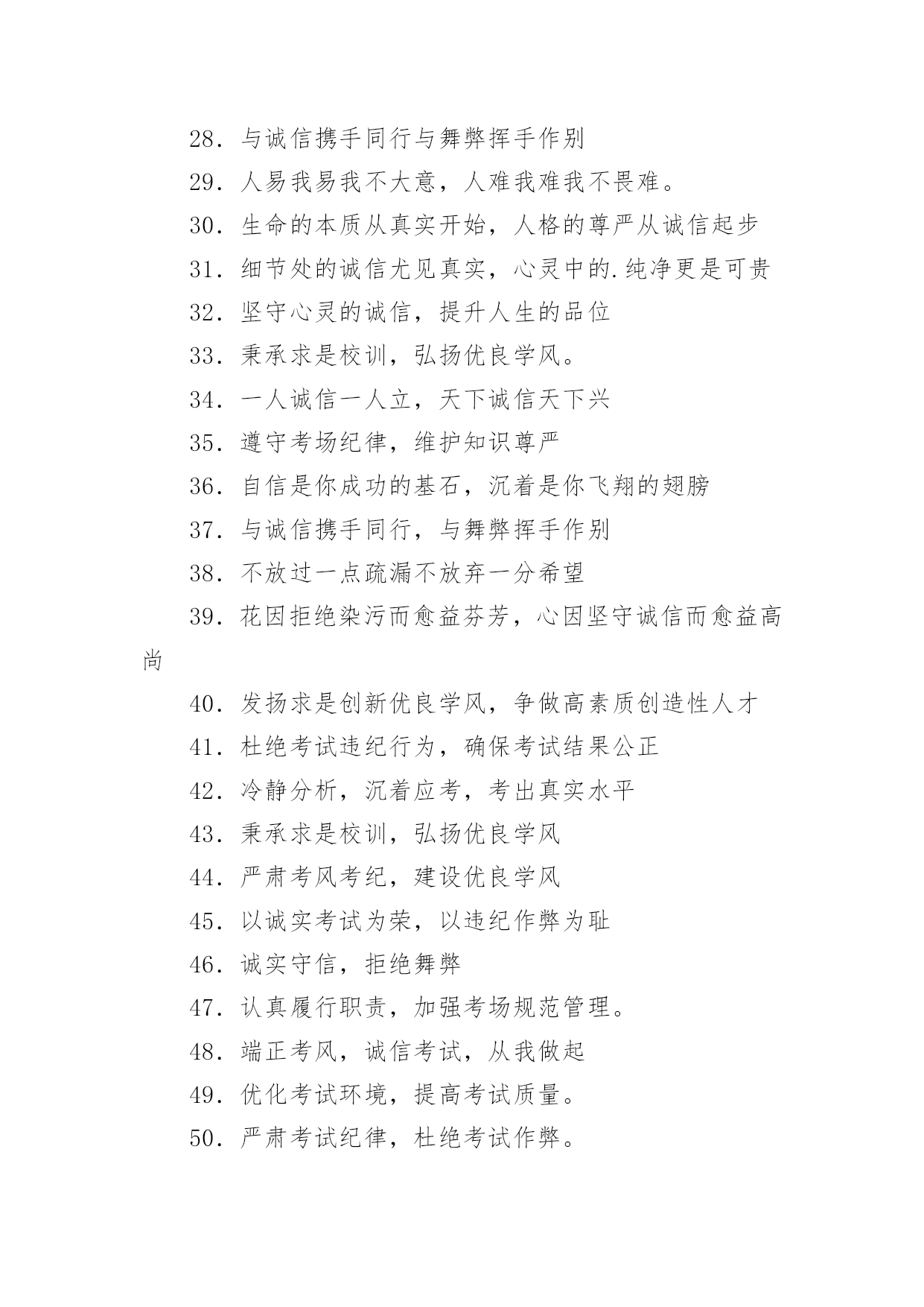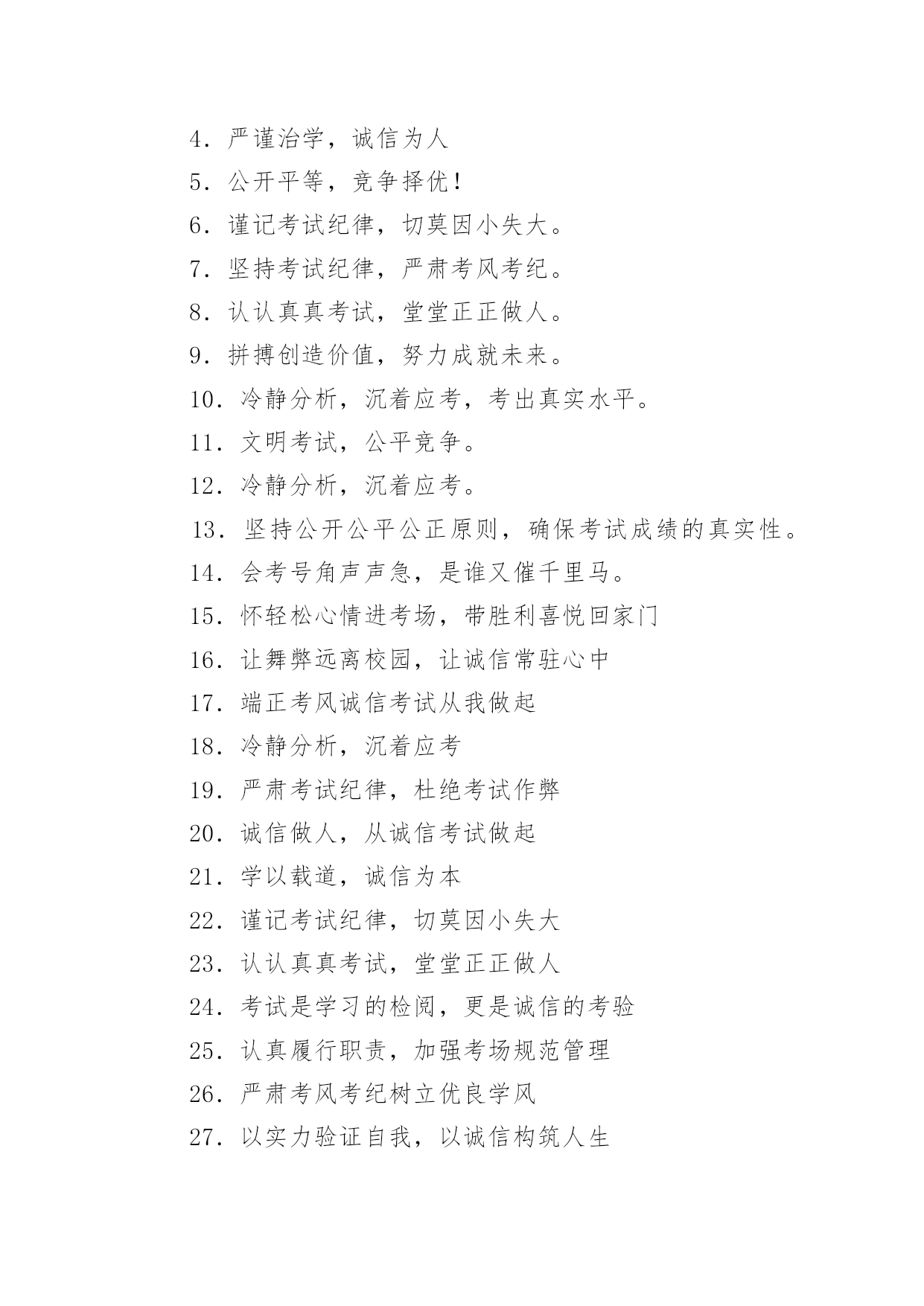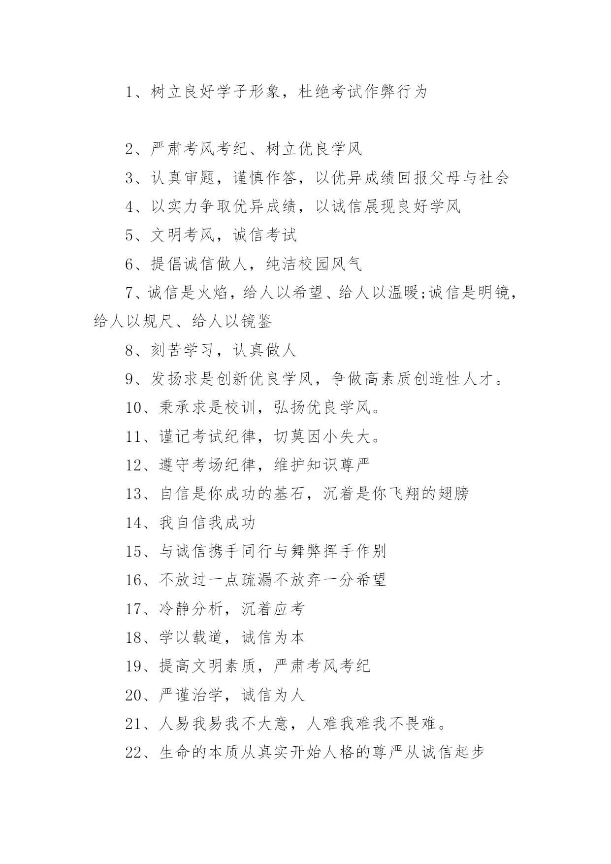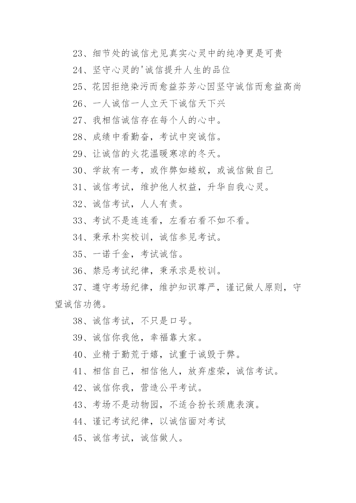 诚信考试标语诚信考试标语12篇在我们平凡的日常里,大家都接触过比较经典的标语吧,标语是一种最经济、最有效的宣传、鼓动口号。标语的类型多样,你所见过的标语是什么样的呢?以下是小编精心整理的诚信考试标语,欢迎大家分享。诚信考试标语11、开展诚信教育,倡导文明新风,打造诚信品牌;2、诚实为本,信誉为重;3、诚信光荣,欺诈可耻;4、以诚为本,以信为用;5、强化诚信意识,遵守信用规则;6、呼唤诚信,共筑诚信;7、诚实守信,知行合一;8、内强诚信素质,外树文明形象;9、树诚信新风尚,做文明大学生;10、从我做起,塑造个人诚信形象;从现在做起,倡导校园诚信风气;11、实践诚信,从我做起;12、严于律己,遵规守纪;以德立身,明礼诚信;13、铸诚信品质,做文明新人。诚信考试标语21、秉承求是校训,弘扬优良学风。2、谨记考试纪律,切莫因小失大。3、遵守考场纪律,维护知识尊严。4、自信是你成功的基石,沉着是你飞翔的翅膀。5、我自信我成功。6、与诚信携手同行与舞弊挥手作别。7、不放过一点疏漏不放弃一分希望。8、冷静分析,沉着应考。9、学以载道,诚信为本。10、提高文明素质,严肃考风考纪。11、严谨治学,诚信为人。12、人易我易我不大意,人难我难我不畏难。13、生命的本质从真实开始人格的尊严从诚信起步。14、细节处的`诚信尤见真实心灵中的纯净更是可贵。15、坚守心灵的诚信提升人生的品位。16、花因拒绝染污而愈益芬芳心因坚守诚信而愈益高尚。17、一人诚信一人立天下诚信天下兴。诚信考试标语31、相信自己,我一定行!自信是成功的第一秘诀。2、让父母的期待变成现实,让自己的理想展翅飞翔。3、积极思考造成积极人生,消极思考造成消极人生。4、信心是力量的源泉,坚持是成功的.保证。5、成绩,要靠技巧与方法;成功,要靠辛勤与汗水。6、自信是你成功的基石,沉着是你飞翔的翅膀。7、冷静应对每一事,微笑面对每一天。8、精神成人,知识成才,态度成全。9、无才无以立足,不苦不能成才。10、乐学实学,挑战中考;勤勉向上,成就自我。11、山高不厌攀,水深不厌潜,学精不厌苦。12、忘时,忘物,忘我。13、诚实,朴实,踏实。14、努力造就实力,态度决定高度。15、再辛苦三年,会幸福一生。16、我自信,我出色:我拼搏,我成功!17、拧成一股绳,搏尽一份力,狠下一条心,共圆一个梦。18、努力就能成功,坚持确保胜利。19、回忆很美,尽管过程艰辛;结果也许遗憾,可以无愧于心。20、遇难心不慌,遇易心更细。21、学练并举,成竹在胸,敢问逐鹿群雄今何在?师生同志,协力攻关,笑看燕赵魁首谁人得。22、快马加鞭,君为先,自古英雄出少年。23、作业考试化,考试中考化,平时考试当中考,中考考试当平时。24、今天多一份拼搏、明天多几份欢笑。25、贵在坚持、难在坚持、成在坚持。26、太阳每天都是新的,你是否每天都在努力。27、保持平常心,营造好环境,扬起常笑脸,轻松迎中考。28、立志高远,脚踏实地;刻苦钻研,勤学苦思;稳定心态,不馁不弃;全力以赴,夺取胜利。29、挑战人生是我无悔的选择,决胜中考是我不懈的追求。30、读书改变命运,刻苦成就事业,态度决定一切。诚信考试标语41、发扬求是创新优良学风,争做高素质创造性人才。2、秉承求是校训,弘扬优良学风。3、严肃考试纪律,杜绝考试作弊。4、认真履行职责,加强考场规范管理。5、杜绝考试违纪行为,确保考试结果公正。6、认认真真考试,堂堂正正做人。7、谨记考试纪律,切莫因小失大。8、冷静分析,沉着应考,考出真实水平。9、考试是学习的检阅,更是诚信的考验10、考试是学习的检阅,更是诚信的.考验11、以实力验证自我,以诚信构筑人生12、端正考风诚信考试从我做起13、让舞弊远离校园,让诚信常驻心中14、以诚实考试为荣,以违纪作弊为耻15、诚信做人,从诚信考试做起16、严肃考风考纪,建设优良学风17、诚实守信,拒绝舞弊18、树立良好学子形象,杜绝考试作弊行为19、严肃考风考纪、树立优良学风20、认真审题,谨慎作答,以优异成绩回报父母与社会21、以实力争取优异成绩,以诚信展现良好学风22、文明考风,诚信考试23、提倡诚信做人,纯洁校园风气24、诚信是火焰,给人以希望、给人以温暖;诚信是明镜,给人以规尺、给人以镜鉴25、刻苦学习,认真做人26、发扬求是创新优良学风,争做高素质创造性人才。27、秉承求是校训,弘扬优良学风。28、谨记考试纪律,切莫因小失大。29、遵守考场纪律,维护知识尊严30、自信是你成功的基石,沉着是你飞翔的翅膀31、我自信我成功32、与诚信携手同行与舞弊挥手作别33、不放过一点疏漏不放弃一分希望34、冷静分析,沉着应考35、学以载道,诚信为本36、提高文明素质,严肃考风考纪37、严谨治学,诚信为人诚信考试标语51、树立良好学子形象,杜绝考试作弊行为2、严肃考风