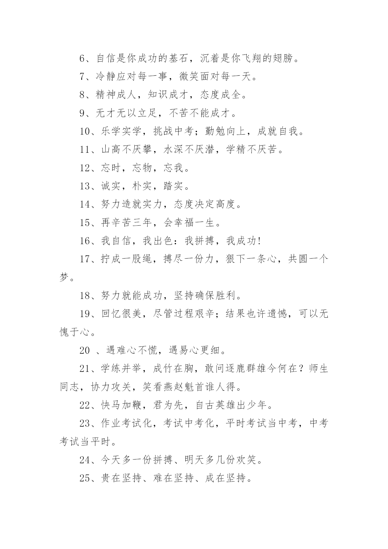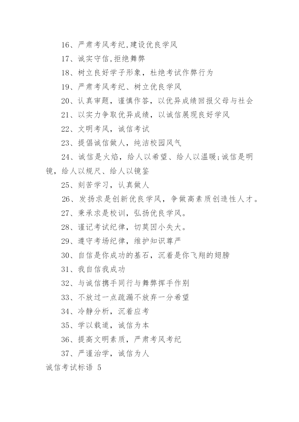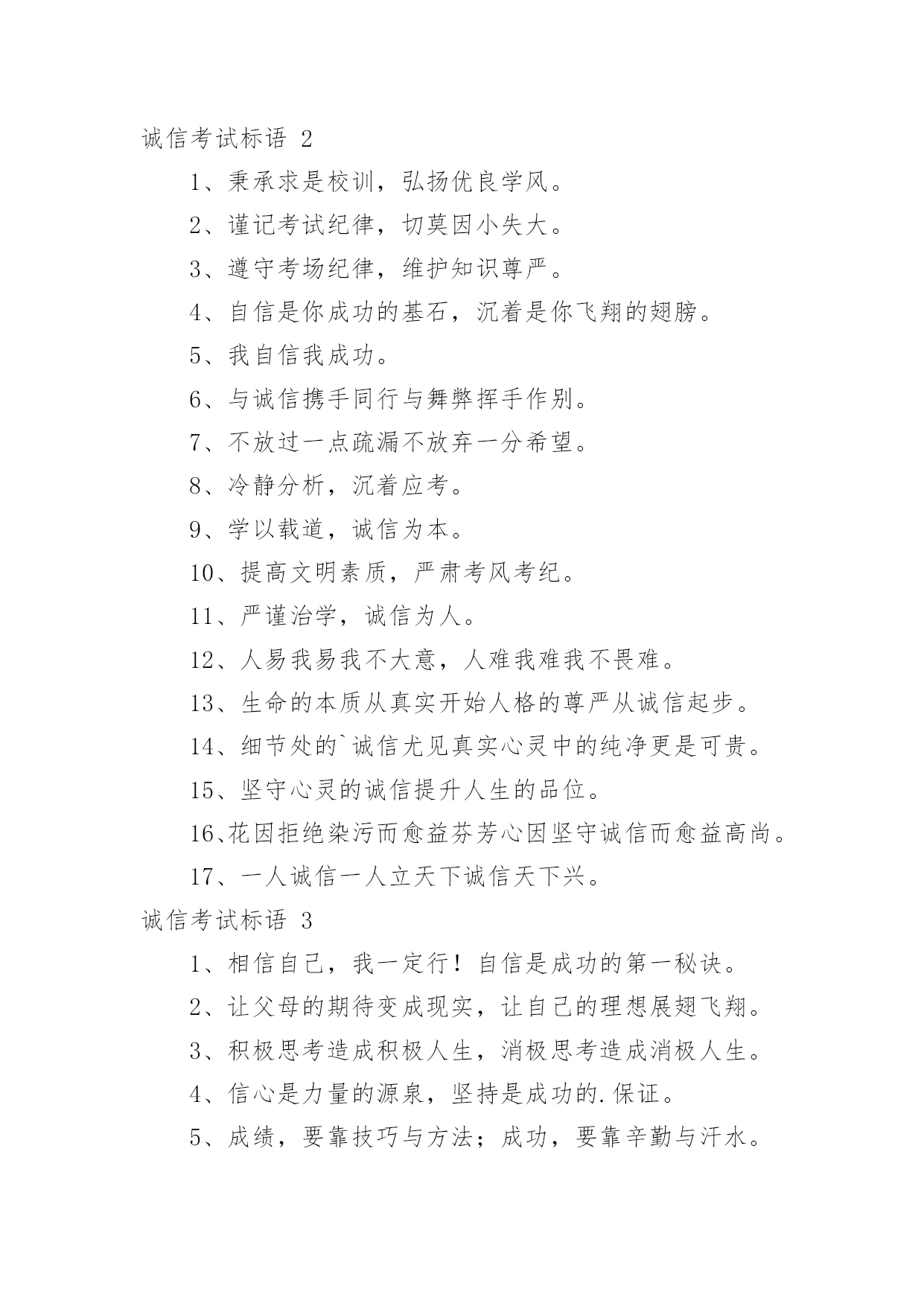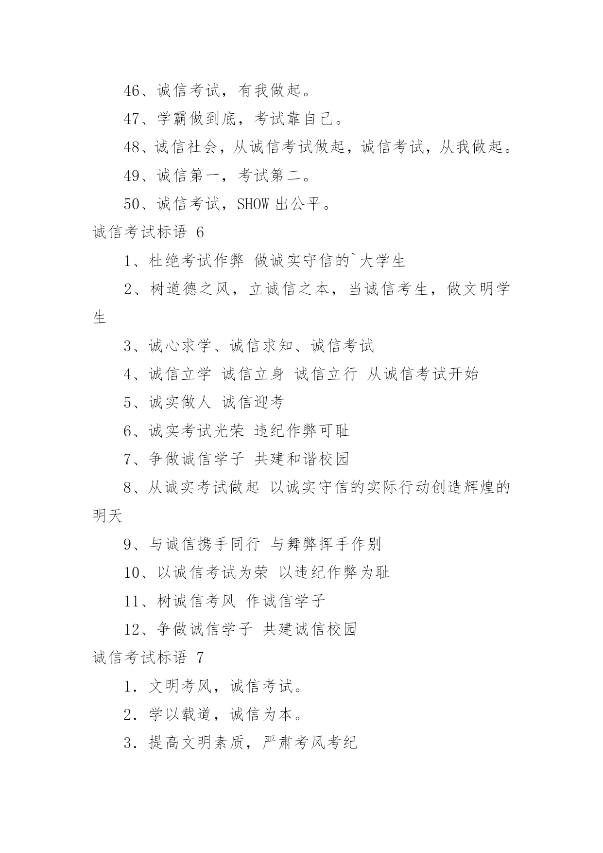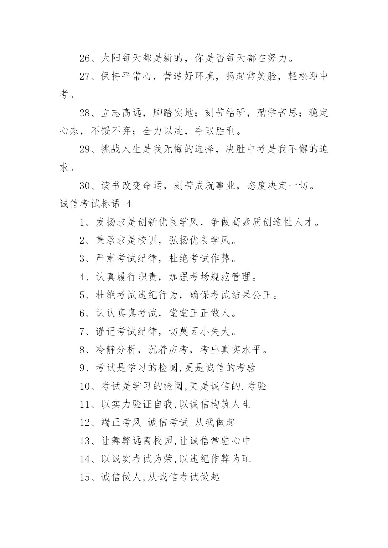 诚信考试标语诚信考试标语12篇在我们平凡的日常里,大家都接触过比较经典的标语吧,标语是一种最经济、最有效的宣传、鼓动口号。标语的类型多样,你所见过的标语是什么样的呢?以下是小编精心整理的诚信考试标语,欢迎大家分享。诚信考试标语11、开展诚信教育,倡导文明新风,打造诚信品牌;2、诚实为本,信誉为重;3、诚信光荣,欺诈可耻;4、以诚为本,以信为用;5、强化诚信意识,遵守信用规则;6、呼唤诚信,共筑诚信;7、诚实守信,知行合一;8、内强诚信素质,外树文明形象;9、树诚信新风尚,做文明大学生;10、从我做起,塑造个人诚信形象;从现在做起,倡导校园诚信风气;11、实践诚信,从我做起;12、严于律己,遵规守纪;以德立身,明礼诚信;13、铸诚信品质,做文明新人。诚信考试标语21、秉承求是校训,弘扬优良学风。2、谨记考试纪律,切莫因小失大。3、遵守考场纪律,维护知识尊严。4、自信是你成功的基石,沉着是你飞翔的翅膀。5、我自信我成功。6、与诚信携手同行与舞弊挥手作别。7、不放过一点疏漏不放弃一分希望。8、冷静分析,沉着应考。9、学以载道,诚信为本。10、提高文明素质,严肃考风考纪。11、严谨治学,诚信为人。12、人易我易我不大意,人难我难我不畏难。13、生命的本质从真实开始人格的尊严从诚信起步。14、细节处的`诚信尤见真实心灵中的纯净更是可贵。15、坚守心灵的诚信提升人生的品位。16、花因拒绝染污而愈益芬芳心因坚守诚信而愈益高尚。17、一人诚信一人立天下诚信天下兴。诚信考试标语31、相信自己,我一定行!自信是成功的第一秘诀。2、让父母的期待变成现实,让自己的理想展翅飞翔。3、积极思考造成积极人生,消极思考造成消极人生。4、信心是力量的源泉,坚持是成功的.保证。5、成绩,要靠技巧与方法;成功,要靠辛勤与汗水。6、自信是你成功的基石,沉着是你飞翔的翅膀。7、冷静应对每一事,微笑面对每一天。8、精神成人,知识成才,态度成全。9、无才无以立足,不苦不能成才。10、乐学实学,挑战中考;勤勉向上,成就自我。11、山高不厌攀,水深不厌潜,学精不厌苦。12、忘时,忘物,忘我。13、诚实,朴实,踏实。14、努力造就实力,态度决定高度。15、再辛苦三年,会幸福一生。16、我自信,我出色:我拼搏,我成功!17、拧成一股绳,搏尽一份力,狠下一条心,共圆一个梦。18、努力就能成功,坚持确保胜利。19、回忆很美,尽管过程艰辛;结果也许遗憾,可以无愧于心。20、遇难心不慌,遇易心更细。21、学练并举,成竹在胸,敢问逐鹿群雄今何在?师生同志,协力攻关,笑看燕赵魁首谁人得。22、快马加鞭,君为先,自古英雄出少年。23、作业考试化,考试中考化,平时考试当中考,中考考试当平时。24、今天多一份拼搏、明天多几份欢笑。25、贵在坚持、难在坚持、成在坚持。26、太阳每天都是新的,你是否每天都在努力。27、保持平常心,营造好环境,扬起常笑脸,轻松迎中考。28、立志高远,脚踏实地;刻苦钻研,勤学苦思;稳定心态,不馁不弃;全力以赴,夺取胜利。29、挑战人生是我无悔的选择,决胜中考是我不懈的追求。30、读书改变命运,刻苦成就事业,态度决定一切。诚信考试标语41、发扬求是创新优良学风,争做高素质创造性人才。2、秉承求是校训,弘扬优良学风。3、严肃考试纪律,杜绝考试作弊。4、认真履行职责,加强考场规范管理。5、杜绝考试违纪行为,确保考试结果公正。6、认认真真考试,堂堂正正做人。7、谨记考试纪律,切莫因小失大。8、冷静分析,沉着应考,考出真实水平。9、考试是学习的检阅,更是诚信的考验10、考试是学习的检阅,更是诚信的.考验11、以实力验证自我,以诚信构筑人生12、端正考风诚信考试从我做起13、让舞弊远离校园,让诚信常驻心中14、以诚实考试为荣,以违纪作弊为耻15、诚信做人,从诚信考试做起16、严肃考风考纪,建设优良学风17、诚实守信,拒绝舞弊18、树立良好学子形象,杜绝考试作弊行为19、严肃考风考纪、树立优良学风20、认真审题,谨慎作答,以优异成绩回报父母与社会21、以实力争取优异成绩,以诚信展现良好学风22、文明考风,诚信考试23、提倡诚信做人,纯洁校园风气24、诚信是火焰,给人以希望、给人以温暖;诚信是明镜,给人以规尺、给人以镜鉴25、刻苦学习,认真做人26、发扬求是创新优良学风,争做高素质创造性人才。27、秉承求是校训,弘扬优良学风。28、谨记考试纪律,切莫因小失大。29、遵守考场纪律,维护知识尊严30、自信是你成功的基石,沉着是你飞翔的翅膀31、我自信我成功32、与诚信携手同行与舞弊挥手作别33、不放过一点疏漏不放弃一分希望34、冷静分析,沉着应考35、学以载道,诚信为本36、提高文明素质,严肃考风考纪37、严谨治学,诚信为人诚信考试标语51、树立良好学子形象,杜绝考试作弊行为2、严肃考风