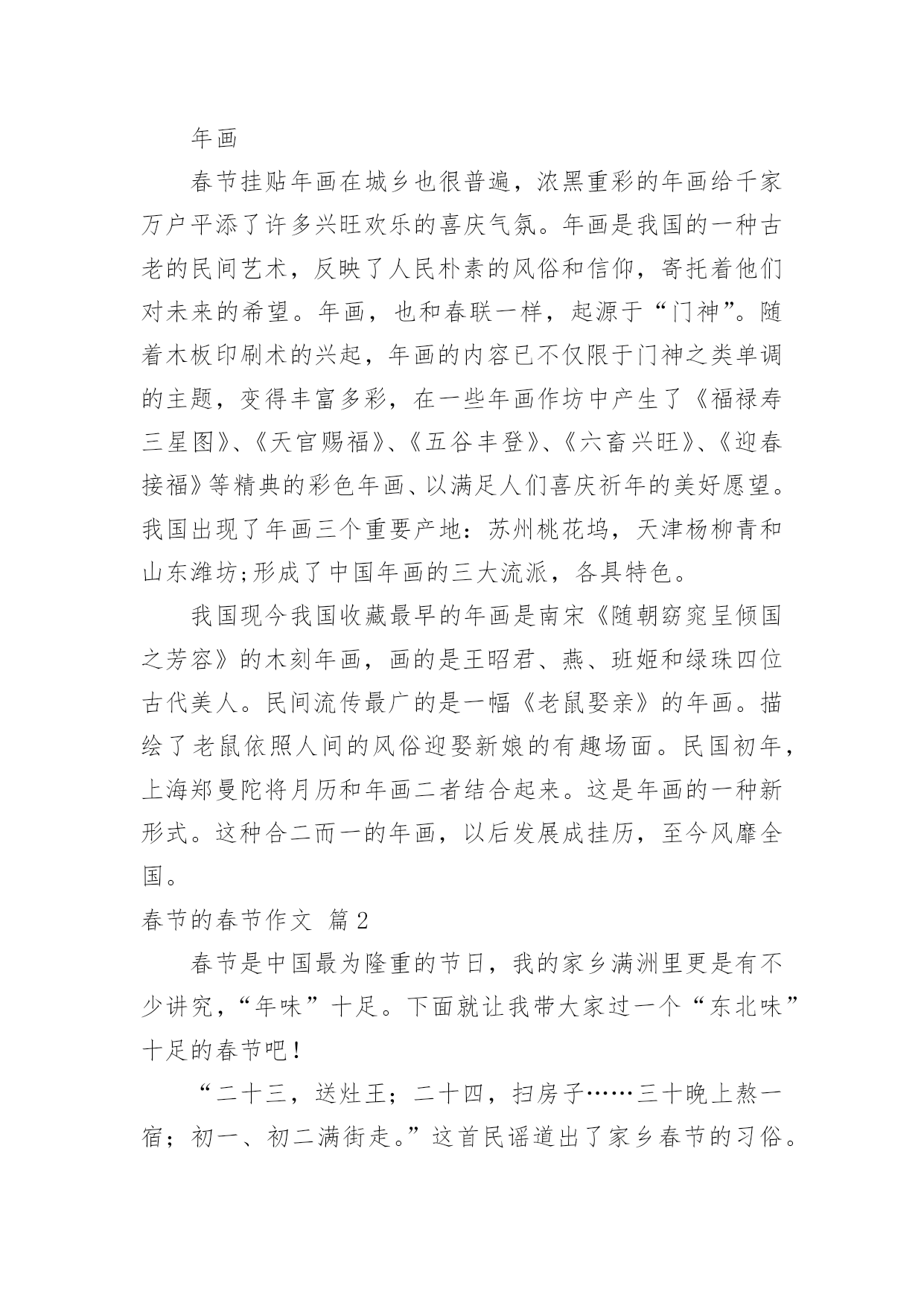 春节的春节作文精选春节的春节作文锦集8篇无论是身处学校还是步入社会,许多人都有过写作文的经历,对作文都不陌生吧,作文要求篇章结构完整,一定要避免无结尾作文的出现。你写作文时总是无从下笔?以下是小编整理的春节的春节作文8篇,欢迎大家分享。春节的春节作文篇1贴窗花和倒贴“福”字在民间人们还喜欢在窗户上贴上各种剪纸——窗花。窗花不仅烘托了喜庆的节日气氛,也集装饰性、欣赏性和实用性于一体。剪纸在我国是一种很普及的民间艺术,千百年来深受人们的喜爱,因它大多是贴在窗户上的,所以也被称其为“窗花”。窗花以其特有的概括和