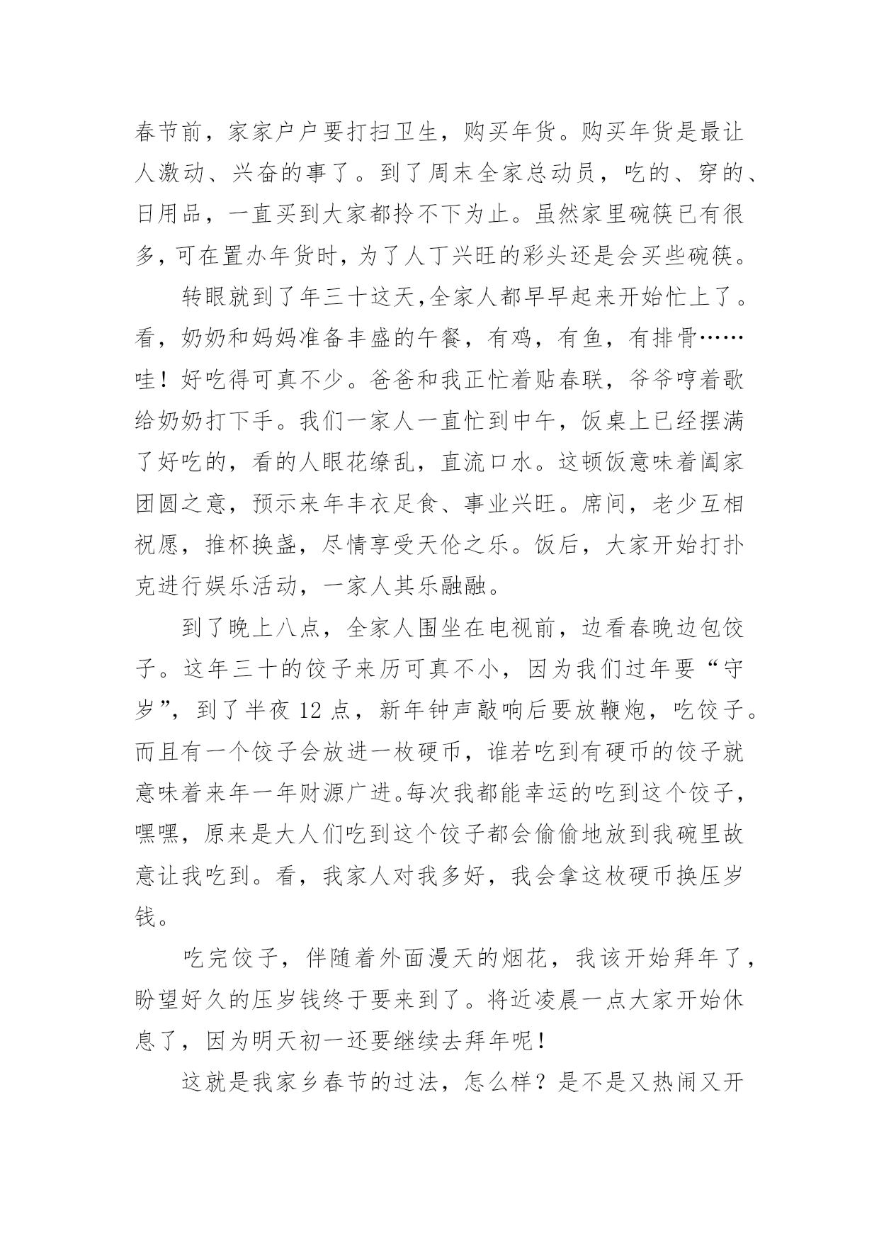 春节春节作文关于春节春节作文集锦9篇在日常的学习、工作、生活中,大家对作文都不陌生吧,作文是通过文字来表达一个主题意义的记叙方法。还是对作文一筹莫展吗?以下是小编为大家整理的春节春节作文9篇,欢迎大家借鉴与参考,希望对大家有所帮助。春节春节作文篇1春节是中国最为隆重的节日,我的家乡满洲里更是有不少讲究,“年味”十足。下面就让我带大家过一个“东北味”十足的春节吧!“二十三,送灶王;二十四,扫房子……三十晚上熬一宿;初一、初二满街走。”这首民谣道出了家乡春节的习俗。春节前,家家户户要打扫卫生,购买年货。购买年