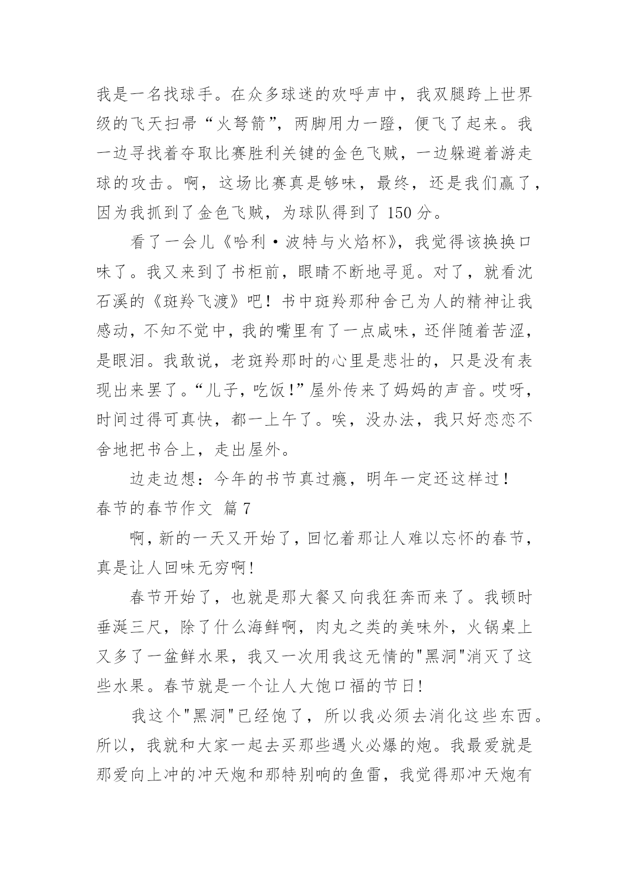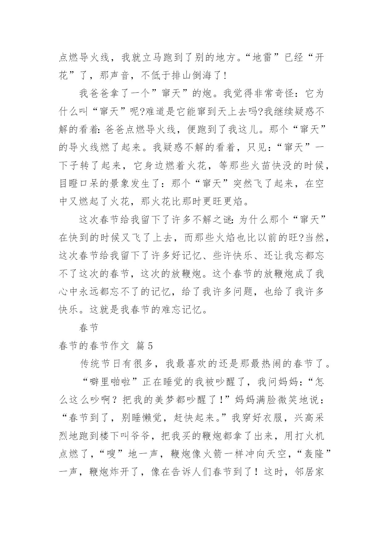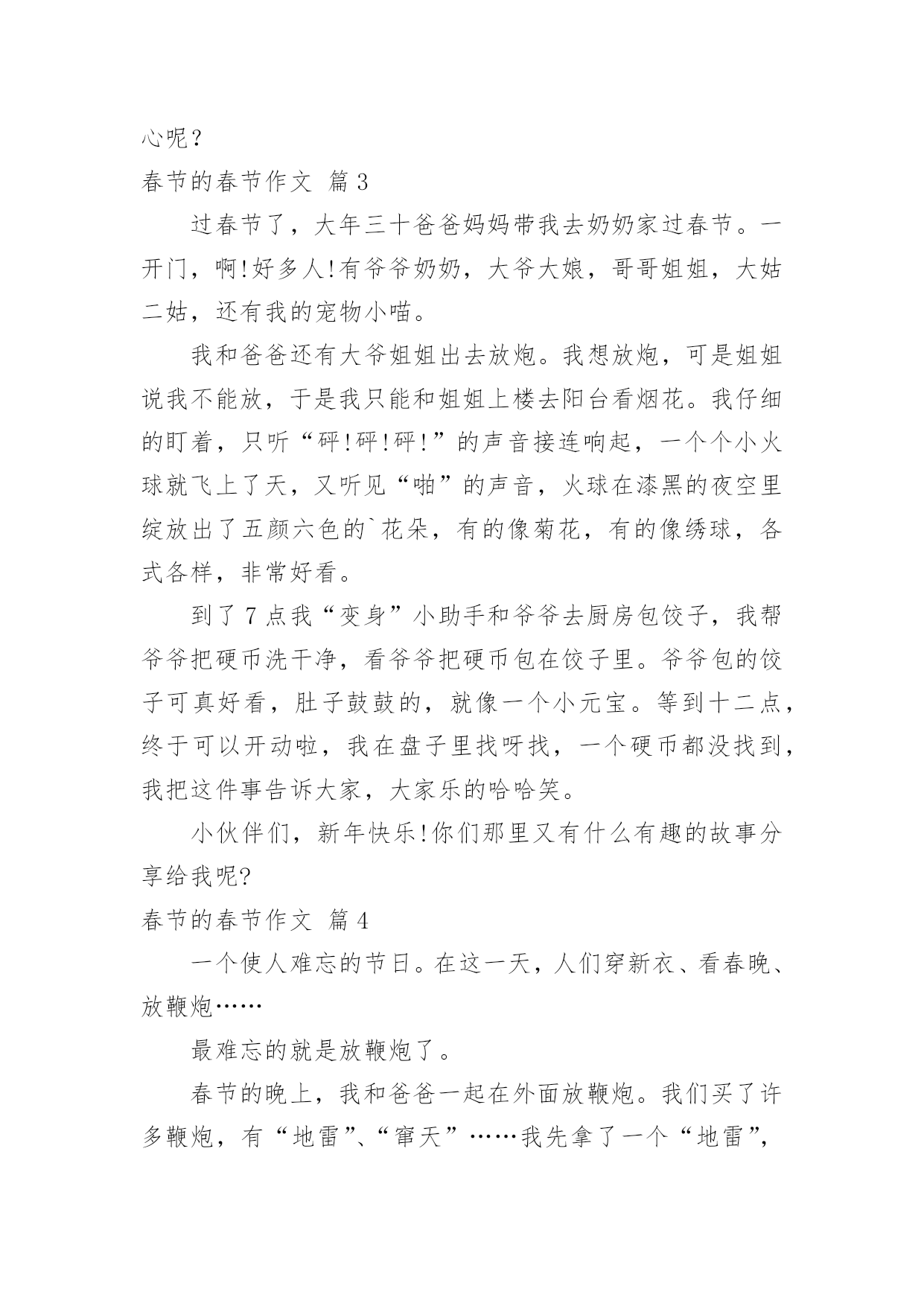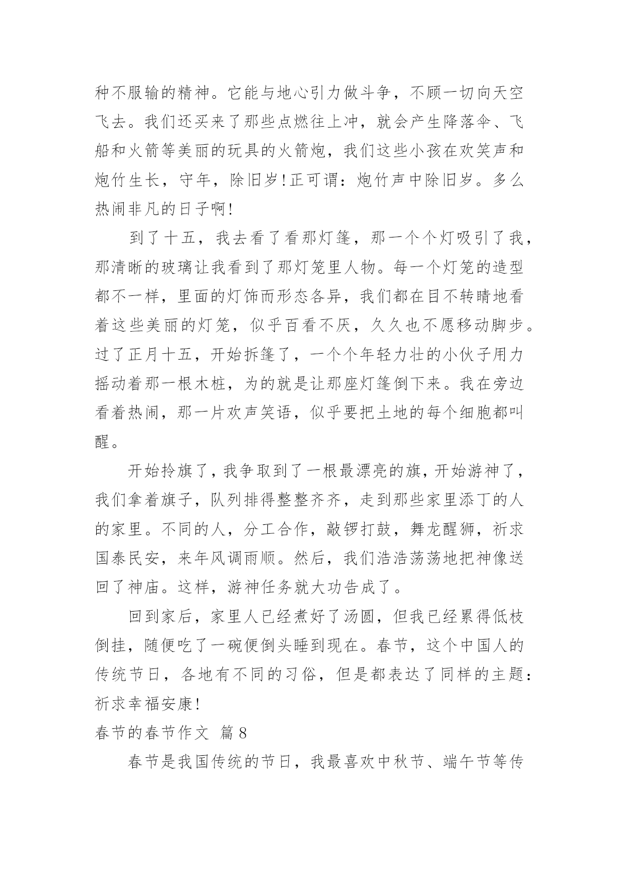 春节的春节的作文【推荐】春节的春节的作文汇编八篇在日常学习、工作或生活中,大家都跟作文打过交道吧,写作文是培养人们的观察力、联想力、想象力、思考力和记忆力的重要手段。那要怎么写好作文呢?下面是小编精心整理的春节的春节的作文9篇,希望对大家有所帮助。春节的春节的作文篇1时光总会把生活中一页一页的故事毫不留情地翻了过去,打开记忆的匣子,脑海里就像过电影一般,思绪就这样停泊在了20xx年的冬天:爸爸妈妈带着我和弟弟正在买东西。记得当时是要回爷爷奶奶家过年。狂风放肆地卷着雪就这样漫天飞舞着,我们在哪儿瑟瑟地站着。
