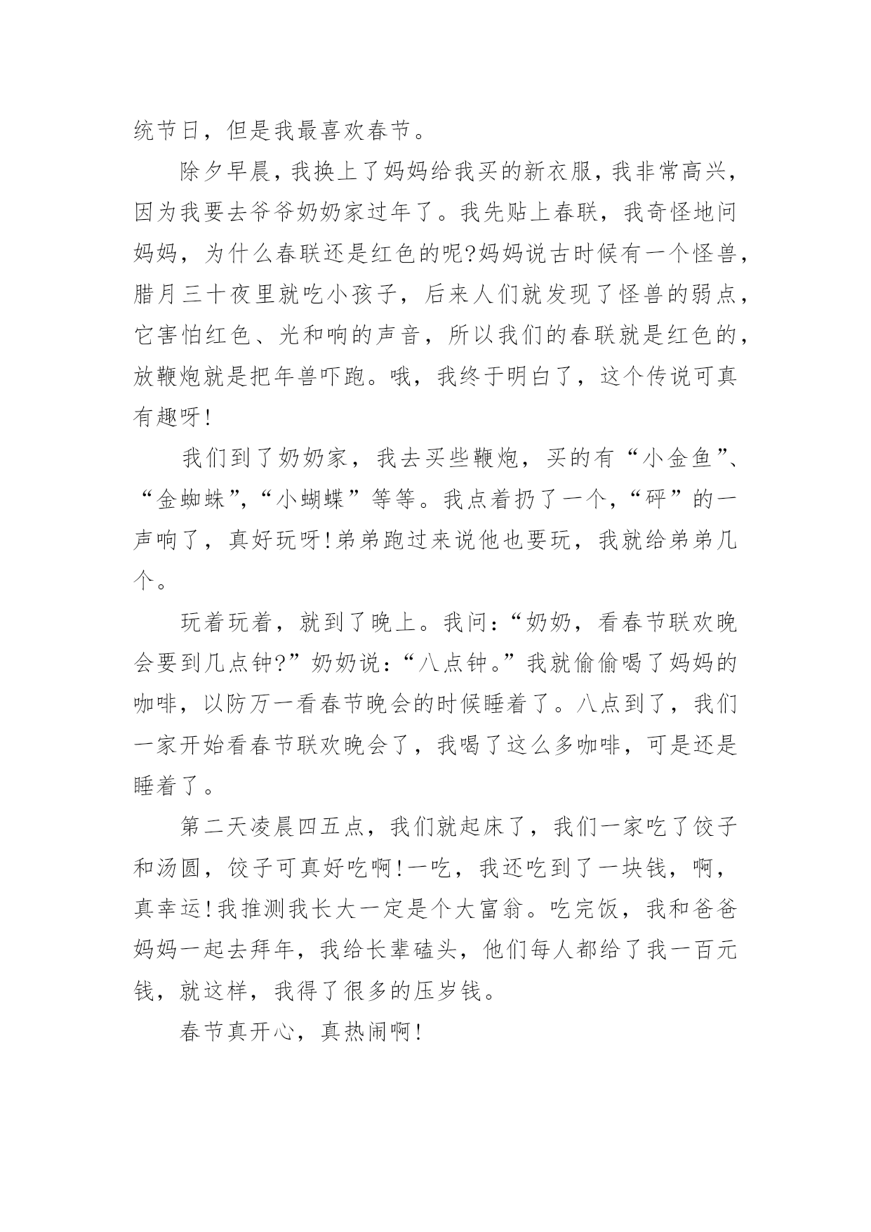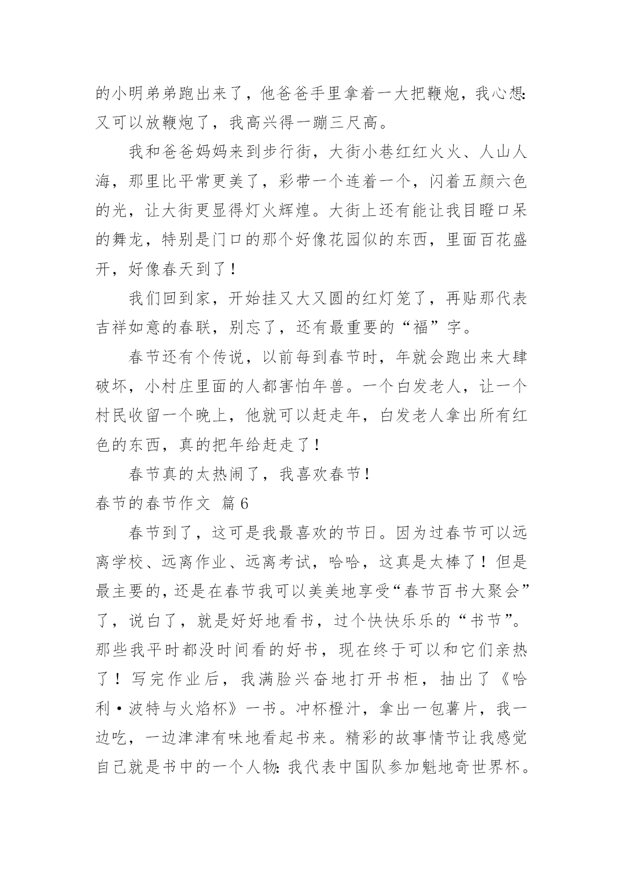 春节的春节作文春节的春节作文集合六篇在日常学习、工作抑或是生活中,大家都经常看到作文的身影吧,写作文是培养人们的观察力、联想力、想象力、思考力和记忆力的重要手段。你写作文时总是无从下笔?下面是小编为大家整理的春节的春节作文6篇,欢迎大家分享。春节的春节作文篇1盼啊!盼啊!终于盼来了春节。瞧,人们个个喜气洋洋,个个精神饱满。逛街的人络绎不绝,有的在买新衣服,有的在买春联,有的在办年货……街上热闹非凡。妈妈把家里打扫得干干净净,挂起了红灯笼,贴上春联,家里充满了节日的气氛。为了准备年夜饭,大人们在厨房里忙得不