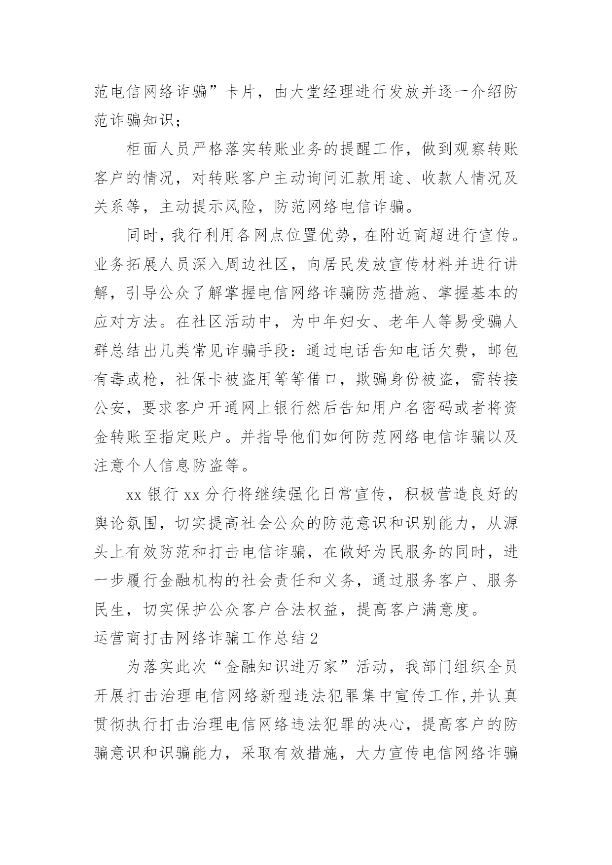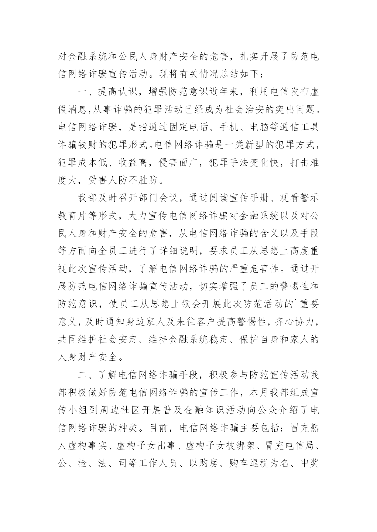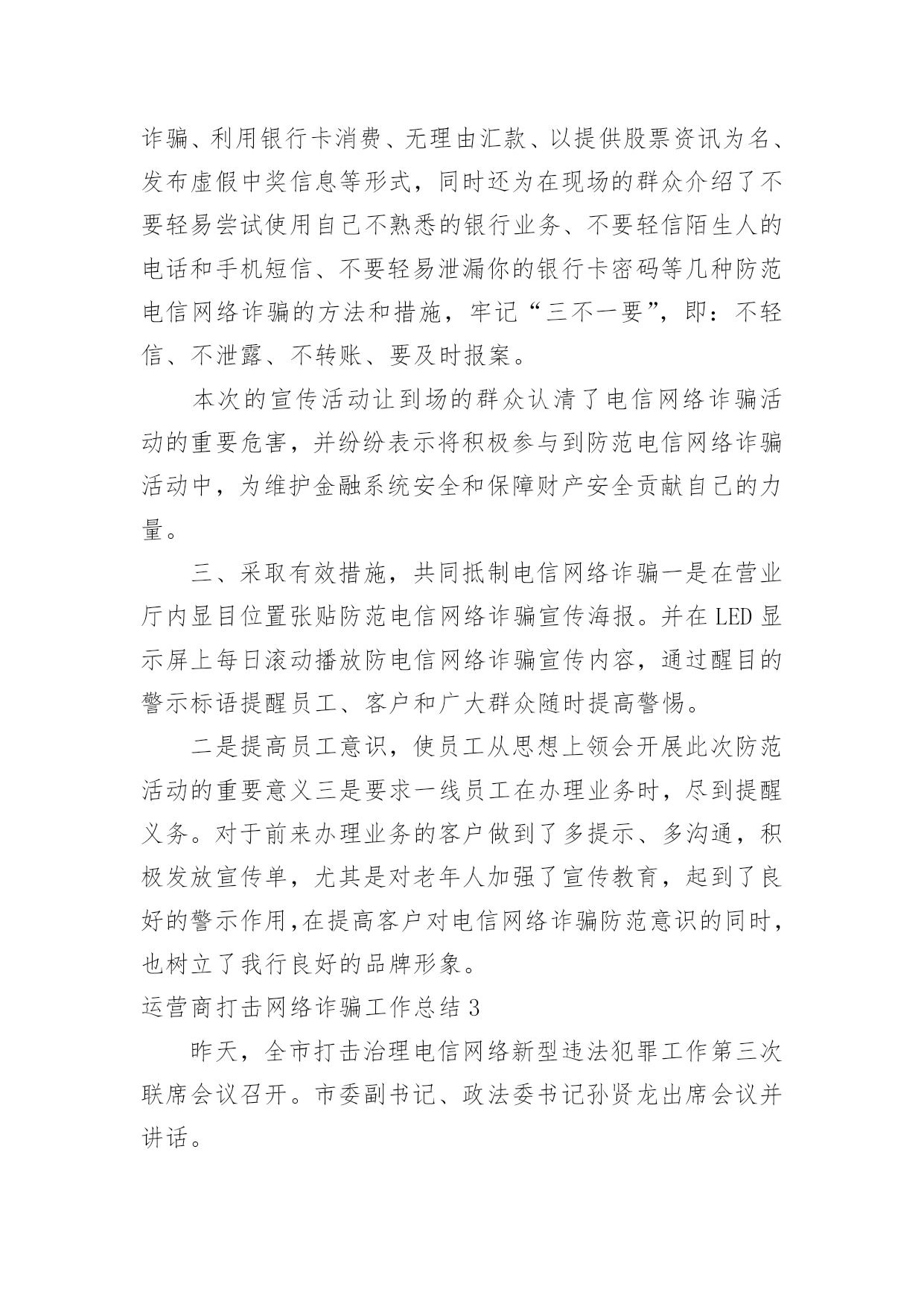 运营商打击网络诈骗工作总结运营商打击网络诈骗工作总结总结是指社会团体、企业单位和个人在自身的某一时期、某一项目或某些工作告一段落或者全部完成后进行回顾检查、分析评价,从而肯定成绩,得到经验,找出差距,得出教训和一些规律性认识的一种书面材料,它能使我们及时找出错误并改正,因此十分有必须要写一份总结哦。那么我们该怎么去写总结呢?以下是小编收集整理的运营商打击网络诈骗工作总结,欢迎阅读与收藏。运营商打击网络诈骗工作总结1随着互联网、通信技术的发展,一些不法之徒利用现代通讯技术和网络等方式不断翻新诈骗手段,电信网络诈骗愈加呈现出手段高科技化、形式多样化、过程迅速化、作案隐蔽化的特点,防范打击工作形势依然严峻。作为最贴近客户的`基层部门,xx银行xx分行营业部开展了防范电信诈骗集中宣传月活动。宣传月活动期间,采取了以“厅堂网点+社区”模式,扩大了宣传阵地,为防范网络诈骗知识宣传搭建良好平台。坚持开展对员工的安全意识教育和防范制度措施的学习,及时转发身边查堵案例和上级行的风险提示。在厅堂网点的柜台区、网银区、理财区、自助区及其他显著位置均摆放“防范电信网络诈骗”卡片,由大堂经理进行发放并逐一介绍防范诈骗知识;柜面人员严格落实转账业务的提醒工作,做到观察转账客户的情况,对转账客户主动询问汇款用途、收款人情况及关系等,主动提示风险,防范网络电信诈骗。同时,我行利用各网点位置优势,在附近商超进行宣传。业务拓展人员深入周边社区,向居民发放宣传材料并进行讲解,引导公众了解掌握电信网络诈骗防范措施、掌握基本的应对方法。在社区活动中,为中年妇女、老年人等易受骗人群总结出几类常见诈骗手段:通过电话告知电话欠费,邮包有毒或枪,社保卡被盗用等等借口,欺骗身份被盗,需转接公安,要求客户开通网上银行然后告知用户名密码或者将资金转账至指定账户。并指导他们如何防范网络电信诈骗以及注意个人信息防盗等。xx银行xx分行将继续强化日常宣传,积极营造良好的舆论氛围,切实提高社会公众的防范意识和识别能力,从源头上有效防范和打击电信诈骗,在做好为民服务的同时,进一步履行金融机构的社会责任和义务,通过服务客户、服务民生,切实保护公众客户合法权益,提高客户满意度。运营商打击网络诈骗工作总结2为落实此次“金融知识进万家”活动,我部门组织全员开展打击治理电信网络新型违法犯罪集中宣传工作,并认真贯彻执行打击治理电信网络违法犯罪的决心,提高客户的防骗意识和识骗能力,采取有效措施,大力宣传电信网络诈骗对金融系统和公民人身财产安全的危害,扎实开展了防范电信网络诈骗宣传活动。现将有关情况总结如下:一、提高认识,增强防范意识近年来,利用电信发布虚假消息,从事诈骗的犯罪活动已经成为社会治安的突出问题。电信网络诈骗,是指通过固定电话、手机、电脑等通信工具诈骗钱财的犯罪形式。电信网络诈骗是一类新型的犯罪方式,犯罪成本低、收益高,侵害面广,犯罪手法变化快,打击难度大,受害人防不胜防。我部及时召开部门会议,通过阅读宣传手册、观看警示教育片等形式,大力宣传电信网络诈骗对金融系统以及对公民人身和财产安全的危害,从电信网络诈骗的含义以及手段等方面向全员工进行了详细说明,要求员工从思想上高度重视此次宣传活动,了解电信网络诈骗的严重危害性。通过开展防范电信网络诈骗宣传活动,切实增强了员工的警惕性和防范意识,使员工从思想上领会开展此次防范活动的`重要意义,及时通知身边家人及来往客户提高警惕性,齐心协力,共同维护社会安定、维持金融系统稳定、保护自身和家人的人身财产安全。二、了解电信网络诈骗手段,积极参与防范宣传活动我部积极做好防范电信网络诈骗的宣传工作,本月我部组成宣传小组到周边社区开展普及金融知识活动向公众介绍了电信网络诈骗的种类。目前,电信网络诈骗主要包括:冒充熟人虚构事实、虚构子女出事、虚构子女被绑架、冒充电信局、公、检、法、司等工作人员、以购房、购车退税为名、中奖诈骗、利用银行卡消费、无理由汇款、以提供股票资讯为名、发布虚假中奖信息等形式,同时还为在现场的群众介绍了不要轻易尝试使用自己不熟悉的银行业务、不要轻信陌生人的电话和手机短信、不要轻易泄漏你的银行卡密码等几种防范电信网络诈骗的方法和措施,牢记“三不一要”,即:不轻信、不泄露、不转账、要及时报案。本次的宣传活动让到场的群众认清了电信网络诈骗活动的重要危害,并纷纷表示将积极参与到防范电信网络诈骗活动中,为维护金融系统安全和保障财产安全贡献自己的力量。三、采取有效措施,共同抵制电信网络诈骗一是在营业厅内显目位置张贴防范电信网络诈骗宣传海报。并在LED显示屏上每日滚动播放防电信网络诈骗宣传内容,通过醒目的警示标语提醒员工、客户和广大群众随时提高警惕。二是提高员工意识,使员工从思想上领会开展此次防范活动的重要意义三是要求一线员工在办理业务时,尽到提醒义务。对于前