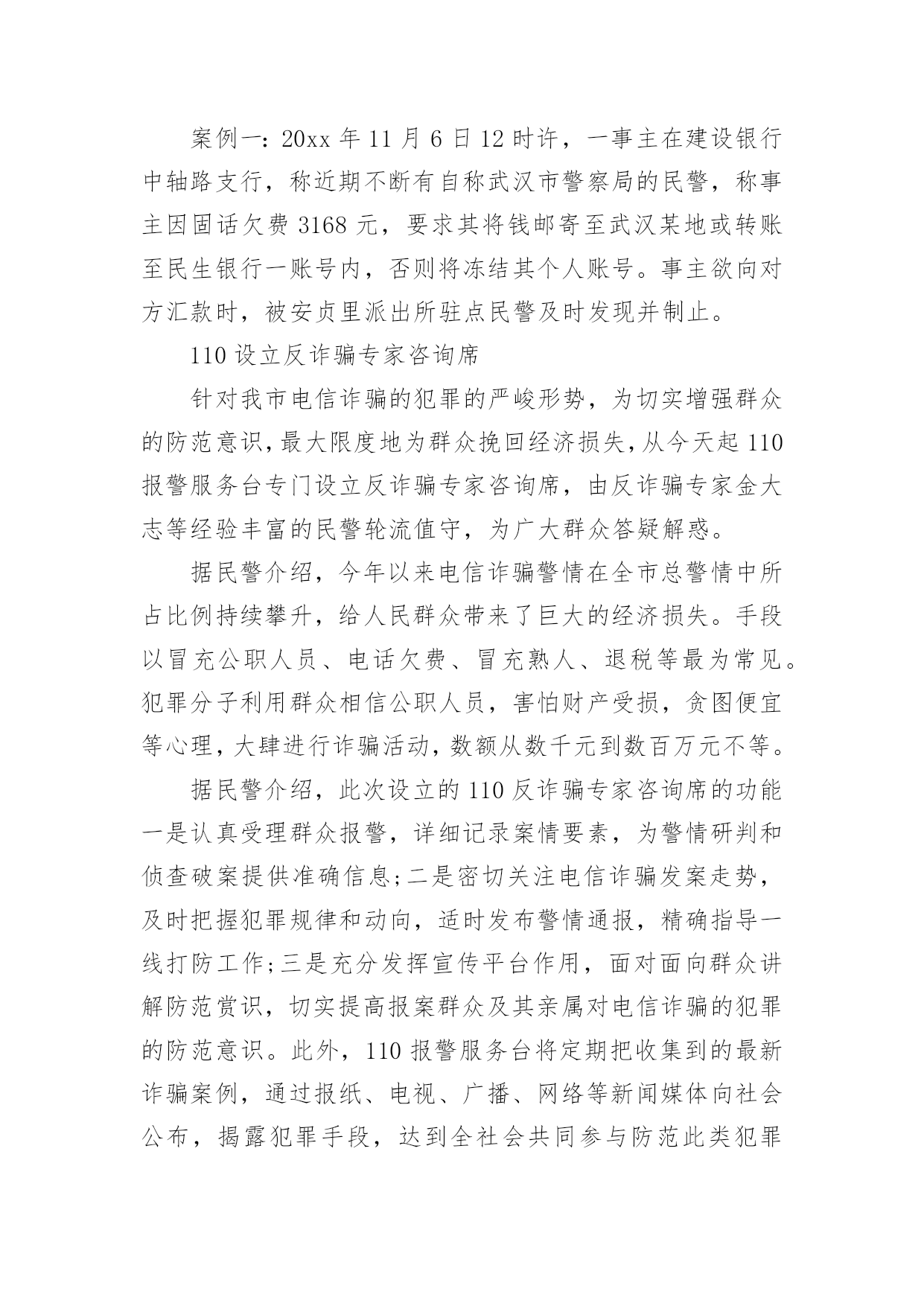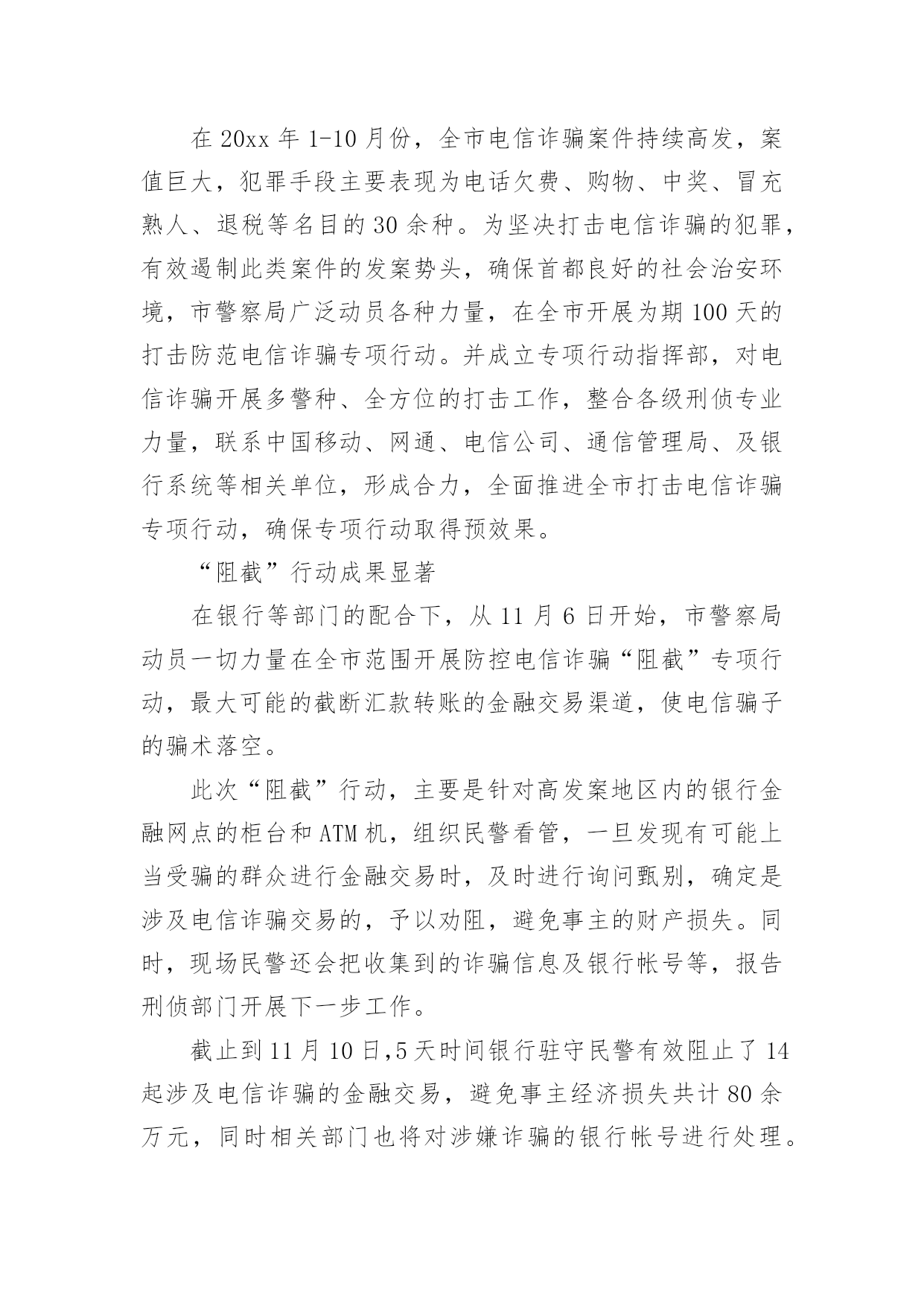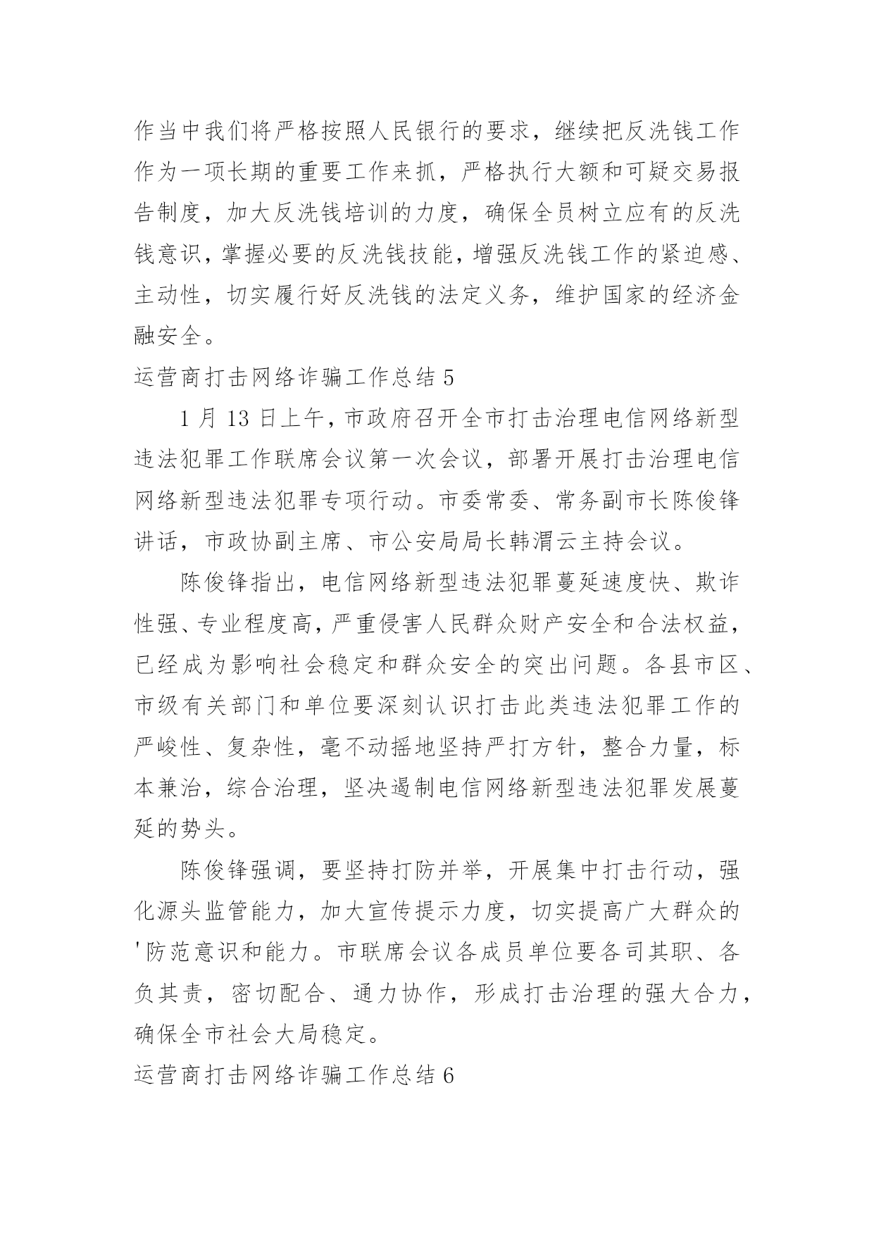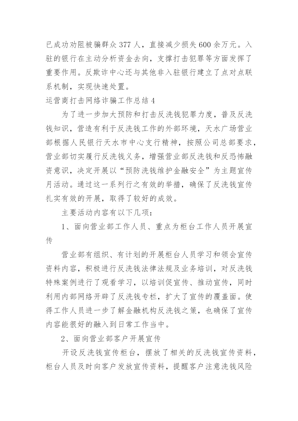 运营商打击网络诈骗工作总结运营商打击网络诈骗工作总结总结是指社会团体、企业单位和个人在自身的某一时期、某一项目或某些工作告一段落或者全部完成后进行回顾检查、分析评价,从而肯定成绩,得到经验,找出差距,得出教训和一些规律性认识的一种书面材料,它能使我们及时找出错误并改正,因此十分有必须要写一份总结哦。那么我们该怎么去写总结呢?以下是小编收集整理的运营商打击网络诈骗工作总结,欢迎阅读与收藏。运营商打击网络诈骗工作总结1随着互联网、通信技术的发展,一些不法之徒利用现代通讯技术和网络等方式不断翻新诈骗手段,电信网络诈骗愈加呈现出手段高科技化、形式多样化、过程迅速化、作案隐蔽化的特点,防范打击工作形势依然严峻。作为最贴近客户的`基层部门,xx银行xx分行营业部开展了防范电信诈骗集中宣传月活动。宣传月活动期间,采取了以“厅堂网点+社区”模式,扩大了宣传阵地,为防范网络诈骗知识宣传搭建良好平台。坚持开展对员工的安全意识教育和防范制度措施的学习,及时转发身边查堵案例和上级行的风险提示。在厅堂网点的柜台区、网银区、理财区、自助区及其他显著位置均摆放“防范电信网络诈骗”卡片,由大堂经理进行发放并逐一介绍防范诈骗知识;柜面人员严格落实转账业务的提醒工作,做到观察转账客户的情况,对转账客户主动询问汇款用途、收款人情况及关系等,主动提示风险,防范网络电信诈骗。同时,我行利用各网点位置优势,在附近商超进行宣传。业务拓展人员深入周边社区,向居民发放宣传材料并进行讲解,引导公众了解掌握电信网络诈骗防范措施、掌握基本的应对方法。在社区活动中,为中年妇女、老年人等易受骗人群总结出几类常见诈骗手段:通过电话告知电话欠费,邮包有毒或枪,社保卡被盗用等等借口,欺骗身份被盗,需转接公安,要求客户开通网上银行然后告知用户名密码或者将资金转账至指定账户。并指导他们如何防范网络电信诈骗以及注意个人信息防盗等。xx银行xx分行将继续强化日常宣传,积极营造良好的舆论氛围,切实提高社会公众的防范意识和识别能力,从源头上有效防范和打击电信诈骗,在做好为民服务的同时,进一步履行金融机构的社会责任和义务,通过服务客户、服务民生,切实保护公众客户合法权益,提高客户满意度。运营商打击网络诈骗工作总结2为落实此次“金融知识进万家”活动,我部门组织全员开展打击治理电信网络新型违法犯罪集中宣传工作,并认真贯彻执行打击治理电信网络违法犯罪的决心,提高客户的防骗意识和识骗能力,采取有效措施,大力宣传电信网络诈骗对金融系统和公民人身财产安全的危害,扎实开展了防范电信网络诈骗宣传活动。现将有关情况总结如下:一、提高认识,增强防范意识近年来,利用电信发布虚假消息,从事诈骗的犯罪活动已经成为社会治安的突出问题。电信网络诈骗,是指通过固定电话、手机、电脑等通信工具诈骗钱财的犯罪形式。电信网络诈骗是一类新型的犯罪方式,犯罪成本低、收益高,侵害面广,犯罪手法变化快,打击难度大,受害人防不胜防。我部及时召开部门会议,通过阅读宣传手册、观看警示教育片等形式,大力宣传电信网络诈骗对金融系统以及对公民人身和财产安全的危害,从电信网络诈骗的含义以及手段等方面向全员工进行了详细说明,要求员工从思想上高度重视此次宣传活动,了解电信网络诈骗的严重危害性。通过开展防范电信网络诈骗宣传活动,切实增强了员工的警惕性和防范意识,使员工从思想上领会开展此次防范活动的`重要意义,及时通知身边家人及来往客户提高警惕性,齐心协力,共同维护社会安定、维持金融系统稳定、保护自身和家人的人身财产安全。二、了解电信网络诈骗手段,积极参与防范宣传活动我部积极做好防范电信网络诈骗的宣传工作,本月我部组成宣传小组到周边社区开展普及金融知识活动向公众介绍了电信网络诈骗的种类。目前,电信网络诈骗主要包括:冒充熟人虚构事实、虚构子女出事、虚构子女被绑架、冒充电信局、公、检、法、司等工作人员、以购房、购车退税为名、中奖诈骗、利用银行卡消费、无理由汇款、以提供股票资讯为名、发布虚假中奖信息等形式,同时还为在现场的群众介绍了不要轻易尝试使用自己不熟悉的银行业务、不要轻信陌生人的电话和手机短信、不要轻易泄漏你的银行卡密码等几种防范电信网络诈骗的方法和措施,牢记“三不一要”,即:不轻信、不泄露、不转账、要及时报案。本次的宣传活动让到场的群众认清了电信网络诈骗活动的重要危害,并纷纷表示将积极参与到防范电信网络诈骗活动中,为维护金融系统安全和保障财产安全贡献自己的力量。三、采取有效措施,共同抵制电信网络诈骗一是在营业厅内显目位置张贴防范电信网络诈骗宣传海报。并在LED显示屏上每日滚动播放防电信网络诈骗宣传内容,通过醒目的警示标语提醒员工、客户和广大群众随时提高警惕。二是提高员工意识,使员工从思想上领会开展此次防范活动的重要意义三是要求一线员工在办理业务时,尽到提醒义务。对于前