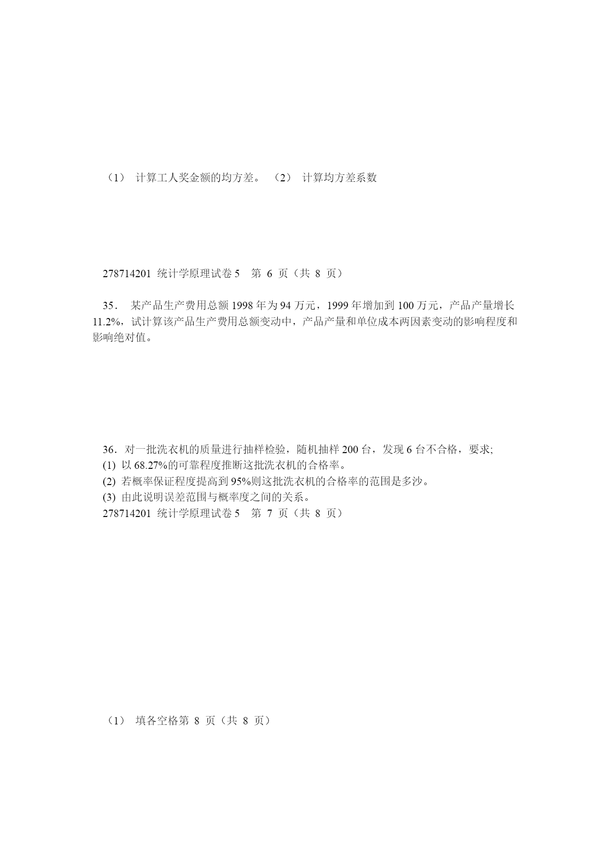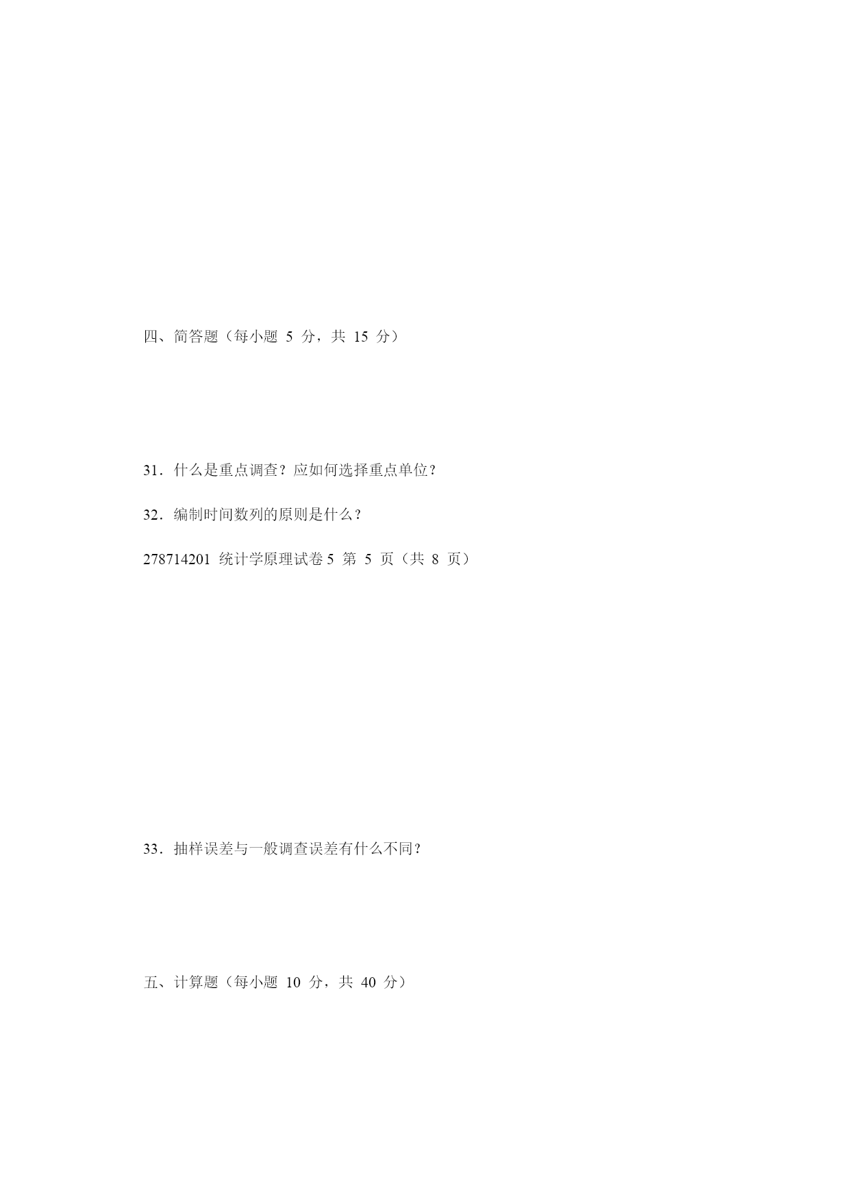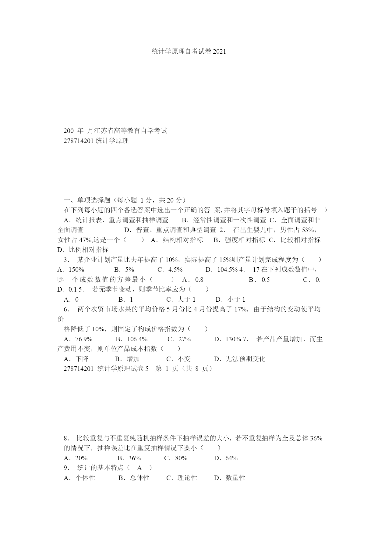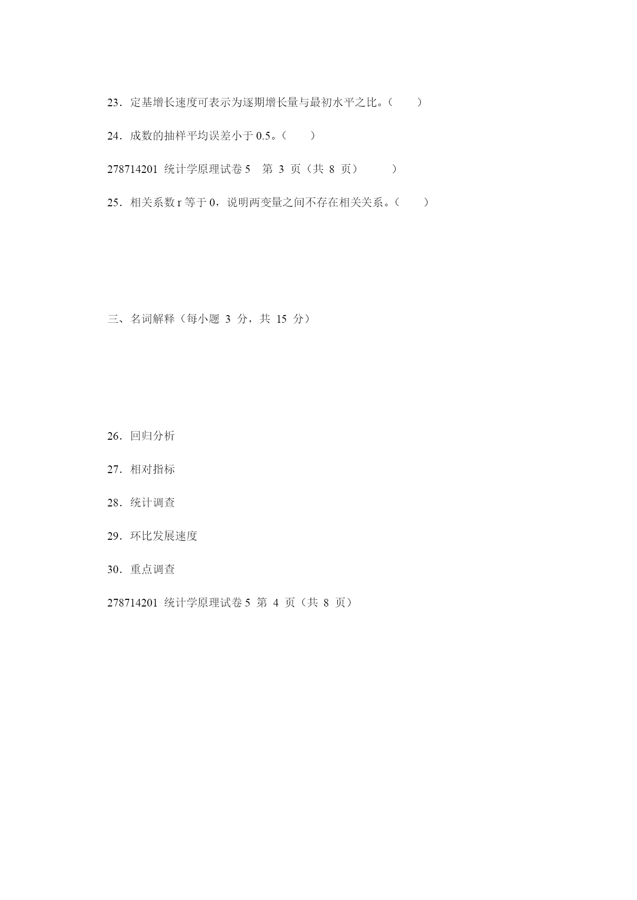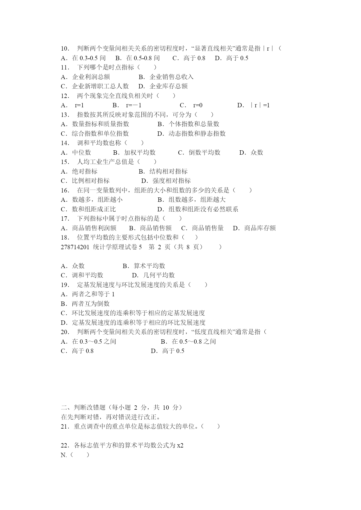 统计学原理自考试卷2008年江苏自考试题(常用版)(可以直接使用,可编辑完整版资料,欢迎下载)统计学原理自考试卷2021200年月江苏省高等教育自学考试278714201统计学原理一、单项选择题(每小题1分,共20分)在下列每小题的四个备选答案中选出一个正确的答案,并将其字母标号填入题干的括号)A.统计报表、重点调查和抽样调查B.经常性调查和一次性调查C.全面调查和非全面调查D.普查、重点调查和典型调查2.在出生婴儿中,男性占53%,女性占47%,这是一个()A.结构相对指标B.强度相对指标C.比较相对指标D.比例相对指标3.某企业计划产量比去年提高了10%,实际提高了15%则产量计划完成程度为()A.150%B.5%C.4.5%D.104.5%4.17在下列成数数值中,哪一个成数数值的方差最小()A.0.8B.0.5C.0.D.0.15.若无季节变动,则季节比率应为()A.0B.1C.大于1D.小于16.两个农贸市场水果的平均价格5月份比4月份提高了17%,由于结构的变动使平均价格降低了10%,则固定了构成价格指数为()A.76.9%B.106.4%C.27%D.130%7.若产品产量增加,而生产费用不变,则单位产品成本指数()A.下降B.增加C.不变D.无法预期变化278714201统计学原理试卷5()8.比较重复与不重复纯随机抽样条件下抽样误差的大小,若不重复抽样为全及总体36%的情况下,抽样误差比在重复抽样情况下要小()A.20%B.36%C.80%D.64%9.统计的基本特点(A)A.个体性B.总体性C.理论性D.数量性10.判断两个变量间相关关系的密切程度时,“显著直线相关”通常是指|r|(A.在0.3-0.5间B.在0.5-0.8间C.高于0.8D.高于0.511.下列哪个是时点指标()A.企业利润总额B.企业销售总收入C.企业新增职工总人数D.企业库存总额12.两个现象完全直线负相关时()A.r=1B.r=-1C.r=0D.|r|=113.指数按其所反映对象范围的不同,可分为()A.数量指标和质量指数B.个体指数和总量数C.综合指数和单位指数D.动态指数和静态指数14.调和平均数也称()A.中位数B.加权平均数C.倒数平均数D.众数15.人均工业生产总值是()A.绝对指标B.结构相对指标C.比例相对指标D.强度相对指标16.在同一变量数列中,组距的大小和组数的多少的关系是()A.数越多,组距越小B.组数越多,组距越大C.数和组距成正比D.组数和组距没有必然联系17.下列指标中属于时点指标的是()A.商品销售利润额B.商品销售额C.商品销售量D.商品库存额18.位置平均数的主要形式包括中位数和()278714201统计学原理试卷5())A.众数B.算术平均数C.调和平均数D.几何平均数19.定基发展速度与环比发展速度的关系是()A.两者之和等于1B.两者互为倒数C.环比发展速度的连乘积等于相应的定基发展速度D.定基发展速度的连乘积等于相应的环比发展速度20.判断两个变量间相关关系的密切程度时,“低度直线相关”通常是指(A.在0.3~0.5之间B.在0.5~0.8之间C.高于0.8D.高于0.5二、判断改错题(每小题2分,共10分)在先判断对错,再对错误进行改正。21.重点调查中的重点单位是标志值较大的单位。()22.各标志值平方和的算术平均数公式为x2N.()23.定基增长速度可表示为逐期增长量与最初水平之比。()24.成数的抽样平均误差小于0.5。()278714201统计学原理试卷5())25.相关系数r等于0,说明两变量之间不存在相关关系。()三、名词解释(每小题3分,共15分)26.回归分析27.相对指标28.统计调查29.环比发展速度30.重点调查278714201统计学原理试卷5()四、简答题(每小题5分,共15分)31.什么是重点调查?应如何选择重点单位?32.编制时间数列的原则是什么?278714201统计学原理试卷5()
