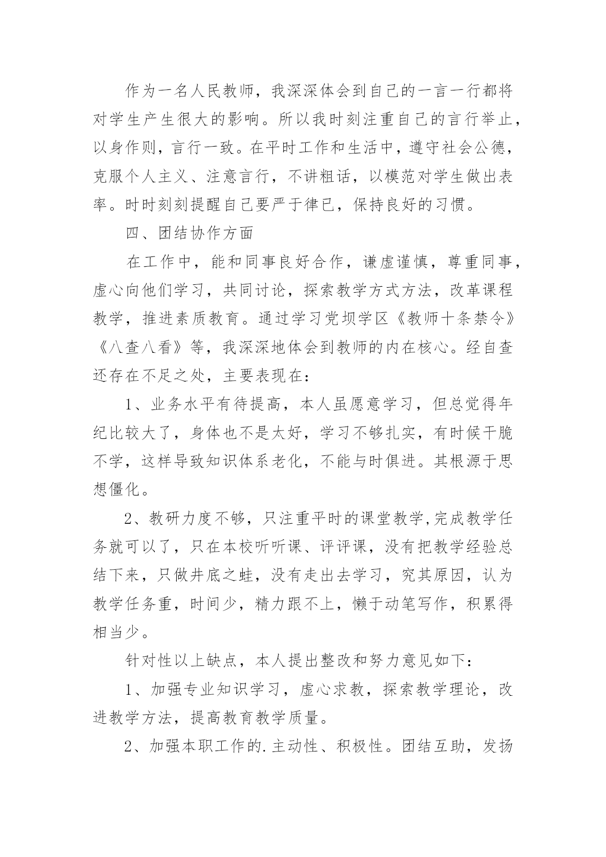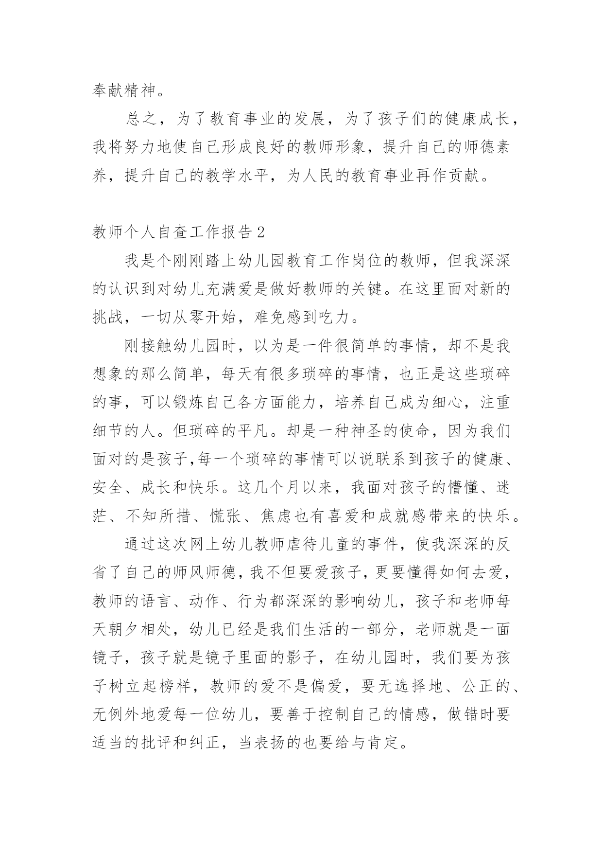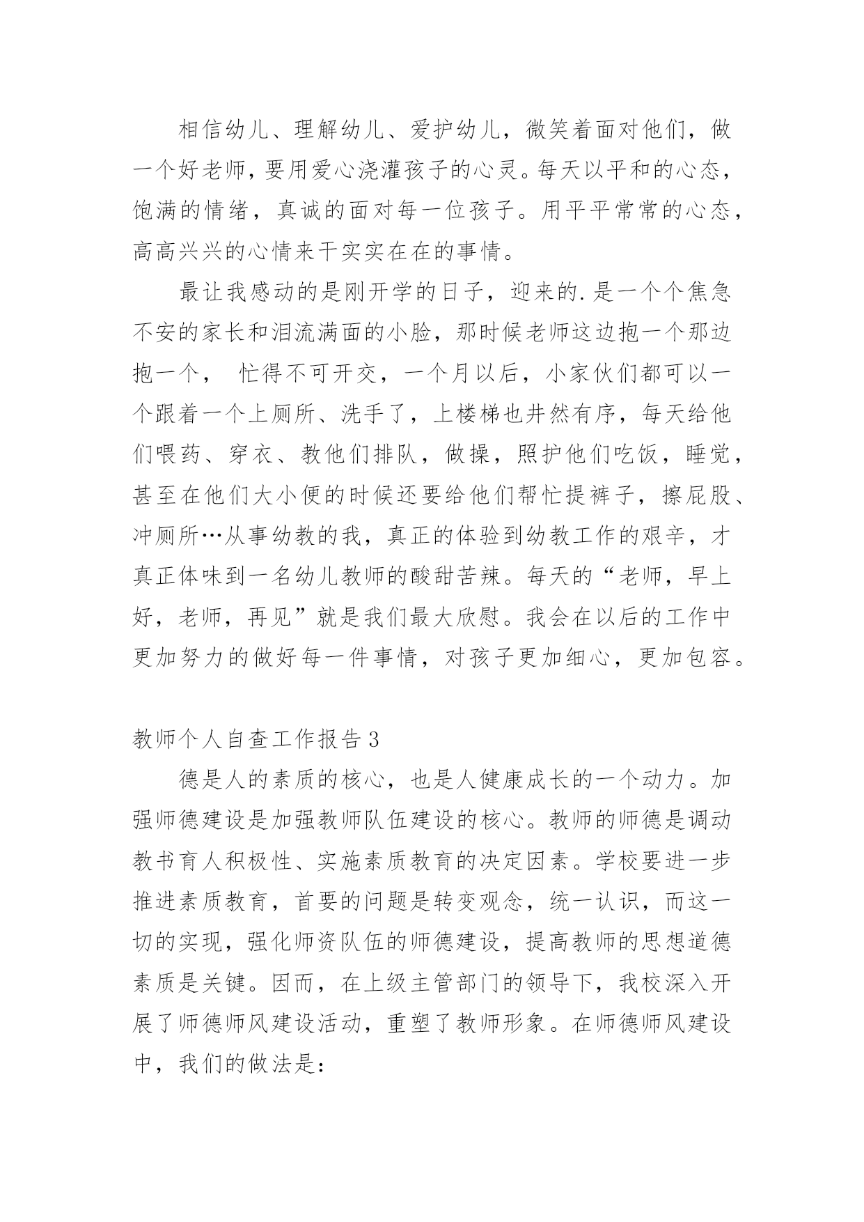 教师个人自查工作报告在我们平凡的日常里,越来越多人会去使用报告,其在写作上有一定的技巧。那么大家知道标准正式的报告格式吗?下面是小编为大家整理的教师个人自查工作报告,仅供参考,希望能够帮助到大家。教师个人自查工作报告1一、政治思想方面本人长期坚持学习,努力提高自身的思想政治素质,学习《教育法》、《教师法》,按照《中小学教师职业道德规范》和党坝学区《教师十条禁令》严格要求自己,奉公守法,遵守社会公德。忠诚人民的教育事业,为人师表。二、教育教学方面在平时的教学工作中,我不断丰富自身学识,努力提高自身能力、业务水平,严格执行师德规范,有高度的事业心、责任心、爱岗敬业。树立正确的人生观、人才观,重视对每个学生的全面素质和良好个性的培养,与每一个学生建立平等、和谐、融洽、相互尊重的关系,关心每一个学生,尊重每一个学生的人格,努力发现每一个学生的闪光点和开发每一个学生的潜在优秀品质,坚持做到不体罚或变相体罚学生。利用学科特点加强对学生的思想教育,提高他们的思想素质,激发他们的学习积极性,努力提高教育教学质量。三、为人师表方面作为一名人民教师,我深深体会到自己的一言一行都将对学生产生很大的影响。所以我时刻注重自己的言行举止,以身作则,言行一致。在平时工作和生活中,遵守社会公德,克服个人主义、注意言行,不讲粗话,以模范对学生做出表率。时时刻刻提醒自己要严于律已,保持良好的习惯。四、团结协作方面在工作中,能和同事良好合作,谦虚谨慎,尊重同事,虚心向他们学习,共同讨论,探索教学方式方法,改革课程教学,推进素质教育。通过学习党坝学区《教师十条禁令》《八查八看》等,我深深地体会到教师的内在核心。经自查还存在不足之处,主要表现在:1、业务水平有待提高,本人虽愿意学习,但总觉得年纪比较大了,身体也不是太好,学习不够扎实,有时候干脆不学,这样导致知识体系老化,不能与时俱进。其根源于思想僵化。2、教研力度不够,只注重平时的课堂教学,完成教学任务就可以了,只在本校听听课、评评课,没有把教学经验总结下来,只做井底之蛙,没有走出去学习,究其原因,认为教学任务重,时间少,精力跟不上,懒于动笔写作,积累得相当少。针对性以上缺点,本人提出整改和努力意见如下:1、加强专业知识学习,虚心求教,探索教学理论,改进教学方法,提高教育教学质量。2、加强本职工作的.主动性、积极性。团结互助,发扬奉献精神。总之,为了教育事业的发展,为了孩子们的健康成长,我将努力地使自己形成良好的教师形象,提升自己的师德素养,提升自己的教学水平,为人民的教育事业再作贡献。教师个人自查工作报告2我是个刚刚踏上幼儿园教育工作岗位的教师,但我深深的认识到对幼儿充满爱是做好教师的关键。在这里面对新的挑战,一切从零开始,难免感到吃力。刚接触幼儿园时,以为是一件很简单的事情,却不是我想象的那么简单,每天有很多琐碎的事情,也正是这些琐碎的事,可以锻炼自己各方面能力,培养自己成为细心,注重细节的人。但琐碎的平凡。却是一种神圣的使命,因为我们面对的是孩子,每一个琐碎的事情可以说联系到孩子的健康、安全、成长和快乐。这几个月以来,我面对孩子的懵懂、迷茫、不知所措、慌张、焦虑也有喜爱和成就感带来的快乐。通过这次网上幼儿教师虐待儿童的事件,使我深深的反省了自己的师风师德,我不但要爱孩子,更要懂得如何去爱,教师的语言、动作、行为都深深的影响幼儿,孩子和老师每天朝夕相处,幼儿已经是我们生活的一部分,老师就是一面镜子,孩子就是镜子里面的影子,在幼儿园时,我们要为孩子树立起榜样,教师的爱不是偏爱,要无选择地、公正的、无例外地爱每一位幼儿,要善于控制自己的情感,做错时要适当的批评和纠正,当表扬的也要给与肯定。相信幼儿、理解幼儿、爱护幼儿,微笑着面对他们,做一个好老师,要用爱心浇灌孩子的心灵。每天以平和的心态,饱满的情绪,真诚的面对每一位孩子。用平平常常的心态,高高兴兴的心情来干实实在在的事情。最让我感动的是刚开学的日子,迎来的.是一个个焦急不安的家长和泪流满面的小脸,那时候老师这边抱一个那边抱一个,忙得不可开交,一个月以后,小家伙们都可以一个跟着一个上厕所、洗手了,上楼梯也井然有序,每天给他们喂药、穿衣、教他们排队,做操,照护他们吃饭,睡觉,甚至在他们大小便的时候还要给他们帮忙提裤子,擦屁股、冲厕所…从事幼教的我,真正的体验到幼教工作的艰辛,才真正体味到一名幼儿教师的酸甜苦辣。每天的“老师,早上好,老师,再见”就是我们最大欣慰。我会在以后的工作中更加努力的做好每一件事情,对孩子更加细心,更加包容。教师个人自查工作报告3德是人的素质的核心,也是人健康成长的一个动力。加强师德建设是加强教师队伍建设的核心。教师的师德是调动教书育人积极性、实施素质教育的决定因素。学校要进一步推进素质教育,首要的问题是转变观念,统一认识,而这一切的实现,强化