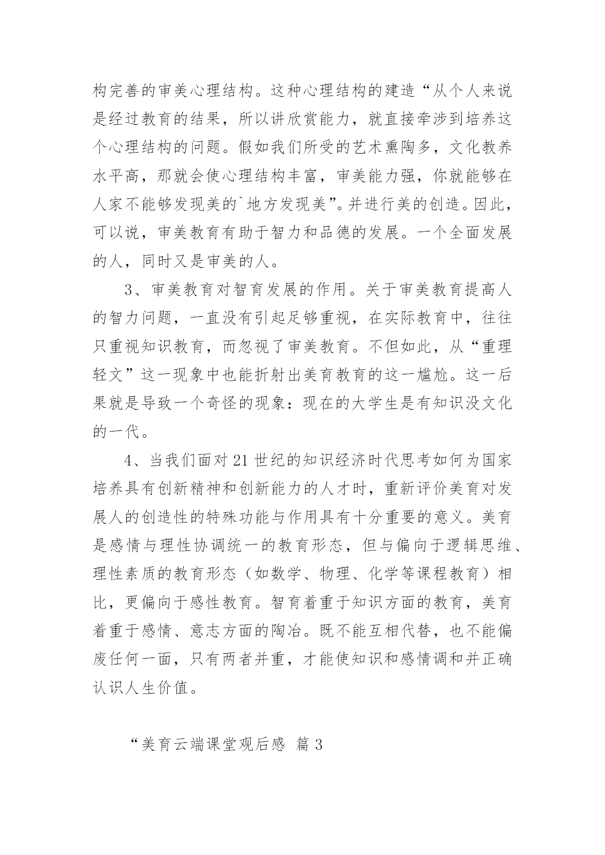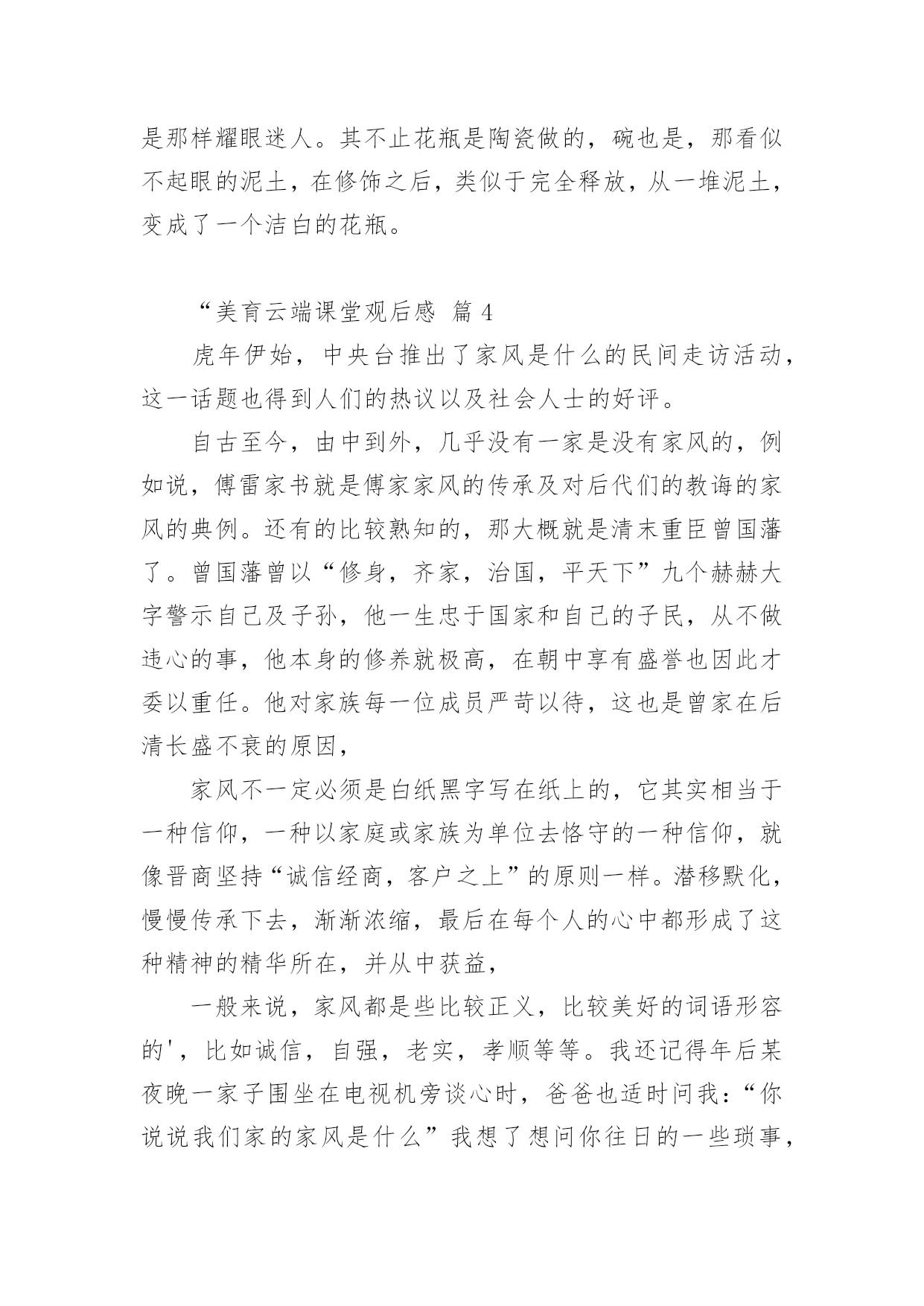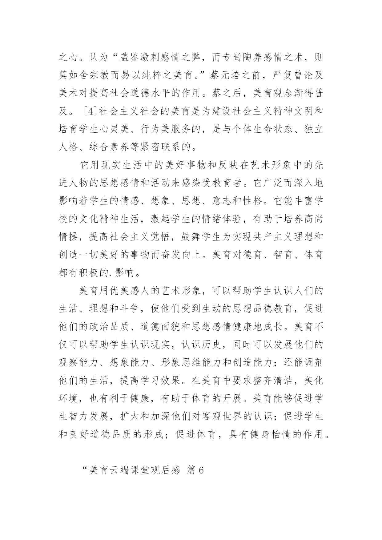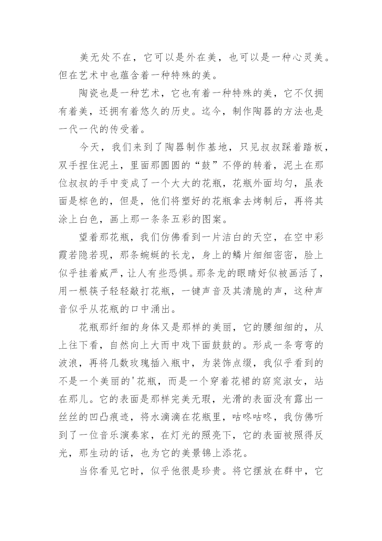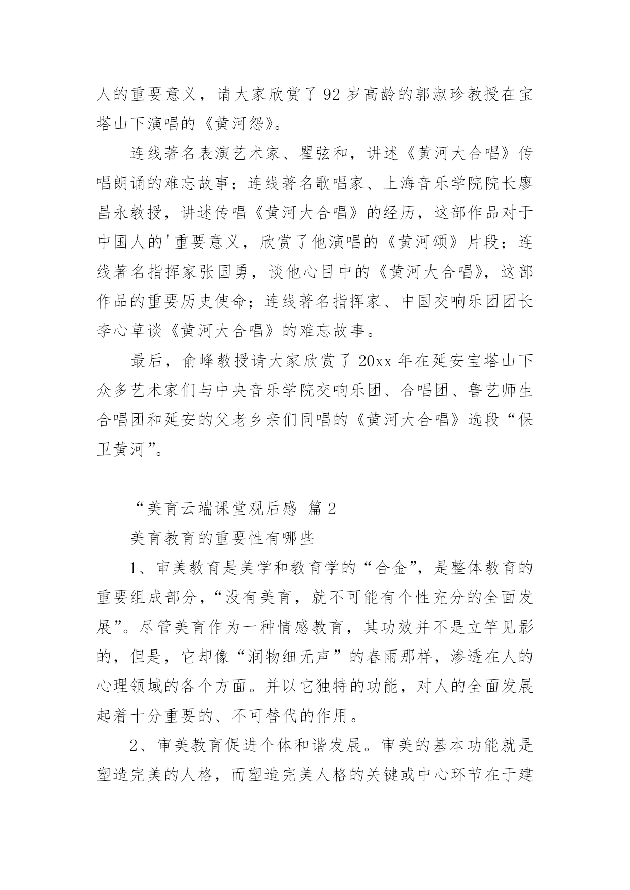 “美育云端课堂观后感在看完一部作品以后,能够给我们不少启示,这时候十分有必须要写一篇观后感了!那么观后感到底应该怎么写呢?下面是小编帮大家整理的“美育云端课堂观后感,仅供参考,大家一起来看看吧。“美育云端课堂观后感篇1开幕式主体部分是俞峰教授讲解诞生在延安鲁艺的、我国近现代音乐史上非常重要的红色音乐经典《黄河大合唱》的创作、演出情况,著名歌唱家雷佳讲解同样诞生在延安鲁艺的红色经典、我国第一部民族歌剧《白毛女》的创作、表演、复排等情况。俞峰教授在讲解《黄河大合唱》时播放了新华社制作的国家相册《黄河大合唱》,通过珍贵图片再现《黄河大合唱》创作、演出情况,播放欣赏了著名指挥家严良堃指挥中央乐团的《黄河大合唱》经典版本视频片段——《黄河船夫曲》。俞峰教授在讲解中连线91岁高龄的著名指挥家、原中央音乐学院指挥系主任、中央歌剧院的首席指挥、郑小瑛教授,她介绍了毛泽东的“文艺为人民”的思想对她音乐人生的巨大指导作用,介绍了学习演唱指挥《黄河大合唱》的经历,请大家观看了20xx年90岁高龄时指挥《保卫黄河》的片段,还连线著名歌唱家、93岁的中央音乐学院郭淑珍教授谈她传唱《黄河大合唱》的难忘经历,这部作品对于教书育人的重要意义,请大家欣赏了92岁高龄的郭淑珍教授在宝塔山下演唱的《黄河怨》。连线著名表演艺术家、瞿弦和,讲述《黄河大合唱》传唱朗诵的难忘故事;连线著名歌唱家、上海音乐学院院长廖昌永教授,讲述传唱《黄河大合唱》的经历,这部作品对于中国人的'重要意义,欣赏了他演唱的《黄河颂》片段;连线著名指挥家张国勇,谈他心目中的《黄河大合唱》,这部作品的重要历史使命;连线著名指挥家、中国交响乐团团长李心草谈《黄河大合唱》的难忘故事。最后,俞峰教授请大家欣赏了20xx年在延安宝塔山下众多艺术家们与中央音乐学院交响乐团、合唱团、鲁艺师生合唱团和延安的父老乡亲们同唱的《黄河大合唱》选段“保卫黄河”。“美育云端课堂观后感篇2美育教育的重要性有哪些1、审美教育是美学和教育学的“合金”,是整体教育的重要组成部分,“没有美育,就不可能有个性充分的全面发展”。尽管美育作为一种情感教育,其功效并不是立竿见影的,但是,它却像“润物细无声”的春雨那样,渗透在人的心理领域的各个方面。并以它独特的功能,对人的全面发展起着十分重要的、不可替代的作用。2、审美教育促进个体和谐发展。审美的基本功能就是塑造完美的人格,而塑造完美人格的关键或中心环节在于建构完善的审美心理结构。这种心理结构的建造“从个人来说是经过教育的结果,所以讲欣赏能力,就直接牵涉到培养这个心理结构的问题。假如我们所受的艺术熏陶多,文化教养水平高,那就会使心理结构丰富,审美能力强,你就能够在人家不能够发现美的`地方发现美”。并进行美的创造。因此,可以说,审美教育有助于智力和品德的发展。一个全面发展的人,同时又是审美的人。3、审美教育对智育发展的作用。关于审美教育提高人的智力问题,一直没有引起足够重视,在实际教育中,往往只重视知识教育,而忽视了审美教育。不但如此,从“重理轻文”这一现象中也能折射出美育教育的这一尴尬。这一后果就是导致一个奇怪的现象:现在的大学生是有知识没文化的一代。4、当我们面对21世纪的知识经济时代思考如何为国家培养具有创新精神和创新能力的人才时,重新评价美育对发展人的创造性的特殊功能与作用具有十分重要的意义。美育是感情与理性协调统一的教育形态,但与偏向于逻辑思维、理性素质的教育形态(如数学、物理、化学等课程教育)相比,更偏向于感性教育。智育着重于知识方面的教育,美育着重于感情、意志方面的陶冶。既不能互相代替,也不能偏废任何一面,只有两者并重,才能使知识和感情调和并正确认识人生价值。“美育云端课堂观后感篇3美无处不在,它可以是外在美,也可以是一种心灵美。但在艺术中也蕴含着一种特殊的美。陶瓷也是一种艺术,它也有着一种特殊的美,它不仅拥有着美,还拥有着悠久的历史。迄今,制作陶器的方法也是一代一代的传受着。今天,我们来到了陶器制作基地,只见叔叔踩着踏板,双手捏住泥土,里面那圆圆的“鼓”不停的转着,泥土在那位叔叔的手中变成了一个大大的花瓶,花瓶外面均匀,虽表面是棕色的,但是,他们将塑好的花瓶拿去烤制后,再将其涂上白色,画上那一条条五彩的图案。望着那花瓶,我们仿佛看到一片洁白的天空,在空中彩霞若隐若现,那条蜿蜒的长龙,身上的鳞片细细密密,脸上似乎挂着威严,让人有些恐惧。那条龙的眼睛好似被画活了,用一根筷子轻轻敲打花瓶,一键声音及其清脆的声,这种声音似乎从花瓶的口中涌出。花瓶那纤细的身体又是那样的美丽,它的腰细细的,从上往下看,自然向上大而中戏下面鼓鼓的。形成一条弯弯的波浪,再将几数玫瑰插入瓶中,为装饰点缀,我似乎看到的不是一个美丽的'花瓶,而是一个穿着花裙的窈窕淑女,站在那儿。它的表面是那样完美无瑕,光滑的表