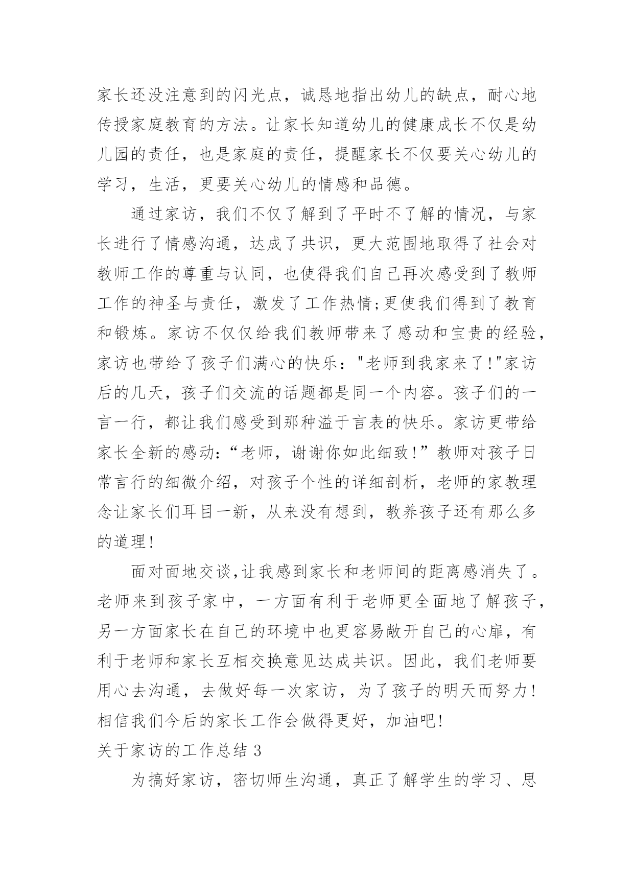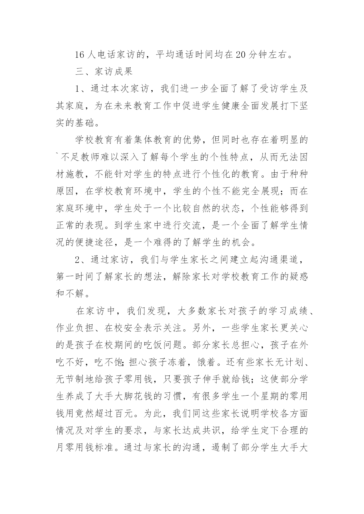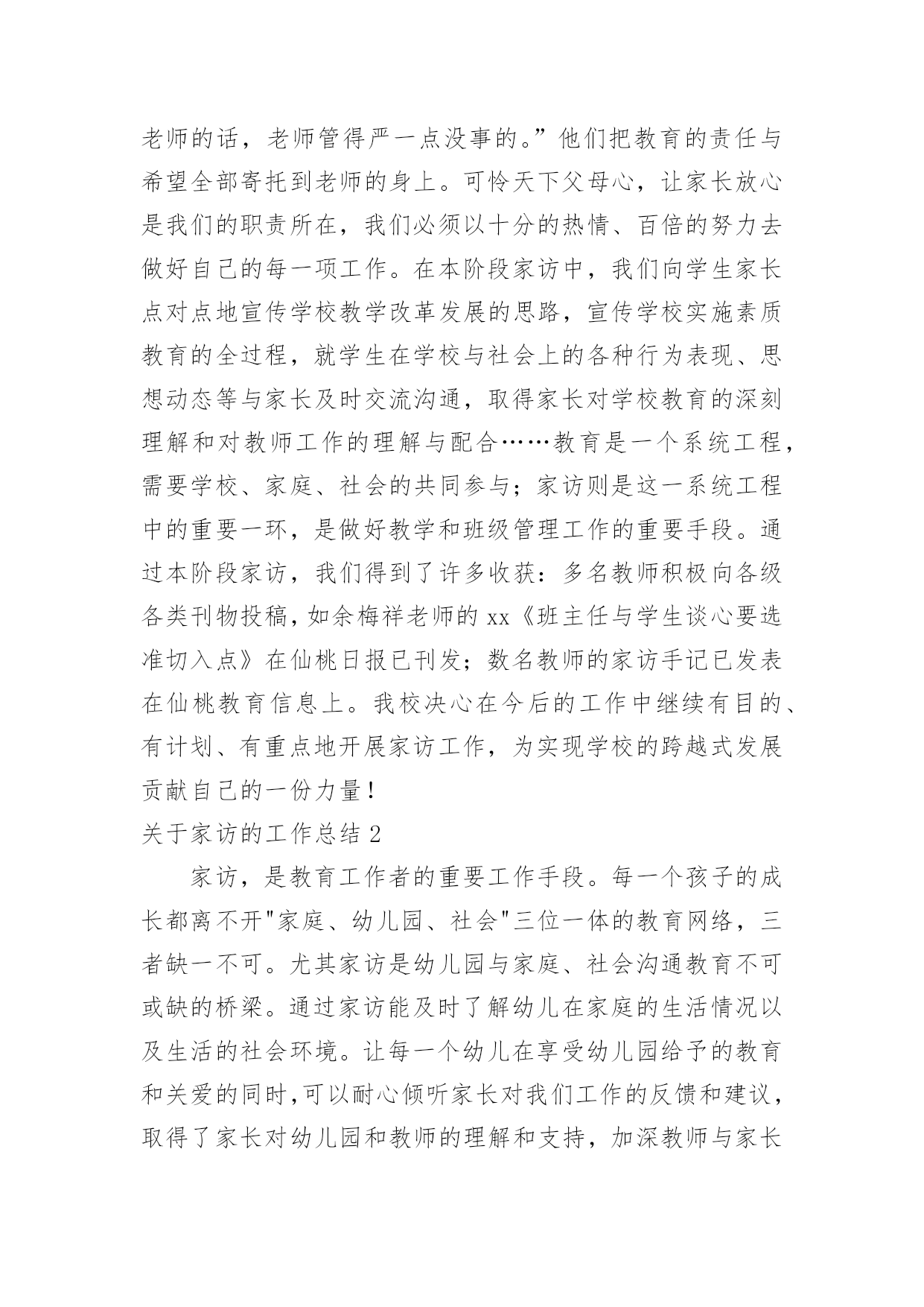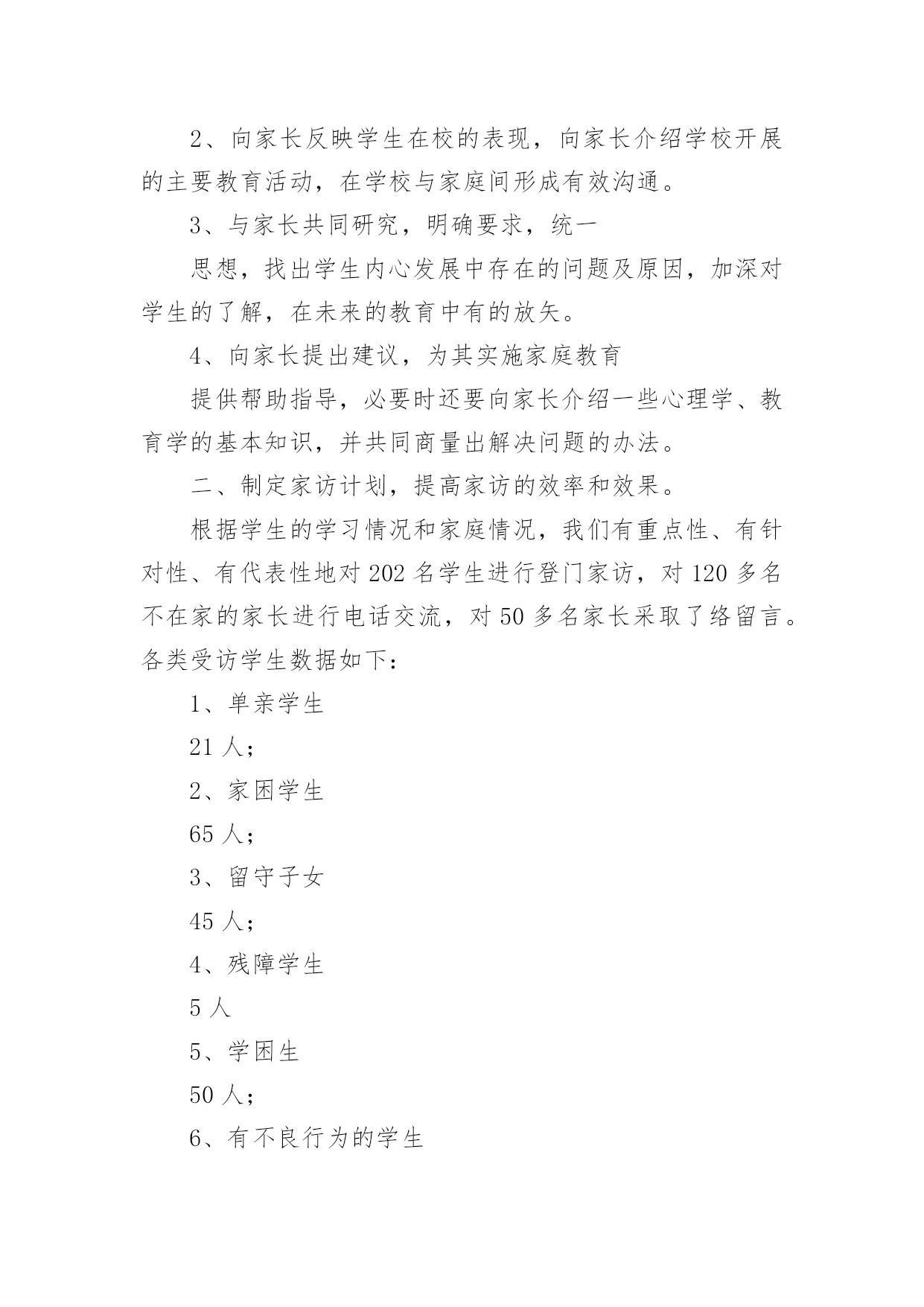 家访的工作总结关于家访的工作总结总结是把一定阶段内的有关情况分析研究,做出有指导性的经验方法以及结论的书面材料,它可以使我们更有效率,让我们一起来学习写总结吧。总结怎么写才不会千篇一律呢?下面是小编整理的关于家访的工作总结,欢迎阅读与收藏。关于家访的工作总结1根据仙教师(20xx)2号文件精神,我校认真开展万名教师访万家的活动,成立了专班领导小组,制定了详细的活动方案。3月18日,我们召开了全体教师动员大会,认真学习了市教育局活动实施方案。3月20日,又召开全体领导和班主任会。将6类学生归类建档,把学生分解到每一个责任教师。3月25日,我们又召开全体教师再次动员,会后随即开始走访。现将我校近一阶段进行家访的相关情况汇报如下:一、明确家访的主题:送温暖、传爱心、访民情、促和谐。1、了解所访学生家庭情况。进行家访前,我们首先对所访学生家庭情况进行尽可能深入的了解。因为,家庭情况直接影响学生的思想、学习和生活,教师只有对学生家庭的具体情况做全面了解,才有助于提高教育工作的针对性。2、向家长反映学生在校的表现,向家长介绍学校开展的主要教育活动,在学校与家庭间形成有效沟通。3、与家长共同研究,明确要求,统一思想,找出学生内心发展中存在的问题及原因,加深对学生的了解,在未来的教育中有的放矢。4、向家长提出建议,为其实施家庭教育提供帮助指导,必要时还要向家长介绍一些心理学、教育学的基本知识,并共同商量出解决问题的办法。二、制定家访计划,提高家访的效率和效果。根据学生的学习情况和家庭情况,我们有重点性、有针对性、有代表性地对202名学生进行登门家访,对120多名不在家的家长进行电话交流,对50多名家长采取了络留言。各类受访学生数据如下:1、单亲学生21人;2、家困学生65人;3、留守子女45人;4、残障学生5人5、学困生50人;6、有不良行为的学生16人电话家访的,平均通话时间均在20分钟左右。三、家访成果1、通过本次家访,我们进一步全面了解了受访学生及其家庭,为在未来教育工作中促进学生健康全面发展打下坚实的基础。学校教育有着集体教育的优势,但同时也存在着明显的`不足教师难以深入了解每个学生的个性特点,从而无法因材施教,不能针对学生的特点进行个性化的教育。由于种种原因,在学校教育环境中,学生的个性不能完全展现;而在家庭环境中,学生处于一个比较自然的状态,个性能够得到正常的表现。到学生家中进行交流,是一个全面了解学生情况的便捷途径,是一个难得的了解学生的机会。2、通过家访,我们与学生家长之间建立起沟通渠道,第一时间了解家长的想法,解除家长对学校教育工作的疑惑和不解。在家访中,我们发现,大多数家长对孩子的学习成绩、作业负担、在校安全表示关注。另外,一些学生家长更关心的是孩子在校期间的吃饭问题。部分家长总担心,孩子在外吃不好,吃不饱;担心孩子冻着,饿着。还有些家长无计划、无节制地给孩子零用钱,只要孩子伸手就给钱;这使部分学生养成了大手大脚花钱的习惯,有很多学生一个星期的零用钱用竟然超过百元。为此,我们同这些家长说明学校各方面情况及对学生的要求,与家长达成共识,给学生定下合理的月零用钱标准。通过与家长的沟通,遏制了部分学生大手大脚乱花钱的坏习惯。3、以家访为平台,以学生和家长为渠道,我们对学校进行全面宣传,扩大了学校知名度和美誉度。在我们登门家访时,家长对老师的到来都感到由衷的高兴和激动,很多家长把亲朋好友都招来和我们一起交谈,甚至一些邻居也挤进来参与谈话。我们充分利用这个机会,详细、认真、热情地向他们介绍学校课程设、学生在校期间学习情况、开展的有关活动等相关信息。4、通过家访,广泛听取社会对我校教育教学的意见和建议,并及时反馈。通过本次家访,我们及时掌握到家长对学校教育工作中的要求与建议,全面听取了社会各层面对我校教育教学的意见,并将之反馈给学校相关部门或个人,发现并弥补学校教育教学过程中的不足之处,进而推动教师自觉改进教学方法,提高教学水平,促进了学校教育教学工作的发展。这项活动我们没有走过场,不搞任何形式。要求教师每走访一名即向年段领导汇报,填好走访记录,写好家访手记。工作中不少教师认真扎实:九(一)班邵自才老师年逾五十,利用周五放学之际,将学生万双送回家。通过与其家长、学生当面谈心,实事求是地指出万双同学学习中的一些毛病,家长深受感动,其本人也触动很大,表示剩余时间会发奋学习,争取考上一个好一点的高中。梅昌喜老师每走访一名学生,还写一篇家访后记,字里行间流露出对学生深深的关爱之情。四、家访体会1、良好的家庭教育对青少年的健康成长至关重要。文化程度高的家长对自己的子女都有一套行之有效的教育方法,知道如何对孩子进行学习生活上的指导。这些家长的孩子往往从小就已经养成良好的行为习惯,有较强的自觉性。文化程度不高但为人处世有原则的家长,他们对孩子学