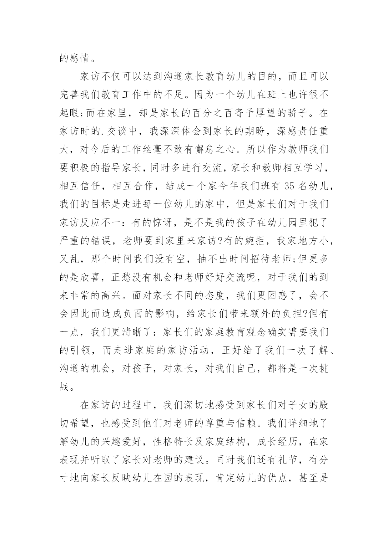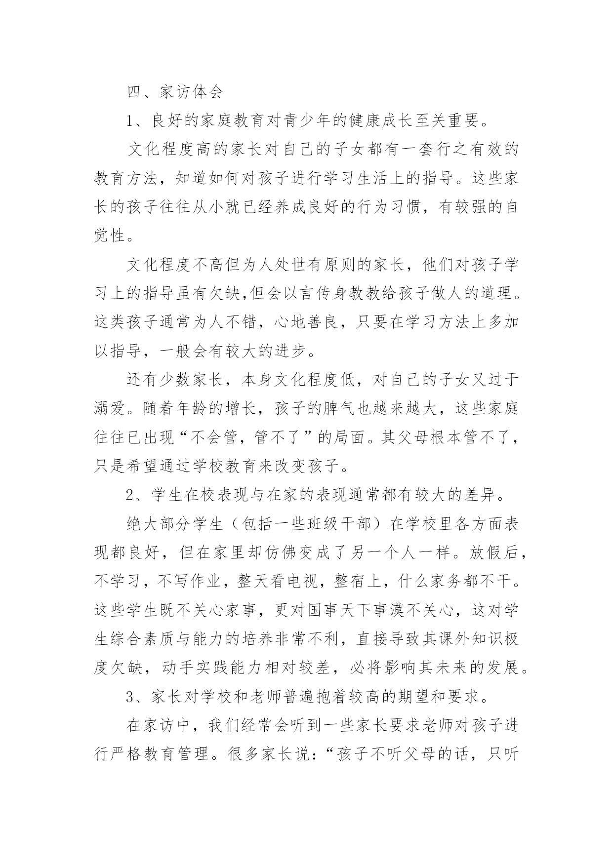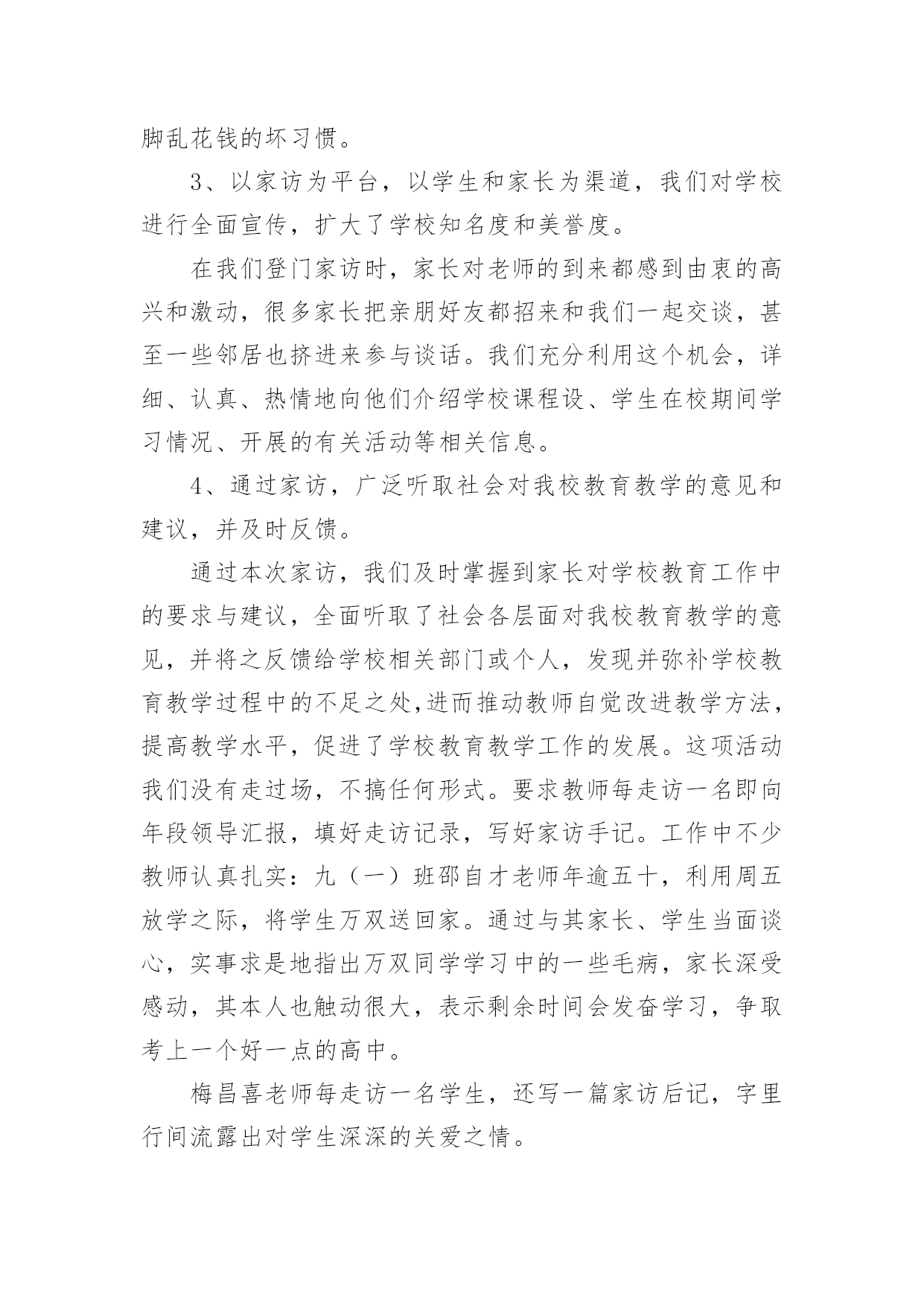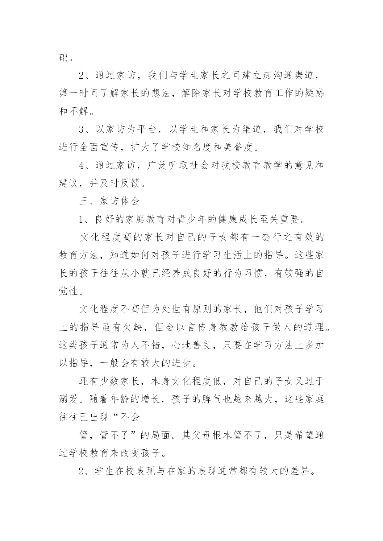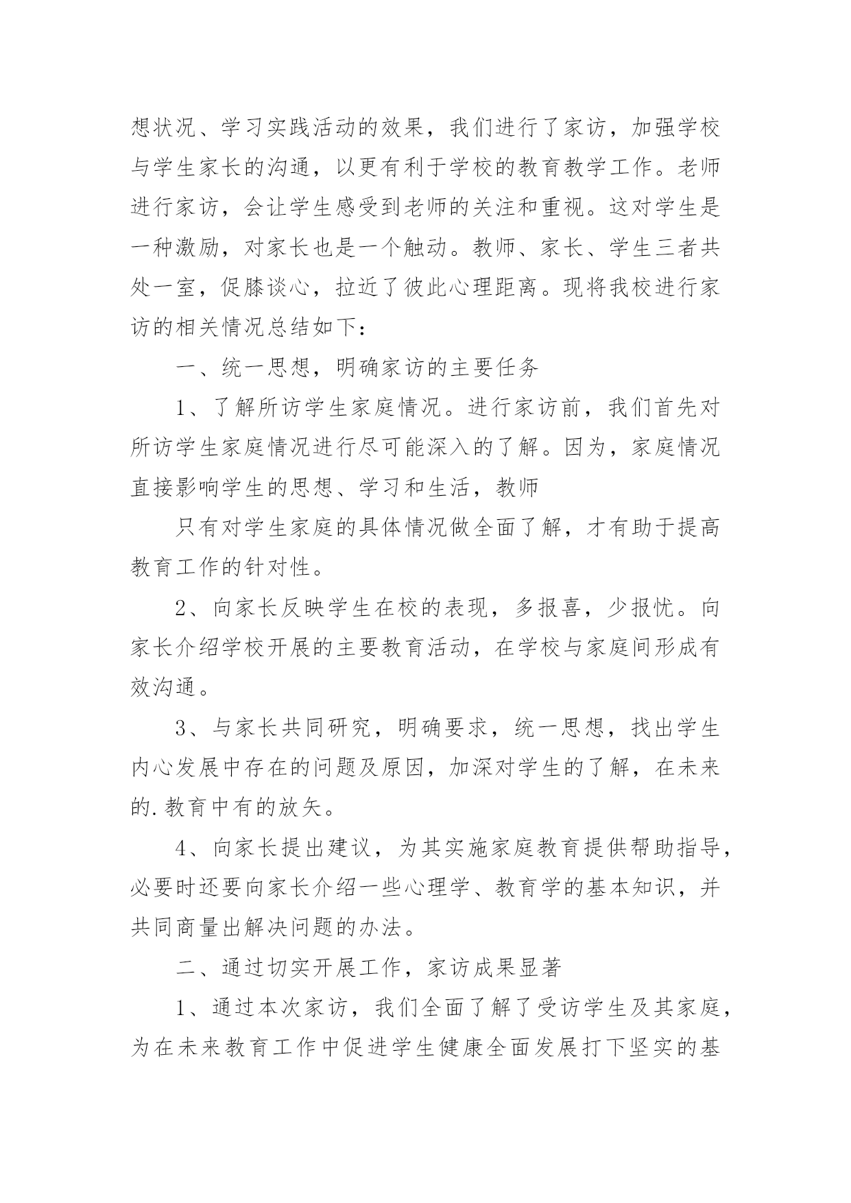 家访的工作总结关于家访的工作总结总结是把一定阶段内的有关情况分析研究,做出有指导性的经验方法以及结论的书面材料,它可以使我们更有效率,让我们一起来学习写总结吧。总结怎么写才不会千篇一律呢?下面是小编整理的关于家访的工作总结,欢迎阅读与收藏。关于家访的工作总结1根据仙教师(20xx)2号文件精神,我校认真开展万名教师访万家的活动,成立了专班领导小组,制定了详细的活动方案。3月18日,我们召开了全体教师动员大会,认真学习了市教育局活动实施方案。3月20日,又召开全体领导和班主任会。将6类学生归类建档,把学生分解到每一个责任教师。3月25日,我们又召开全体教师再次动员,会后随即开始走访。现将我校近一阶段进行家访的相关情况汇报如下:一、明确家访的主题:送温暖、传爱心、访民情、促和谐。1、了解所访学生家庭情况。进行家访前,我们首先对所访学生家庭情况进行尽可能深入的了解。因为,家庭情况直接影响学生的思想、学习和生活,教师只有对学生家庭的具体情况做全面了解,才有助于提高教育工作的针对性。2、向家长反映学生在校的表现,向家长介绍学校开展的主要教育活动,在学校与家庭间形成有效沟通。3、与家长共同研究,明确要求,统一思想,找出学生内心发展中存在的问题及原因,加深对学生的了解,在未来的教育中有的放矢。4、向家长提出建议,为其实施家庭教育提供帮助指导,必要时还要向家长介绍一些心理学、教育学的基本知识,并共同商量出解决问题的办法。二、制定家访计划,提高家访的效率和效果。根据学生的学习情况和家庭情况,我们有重点性、有针对性、有代表性地对202名学生进行登门家访,对120多名不在家的家长进行电话交流,对50多名家长采取了络留言。各类受访学生数据如下:1、单亲学生21人;2、家困学生65人;3、留守子女45人;4、残障学生5人5、学困生50人;6、有不良行为的学生16人电话家访的,平均通话时间均在20分钟左右。三、家访成果1、通过本次家访,我们进一步全面了解了受访学生及其家庭,为在未来教育工作中促进学生健康全面发展打下坚实的基础。学校教育有着集体教育的优势,但同时也存在着明显的`不足教师难以深入了解每个学生的个性特点,从而无法因材施教,不能针对学生的特点进行个性化的教育。由于种种原因,在学校教育环境中,学生的个性不能完全展现;而在家庭环境中,学生处于一个比较自然的状态,个性能够得到正常的表现。到学生家中进行交流,是一个全面了解学生情况的便捷途径,是一个难得的了解学生的机会。2、通过家访,我们与学生家长之间建立起沟通渠道,第一时间了解家长的想法,解除家长对学校教育工作的疑惑和不解。在家访中,我们发现,大多数家长对孩子的学习成绩、作业负担、在校安全表示关注。另外,一些学生家长更关心的是孩子在校期间的吃饭问题。部分家长总担心,孩子在外吃不好,吃不饱;担心孩子冻着,饿着。还有些家长无计划、无节制地给孩子零用钱,只要孩子伸手就给钱;这使部分学生养成了大手大脚花钱的习惯,有很多学生一个星期的零用钱用竟然超过百元。为此,我们同这些家长说明学校各方面情况及对学生的要求,与家长达成共识,给学生定下合理的月零用钱标准。通过与家长的沟通,遏制了部分学生大手大脚乱花钱的坏习惯。3、以家访为平台,以学生和家长为渠道,我们对学校进行全面宣传,扩大了学校知名度和美誉度。在我们登门家访时,家长对老师的到来都感到由衷的高兴和激动,很多家长把亲朋好友都招来和我们一起交谈,甚至一些邻居也挤进来参与谈话。我们充分利用这个机会,详细、认真、热情地向他们介绍学校课程设、学生在校期间学习情况、开展的有关活动等相关信息。4、通过家访,广泛听取社会对我校教育教学的意见和建议,并及时反馈。通过本次家访,我们及时掌握到家长对学校教育工作中的要求与建议,全面听取了社会各层面对我校教育教学的意见,并将之反馈给学校相关部门或个人,发现并弥补学校教育教学过程中的不足之处,进而推动教师自觉改进教学方法,提高教学水平,促进了学校教育教学工作的发展。这项活动我们没有走过场,不搞任何形式。要求教师每走访一名即向年段领导汇报,填好走访记录,写好家访手记。工作中不少教师认真扎实:九(一)班邵自才老师年逾五十,利用周五放学之际,将学生万双送回家。通过与其家长、学生当面谈心,实事求是地指出万双同学学习中的一些毛病,家长深受感动,其本人也触动很大,表示剩余时间会发奋学习,争取考上一个好一点的高中。梅昌喜老师每走访一名学生,还写一篇家访后记,字里行间流露出对学生深深的关爱之情。四、家访体会1、良好的家庭教育对青少年的健康成长至关重要。文化程度高的家长对自己的子女都有一套行之有效的教育方法,知道如何对孩子进行学习生活上的指导。这些家长的孩子往往从小就已经养成良好的行为习惯,有较强的自觉性。文化程度不高但为人处世有原则的家长,他们对孩子学