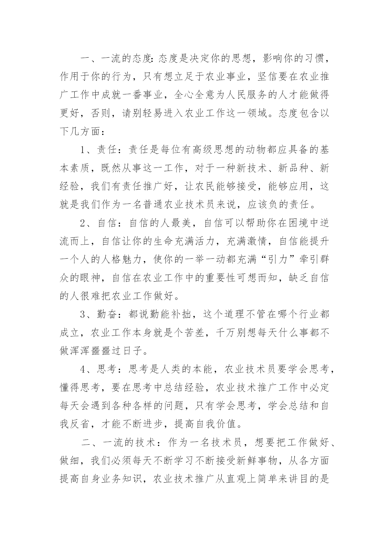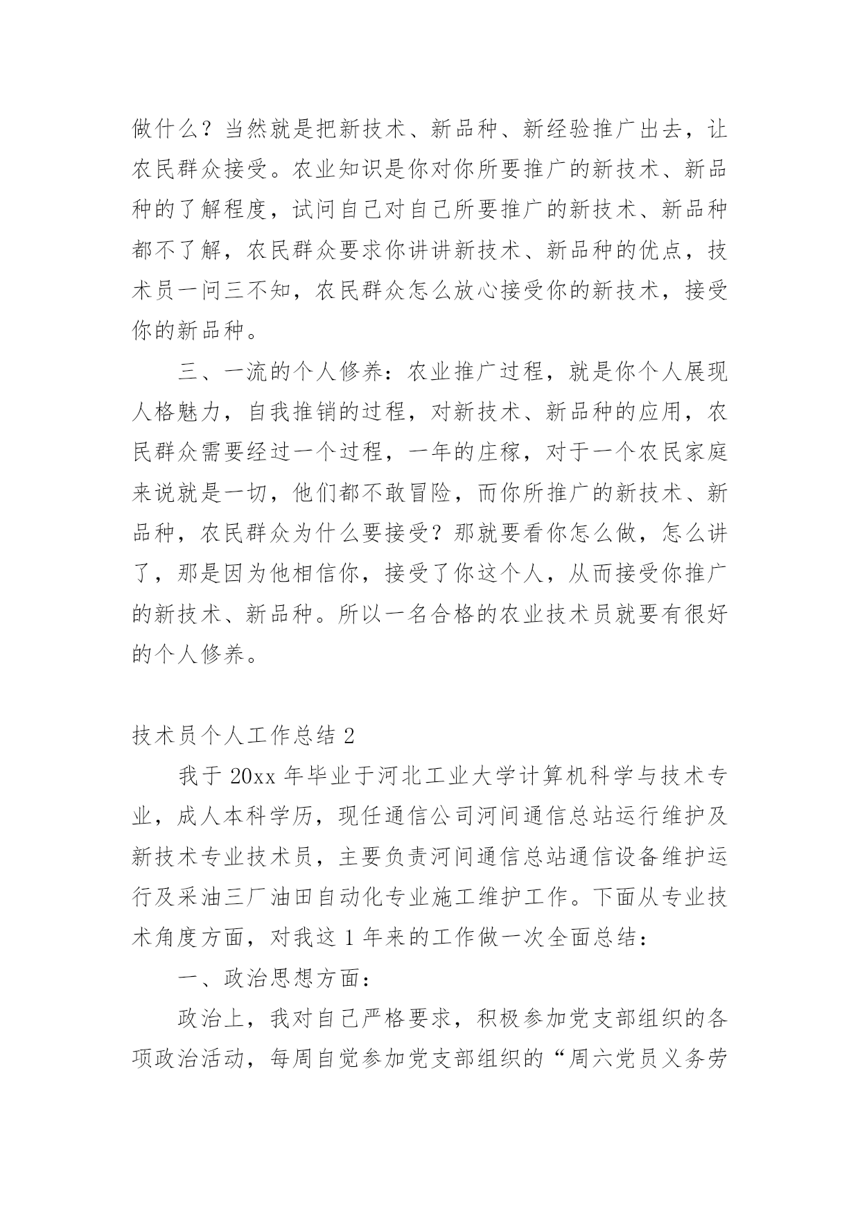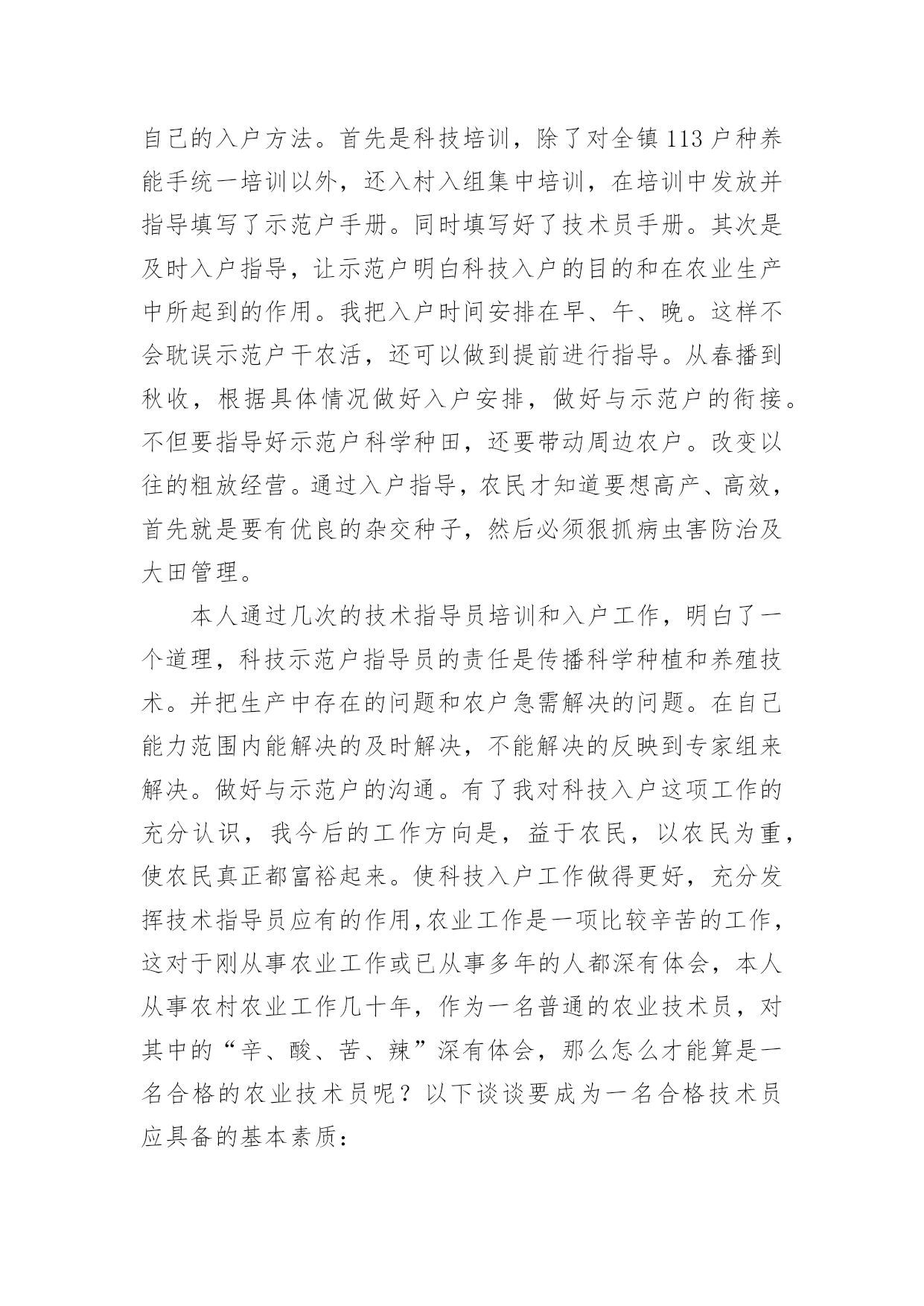 技术员个人工作总结技术员个人工作总结通用15篇总结是在一段时间内对学习和工作生活等表现加以总结和概括的一种书面材料,它是增长才干的一种好办法,让我们抽出时间写写总结吧。总结怎么写才是正确的呢?以下是小编整理的技术员个人工作总结,供大家参考借鉴,希望可以帮助到有需要的朋友。技术员个人工作总结1我是一名战斗在农村第一线的农业技术员,自参加工作以来热衷于农业技术推广事业,把所掌握的知识真正运用到生产第一线,为农民的增产增收起到了一定作用。作为一名基层农业工作者,我有如下心得体会:一、理论联系实践作为一名基层农技推广工作者,首先自己要具备推广农业技术知识、掌握农业生产技术、懂得技术操作过程。多年来,我们订了农村科学实验和植物保护等材料一年四季坚持不同时期不同阶段地印发病虫害情报,准确及时地把农业讯情传送到千家万户,系统地学习了五大作物栽培、病虫害防治、地膜覆盖栽培技术、农田杂草防除技术等。组织实施了各类试验示范,如我们在老屋场村、旁塘村进行了“3414”肥效试验和22个优良水稻品种的产量产值示范比对。受到农民的欢迎和领导的认可。二、要有吃苦耐劳的精神基层农技推广人员面对的是农业、农村、农民,是生产第一线的人员。与百姓面对面的接触,深入农户、深入田间地头、把技术讲给农民听、示范给农民看。田间地头就是我们的“办公室”,要有不误农时、不惧风雨、不怕烈日、不怕吃苦的精神,所以作为一名一肩双挑的(兼镇计生专干)技术员更需要毅力,多年来,我坚持勤学习、勤入户指导、勤试验示范、勤汇报总结,20xx年度被江西省农业厅评为“全省先进乡镇农技推广站”。三、提高经济效益是农技推广的目的在党和国家惠农政策的指导下,如科技入户工程,使一些先进的技术、新品种直接入户到田,让农民增产增收,获得较高的`效益。总之,基层农业技术人员要有不怕吃苦与农民打成一片的精神和求真务实的态度,要有理论联系实际和精耕细作的试验示范,精神百倍的努力工作才能成为一名出色的农技推广人员。自从20xx年国家实施科技入户工程,到现在已有8年了,20xx年冬通过培训学习,丰富了自己的科学知识。并被聘请为20xx年科技入户技术指导员。我深感荣幸。并感到责任的重大和任务的艰巨。我所负责的示范户是在西牛镇星村和中星村共有10户。指导的产业是杂交水稻。根据农村和农民的特点,我制订了自己的入户方法。首先是科技培训,除了对全镇113户种养能手统一培训以外,还入村入组集中培训,在培训中发放并指导填写了示范户手册。同时填写好了技术员手册。其次是及时入户指导,让示范户明白科技入户的目的和在农业生产中所起到的作用。我把入户时间安排在早、午、晚。这样不会耽误示范户干农活,还可以做到提前进行指导。从春播到秋收,根据具体情况做好入户安排,做好与示范户的衔接。不但要指导好示范户科学种田,还要带动周边农户。改变以往的粗放经营。通过入户指导,农民才知道要想高产、高效,首先就是要有优良的杂交种子,然后必须狠抓病虫害防治及大田管理。本人通过几次的技术指导员培训和入户工作,明白了一个道理,科技示范户指导员的责任是传播科学种植和养殖技术。并把生产中存在的问题和农户急需解决的问题。在自己能力范围内能解决的及时解决,不能解决的反映到专家组来解决。做好与示范户的沟通。有了我对科技入户这项工作的充分认识,我今后的工作方向是,益于农民,以农民为重,使农民真正都富裕起来。使科技入户工作做得更好,充分发挥技术指导员应有的作用,农业工作是一项比较辛苦的工作,这对于刚从事农业工作或已从事多年的人都深有体会,本人从事农村农业工作几十年,作为一名普通的农业技术员,对其中的“辛、酸、苦、辣”深有体会,那么怎么才能算是一名合格的农业技术员呢?以下谈谈要成为一名合格技术员应具备的基本素质:一、一流的态度:态度是决定你的思想,影响你的习惯,作用于你的行为,只有想立足于农业事业,坚信要在农业推广工作中成就一番事业,全心全意为人民服务的人才能做得更好,否则,请别轻易进入农业工作这一领域。态度包含以下几方面:1、责任:责任是每位有高级思想的动物都应具备的基本素质,既然从事这一工作,对于一种新技术、新品种、新经验,我们有责任推广好,让农民能够接受,能够应用,这就是我们作为一名普通农业技术员来说,应该负的责任。2、自信:自信的人最美,自信可以帮助你在困境中逆流而上,自信让你的生命充满活力,充满激情,自信能提升一个人的人格魅力,使你的一举一动都充满“引力”牵引群众的眼神,自信在农业工作中的重要性可想而知,缺乏自信的人很难把农业工作做好。3、勤奋:都说勤能补拙,这个道理不管在哪个行业都成立,农业工作本身就是个苦差,千万别想每天什么事都不做浑浑噩噩过日子。4、思考:思考是人类的本能,农业技术员要学会思考,懂得思考,要在思考中总结经验,农业技术推广工作中必定每天会遇到各种各样