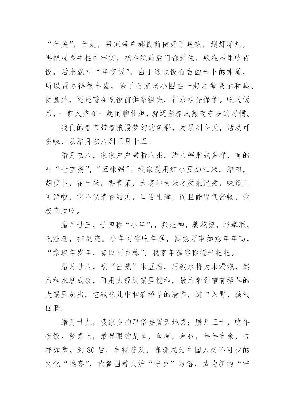 春节春节作文关于春节春节作文集锦9篇在日常的学习、工作、生活中,大家对作文都不陌生吧,作文是通过文字来表达一个主题意义的记叙方法。还是对作文一筹莫展吗?以下是小编为大家整理的春节春节作文9篇,欢迎大家借鉴与参考,希望对大家有所帮助。春节春节作文篇1春节是中国最为隆重的节日,我的家乡满洲里更是有不少讲究,“年味”十足。下面就让我带大家过一个“东北味”十足的春节吧!“二十三,送灶王;二十四,扫房子……三十晚上熬一宿;初一、初二满街走。”这首民谣道出了家乡春节的习俗。春节前,家家户户要打扫卫生,购买年货。购买年