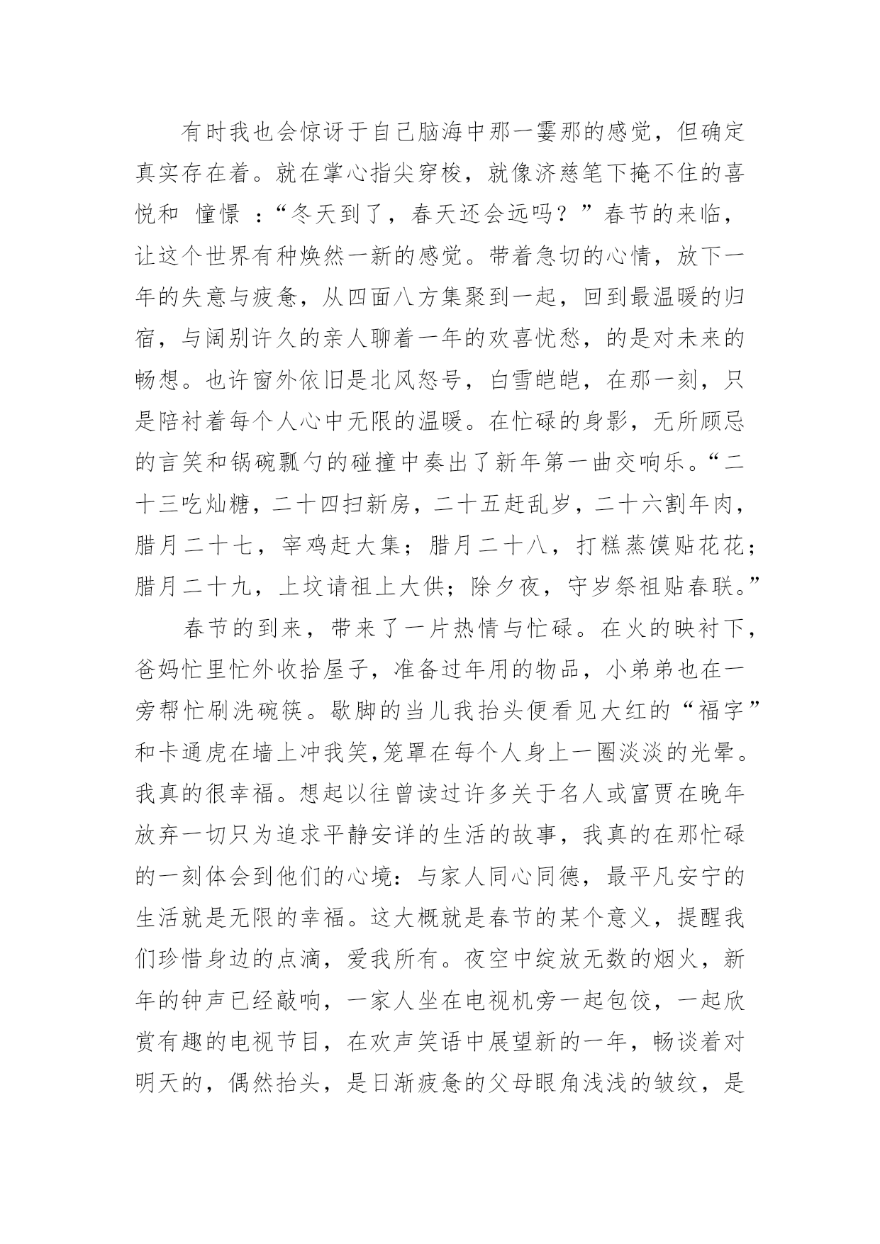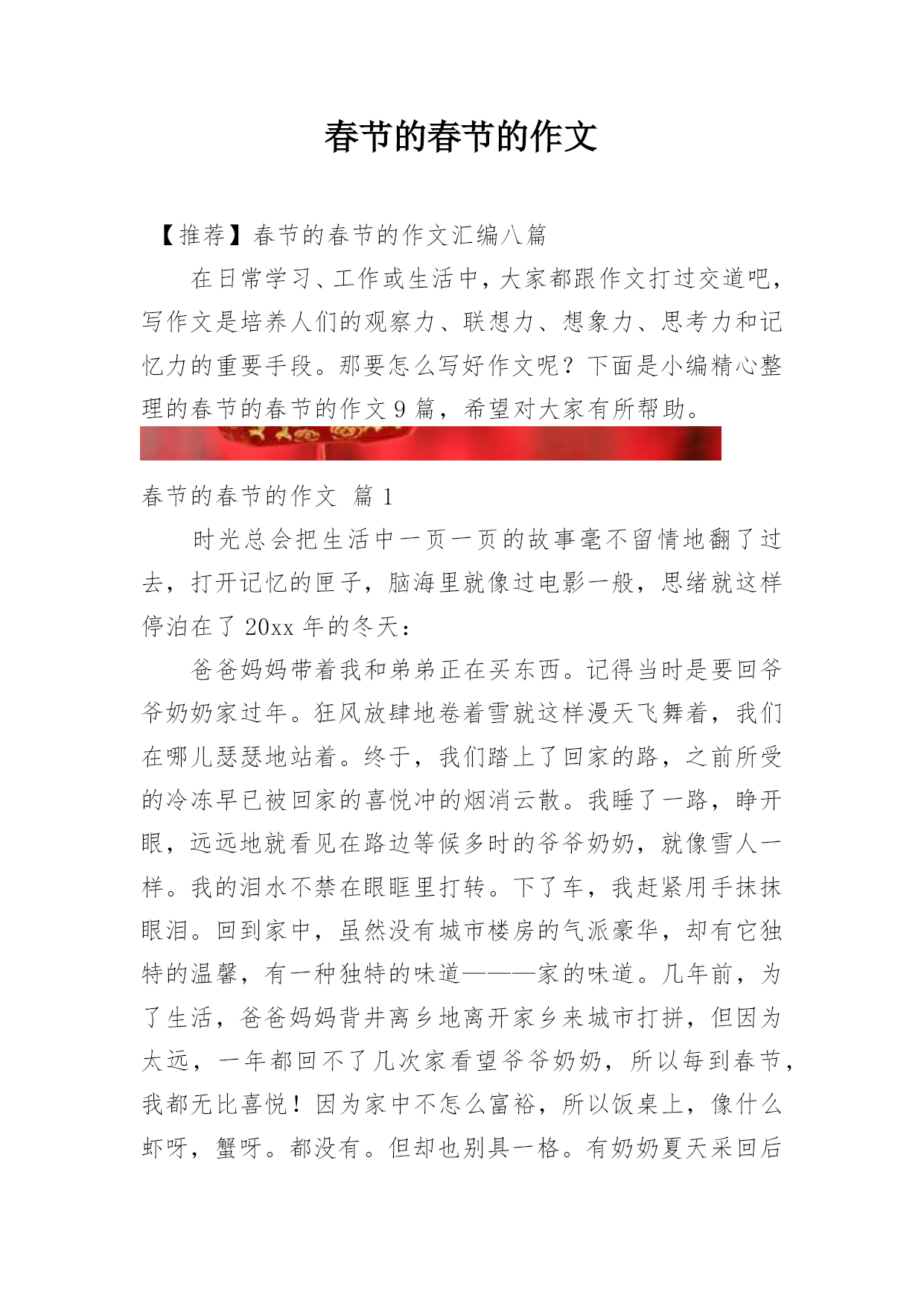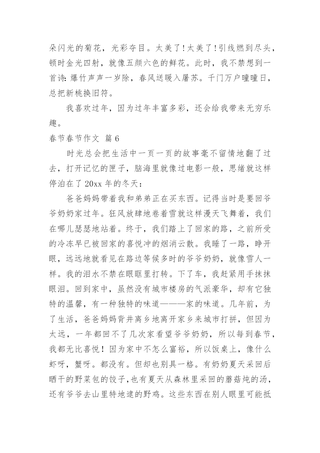 春节的春节的作文【推荐】春节的春节的作文汇编八篇在日常学习、工作或生活中,大家都跟作文打过交道吧,写作文是培养人们的观察力、联想力、想象力、思考力和记忆力的重要手段。那要怎么写好作文呢?下面是小编精心整理的春节的春节的作文9篇,希望对大家有所帮助。春节的春节的作文篇1时光总会把生活中一页一页的故事毫不留情地翻了过去,打开记忆的匣子,脑海里就像过电影一般,思绪就这样停泊在了20xx年的冬天:爸爸妈妈带着我和弟弟正在买东西。记得当时是要回爷爷奶奶家过年。狂风放肆地卷着雪就这样漫天飞舞着,我们在哪儿瑟瑟地站着。