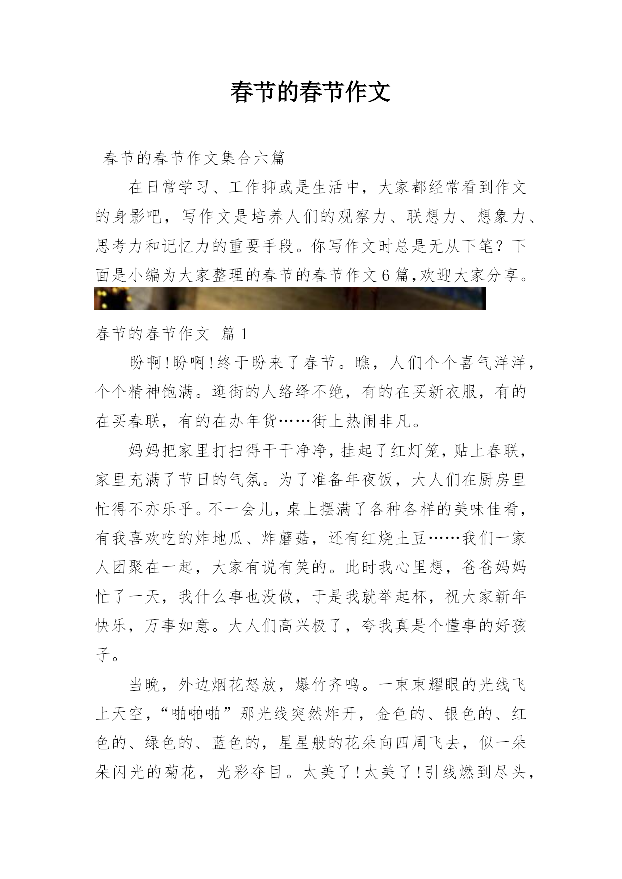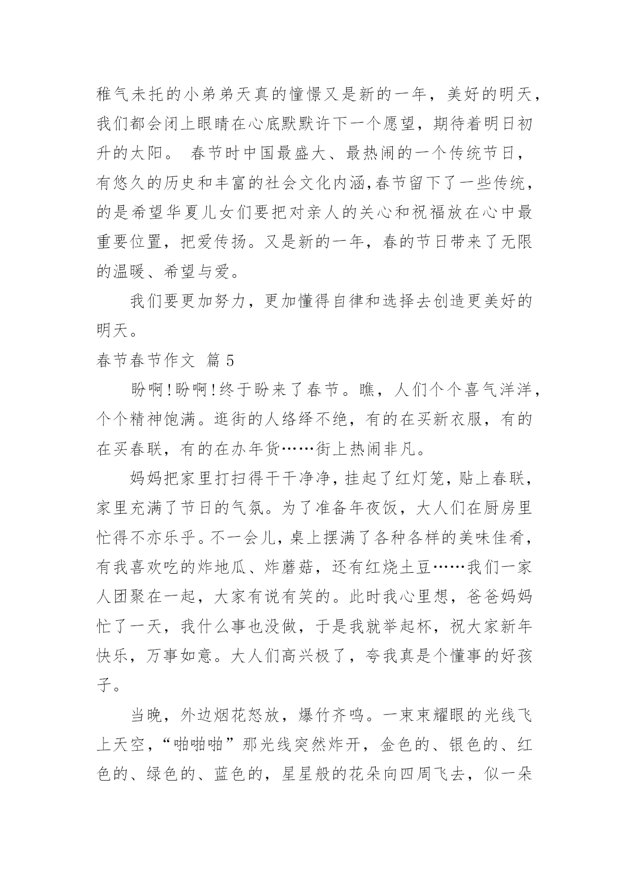春节的春节作文春节的春节作文集合六篇在日常学习、工作抑或是生活中,大家都经常看到作文的身影吧,写作文是培养人们的观察力、联想力、想象力、思考力和记忆力的重要手段。你写作文时总是无从下笔?下面是小编为大家整理的春节的春节作文6篇,欢迎大家分享。春节的春节作文篇1盼啊!盼啊!终于盼来了春节。瞧,人们个个喜气洋洋,个个精神饱满。逛街的人络绎不绝,有的在买新衣服,有的在买春联,有的在办年货……街上热闹非凡。妈妈把家里打扫得干干净净,挂起了红灯笼,贴上春联,家里充满了节日的气氛。为了准备年夜饭,大人们在厨房里忙得不