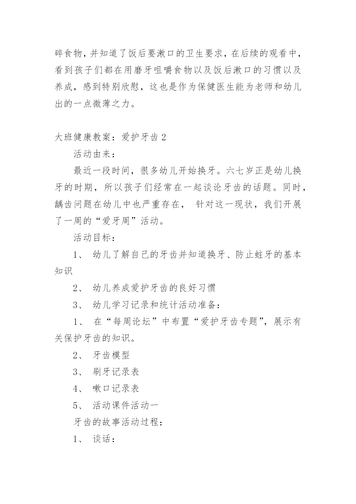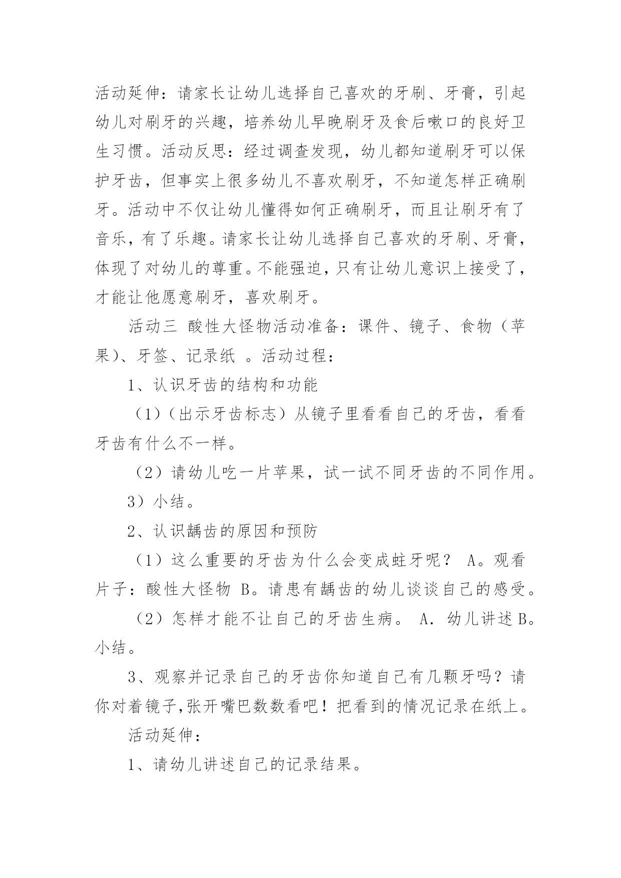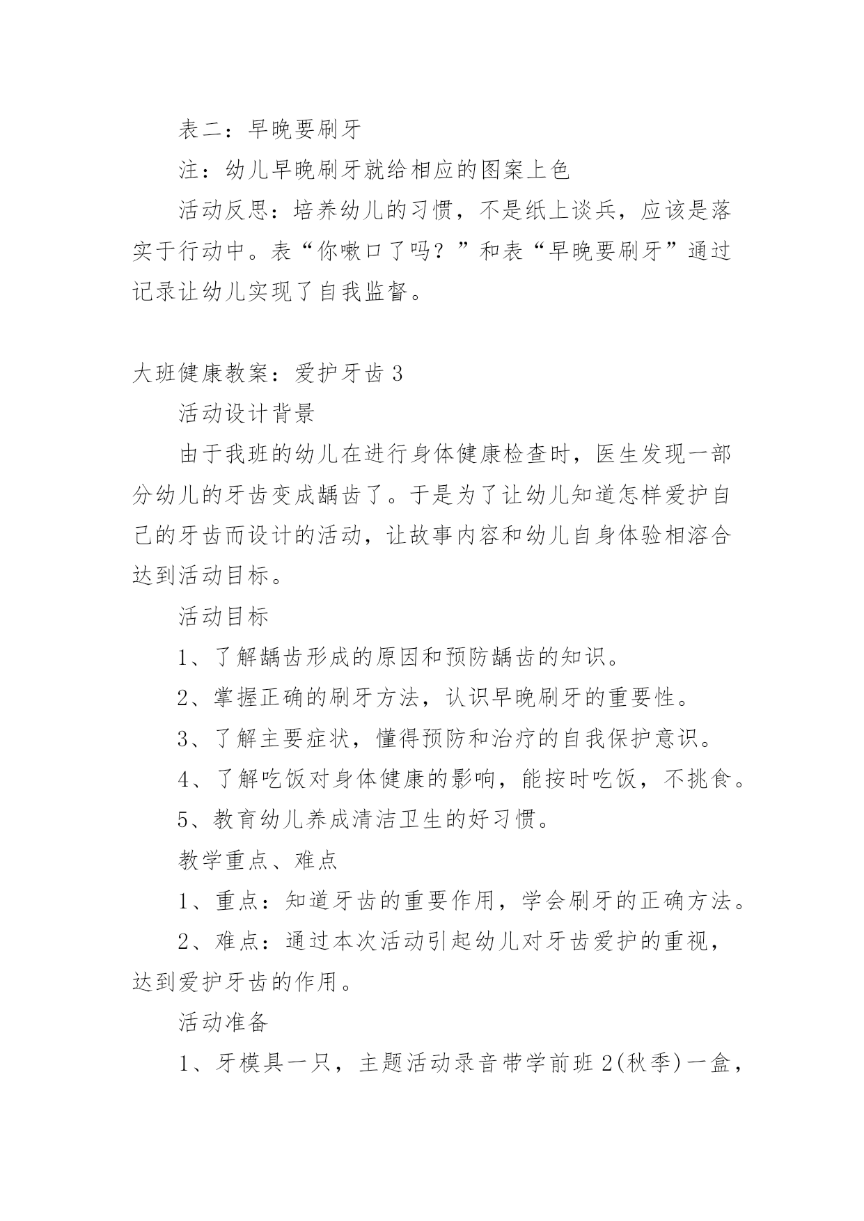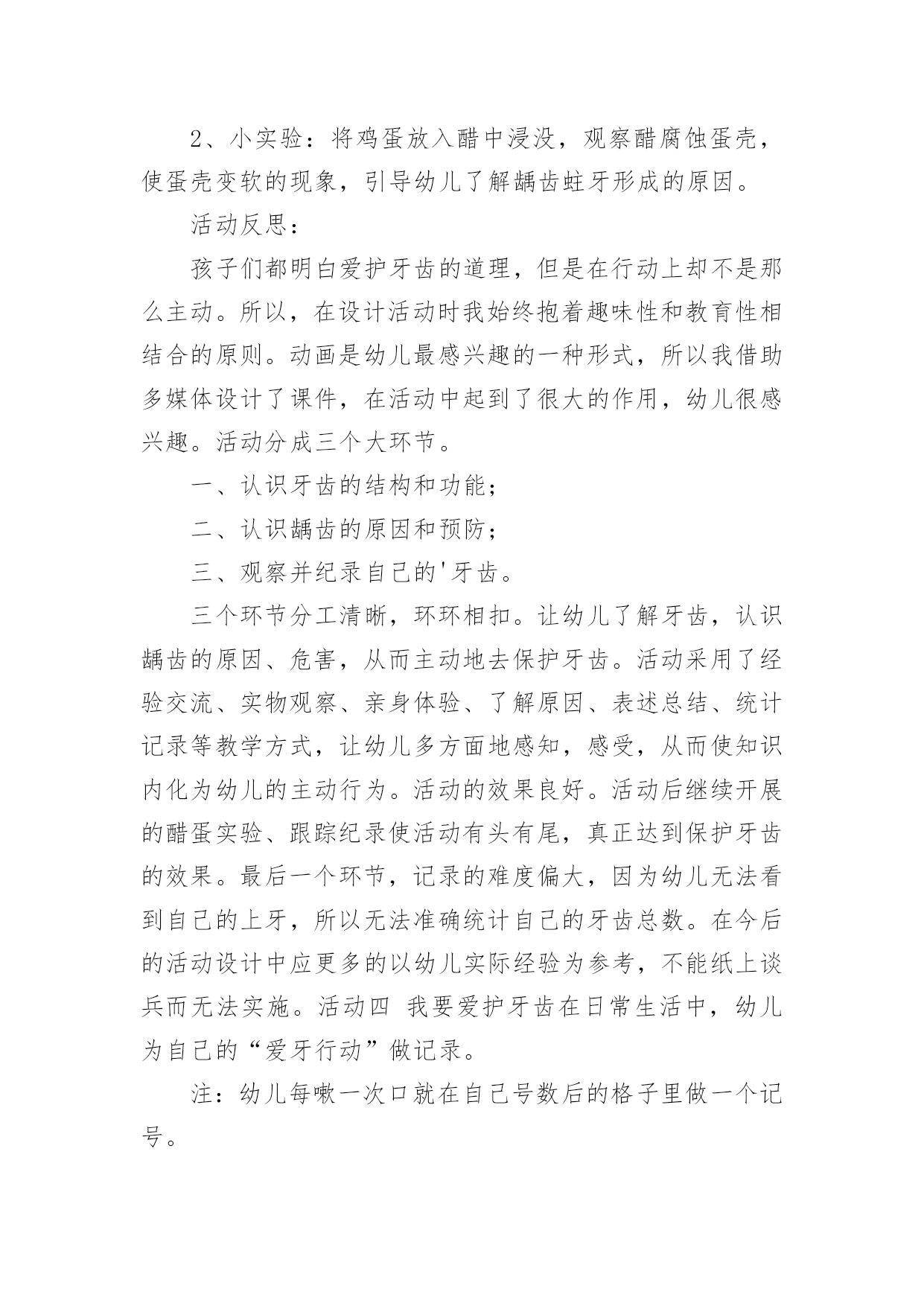 大班健康教案:爱护牙齿作为一名教学工作者,就不得不需要编写教案,教案有利于教学水平的提高,有助于教研活动的开展。那么应当如何写教案呢?以下是小编精心整理的大班健康教案:爱护牙齿,仅供参考,大家一起来看看吧。大班健康教案:爱护牙齿1活动目标:1、熟悉牙齿特征,初步了解牙齿作用。2、知道门牙和磨牙的的使用方法。3、能养成餐后漱口的习惯。4、乐观的参加活动,大胆的说出自己的想法。5、幼儿可以用完整的一般话进行沟通。活动预备:1、学问阅历预备:熟悉牙齿、牙刷,有刷牙阅历。2、物质材料预备:茶杯、镜子(每个小朋友各一);牙齿模型一个、奥利奥饼干;ppt《爱惜我们的牙齿》。活动过程:1、出示牙齿模型,熟悉牙齿特征。熟悉上牙、下牙、门牙、磨牙,知道门牙、磨牙的不同用处。"请小朋友看看小镜子,你的牙齿长在哪里?""牙齿长得都一样吗?""哪里不一样?""吃东西的时候你门牙会怎么做?磨牙又做什么呢?"小结:门牙主要是切断食物的,磨牙主要是磨碎食物的。因此,我们在吃东西时,要用门牙咬断食物,再用磨牙磨碎食物,这样,食物的养分才能被人体汲取,我们才能长高、长大。2、知道饭后漱口、早晚刷牙的重要性。"牙齿的本事这么大,我们要怎么样爱护我们的牙齿呢?""为什么我们要养成饭后漱口、早晚刷牙的习惯呢?"3、了解蛀牙产生的缘由。"老师给小朋友带来了一些小饼干,请小朋友一边吃一边用小镜子观看一下自己的'牙齿。""我们怎么样才能把食物弄掉呢?"4、学习正确漱口、刷牙的方法,并进行练习。四、延长活动:1、练习使用磨牙咀嚼。2、餐后漱口。3、嘱咐幼儿早晚刷牙。4、和家庭合作,共同关心孩子养成餐后漱口的习惯以及养成早晚刷牙的习惯。活动反思:本活动在小二班进行。小二班的幼儿是今年新入园的孩子,在家娇生惯养,吃饭全靠大人追着喂,吃饭也特殊慢,了解到相关状况后,我每天都去观看孩子们吃饭的状况,发觉他们在咀嚼食物方面存在问题,通过熟悉门牙和磨牙,幼儿知道了门牙的主要作用是切断食物,磨牙的主要作用是磨碎食物,并知道了饭后要漱口的卫生要求,在后续的观看中,看到孩子们都在用磨牙咀嚼食物以及饭后漱口的习惯以及养成,感到特别欣慰,这也是作为保健医生能为老师和幼儿出的一点微薄之力。大班健康教案:爱护牙齿2活动由来:最近一段时间,很多幼儿开始换牙。六七岁正是幼儿换牙的时期,所以孩子们经常在一起谈论牙齿的话题。同时,龋齿问题在幼儿中也严重存在,针对这一现状,我们开展了一周的“爱牙周”活动。活动目标:1、幼儿了解自己的牙齿并知道换牙、防止蛀牙的基本知识2、幼儿养成爱护牙齿的良好习惯3、幼儿学习记录和统计活动准备:1、在“每周论坛”中布置“爱护牙齿专题”,展示有关保护牙齿的知识。2、牙齿模型3、刷牙记录表4、嗽口记录表5、活动课件活动一牙齿的故事活动过程:1、谈话:(1)小朋友的牙齿为什么会掉下来?请有换牙体验的幼儿向大家介绍牙齿脱落及长出新牙的经过。(2)在换牙的时候要注意什么?幼儿以自身经验和已有知识开展讨论。2、讲述故事《换牙的故事》(见《领域活动指导》)3、故事后讨论:牙齿活动了怎么办?怎样保护刚刚长出的新牙?乳牙还没掉,新牙就长出来了怎么办?活动延伸:请家长带幼儿定期检查牙齿,早发现,早冶疗。引导帮助幼儿减少换牙的恐惧感。活动反思:家长在幼儿的换牙期会传授一些知识给幼儿,但都很零星。活动中我集中了幼儿零星的经验,使经验更完整。活动从幼儿的讨论开始。让幼儿成为活动的主体,使保护牙齿真正成为幼儿的需要。活动二刷牙歌活动过程:1、利用牙齿模型示范讲解正确的刷牙的顺序及方法:刷门牙竖刷几下,左边、右边各刷几下,向左上右上各刷几下。2、学习《刷牙歌》(1)欣赏歌曲,教师给歌曲按刷牙顺序加入动作,激发幼儿的学习兴趣。(2)跟唱歌曲。(3)在熟悉歌曲的基础上,幼儿跟着歌曲表演刷牙。活动延伸:请家长让幼儿选择自己喜欢的牙刷、牙膏,引起幼儿对刷牙的兴趣,培养幼儿早晚刷牙及食后嗽口的良好卫生习惯。活动反思:经过调查发现,幼儿都知道刷牙可以保护牙齿,但事实上很多幼儿不喜欢刷牙,不知道怎样正确刷牙。活动中不仅让幼儿懂得如何正确刷牙,而且让刷牙有了音乐,有了乐趣。请家长让幼儿选择自己喜欢的牙刷、牙膏,体现了对幼儿的尊重。不能强迫,只有让幼儿意识上接受了,才能让他愿意刷牙,喜欢刷牙。活动三酸性大怪物活动准备:课件、镜子、食物(苹果)、牙签、记录纸。活动过程:1、认识牙齿的结构和功能(1)(出示牙齿标志)从镜子里看看自己的牙齿,看看牙齿有什么不一样。(2)请幼儿吃一片苹果,试一试不同牙齿的不同作用。3)小结。2、认识龋齿的原因和预防(1)这么重要的牙齿为什么会变成蛀牙呢?A。观看片子:酸性大怪物B。请患有龋齿的幼儿谈谈自己的感受。(2)怎样才能不让自己的牙齿生病。A.幼儿讲述B。小结。3、观察并记录自己的牙齿你知