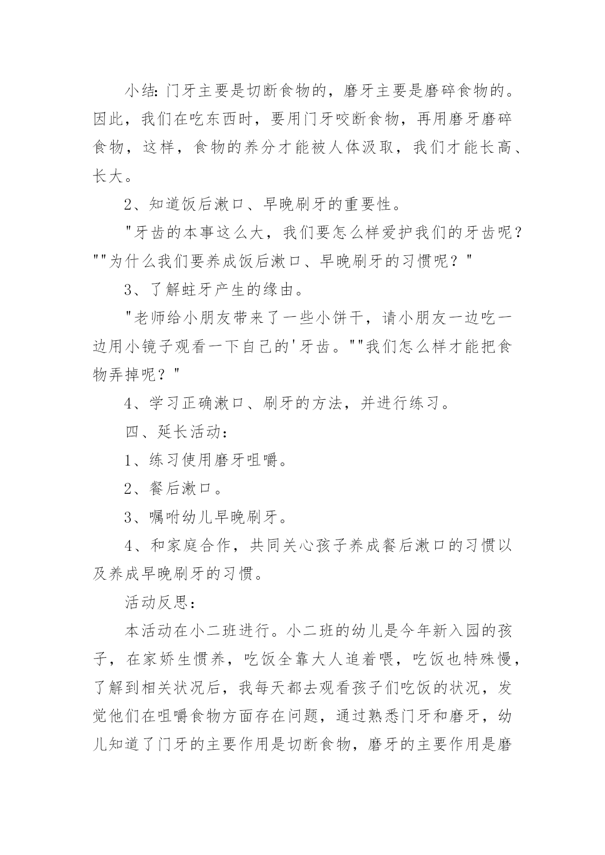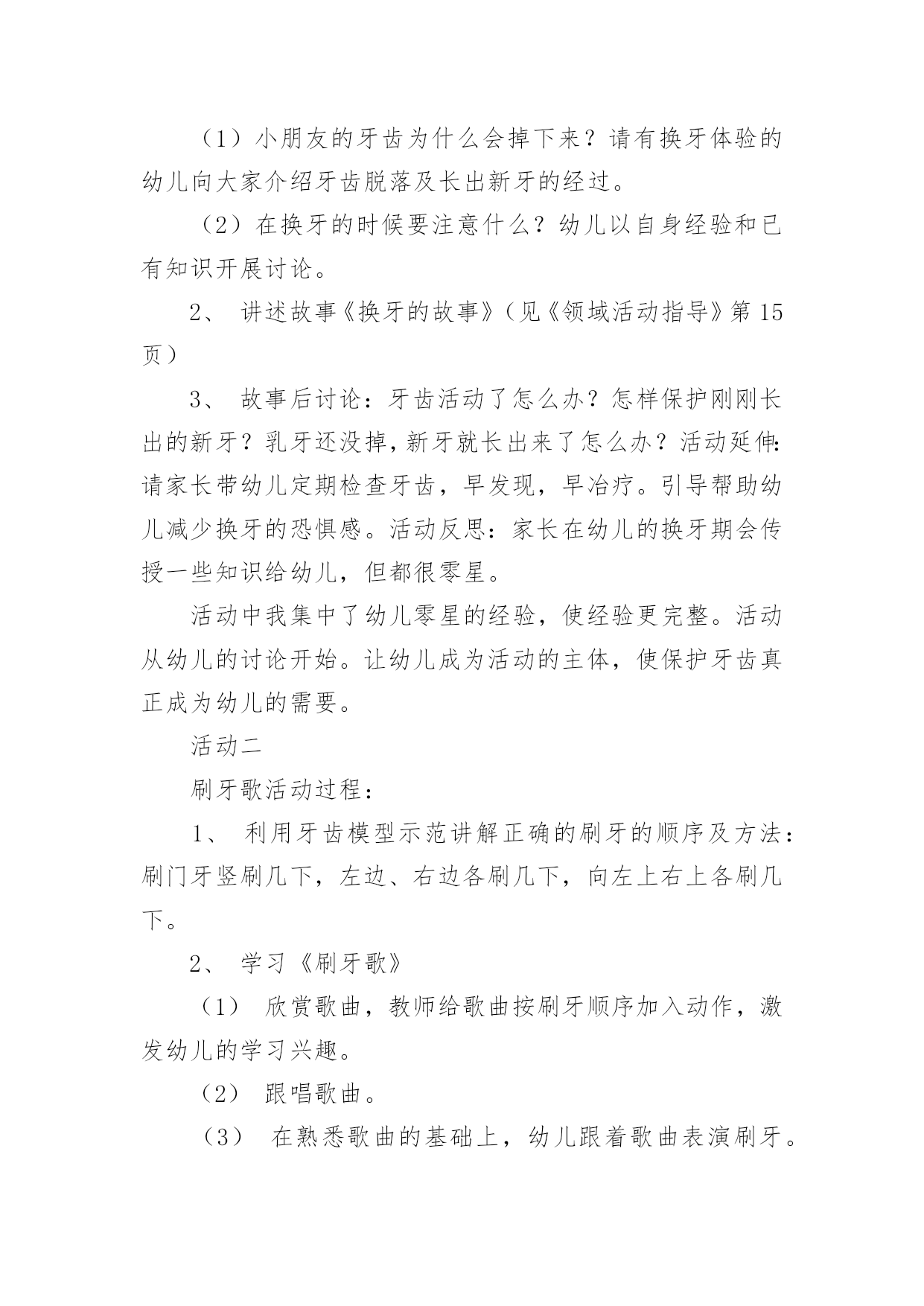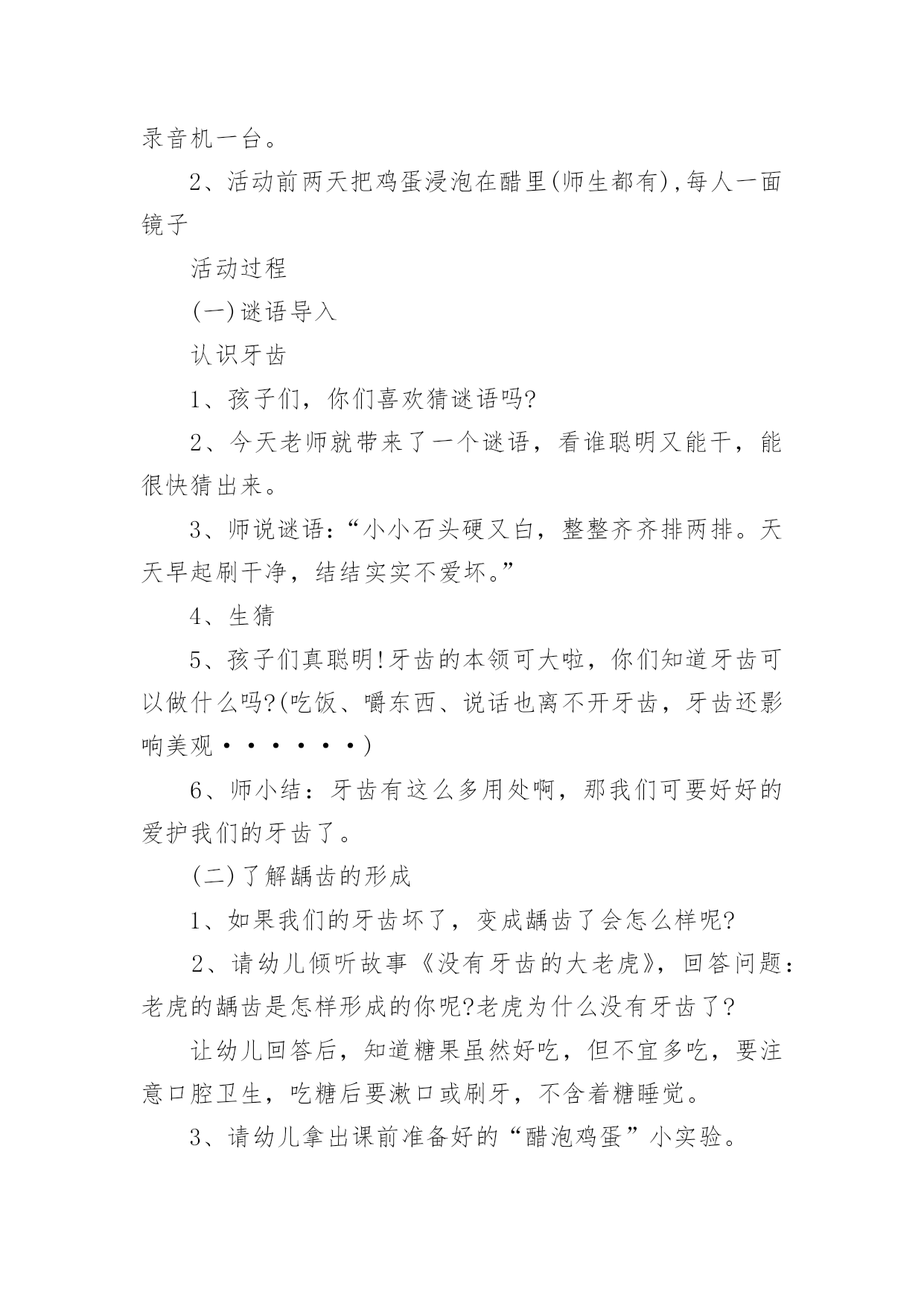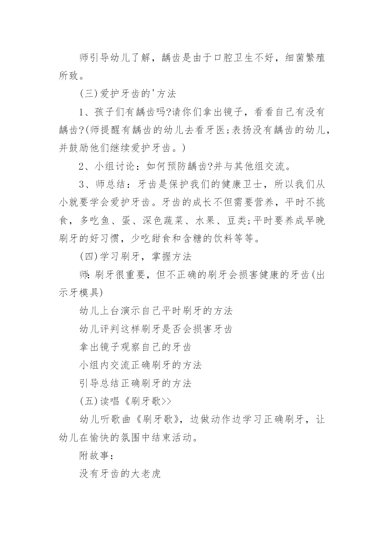 大班健康教案:爱护牙齿作为一名教学工作者,就不得不需要编写教案,教案有利于教学水平的提高,有助于教研活动的开展。那么应当如何写教案呢?以下是小编精心整理的大班健康教案:爱护牙齿,仅供参考,大家一起来看看吧。大班健康教案:爱护牙齿1活动目标:1、熟悉牙齿特征,初步了解牙齿作用。2、知道门牙和磨牙的的使用方法。3、能养成餐后漱口的习惯。4、乐观的参加活动,大胆的说出自己的想法。5、幼儿可以用完整的一般话进行沟通。活动预备:1、学问阅历预备:熟悉牙齿、牙刷,有刷牙阅历。2、物质材料预备:茶杯、镜子(每个小朋友各一);牙齿模型一个、奥利奥饼干;ppt《爱惜我们的牙齿》。活动过程:1、出示牙齿模型,熟悉牙齿特征。熟悉上牙、下牙、门牙、磨牙,知道门牙、磨牙的不同用处。"请小朋友看看小镜子,你的牙齿长在哪里?""牙齿长得都一样吗?""哪里不一样?""吃东西的时候你门牙会怎么做?磨牙又做什么呢?"小结:门牙主要是切断食物的,磨牙主要是磨碎食物的。因此,我们在吃东西时,要用门牙咬断食物,再用磨牙磨碎食物,这样,食物的养分才能被人体汲取,我们才能长高、长大。2、知道饭后漱口、早晚刷牙的重要性。"牙齿的本事这么大,我们要怎么样爱护我们的牙齿呢?""为什么我们要养成饭后漱口、早晚刷牙的习惯呢?"3、了解蛀牙产生的缘由。"老师给小朋友带来了一些小饼干,请小朋友一边吃一边用小镜子观看一下自己的'牙齿。""我们怎么样才能把食物弄掉呢?"4、学习正确漱口、刷牙的方法,并进行练习。四、延长活动:1、练习使用磨牙咀嚼。2、餐后漱口。3、嘱咐幼儿早晚刷牙。4、和家庭合作,共同关心孩子养成餐后漱口的习惯以及养成早晚刷牙的习惯。活动反思:本活动在小二班进行。小二班的幼儿是今年新入园的孩子,在家娇生惯养,吃饭全靠大人追着喂,吃饭也特殊慢,了解到相关状况后,我每天都去观看孩子们吃饭的状况,发觉他们在咀嚼食物方面存在问题,通过熟悉门牙和磨牙,幼儿知道了门牙的主要作用是切断食物,磨牙的主要作用是磨碎食物,并知道了饭后要漱口的卫生要求,在后续的观看中,看到孩子们都在用磨牙咀嚼食物以及饭后漱口的习惯以及养成,感到特别欣慰,这也是作为保健医生能为老师和幼儿出的一点微薄之力。大班健康教案:爱护牙齿2活动由来:最近一段时间,很多幼儿开始换牙。六七岁正是幼儿换牙的时期,所以孩子们经常在一起谈论牙齿的话题。同时,龋齿问题在幼儿中也严重存在,针对这一现状,我们开展了一周的“爱牙周”活动。活动目标:1、幼儿了解自己的牙齿并知道换牙、防止蛀牙的基本知识2、幼儿养成爱护牙齿的良好习惯3、幼儿学习记录和统计活动准备:1、在“每周论坛”中布置“爱护牙齿专题”,展示有关保护牙齿的知识。2、牙齿模型3、刷牙记录表4、嗽口记录表5、活动课件活动一牙齿的故事活动过程:1、谈话:(1)小朋友的牙齿为什么会掉下来?请有换牙体验的幼儿向大家介绍牙齿脱落及长出新牙的经过。(2)在换牙的时候要注意什么?幼儿以自身经验和已有知识开展讨论。2、讲述故事《换牙的故事》(见《领域活动指导》)3、故事后讨论:牙齿活动了怎么办?怎样保护刚刚长出的新牙?乳牙还没掉,新牙就长出来了怎么办?活动延伸:请家长带幼儿定期检查牙齿,早发现,早冶疗。引导帮助幼儿减少换牙的恐惧感。活动反思:家长在幼儿的换牙期会传授一些知识给幼儿,但都很零星。活动中我集中了幼儿零星的经验,使经验更完整。活动从幼儿的讨论开始。让幼儿成为活动的主体,使保护牙齿真正成为幼儿的需要。活动二刷牙歌活动过程:1、利用牙齿模型示范讲解正确的刷牙的顺序及方法:刷门牙竖刷几下,左边、右边各刷几下,向左上右上各刷几下。2、学习《刷牙歌》(1)欣赏歌曲,教师给歌曲按刷牙顺序加入动作,激发幼儿的学习兴趣。(2)跟唱歌曲。(3)在熟悉歌曲的基础上,幼儿跟着歌曲表演刷牙。活动延伸:请家长让幼儿选择自己喜欢的牙刷、牙膏,引起幼儿对刷牙的兴趣,培养幼儿早晚刷牙及食后嗽口的良好卫生习惯。活动反思:经过调查发现,幼儿都知道刷牙可以保护牙齿,但事实上很多幼儿不喜欢刷牙,不知道怎样正确刷牙。活动中不仅让幼儿懂得如何正确刷牙,而且让刷牙有了音乐,有了乐趣。请家长让幼儿选择自己喜欢的牙刷、牙膏,体现了对幼儿的尊重。不能强迫,只有让幼儿意识上接受了,才能让他愿意刷牙,喜欢刷牙。活动三酸性大怪物活动准备:课件、镜子、食物(苹果)、牙签、记录纸。活动过程:1、认识牙齿的结构和功能(1)(出示牙齿标志)从镜子里看看自己的牙齿,看看牙齿有什么不一样。(2)请幼儿吃一片苹果,试一试不同牙齿的不同作用。3)小结。2、认识龋齿的原因和预防(1)这么重要的牙齿为什么会变成蛀牙呢?A。观看片子:酸性大怪物B。请患有龋齿的幼儿谈谈自己的感受。(2)怎样才能不让自己的牙齿生病。A.幼儿讲述B。小结。3、观察并记录自己的牙齿你知