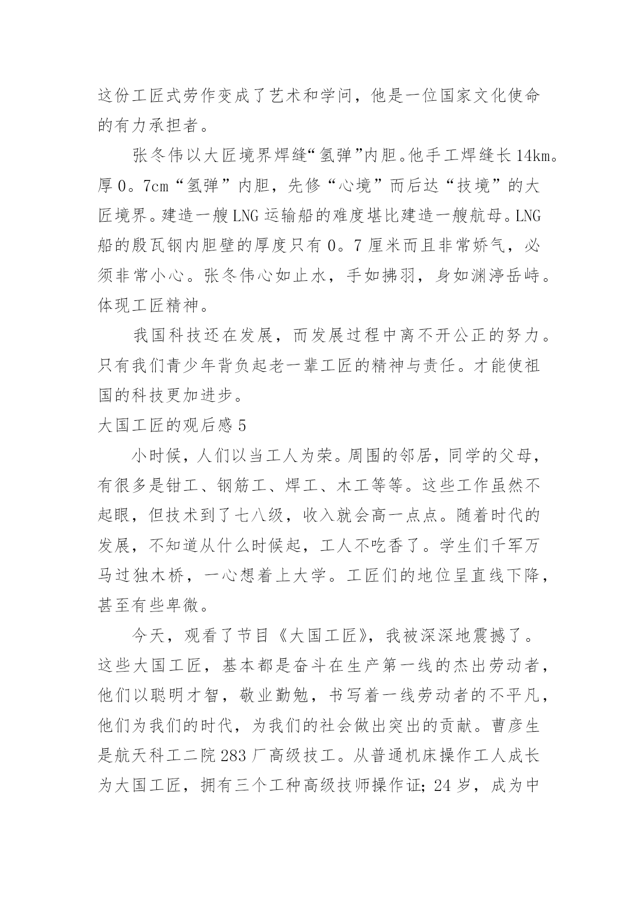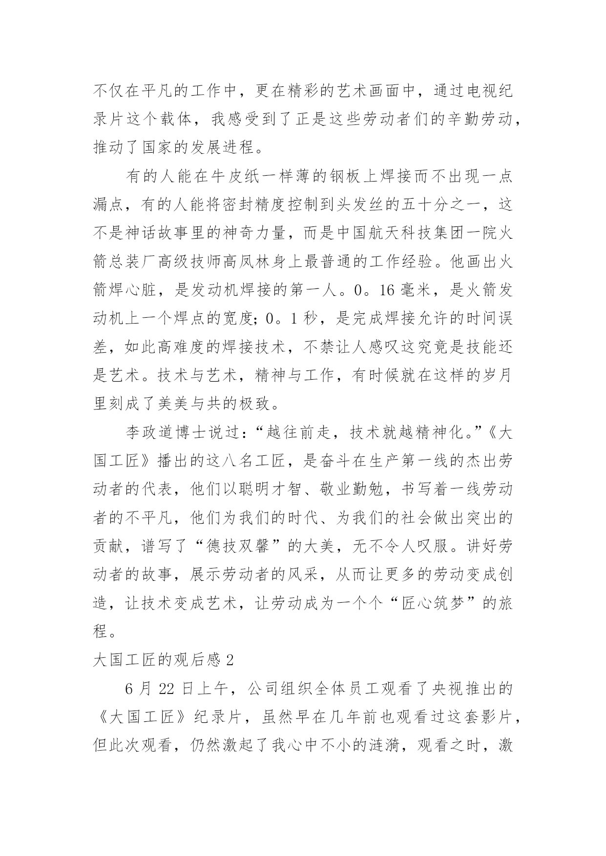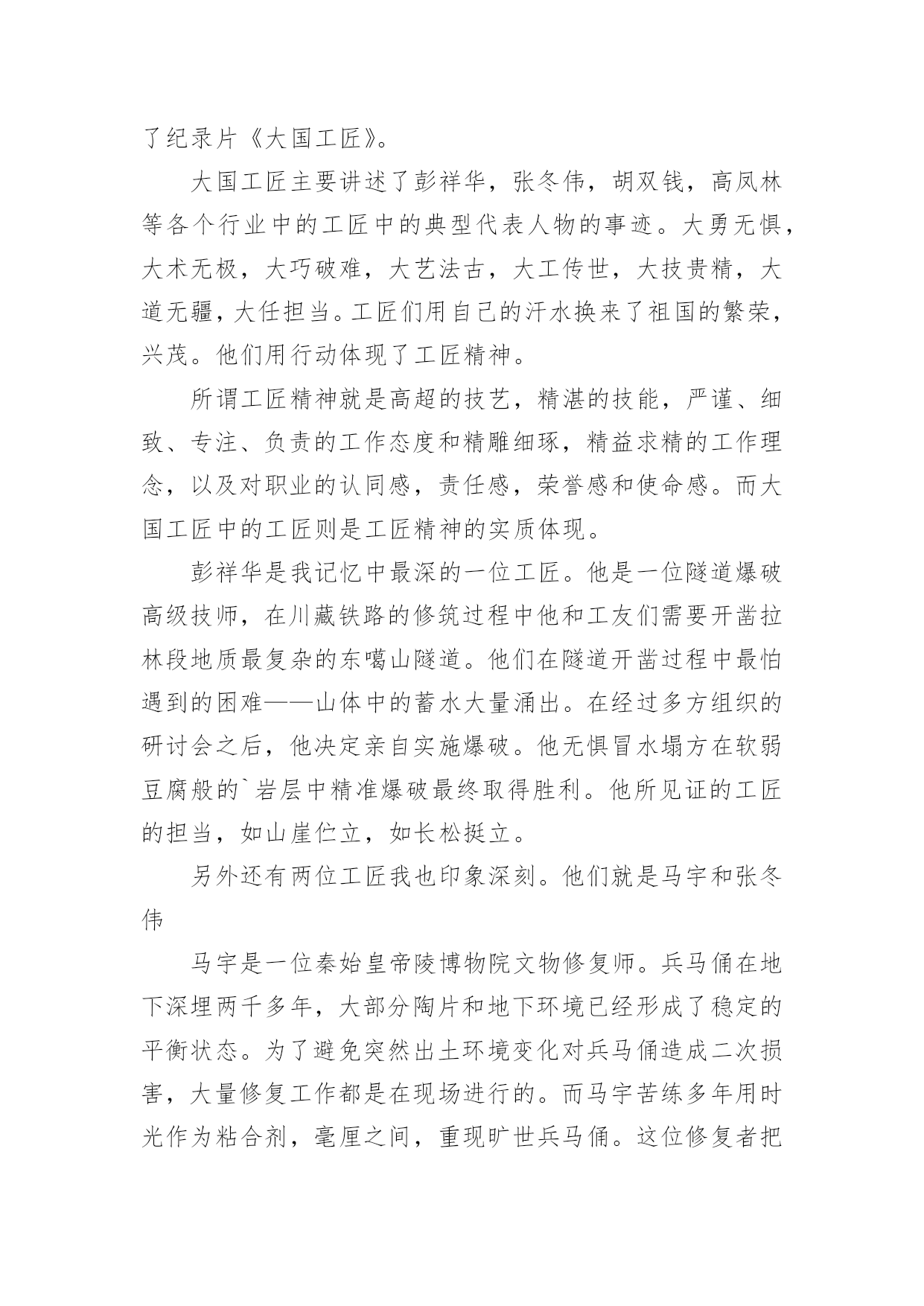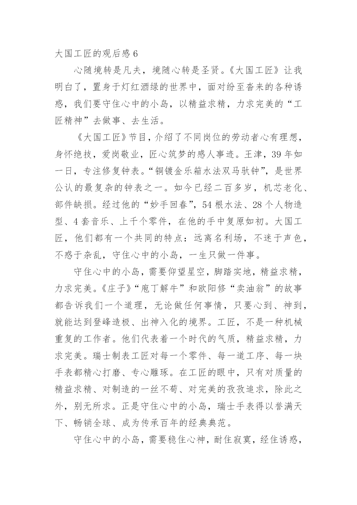 大国工匠的观后感大国工匠的观后感看完一部作品后,你有什么总结呢?这时候十分有必须要写一篇观后感了!想必许多人都在为如何写好观后感而烦恼吧,下面是小编收集整理的大国工匠的观后感,欢迎阅读,希望大家能够喜欢。大国工匠的观后感1纪录片中,“大国工匠”都是奋斗在生产一线的杰出劳动者,他们精湛的技艺和积极探求的精神,令人叹为观止。精湛的技术加上敬业奉献和精益求精的精神,这就是人们常常称道的“德技双馨”,有此两能,技术创新,做大做强,就有了根基和资本。央视播出的《大国工匠》反映的是普通职工在平凡的岗位上做出的不平凡业绩,让人敬畏和感动的“德技双馨”的真人真故事,没有半点夸张,平时的叙述就是岁月里无限追求的刻录。三百六十行,行行出状元。我从《大国工匠》中看到了平凡的岗位中迸发出来的劳动精神,劳动之美。对于广大观众来说,《大国工匠》早已经不是一个陌生的名字。尤其电视中的一些故事、人物,让我们的记忆穿越时空,仿佛就在昨天,这些平凡岗位上的劳动者,有老一辈劳模的精神再现,也有当今高科技建设者的劳动创造,这些可歌可泣的人物,不仅在平凡的工作中,更在精彩的艺术画面中,通过电视纪录片这个载体,我感受到了正是这些劳动者们的辛勤劳动,推动了国家的发展进程。有的人能在牛皮纸一样薄的钢板上焊接而不出现一点漏点,有的人能将密封精度控制到头发丝的五十分之一,这不是神话故事里的神奇力量,而是中国航天科技集团一院火箭总装厂高级技师高凤林身上最普通的工作经验。他画出火箭焊心脏,是发动机焊接的第一人。0。16毫米,是火箭发动机上一个焊点的宽度;0。1秒,是完成焊接允许的时间误差,如此高难度的焊接技术,不禁让人感叹这究竟是技能还是艺术。技术与艺术,精神与工作,有时候就在这样的岁月里刻成了美美与共的极致。李政道博士说过:“越往前走,技术就越精神化。”《大国工匠》播出的这八名工匠,是奋斗在生产第一线的杰出劳动者的代表,他们以聪明才智、敬业勤勉,书写着一线劳动者的不平凡,他们为我们的时代、为我们的社会做出突出的贡献,谱写了“德技双馨”的大美,无不令人叹服。讲好劳动者的故事,展示劳动者的风采,从而让更多的劳动变成创造,让技术变成艺术,让劳动成为一个个“匠心筑梦”的旅程。大国工匠的观后感26月22日上午,公司组织全体员工观看了央视推出的《大国工匠》纪录片,虽然早在几年前也观看过这套影片,但此次观看,仍然激起了我心中不小的涟漪,观看之时,激情澎湃,观看过后,感慨万千;各位工匠们巧夺天工,将看似平凡的事情做到了极致,将看似不可能完成的任务,做的游刃有余,做到了行业乃至世界顶尖级别;我知道这背后是年复一年、日复一日的练习与坚持、坚守与热爱!给我印象最深刻的是高级焊接技师----卢仁峰,在一场焊接事故中,他险些彻底失去左手,大拇指、食指、中指被勉强缝合,已基本不能工作。但他没有被吓到,反而更加坚定有力。他用一只手重新书写自己的人生,不断追求焊接技术革新,被誉为"独手焊侠";卢仁峰能拥有这样的成就,靠的不是天资聪慧,而是一点一滴踏实的历练、坚持与永不服输的精神!试想,经历过如此大磨难的人尚能有这样的成就,更何况我们这些四肢健全的人呢?作为一名财务人员,我们的工作就是每天与数字打交道,与繁琐的账目打交道,财务工作意味着日常性和机械性的周而复始,不断重复。从月初开始每一笔经济业务,付款、收款、核对、复核、结账,到月末结账,保证每一笔业务准确、完整,使之不仅要符合公司内部制度管理规定,也要符合国家财经法规规定。除此之外,还需应对各种各样的检查:内部审计监督、会计师事务所的审计、税务局等政府部门的各种审查;另外,还要不断学习日益更新的国家财经法规,只有这样,才能保证我们的知识常新,才能主动为单位创造价值,合理的规避风险,为领导的决策提供专业的支持。我想工匠精神之于财务工作,应该是一种精益求精,不断超越自我的过程;应该是一种精雕细琢,不断提升自身技巧的过程;正因为财务工作看似繁琐与无味,才更需要大国工匠身上具有“耐心、专注、坚持”的精神!让我们在公司提供的良好平台上,端正态度,积极学习,努力工作,认真对待工作中的每一件事,每一个岗位,做到精益求精!即使我们达不到大国工匠们那样精湛的技巧,也要让自己每天提高一点,不负青春,不负自我!大国工匠的观后感3大国工匠,匠心筑梦,他们一念执着,一生坚守。我们国家需要许多像这样的人才。就是因为他们,才会有如此大的进步。他们是谁呢?他们是中国“大国之匠”,他们用智慧创造今日的辉煌,他们用实力创造今日的成就,他们证明中国这个大国的实力,他们证明了我们国家的进步与努力。打造“中国制造”,有这样一些国家顶级技师,他们的名字是故秋亮,孟剑锋,胡双钱……故秋亮为载人潜水艇做出伟大的贡献――蛟龙号,一丝不苟,临近退休却依旧关注祖国的未来,默默奉献祖国科技中。为此,孟剑锋,国家高