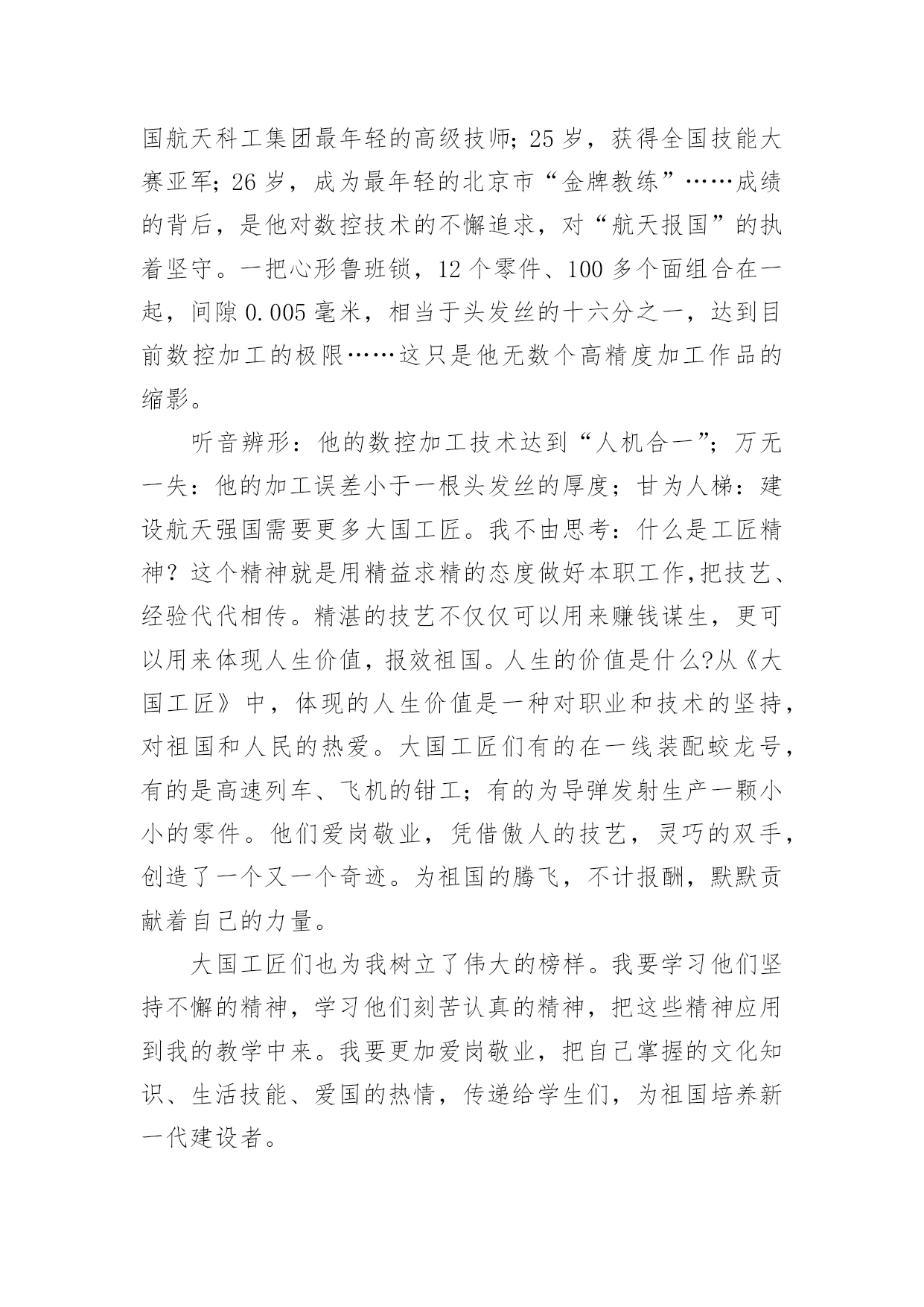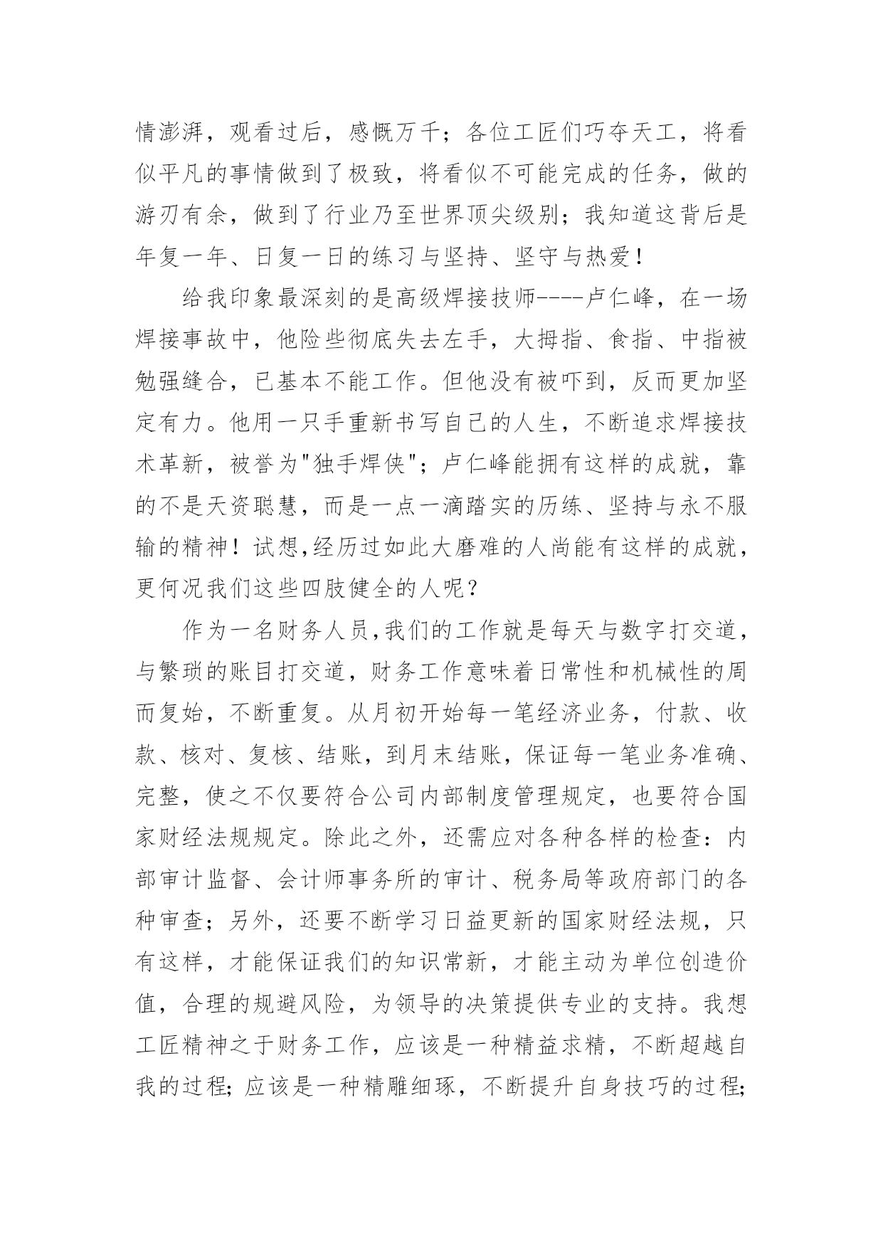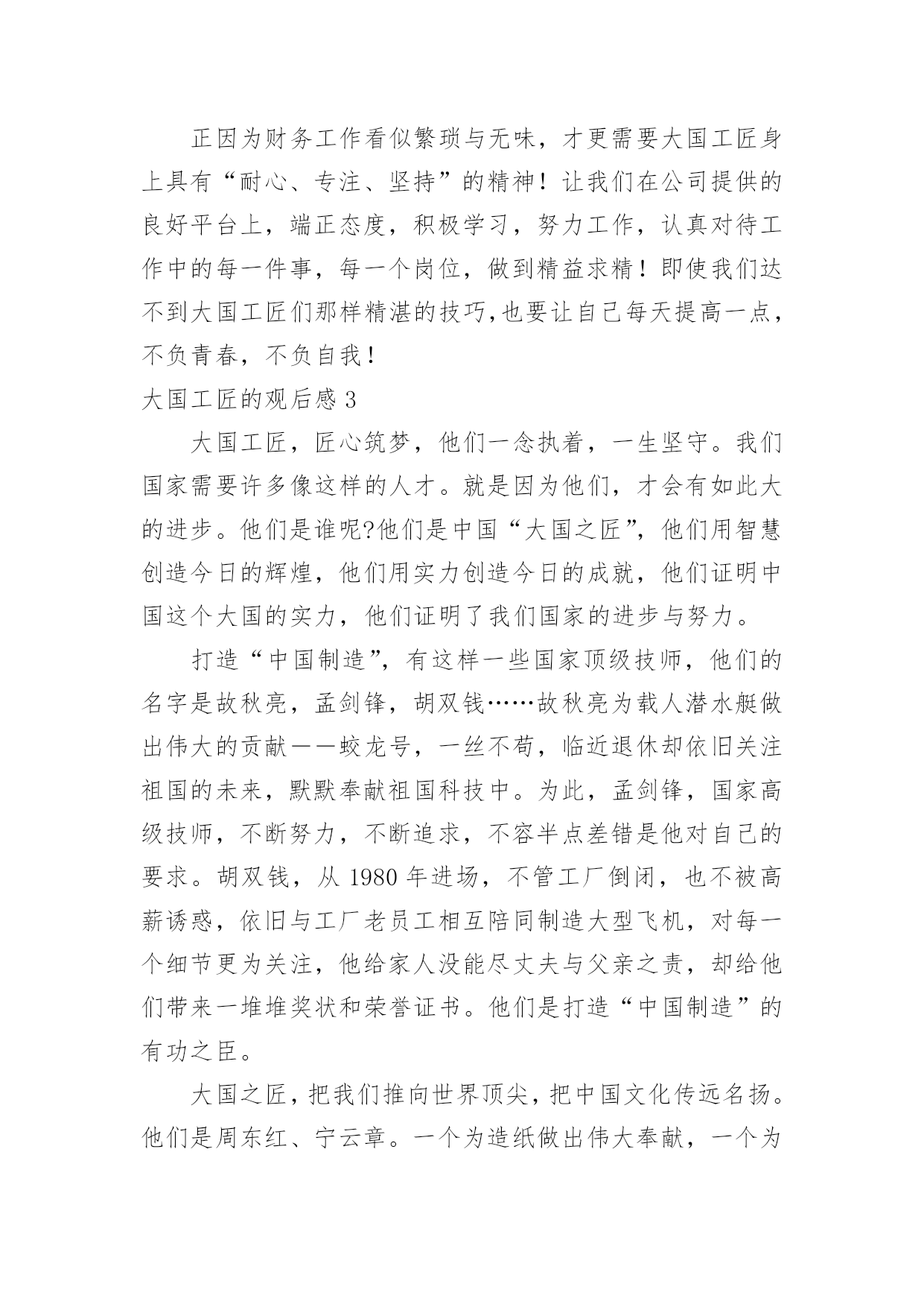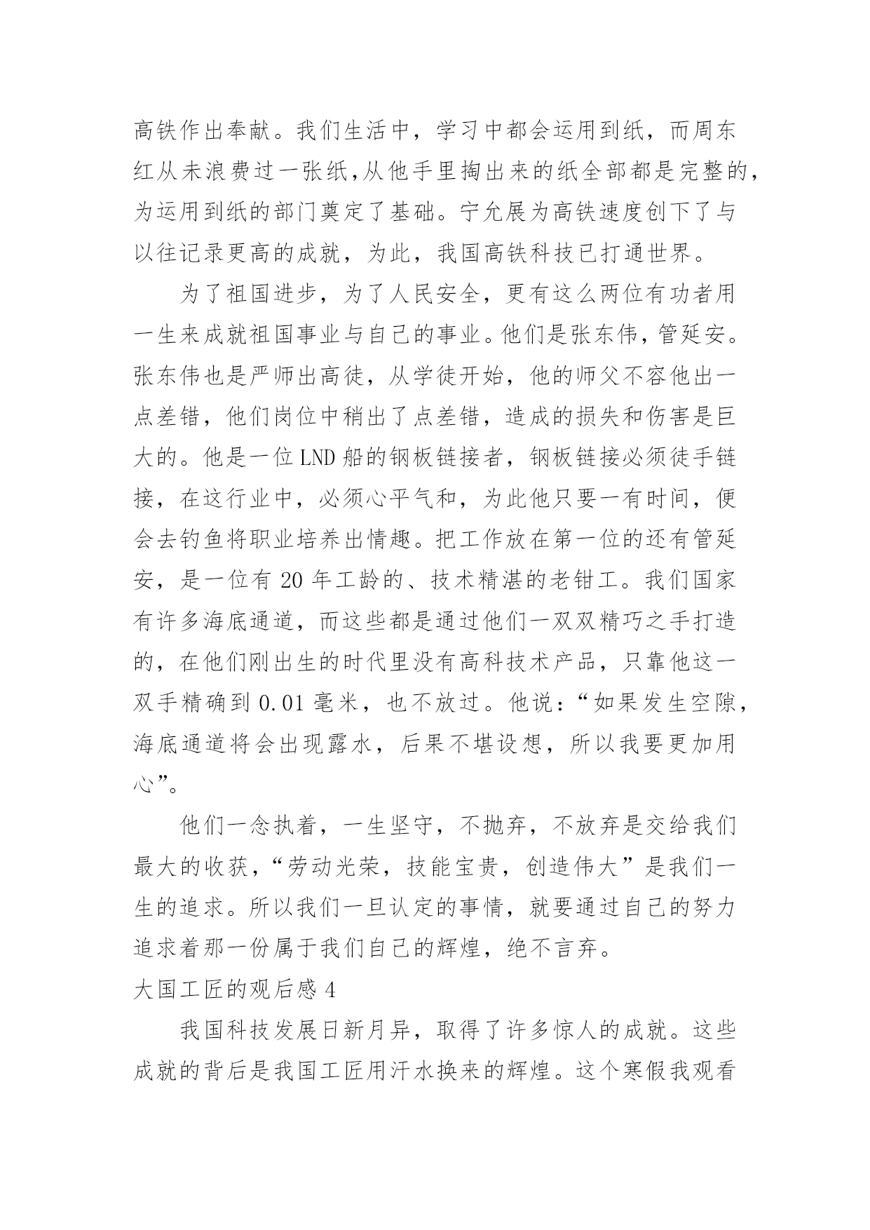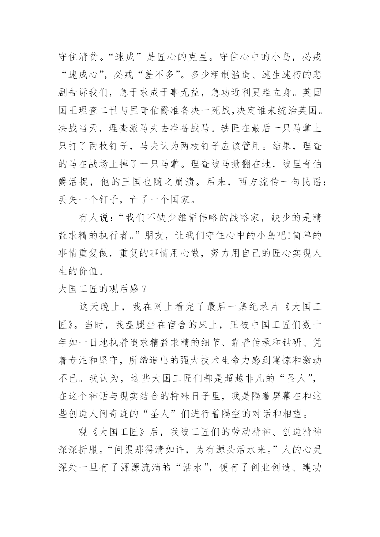 大国工匠的观后感大国工匠的观后感看完一部作品后,你有什么总结呢?这时候十分有必须要写一篇观后感了!想必许多人都在为如何写好观后感而烦恼吧,下面是小编收集整理的大国工匠的观后感,欢迎阅读,希望大家能够喜欢。大国工匠的观后感1纪录片中,“大国工匠”都是奋斗在生产一线的杰出劳动者,他们精湛的技艺和积极探求的精神,令人叹为观止。精湛的技术加上敬业奉献和精益求精的精神,这就是人们常常称道的“德技双馨”,有此两能,技术创新,做大做强,就有了根基和资本。央视播出的《大国工匠》反映的是普通职工在平凡的岗位上做出的不平凡业绩,让人敬畏和感动的“德技双馨”的真人真故事,没有半点夸张,平时的叙述就是岁月里无限追求的刻录。三百六十行,行行出状元。我从《大国工匠》中看到了平凡的岗位中迸发出来的劳动精神,劳动之美。对于广大观众来说,《大国工匠》早已经不是一个陌生的名字。尤其电视中的一些故事、人物,让我们的记忆穿越时空,仿佛就在昨天,这些平凡岗位上的劳动者,有老一辈劳模的精神再现,也有当今高科技建设者的劳动创造,这些可歌可泣的人物,不仅在平凡的工作中,更在精彩的艺术画面中,通过电视纪录片这个载体,我感受到了正是这些劳动者们的辛勤劳动,推动了国家的发展进程。有的人能在牛皮纸一样薄的钢板上焊接而不出现一点漏点,有的人能将密封精度控制到头发丝的五十分之一,这不是神话故事里的神奇力量,而是中国航天科技集团一院火箭总装厂高级技师高凤林身上最普通的工作经验。他画出火箭焊心脏,是发动机焊接的第一人。0。16毫米,是火箭发动机上一个焊点的宽度;0。1秒,是完成焊接允许的时间误差,如此高难度的焊接技术,不禁让人感叹这究竟是技能还是艺术。技术与艺术,精神与工作,有时候就在这样的岁月里刻成了美美与共的极致。李政道博士说过:“越往前走,技术就越精神化。”《大国工匠》播出的这八名工匠,是奋斗在生产第一线的杰出劳动者的代表,他们以聪明才智、敬业勤勉,书写着一线劳动者的不平凡,他们为我们的时代、为我们的社会做出突出的贡献,谱写了“德技双馨”的大美,无不令人叹服。讲好劳动者的故事,展示劳动者的风采,从而让更多的劳动变成创造,让技术变成艺术,让劳动成为一个个“匠心筑梦”的旅程。大国工匠的观后感26月22日上午,公司组织全体员工观看了央视推出的《大国工匠》纪录片,虽然早在几年前也观看过这套影片,但此次观看,仍然激起了我心中不小的涟漪,观看之时,激情澎湃,观看过后,感慨万千;各位工匠们巧夺天工,将看似平凡的事情做到了极致,将看似不可能完成的任务,做的游刃有余,做到了行业乃至世界顶尖级别;我知道这背后是年复一年、日复一日的练习与坚持、坚守与热爱!给我印象最深刻的是高级焊接技师----卢仁峰,在一场焊接事故中,他险些彻底失去左手,大拇指、食指、中指被勉强缝合,已基本不能工作。但他没有被吓到,反而更加坚定有力。他用一只手重新书写自己的人生,不断追求焊接技术革新,被誉为"独手焊侠";卢仁峰能拥有这样的成就,靠的不是天资聪慧,而是一点一滴踏实的历练、坚持与永不服输的精神!试想,经历过如此大磨难的人尚能有这样的成就,更何况我们这些四肢健全的人呢?作为一名财务人员,我们的工作就是每天与数字打交道,与繁琐的账目打交道,财务工作意味着日常性和机械性的周而复始,不断重复。从月初开始每一笔经济业务,付款、收款、核对、复核、结账,到月末结账,保证每一笔业务准确、完整,使之不仅要符合公司内部制度管理规定,也要符合国家财经法规规定。除此之外,还需应对各种各样的检查:内部审计监督、会计师事务所的审计、税务局等政府部门的各种审查;另外,还要不断学习日益更新的国家财经法规,只有这样,才能保证我们的知识常新,才能主动为单位创造价值,合理的规避风险,为领导的决策提供专业的支持。我想工匠精神之于财务工作,应该是一种精益求精,不断超越自我的过程;应该是一种精雕细琢,不断提升自身技巧的过程;正因为财务工作看似繁琐与无味,才更需要大国工匠身上具有“耐心、专注、坚持”的精神!让我们在公司提供的良好平台上,端正态度,积极学习,努力工作,认真对待工作中的每一件事,每一个岗位,做到精益求精!即使我们达不到大国工匠们那样精湛的技巧,也要让自己每天提高一点,不负青春,不负自我!大国工匠的观后感3大国工匠,匠心筑梦,他们一念执着,一生坚守。我们国家需要许多像这样的人才。就是因为他们,才会有如此大的进步。他们是谁呢?他们是中国“大国之匠”,他们用智慧创造今日的辉煌,他们用实力创造今日的成就,他们证明中国这个大国的实力,他们证明了我们国家的进步与努力。打造“中国制造”,有这样一些国家顶级技师,他们的名字是故秋亮,孟剑锋,胡双钱……故秋亮为载人潜水艇做出伟大的贡献――蛟龙号,一丝不苟,临近退休却依旧关注祖国的未来,默默奉献祖国科技中。为此,孟剑锋,国家高