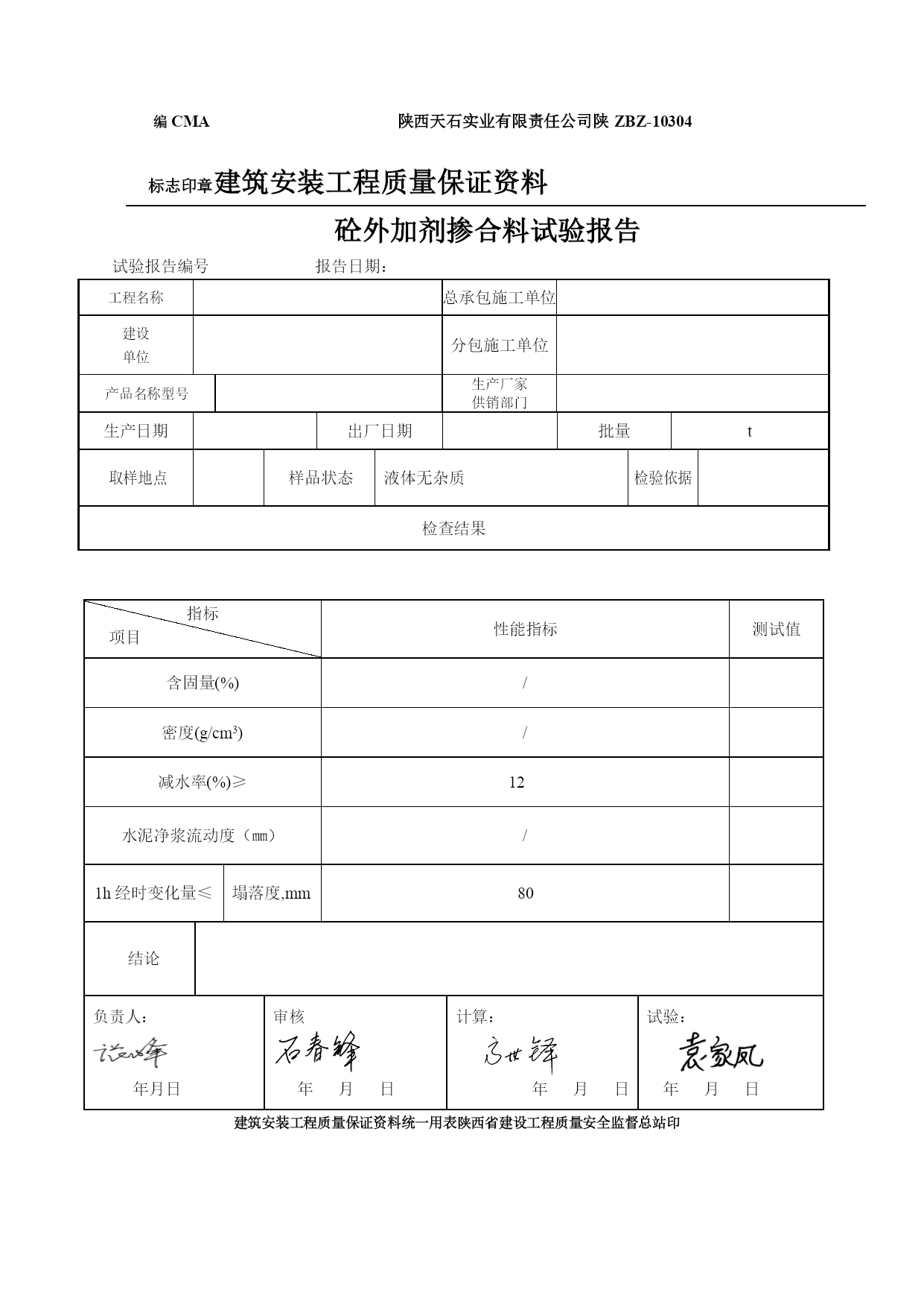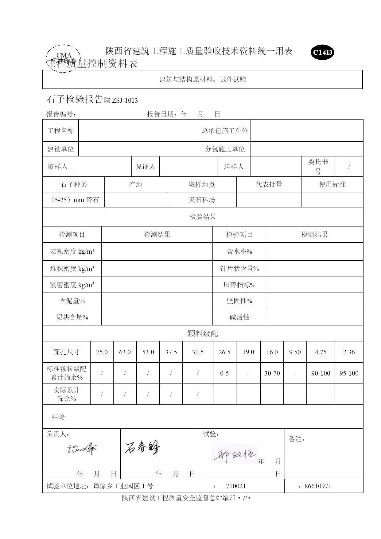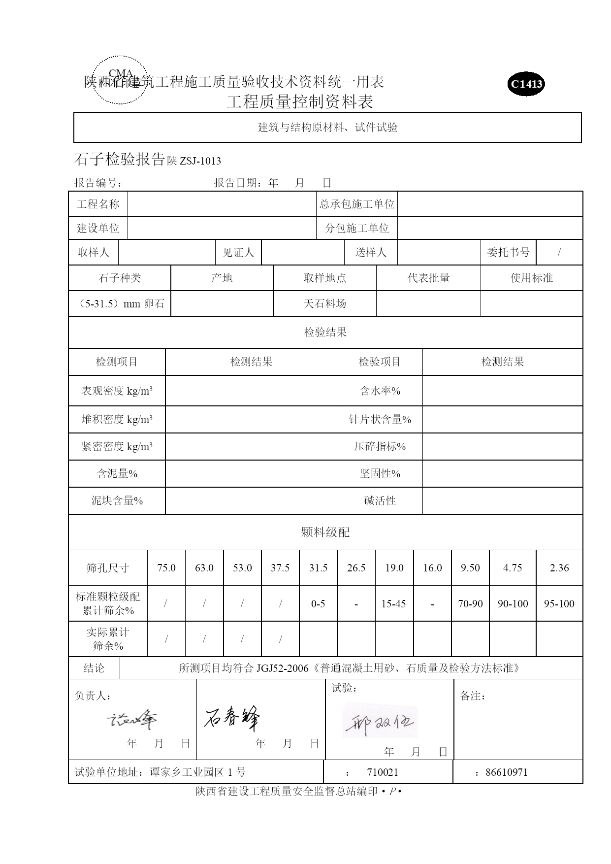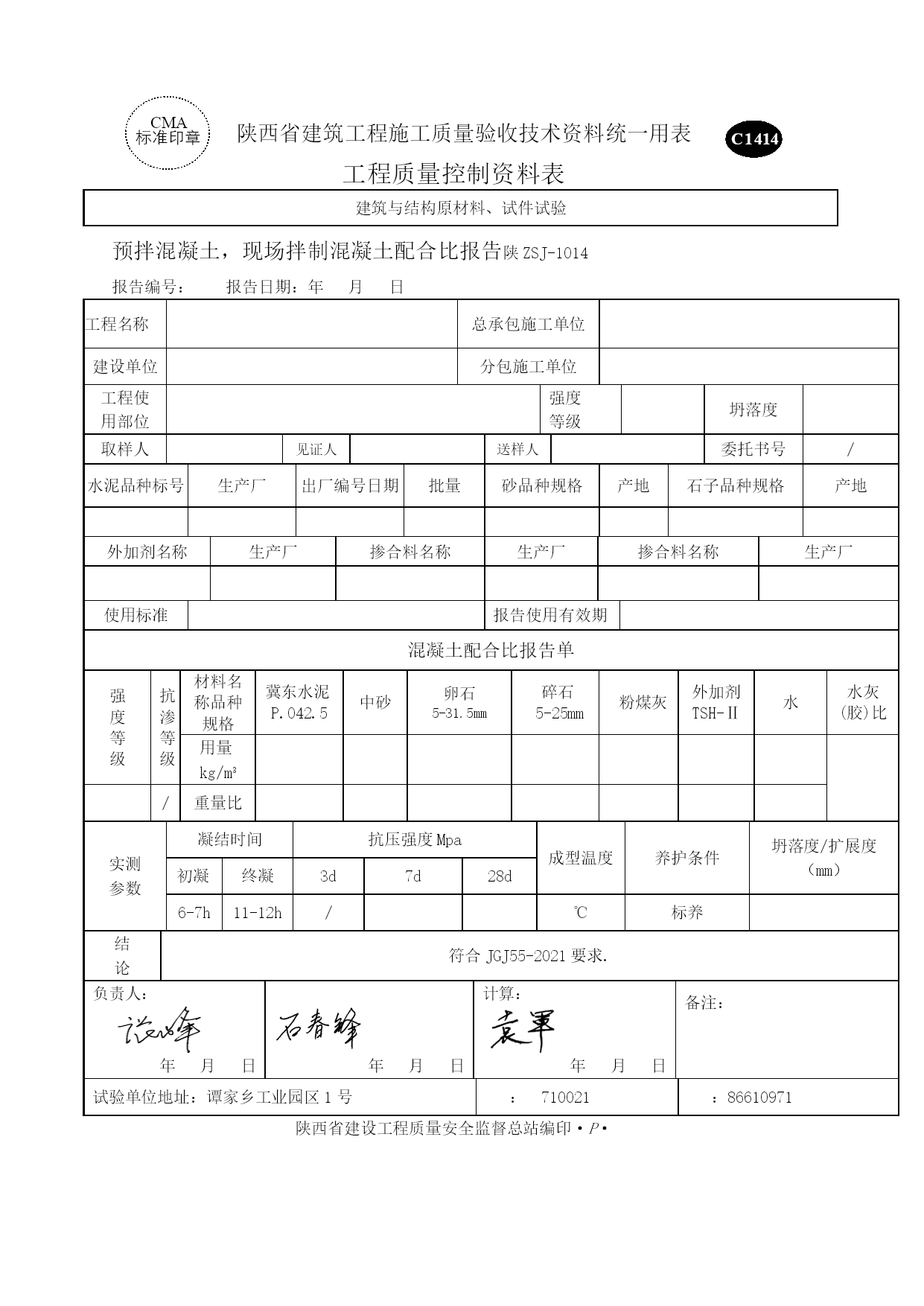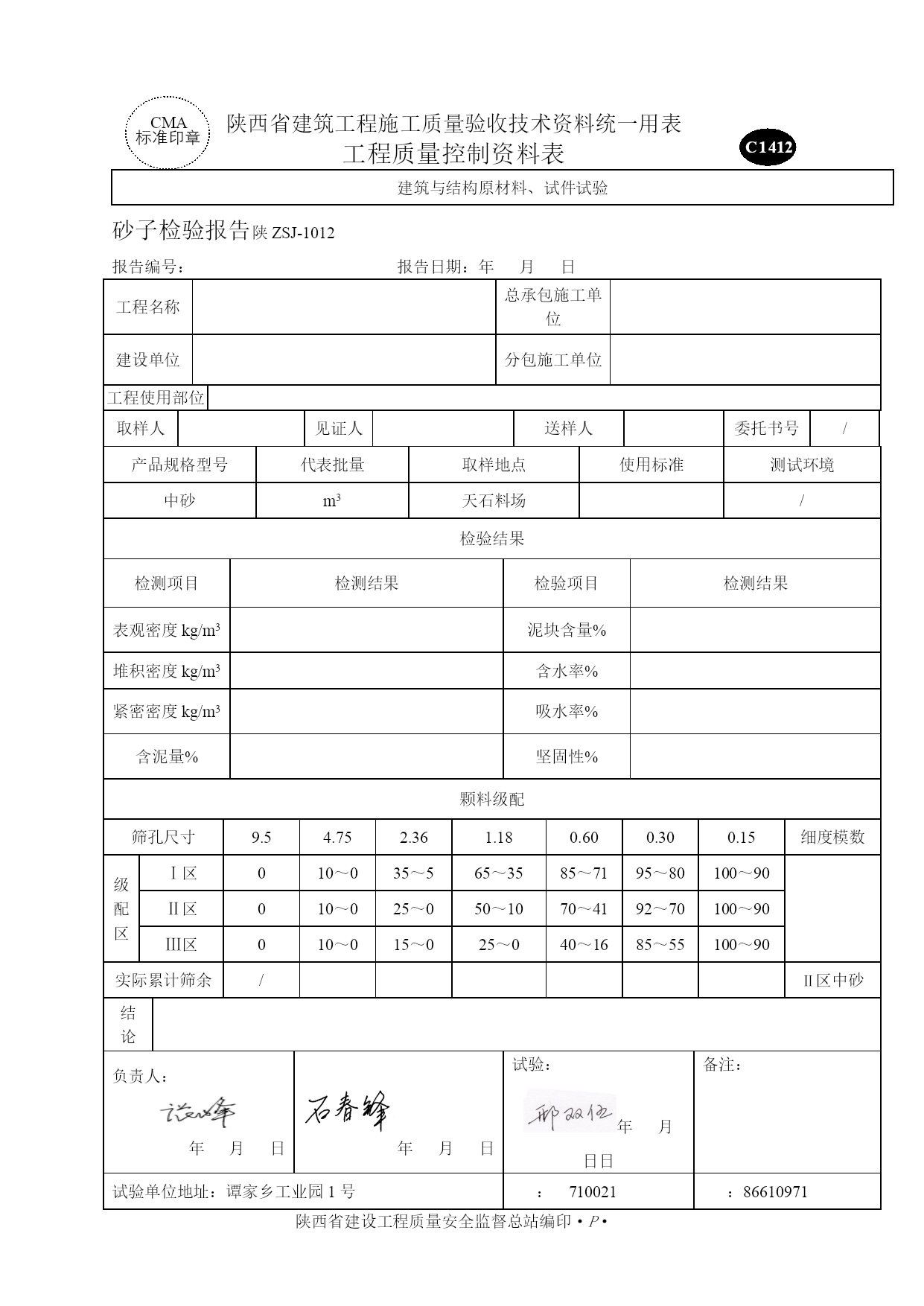 商混资料表格优质资料(可以直接使用,可编辑优质资料,欢迎下载)质量控制资料工程名称:工程部位:强度等级:施工单位:陕西天石实业有限责任公司年月日C1414CMA标准印章陕西省建筑工程施工质量验收技术资料统一用表工程质量控制资料表建筑与结构原材料、试件试验预拌混凝土,现场拌制混凝土配合比报告陕ZSJ-1014报告编号:报告日期:年月日工程名称总承包施工单位建设单位分包施工单位工程使用部位强度等级坍落度取样人见证人送样人委托书号/水泥品种标号生产厂出厂编号日期批量砂品种规格产地石子品种规格产地外加剂名称生产厂掺合料名称生产厂掺合料名称生产厂使用标准报告使用有效期混凝土配合比报告单强度等级抗渗等级材料名称品种规格冀东水泥P.O42.5中砂卵石5-31.5mm碎石5-25mm粉煤灰外加剂TSH-Ⅱ水水灰(胶)比用量kg/m3/重量比实测参数凝结时间抗压强度Mpa成型温度养护条件坍落度/扩展度(mm)初凝终凝3d7d28d6-7h11-12h/℃标养结论符合JGJ55-2021要求.负责人:年月日年月日计算:年月日备注:试验单位地址:谭家乡工业园区1号:710021:86610971陕西省建设工程质量安全监督总站编印·P·C1413CMA标准印章陕西省建筑工程施工质量验收技术资料统一用表工程质量控制资料表建筑与结构原材料、试件试验石子检验报告陕ZSJ-1013报告编号:报告日期:年月日工程名称总承包施工单位建设单位分包施工单位取样人见证人送样人委托书号/石子种类产地取样地点代表批量使用标准(5-31.5)mm卵石天石料场检验结果检测项目检测结果检验项目检测结果表观密度kg/m3含水率%堆积密度kg/m3针片状含量%紧密密度kg/m3压碎指标%含泥量%坚固性%泥块含量%碱活性颗料级配筛孔尺寸75.063.053.037.531.526.519.016.09.504.752.36标准颗粒级配累计筛余%////0-5-15-45-70-9090-10095-100实际累计筛余%////结论所测项目均符合JGJ52-2006《普通混凝土用砂、石质量及检验方法标准》负责人:年月日年月日试验:年月日备注:试验单位地址:谭家乡工业园区1号:710021:86610971陕西省建设工程质量安全监督总站编印·P·CMA标准印章C1413陕西省建筑工程施工质量验收技术资料统一用表工程质量控制资料表建筑与结构原材料、试件试验石子检验报告陕ZSJ-1013报告编号:报告日期:年月日工程名称总承包施工单位建设单位分包施工单位取样人见证人送样人委托书号/石子种类产地取样地点代表批量使用标准(5-25)mm碎石天石料场检验结果检测项目检测结果检验项目检测结果表观密度kg/m3含水率%堆积密度kg/m3针片状含量%紧密密度kg/m3压碎指标%含泥量%坚固性%泥块含量%碱活性颗料级配筛孔尺寸75.063.053.037.531.526.519.016.09.504.752.36标准颗粒级配累计筛余%/////0-5-30-70-90-10095-100实际累计筛余%/////结论负责人:年月日年月日试验:年月日备注:试验单位地址:谭家乡工业园区1号:710021:86610971陕西省建设工程质量安全监督总站编印·P·CMA标准印章C1412陕西省建筑工程施工质量验收技术资料统一用表工程质量控制资料表建筑与结构原材料、试件试验砂子检验报告陕ZSJ-1012报告编号:报告日期:年月日工程名称总承包施工单位建设单位分包施工单位工程使用部位取样人见证人送样人委托书号/产品规格型号代表批量取样地点使用标准测试环境中砂m3天石料场/检验结果检测项目检测结果检验项目检测结果表观密度kg/m3泥块含量%堆积密度kg/m3含水率%紧密密度kg/m3吸水率%含泥量%坚固性%颗料级配筛孔尺寸9.54.752.361.180.600.300.15细度模数级配区Ⅰ区010~035~565~3585~7195~80100~90Ⅱ区010~025~050~1070~4192~70100~90Ⅲ区010~015~025~040~1685~55100~90实际累计筛余/Ⅱ区中砂结论负责人:年月日年月日试验:年月日日备注:试验单位地址:谭家乡工业园1号:710021:86610971陕西省建设工程质量安全监督总站编印·P·C1406CMA标准印章陕西省建筑工程施工质量验收技术资料统一用表工程质量控制资料表建筑与结构原材料、试件试验水泥复试报告陕ZSJ-1006报告编号:报告日期