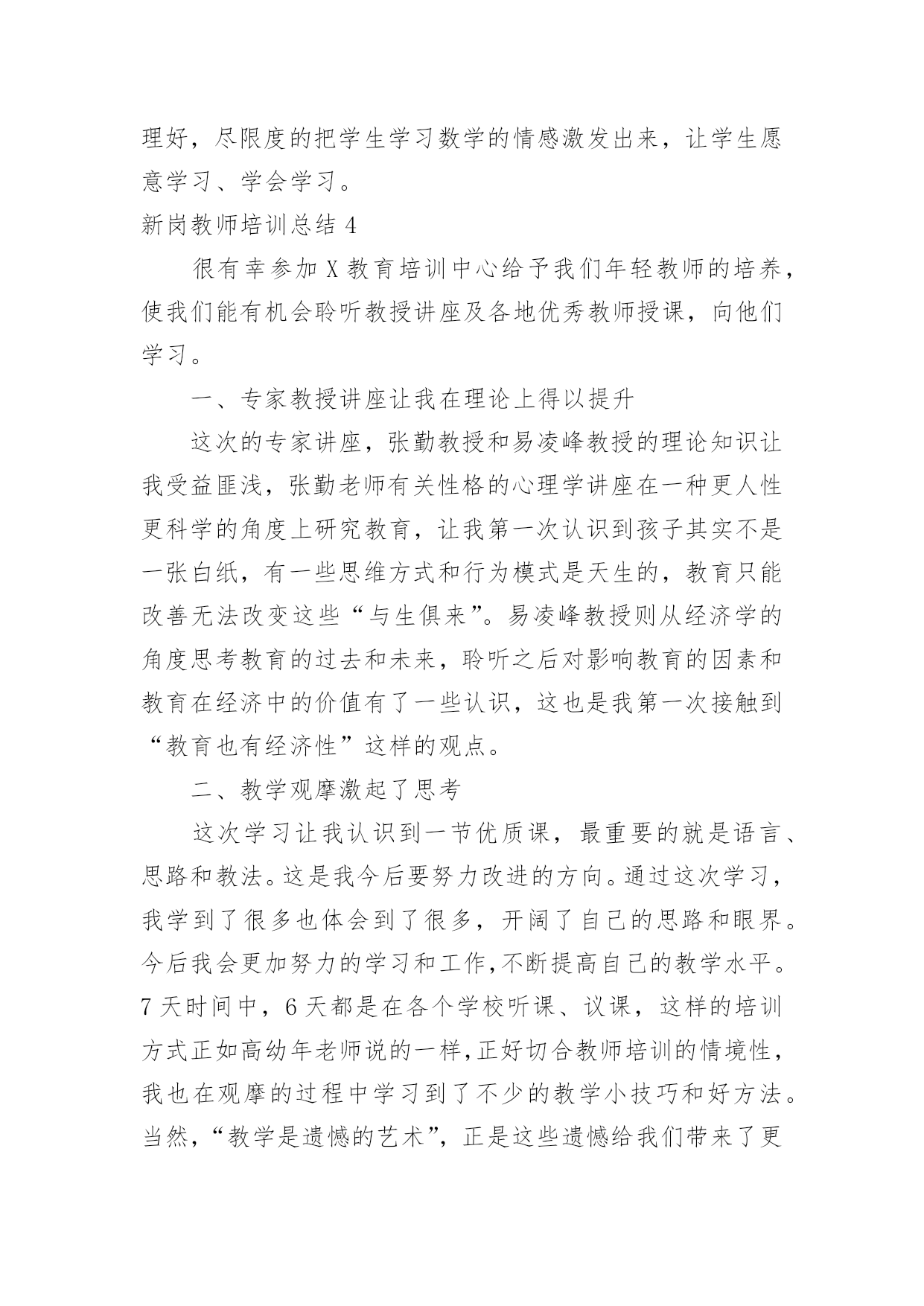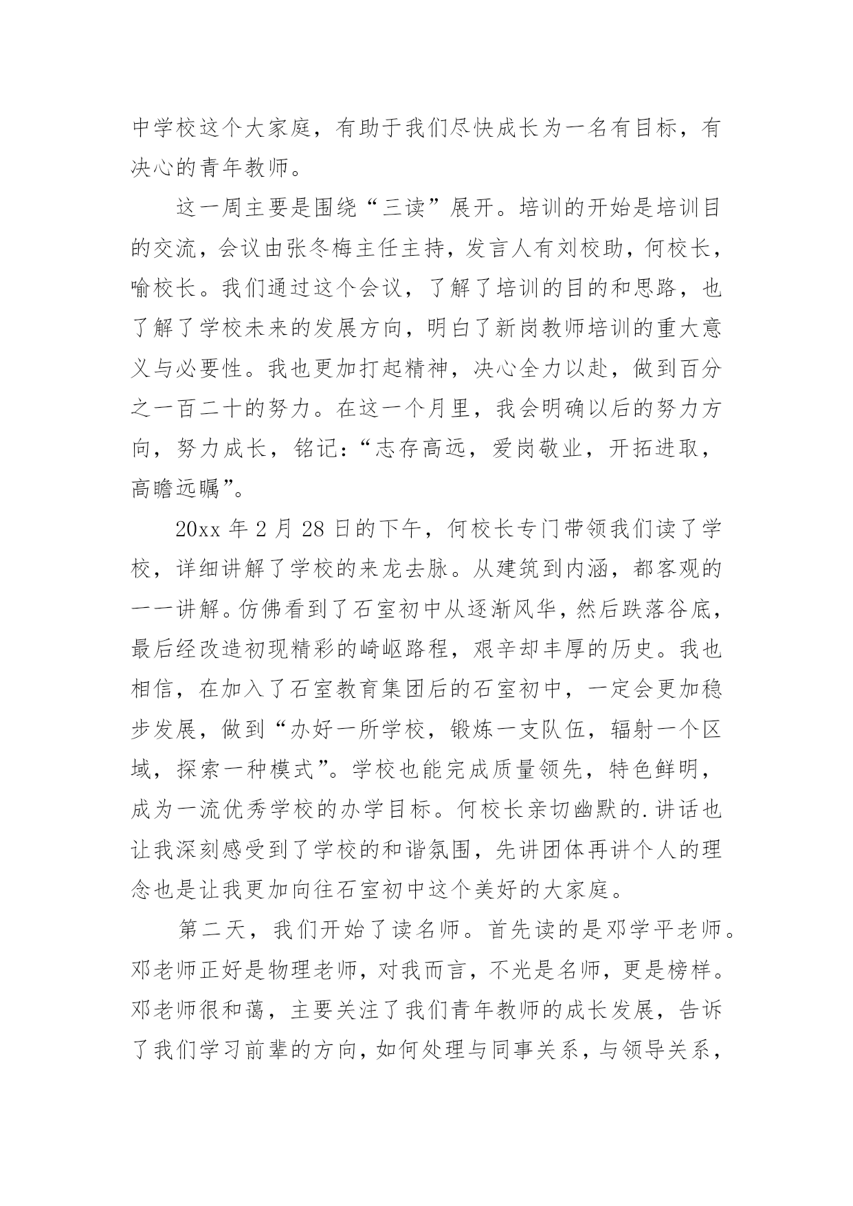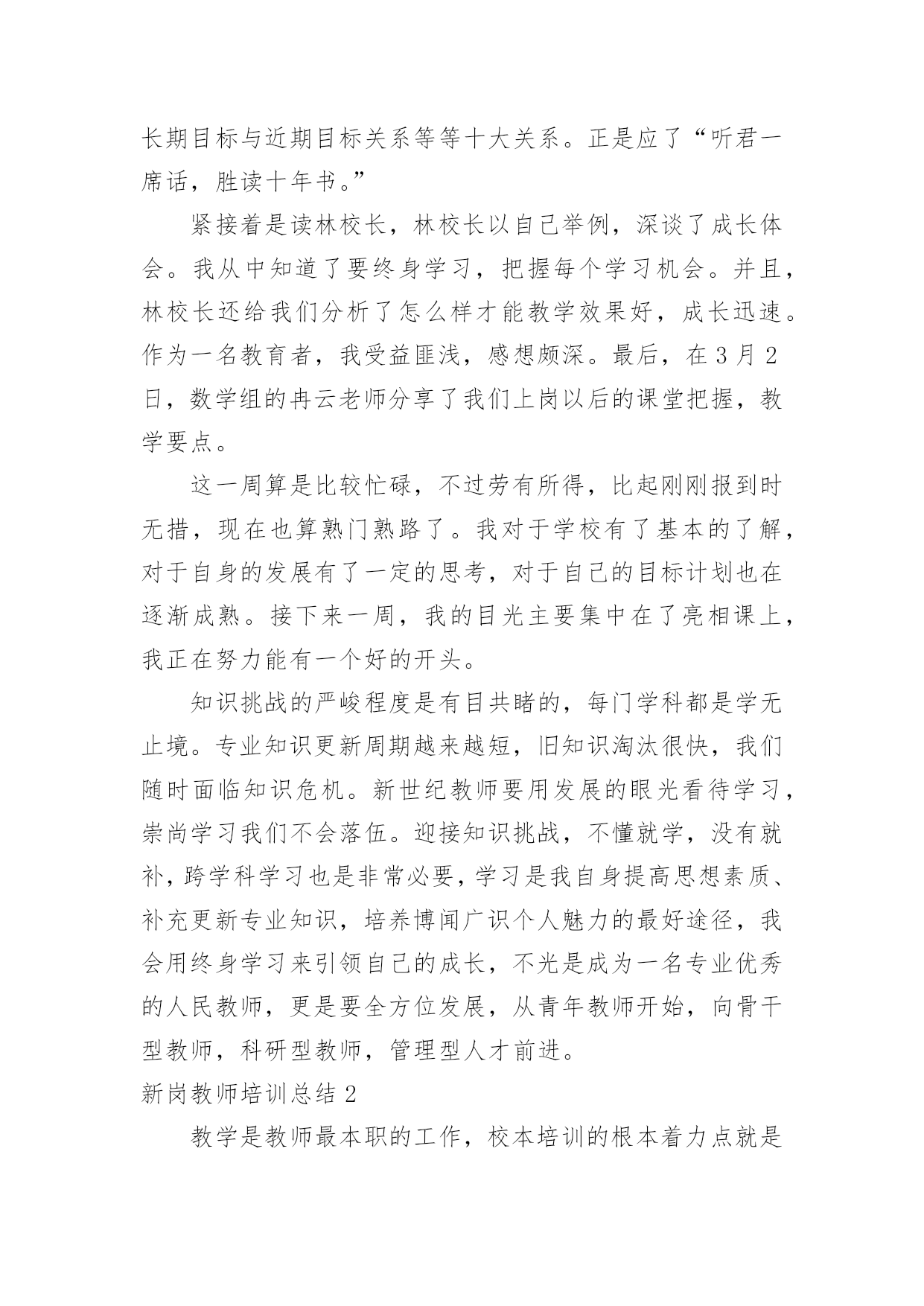 新岗教师培训总结新岗教师培训总结(通用)总结是在某一特定时间段对学习和工作生活或其完成情况,包括取得的成绩、存在的问题及得到的经验和教训加以回顾和分析的书面材料,它可以明确下一步的工作方向,少走弯路,少犯错误,提高工作效益,因此,让我们写一份总结吧。总结你想好怎么写了吗?下面是小编精心整理的新岗教师培训总结,希望对大家有所帮助。新岗教师培训总结1在寒假过后,我很荣幸的开始了石室中学初中学校组织的新岗教师培训活动。与往年不同,这次培训是专门针对新岗教师的,为我们量身定做,我们算是第一个吃螃蟹的人。原本计划的三个月计划,由于大学课程的紧张,不得已缩减成了一个月培训,这也意味着我们任务的艰巨。教师发展中心的张冬梅主任跟我们详细说明了培训计划和培训目标,最主要的就是了解学校,完成教师角色的转变。计划围绕四个“三”进行,他们分别是:三读——读成都,读学校,读名师;三看——看课堂,看教研,看教材;三写——写心得,写教案,写试题;三上——上见面课,上班会,上汇报课。纵观整个计划是非常完善的,认真完成这四个“三”,有助于我们明确学习方向,有助于我们尽快融入石室中学初中学校这个大家庭,有助于我们尽快成长为一名有目标,有决心的青年教师。这一周主要是围绕“三读”展开。培训的开始是培训目的交流,会议由张冬梅主任主持,发言人有刘校助,何校长,喻校长。我们通过这个会议,了解了培训的目的和思路,也了解了学校未来的发展方向,明白了新岗教师培训的重大意义与必要性。我也更加打起精神,决心全力以赴,做到百分之一百二十的努力。在这一个月里,我会明确以后的努力方向,努力成长,铭记:“志存高远,爱岗敬业,开拓进取,高瞻远瞩”。20xx年2月28日的下午,何校长专门带领我们读了学校,详细讲解了学校的来龙去脉。从建筑到内涵,都客观的一一讲解。仿佛看到了石室初中从逐渐风华,然后跌落谷底,最后经改造初现精彩的崎岖路程,艰辛却丰厚的历史。我也相信,在加入了石室教育集团后的石室初中,一定会更加稳步发展,做到“办好一所学校,锻炼一支队伍,辐射一个区域,探索一种模式”。学校也能完成质量领先,特色鲜明,成为一流优秀学校的办学目标。何校长亲切幽默的.讲话也让我深刻感受到了学校的和谐氛围,先讲团体再讲个人的理念也是让我更加向往石室初中这个美好的大家庭。第二天,我们开始了读名师。首先读的是邓学平老师。邓老师正好是物理老师,对我而言,不光是名师,更是榜样。邓老师很和蔼,主要关注了我们青年教师的成长发展,告诉了我们学习前辈的方向,如何处理与同事关系,与领导关系,长期目标与近期目标关系等等十大关系。正是应了“听君一席话,胜读十年书。”紧接着是读林校长,林校长以自己举例,深谈了成长体会。我从中知道了要终身学习,把握每个学习机会。并且,林校长还给我们分析了怎么样才能教学效果好,成长迅速。作为一名教育者,我受益匪浅,感想颇深。最后,在3月2日,数学组的冉云老师分享了我们上岗以后的课堂把握,教学要点。这一周算是比较忙碌,不过劳有所得,比起刚刚报到时无措,现在也算熟门熟路了。我对于学校有了基本的了解,对于自身的发展有了一定的思考,对于自己的目标计划也在逐渐成熟。接下来一周,我的目光主要集中在了亮相课上,我正在努力能有一个好的开头。知识挑战的严峻程度是有目共睹的,每门学科都是学无止境。专业知识更新周期越来越短,旧知识淘汰很快,我们随时面临知识危机。新世纪教师要用发展的眼光看待学习,崇尚学习我们不会落伍。迎接知识挑战,不懂就学,没有就补,跨学科学习也是非常必要,学习是我自身提高思想素质、补充更新专业知识,培养博闻广识个人魅力的最好途径,我会用终身学习来引领自己的成长,不光是成为一名专业优秀的人民教师,更是要全方位发展,从青年教师开始,向骨干型教师,科研型教师,管理型人才前进。新岗教师培训总结2教学是教师最本职的工作,校本培训的根本着力点就是提高受培训教师的师德素养和教育教学业务能力,为提高学校教育工作质量奠定基础。本年度,学校就教育科研能力的培养等诸多方面对我们进行了培训,在这次校本培训中,对教师的专业精神、专业态度、专业知识和能力等关系到教师专业发展的方方面面给予了全方位关注,如教师的成长目标等等。普通教师与专家的比较表明,教师的知识不仅有量与质的问题,而更重要的是结构问题——教师所需要的本体性知识、条件性知识、经验性知识和背景性知识,都是在具体的教育实践中整合,而专家致力于某方面的研究,见多识广,经验丰富,可以给我们提供迅速有效的帮助。现将我的参训体会小结如下:一、提高认识,加强责任感和紧迫感时代在不断的进步、发展,对教师也有了更高的要求,为了提高个人教学水平,我认真学习新课标,领悟新课标精神,努力做好教学工作,保质保量完成教学工作。本学年,我认真的备课、编写教案,设计适应学生的教学方法,开展的有效的教学