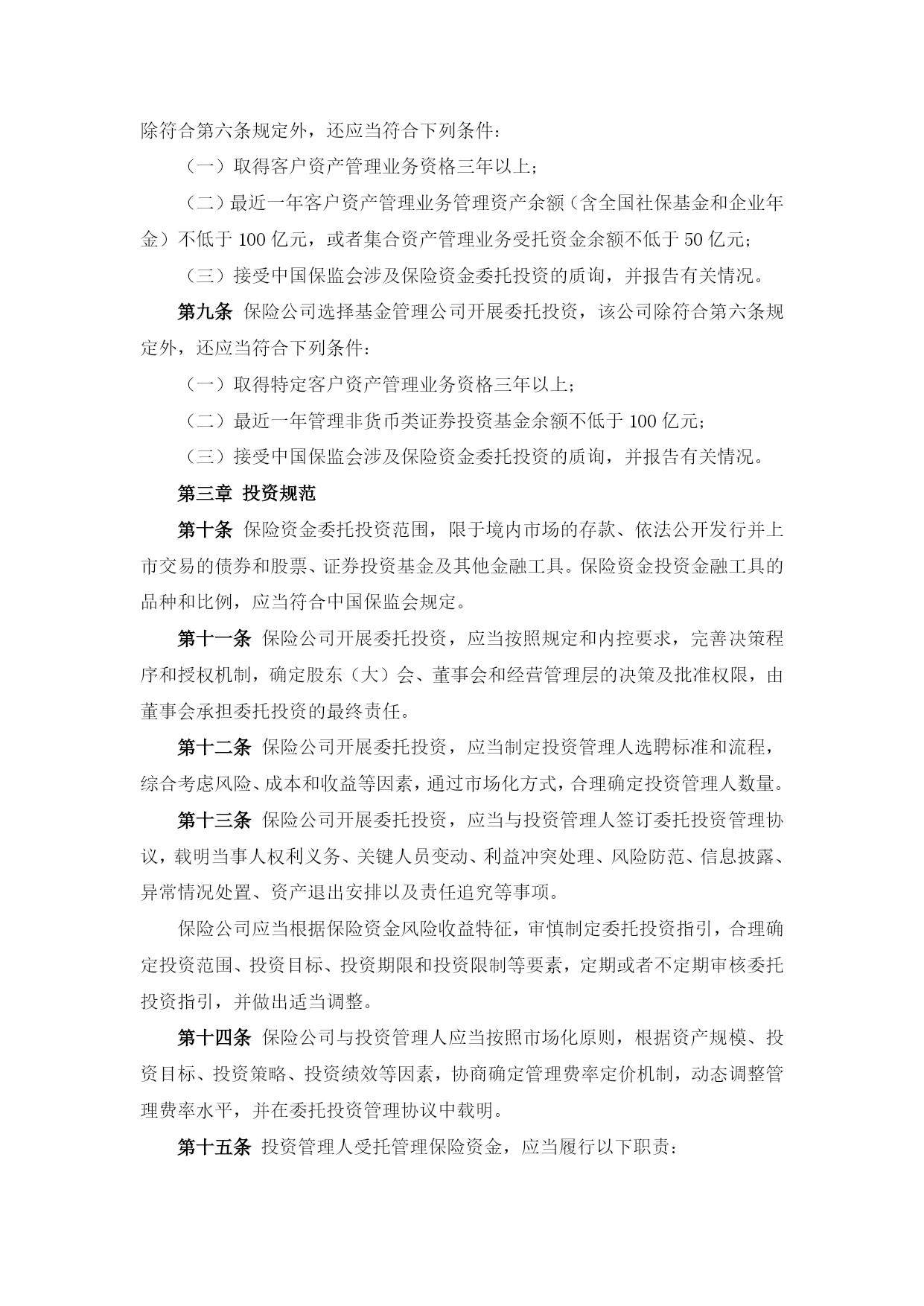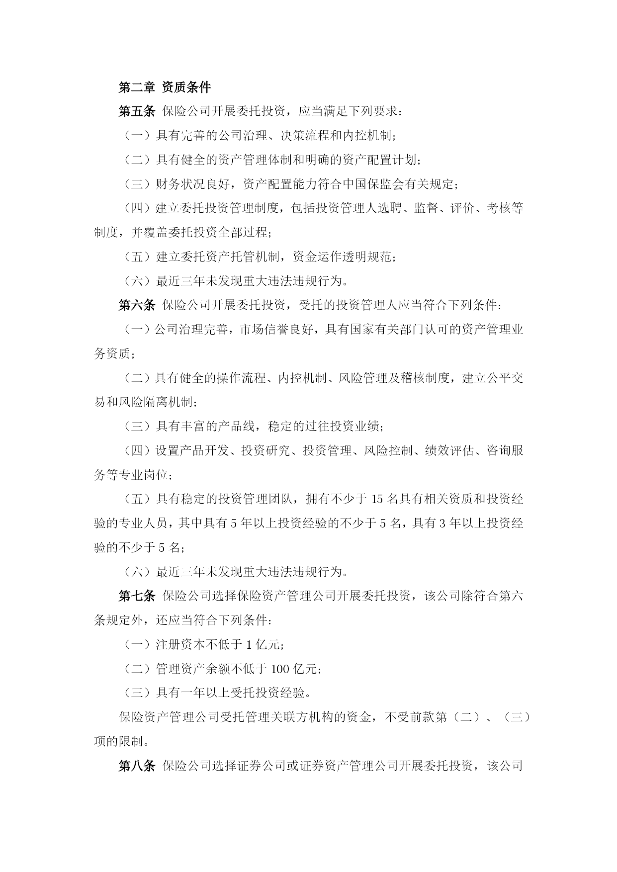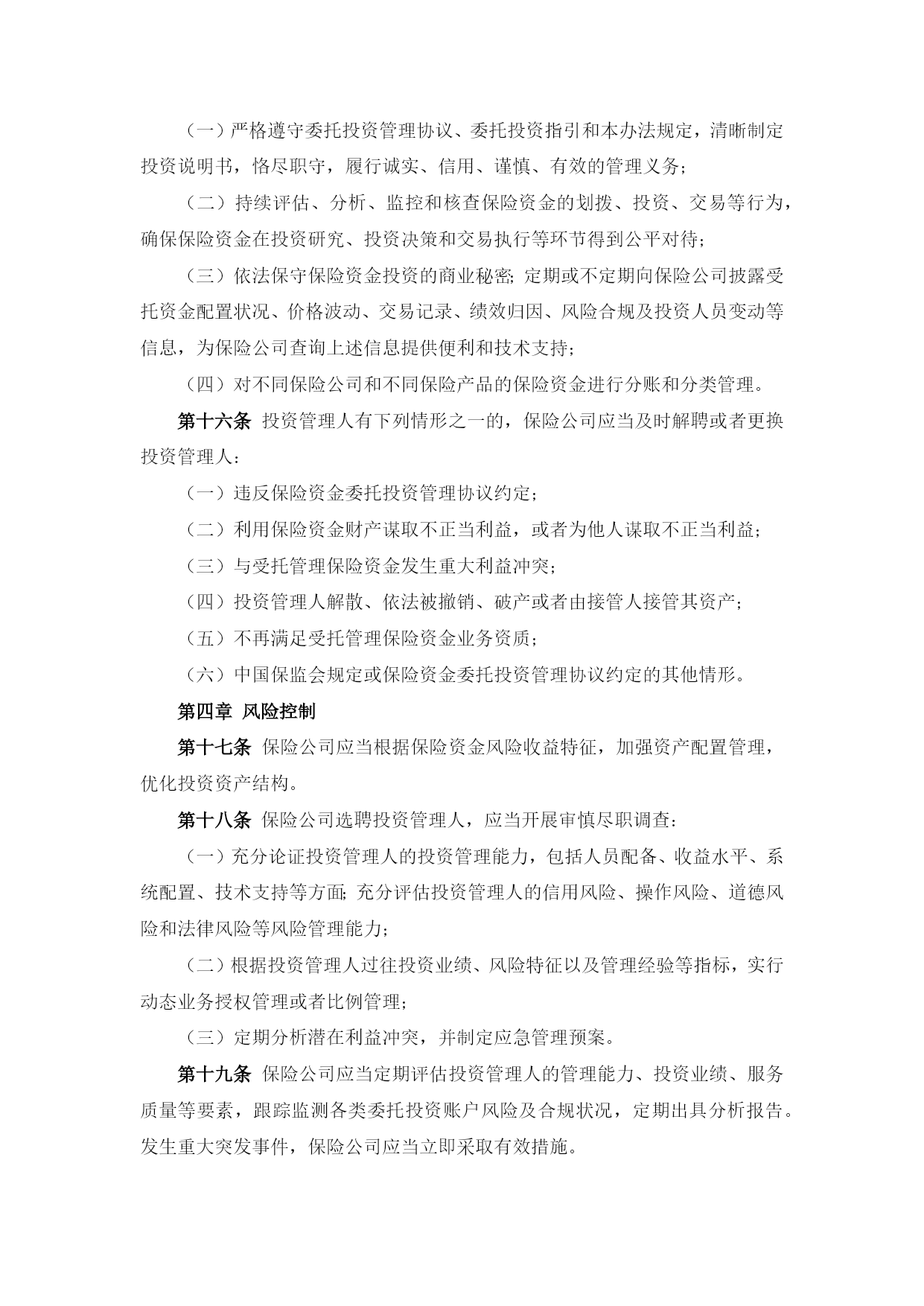 附件3.中国保监会近日发布《保险资金委托投资管理暂行办法》(以下简称《委托办法》),允许保险资金委托证券公司和基金公司进行投资管理,规范投资管理行为,维护保险当事人合法权益。2003年以来,经国务院批准,保监会按照集中化和专业化原则,推动建立保险资产管理公司,形成了保险公司自主投资和资产管理公司受托投资相结合的管理模式,有力地支撑了保险业的平稳健康发展,确保全行业在投资渠道快速开放、资本市场大幅波动、金融危机深化蔓延的情况下,严控了各类风险,实现了较好收益。当前,大部分中小保险公司保险业务发展较快,投资能力相对不足,迫切需要选择更多的风控好、专业强的投资管理机构,为其提供资产管理服务。保监会充分评估金融市场发展状况,借鉴国际经验和国内同业做法,研究制定了《委托办法》。《委托办法》规定主要包括两个方面:一、在现行委托保险资产管理公司投资管理的基础上,增加证券公司和基金公司作为保险资金受托投资管理机构,并明确了相关资质条件;二、规定委托投资范围,主要是资本市场的债券、股票和基金等有价证券,同时办法对保险公司资产配置、持续评估、利益保护和风险控制等提出了明确要求。保监发〔2012〕60号各保险集团(控股)公司、保险公司、保险资产管理公司:为规范保险资金委托投资行为,防范投资管理风险,切实保障资产安全,维护保险当事人合法权益,我会制定了《保险资金委托投资管理暂行办法》,现印发给你们,请遵照执行。中国保险监督管理委员会二○一二年七月十六日保险资金委托投资管理暂行办法第一章总则第一条为规范保险资金委托投资行为,防范投资管理风险,切实保障资产安全,维护保险当事人合法权益,根据《中华人民共和国保险法》、《中华人民共和国合同法》、《保险资金运用管理暂行办法》等法律法规,制定本办法。第二条中国境内依法设立的保险集团(控股)公司和保险公司(以下统称保险公司),将保险资金委托给符合条件的投资管理人,开展定向资产管理、专项资产管理或者特定客户资产管理等投资业务,适用本办法。本办法所称投资管理人,是指在中国境内依法设立的,符合中国保险监督管理委员会(以下简称中国保监会)规定的保险资产管理公司、证券公司、证券资产管理公司、证券投资基金管理公司及其子公司(以下简称基金管理公司)等专业投资管理机构。第三条保险公司开展保险资金委托投资,应当建立资产托管机制,并按照本办法规定选择投资管理人。保险公司委托投资资金及其运用形成的财产,应当独立于投资管理人、托管人的固有财产及其管理的其他财产。投资管理人因投资、管理或者处分保险资金取得的财产和收益,应当归入委托投资资产。相关机构不得对受托投资的保险资金采取强制措施。第四条中国保监会负责制定保险资金委托投资的政策规定,依法对委托投资和受托投资等行为实施监督管理。第二章资质条件第五条保险公司开展委托投资,应当满足下列要求:(一)具有完善的公司治理、决策流程和内控机制;(二)具有健全的资产管理体制和明确的资产配置计划;(三)财务状况良好,资产配置能力符合中国保监会有关规定;(四)建立委托投资管理制度,包括投资管理人选聘、监督、评价、考核等制度,并覆盖委托投资全部过程;(五)建立委托资产托管机制,资金运作透明规范;(六)最近三年未发现重大违法违规行为。第六条保险公司开展委托投资,受托的投资管理人应当符合下列条件:(一)公司治理完善,市场信誉良好,具有国家有关部门认可的资产管理业务资质;(二)具有健全的操作流程、内控机制、风险管理及稽核制度,建立公平交易和风险隔离机制;(三)具有丰富的产品线,稳定的过往投资业绩;(四)设置产品开发、投资研究、投资管理、风险控制、绩效评估、咨询服务等专业岗位;(五)具有稳定的投资管理团队,拥有不少于15名具有相关资质和投资经验的专业人员,其中具有5年以上投资经验的不少于5名,具有3年以上投资经验的不少于5名;(六)最近三年未发现重大违法违规行为。第七条保险公司选择保险资产管理公司开展委托投资,该公司除符合第六条规定外,还应当符合下列条件:(一)注册资本不低于1亿元;(二)管理资产余额不低于100亿元;(三)具有一年以上受托投资经验。保险资产管理公司受托管理关联方机构的资金,不受前款第(二)、(三)项的限制。第八条保险公司选择证券公司或证券资产管理公司开展委托投资,该公司除符合第六条规定外,还应当符合下列条件:(一)取得客户资产管理业务资格三年以上;(二)最近一年客户资产管理业务管理资产余额(含全国社保基金和企业年金)不低于100亿元,或者集合资产管理业务受托资金余额不低于50亿元;(三)接受中国保监会涉及保险资金委托投资的质询,并报告有关情况。第九条保险公司选择基金管理公司开展委托投资,该公