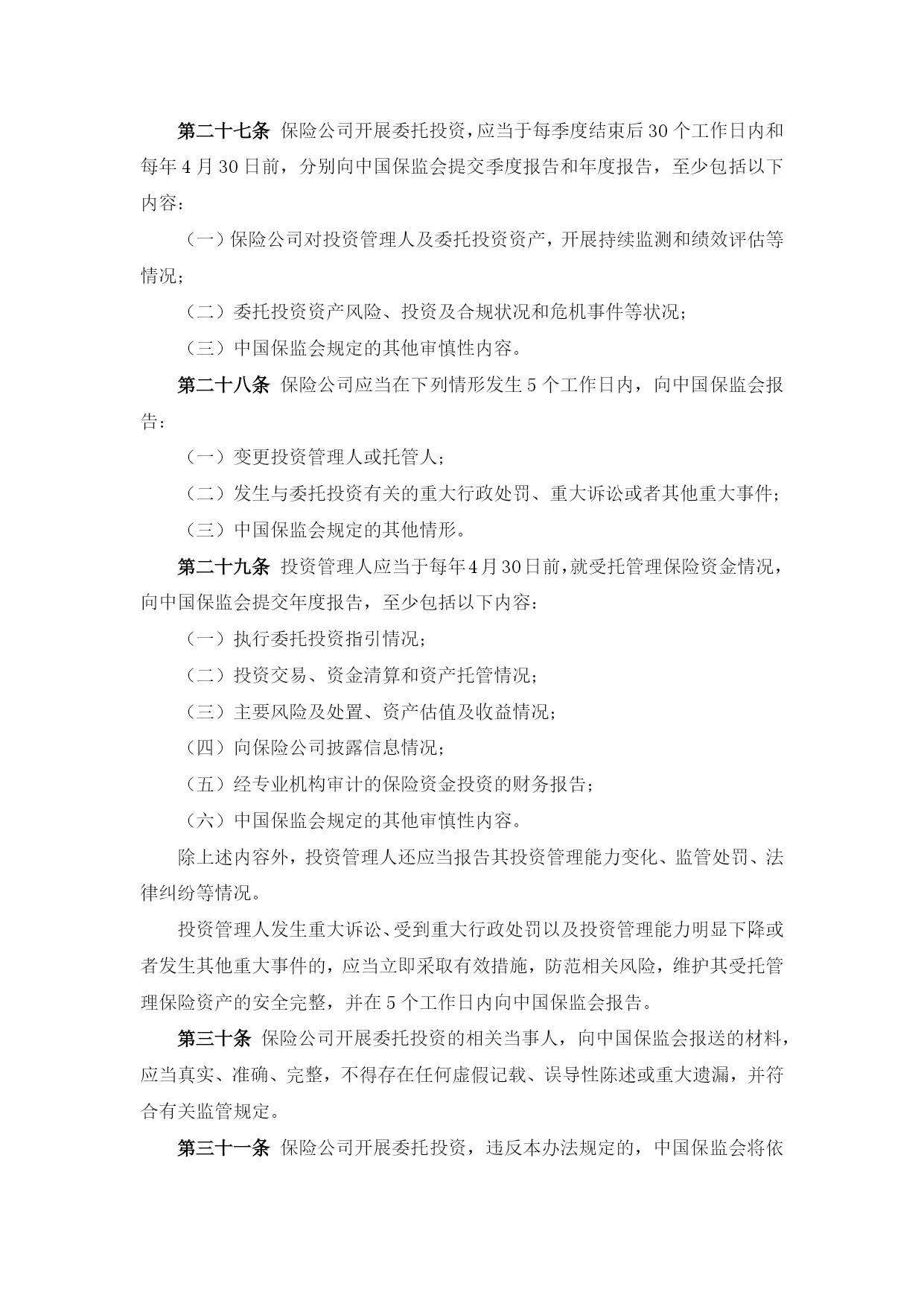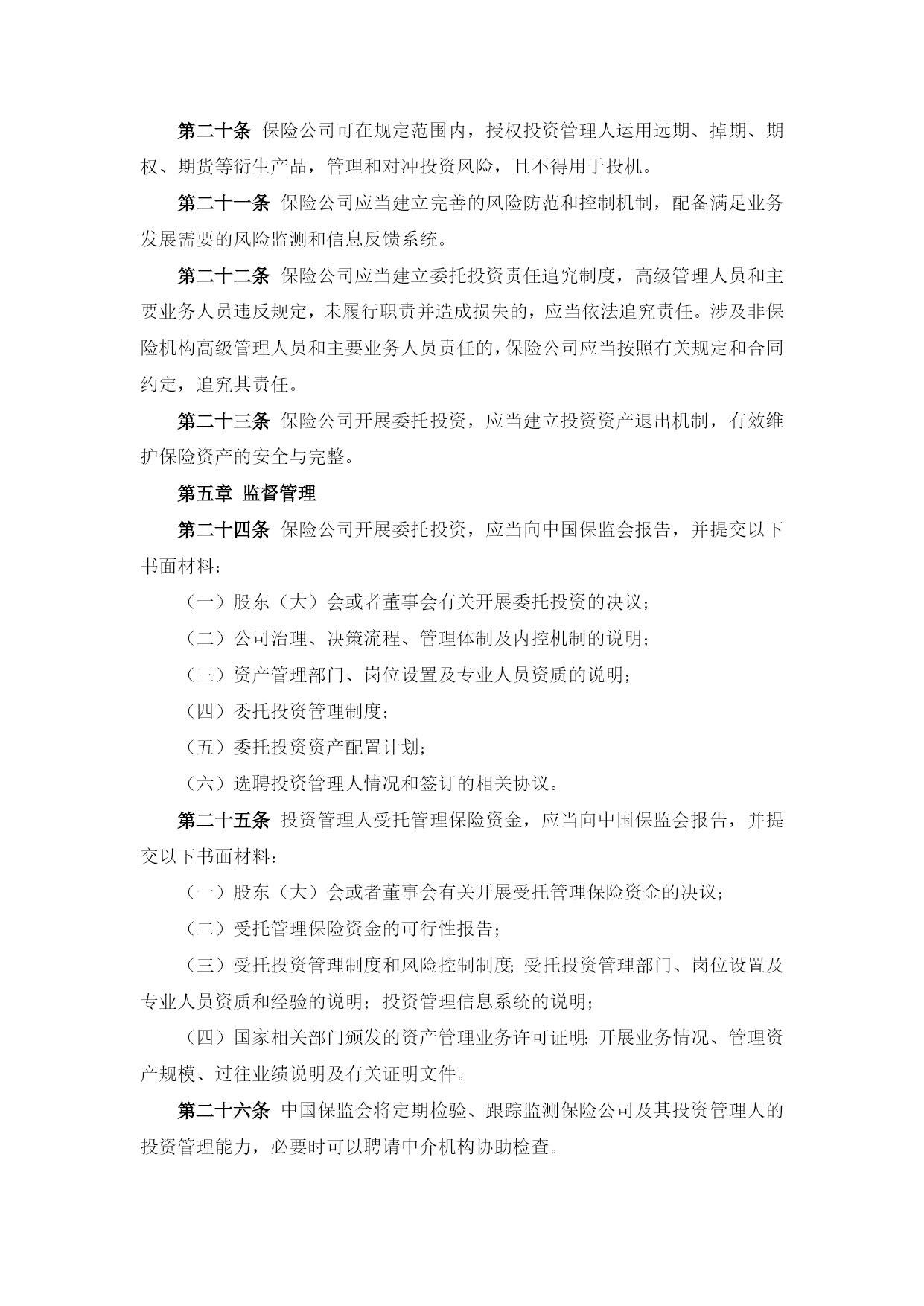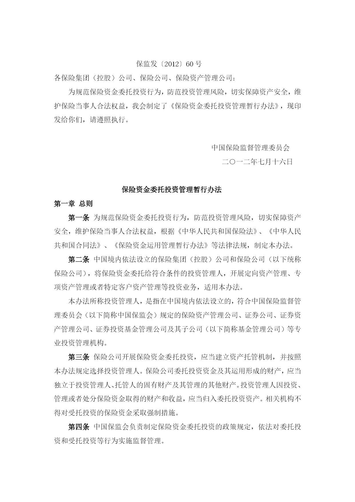 附件3.中国保监会近日发布《保险资金委托投资管理暂行办法》(以下简称《委托办法》),允许保险资金委托证券公司和基金公司进行投资管理,规范投资管理行为,维护保险当事人合法权益。2003年以来,经国务院批准,保监会按照集中化和专业化原则,推动建立保险资产管理公司,形成了保险公司自主投资和资产管理公司受托投资相结合的管理模式,有力地支撑了保险业的平稳健康发展,确保全行业在投资渠道快速开放、资本市场大幅波动、金融危机深化蔓延的情况下,严控了各类风险,实现了较好收益。当前,大部分中小保险公司保险业务发展较快,投资能力相对不足,迫切需要选择更多的风控好、专业强的投资管理机构,为其提供资产管理服务。保监会充分评估金融市场发展状况,借鉴国际经验和国内同业做法,研究制定了《委托办法》。《委托办法》规定主要包括两个方面:一、在现行委托保险资产管理公司投资管理的基础上,增加证券公司和基金公司作为保险资金受托投资管理机构,并明确了相关资质条件;二、规定委托投资范围,主要是资本市场的债券、股票和基金等有价证券,同时办法对保险公司资产配置、持续评估、利益保护和风险控制等提出了明确要求。保监发〔2012〕60号各保险集团(控股)公司、保险公司、保险资产管理公司:为规范保险资金委托投资行为,防范投资管理风险,切实保障资产安全,维护保险当事人合法权益,我会制定了《保险资金委托投资管理暂行办法》,现印发给你们,请遵照执行。中国保险监督管理委员会二○一二年七月十六日保险资金委托投资管理暂行办法第一章总则第一条为规范保险资金委托投资行为,防范投资管理风险,切实保障资产安全,维护保险当事人合法权益,根据《中华人民共和国保险法》、《中华人民共和国合同法》、《保险资金运用管理暂行办法》等法律法规,制定本办法。第二条中国境内依法设立的保险集团(控股)公司和保险公司(以下统称保险公司),将保险资金委托给符合条件的投资管理人,开展定向资产管理、专项资产管理或者特定客户资产管理等投资业务,适用本办法。本办法所称投资管理人,是指在中国境内依法设立的,符合中国保险监督管理委员会(以下简称中国保监会)规定的保险资产管理公司、证券公司、证券资产管理公司、证券投资基金管理公司及其子公司(以下简称基金管理公司)等专业投资管理机构。第三条保险公司开展保险资金委托投资,应当建立资产托管机制,并按照本办法规定选择投资管理人。保险公司委托投资资金及其运用形成的财产,应当独立于投资管理人、托管人的固有财产及其管理的其他财产。投资管理人因投资、管理或者处分保险资金取得的财产和收益,应当归入委托投资资产。相关机构不得对受托投资的保险资金采取强制措施。第四条中国保监会负责制定保险资金委托投资的政策规定,依法对委托投资和受托投资等行为实施监督管理。第二章资质条件第五条保险公司开展委托投资,应当满足下列要求:(一)具有完善的公司治理、决策流程和内控机制;(二)具有健全的资产管理体制和明确的资产配置计划;(三)财务状况良好,资产配置能力符合中国保监会有关规定;(四)建立委托投资管理制度,包括投资管理人选聘、监督、评价、考核等制度,并覆盖委托投资全部过程;(五)建立委托资产托管机制,资金运作透明规范;(六)最近三年未发现重大违法违规行为。第六条保险公司开展委托投资,受托的投资管理人应当符合下列条件:(一)公司治理完善,市场信誉良好,具有国家有关部门认可的资产管理业务资质;(二)具有健全的操作流程、内控机制、风险管理及稽核制度,建立公平交易和风险隔离机制;(三)具有丰富的产品线,稳定的过往投资业绩;(四)设置产品开发、投资研究、投资管理、风险控制、绩效评估、咨询服务等专业岗位;(五)具有稳定的投资管理团队,拥有不少于15名具有相关资质和投资经验的专业人员,其中具有5年以上投资经验的不少于5名,具有3年以上投资经验的不少于5名;(六)最近三年未发现重大违法违规行为。第七条保险公司选择保险资产管理公司开展委托投资,该公司除符合第六条规定外,还应当符合下列条件:(一)注册资本不低于1亿元;(二)管理资产余额不低于100亿元;(三)具有一年以上受托投资经验。保险资产管理公司受托管理关联方机构的资金,不受前款第(二)、(三)项的限制。第八条保险公司选择证券公司或证券资产管理公司开展委托投资,该公司除符合第六条规定外,还应当符合下列条件:(一)取得客户资产管理业务资格三年以上;(二)最近一年客户资产管理业务管理资产余额(含全国社保基金和企业年金)不低于100亿元,或者集合资产管理业务受托资金余额不低于50亿元;(三)接受中国保监会涉及保险资金委托投资的质询,并报告有关情况。第九条保险公司选择基金管理公司开展委托投资,该公