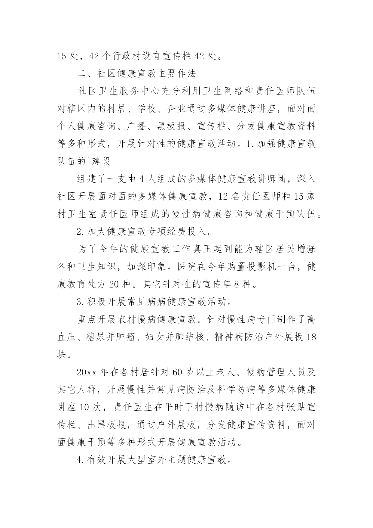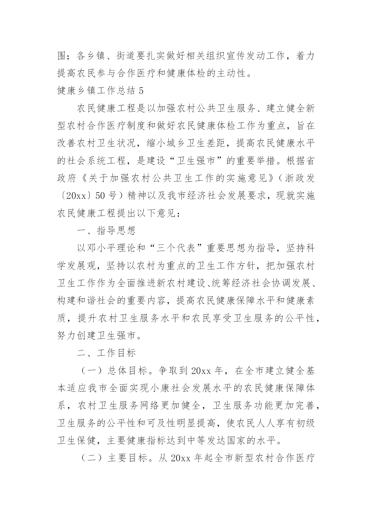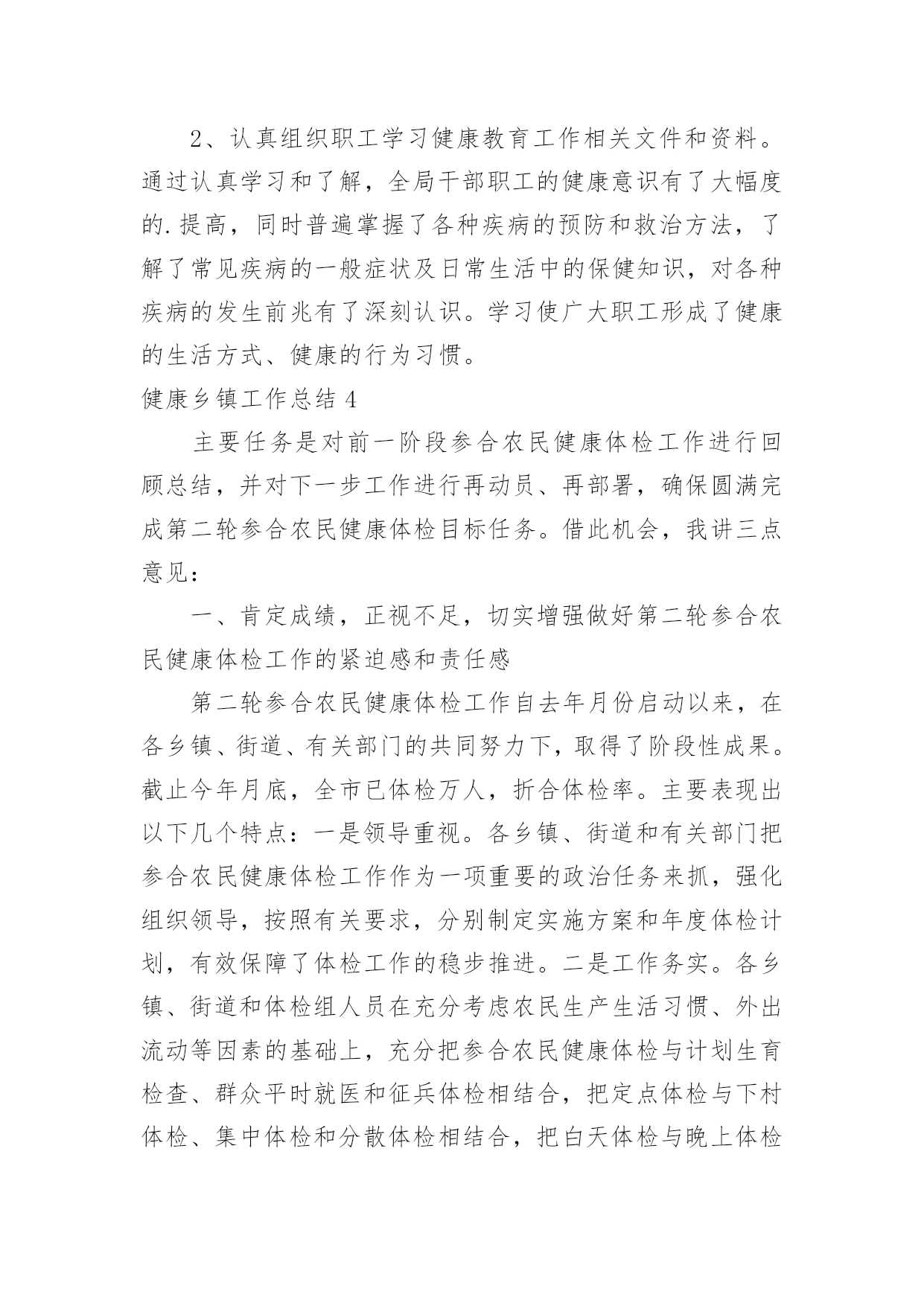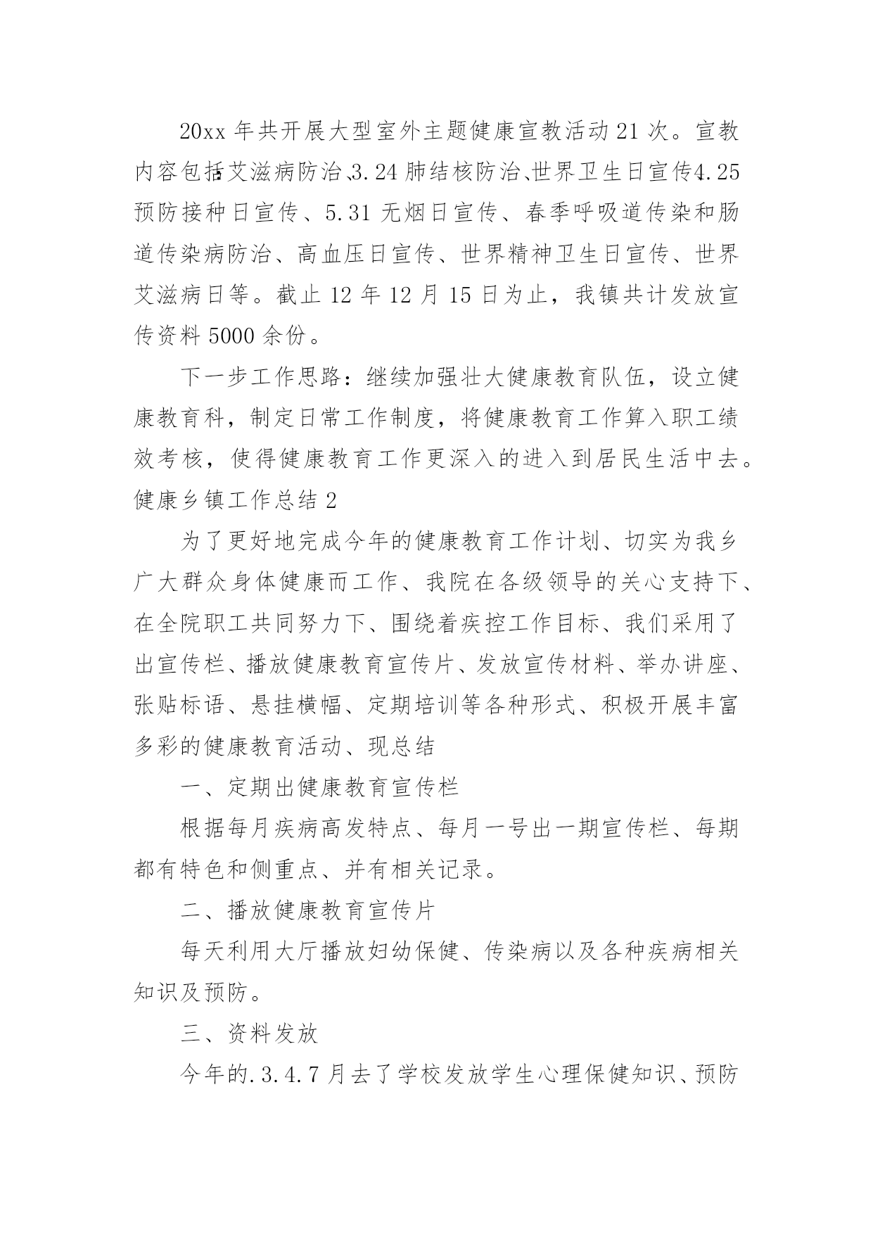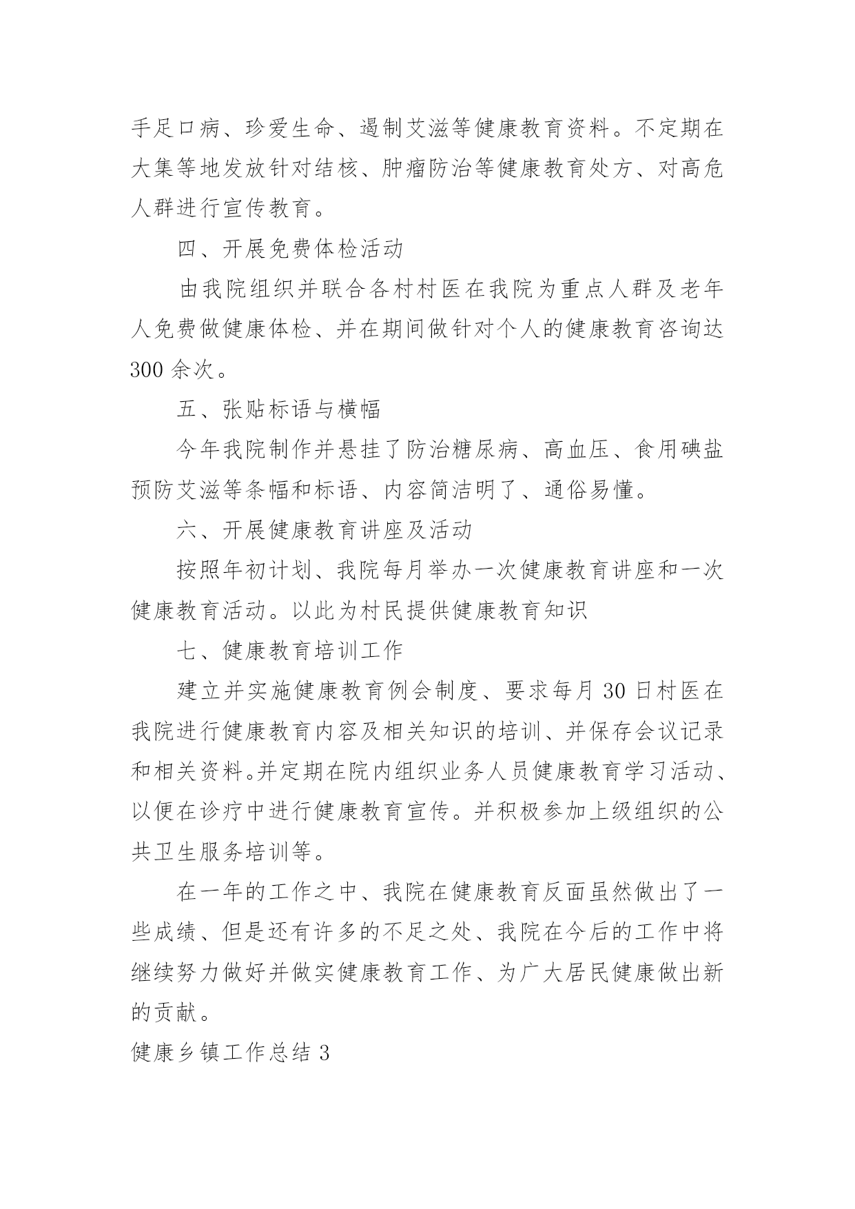 健康乡镇工作总结健康乡镇工作总结总结是在某一特定时间段对学习和工作生活或其完成情况,包括取得的成绩、存在的问题及得到的经验和教训加以回顾和分析的书面材料,它是增长才干的一种好办法,让我们来为自己写一份总结吧。总结你想好怎么写了吗?下面是小编收集整理的健康乡镇工作总结,欢迎大家借鉴与参考,希望对大家有所帮助。健康乡镇工作总结1上盘中心卫生院根据上级卫生行政部门对今年农村健康宣教的精神,院领导高度重视,制定完善的工作计划,投入部分经费,成立领导小组,由副院长分管负责,布置任务,分工明确并利用责任医生、乡村医师例会和职工业务学习会议对医疗队伍进行业务培训学习,确定公卫科和疾控站为职能科室,对辖区内的各种人群开展针对性健康宣教活动,在今年的活动中,取得了较为满意的效果,为改善辖区居民生活环境,提高生活质量,增强防病意识,逐渐缩小城乡间卫生差距,促进农村经济发展作出巨大贡献。一、健康宣教阵地建设概况我院目前有宣传栏3处,黑板报1处,2家社区卫生服务站有宣传栏2处,黑板报2处,15家村卫生室设有黑板报15处,42个行政村设有宣传栏42处。二、社区健康宣教主要作法社区卫生服务中心充分利用卫生网络和责任医师队伍对辖区内的村居、学校、企业通过多媒体健康讲座,面对面个人健康咨询、广播、黑板报、宣传栏、分发健康宣教资料等多种形式,开展针对性的健康宣教活动。1.加强健康宣教队伍的`建设组建了一支由4人组成的多媒体健康宣教讲师团,深入社区开展面对面的多媒体健康宣教,12名责任医师和15家村卫生室责任医师组成的慢性病健康咨询和健康干预队伍。2.加大健康宣教专项经费投入。为了今年的健康宣教工作真正起到能为辖区居民增强各种卫生知识,加深印象。医院在今年购置投影机一台,健康教育处方20种。其它针对性的宣传单8种。3.积极开展常见病病健康宣教活动。重点开展农村慢病健康宣教。针对慢性病专门制作了高血压、糖尿并肿瘤、妇女并肺结核、精神病防治户外展板18块。20xx年在各村居针对60岁以上老人、慢病管理人员及其它人群,开展慢性并常见病防治及科学防病等多媒体健康讲座10次,责任医生在平时下村慢病随访中在各村张贴宣传栏、出黑板报,通过户外展板,分发健康宣传资料,面对面健康干预等多种形式开展健康宣教活动。4.有效开展大型室外主题健康宣教。20xx年共开展大型室外主题健康宣教活动21次。宣教内容包括:艾滋病防治、3.24肺结核防治、世界卫生日宣传、4.25预防接种日宣传、5.31无烟日宣传、春季呼吸道传染和肠道传染病防治、高血压日宣传、世界精神卫生日宣传、世界艾滋病日等。截止12年12月15日为止,我镇共计发放宣传资料5000余份。下一步工作思路:继续加强壮大健康教育队伍,设立健康教育科,制定日常工作制度,将健康教育工作算入职工绩效考核,使得健康教育工作更深入的进入到居民生活中去。健康乡镇工作总结2为了更好地完成今年的健康教育工作计划、切实为我乡广大群众身体健康而工作、我院在各级领导的关心支持下、在全院职工共同努力下、围绕着疾控工作目标、我们采用了出宣传栏、播放健康教育宣传片、发放宣传材料、举办讲座、张贴标语、悬挂横幅、定期培训等各种形式、积极开展丰富多彩的健康教育活动、现总结一、定期出健康教育宣传栏根据每月疾病高发特点、每月一号出一期宣传栏、每期都有特色和侧重点、并有相关记录。二、播放健康教育宣传片每天利用大厅播放妇幼保健、传染病以及各种疾病相关知识及预防。三、资料发放今年的.3.4.7月去了学校发放学生心理保健知识、预防手足口病、珍爱生命、遏制艾滋等健康教育资料。不定期在大集等地发放针对结核、肿瘤防治等健康教育处方、对高危人群进行宣传教育。四、开展免费体检活动由我院组织并联合各村村医在我院为重点人群及老年人免费做健康体检、并在期间做针对个人的健康教育咨询达300余次。五、张贴标语与横幅今年我院制作并悬挂了防治糖尿病、高血压、食用碘盐预防艾滋等条幅和标语、内容简洁明了、通俗易懂。六、开展健康教育讲座及活动按照年初计划、我院每月举办一次健康教育讲座和一次健康教育活动。以此为村民提供健康教育知识七、健康教育培训工作建立并实施健康教育例会制度、要求每月30日村医在我院进行健康教育内容及相关知识的培训、并保存会议记录和相关资料。并定期在院内组织业务人员健康教育学习活动、以便在诊疗中进行健康教育宣传。并积极参加上级组织的公共卫生服务培训等。在一年的工作之中、我院在健康教育反面虽然做出了一些成绩、但是还有许多的不足之处、我院在今后的工作中将继续努力做好并做实健康教育工作、为广大居民健康做出新的贡献。健康乡镇工作总结3**年,我单位继续深化健康教育工作,切实将干部职工的健康教育工作纳入本单位的目标管理,拟定好健康教育工作计划,在干部职工中普及健康知识,使该项工作取得了良好的成绩。一、