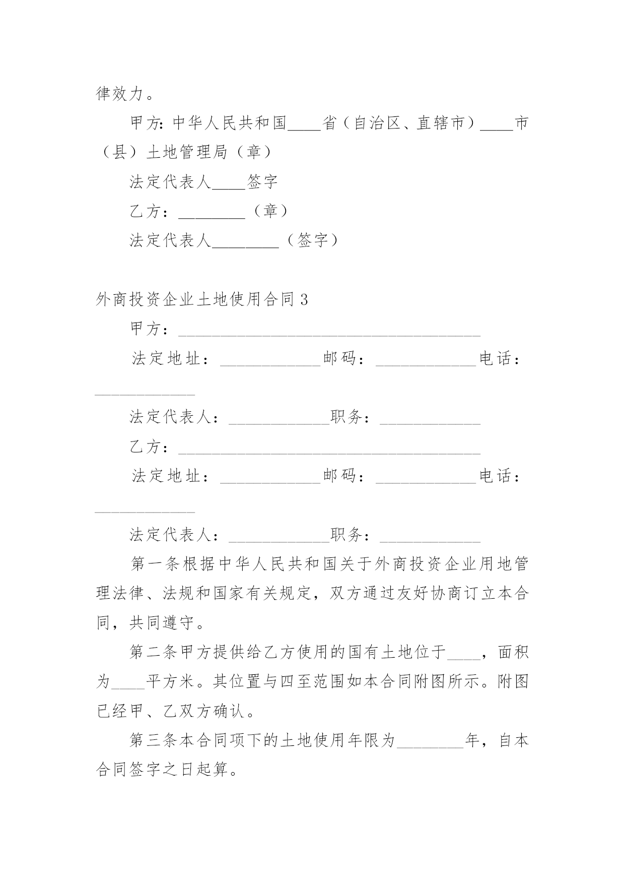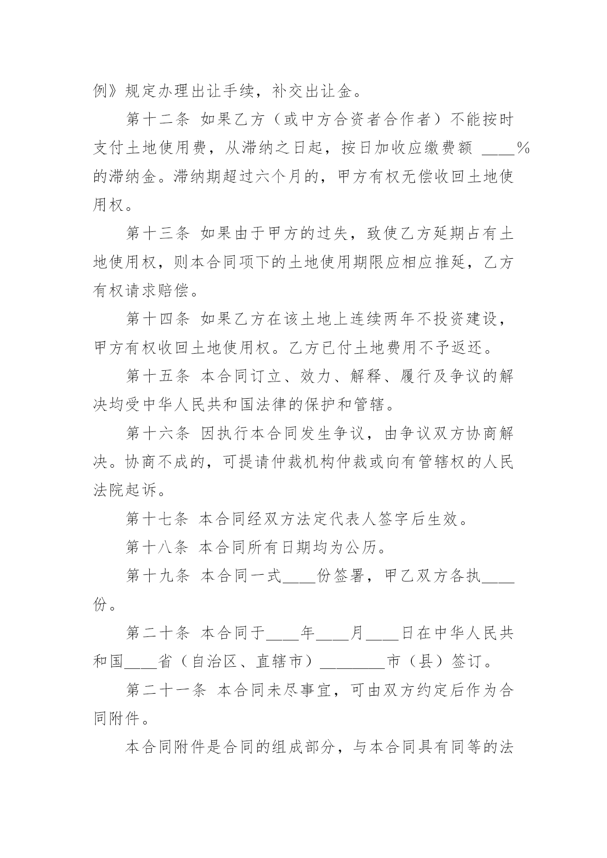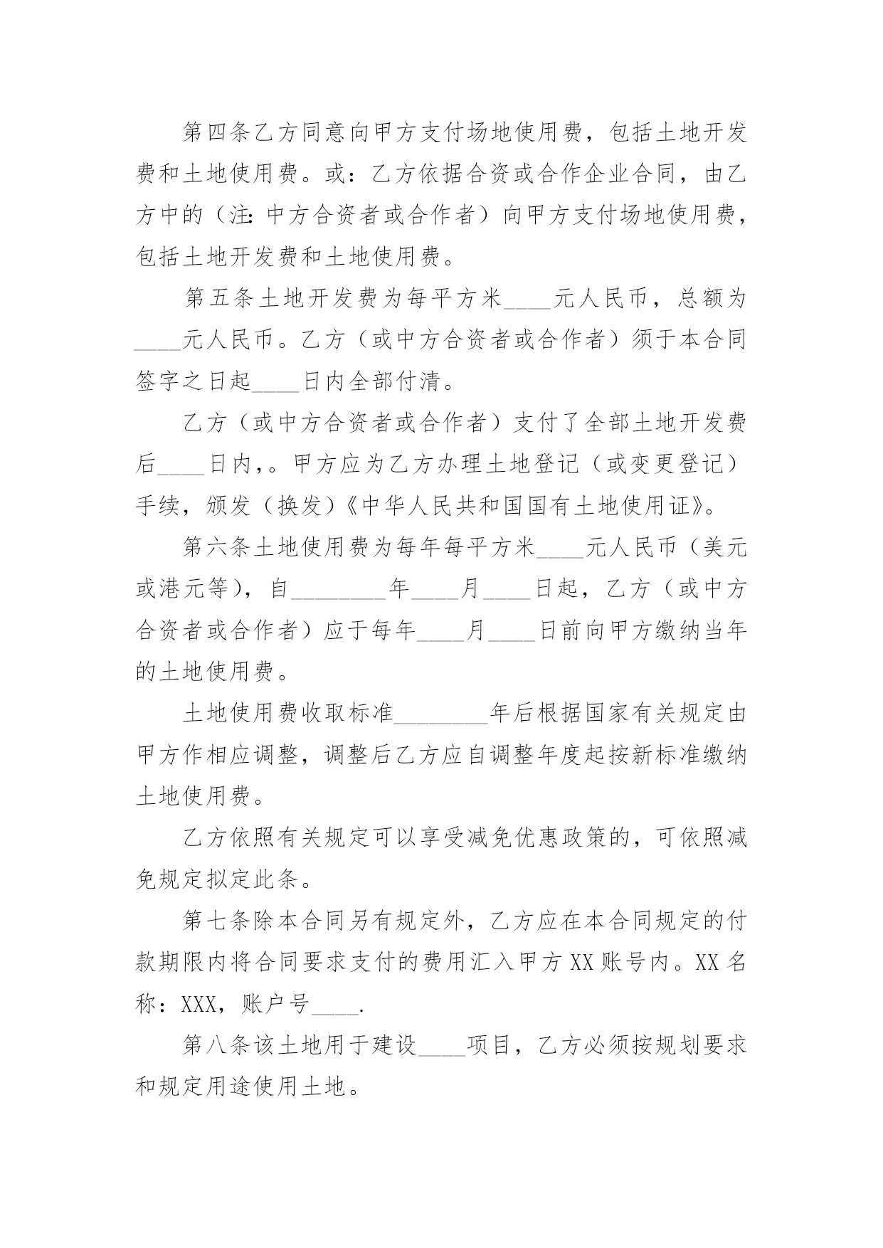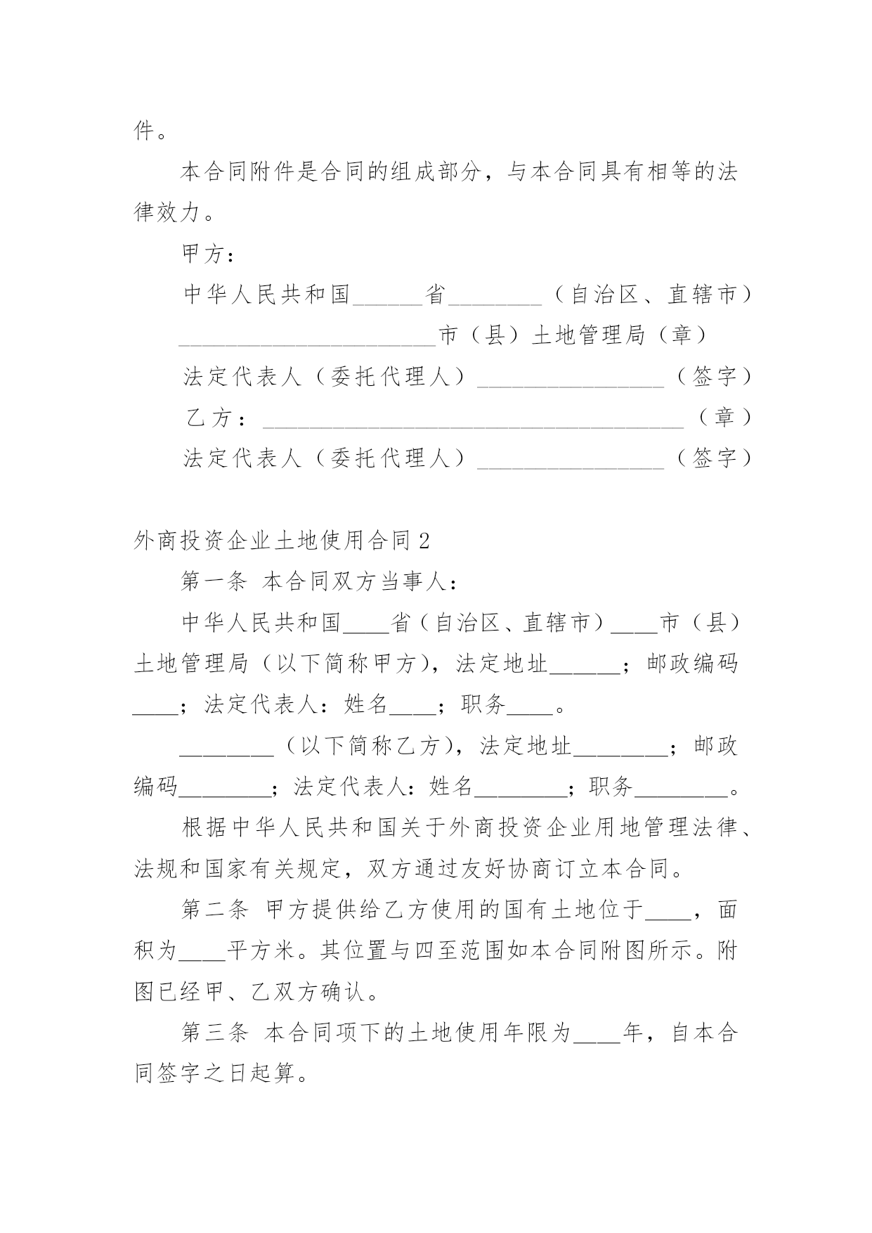 外商投资企业土地使用合同外商投资企业土地使用合同(11篇)随着时间的推移,合同起到的作用越来越大,合同是对双方的保障又是一种约束。相信很多朋友都对拟合同感到非常苦恼吧,下面是小编整理的外商投资企业土地使用合同,供大家参考借鉴,希望可以帮助到有需要的朋友。外商投资企业土地使用合同1第一条本合同双方当事人中华人民共和国________省(自治区、直辖市)________市(县)土地管理局(以下简称甲方),法人住所地________________;邮政编码______________。______________(以下简称乙方),法人住所地______________;邮政编码________________。根据中华人民共和国关于外商投资企业用地管理法律、法规和国家有关规定,双方通过友好协商订立本合同。第二条甲方提供给乙方使用的国有土地位于____________,面积为________平方米。其位置与四至范围如本合同附图所示。附图已经甲、乙双方确认。第三条本合同项下的土地使用年限为________年,自本合同签字之日起算。第四条乙方同意向甲方支付场地使用费,包括土地开发费和土地使用费。[或:第四条依据合资或合作企业合同,由乙方中的________(注:中方合资者或合作者)向甲方支付场地使用费,包括土地开发费和土地使用费。]第五条土地开发费为每平方米__________元人民币,总额为__________元人民币。乙方[或中方合资者或合作者]须于本合同签字之日起____日内全部付清。乙方(或中方合资者或合作者)支付了全部土地开发费后____日内,乙方必须申请办理土地使用(或变更登记)手续,领取(更换)《中华人民共和国国有土地使用证》。第六条土地使用费为每平方米________元人民币,自________年____月____日起,乙方(或中方合资者或合作者)应于每年____月____日前向甲方缴纳当年的土地使用费。土地使用费收取标准根据中华人民共和国[或________省(自治区、直辖市)______市(县)]有关规定五年后由甲方作相应调整,调整后乙方应自调整年度起按新标准缴纳土地使用费。[或:土地使用费在合资(或合作)作业经营期限内作调整]。(注:乙方依照有关规定可以享受减免优惠政策的,可依照减免规定拟定此条。)第七条除本合同另有规定外,乙方应在本合同规定的付款期限内将合同要求支付的费用汇入甲方银行帐号内。银行名称:______银行__________分行,帐户号________________。甲方银行帐户如有变更,应在变更后________天内以书面形式通知对方。由于甲方未及时通知此项变更而造成误期付款所引起的任何延迟收费。乙方概不承担违约责任。第八条该土地用于建设__________项目,乙方必须按规划要求和规定用途使用土地。在本合同期限内,乙方确需改变土地用途的,经甲方同意后办理变更土地用途的手续。第九条甲方同意承担该土地的征地、拆迁、界址定点具体事务,并于________年____月____日前交付土地。乙方应妥善保护界桩,不得私自改动,界桩遭受破坏或移动时,应及时书面报告当地土地管理部门,请求重新埋设,所需费用由乙方承担。[或:第九条乙方利用合资(或合作)企业中方原有场地,原有场地的界桩应由甲方重新核实。]第十条土地使用年限期满或乙方提前终止经营时,本合同同时终止履行。乙方应办理注销登记手续交还土地使用证。乙方对该土地内投资建设的建筑物、附着物有权处置,但时间不得超过________,逾期由甲方无偿取得。如乙方需继续使用该土地,须在期满六个月之前向甲方提交续期用地申请,经甲方同意后,须重新签订土地使用合同方可使用。第十一条乙方依据本合同通过划拨方式取得的土地使用权不得转让、出租、抵押。如需转让、出租、抵押,必须按《中华人民共和国城镇国有土地使用权出让和转让条例》规定办理出让手续,补交出让金。第十二条如果乙方(或中方合资者或合作者)不能按时支付土地使用费,从滞纳之日起,按日加收应缴费额______%的滞纳金。滞纳期超过六个月的,甲方有权无偿收回土地使用权。第十三条如果由于甲方的过失,致使乙方延期占有土地使用权,则本合同项下的土地使用期限应推延,乙方有权请求赔偿。第十四条如果乙方在该土地上连续两年不投资建设,甲方有权收回土地使用权。乙方已付土地费用不予返还。第十五条本合同订立、效力、解释、履行及争议的解决均受中华人民共和国法律的保护和管辖。第十六条因执行本合同发生争议,由争议双方协商解决,协商不成,双方同意向________仲裁委员会申请仲裁(当事人不在合同中约定仲裁机构,事后又没有达成书面仲裁协议的,可以向人民法院起诉)。第十七条本合同经双方法定代表人(授权委托代理人)签字后生效。第十八条本合同一式____份签署,