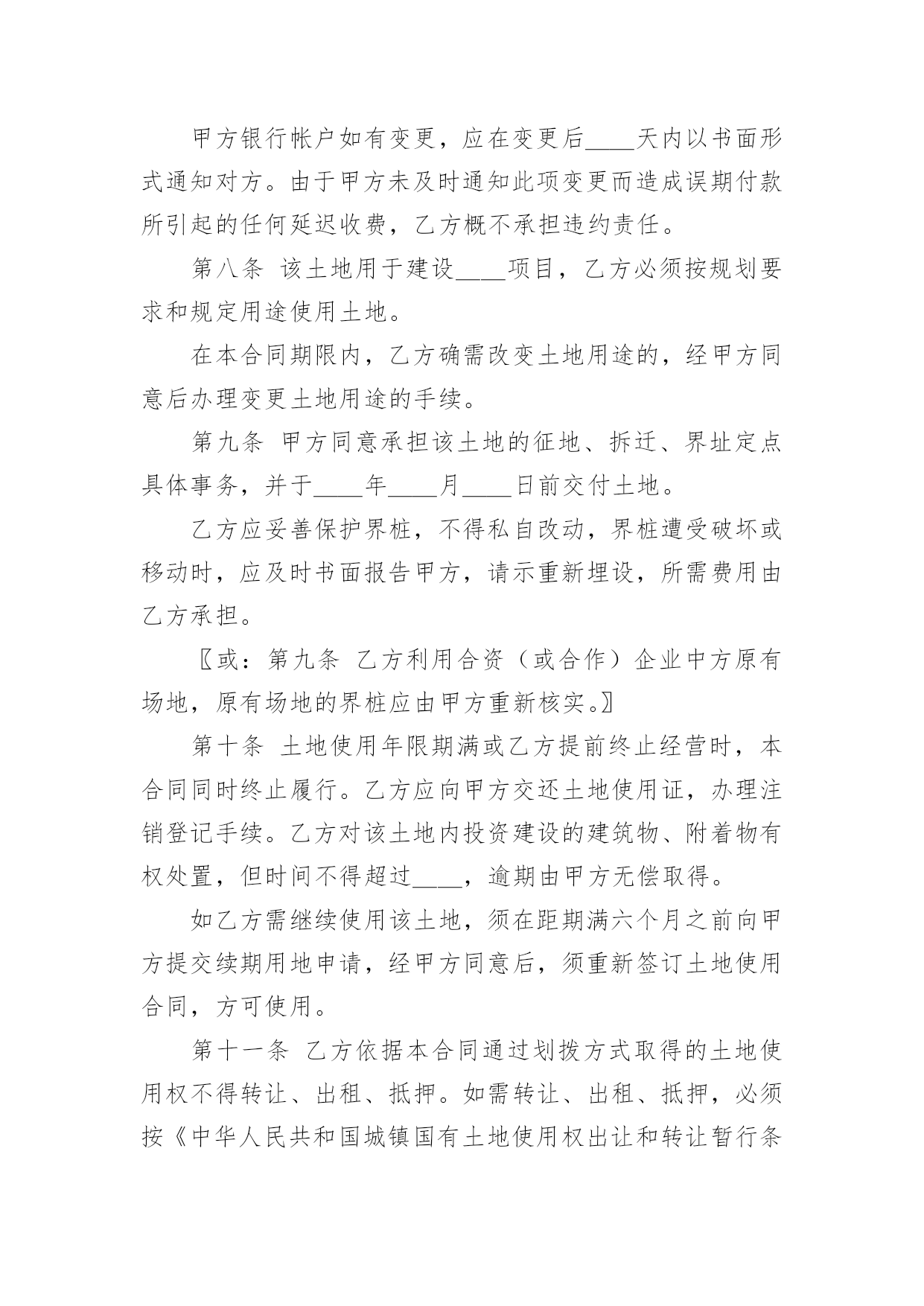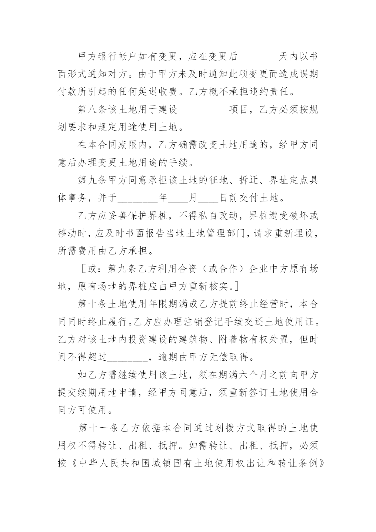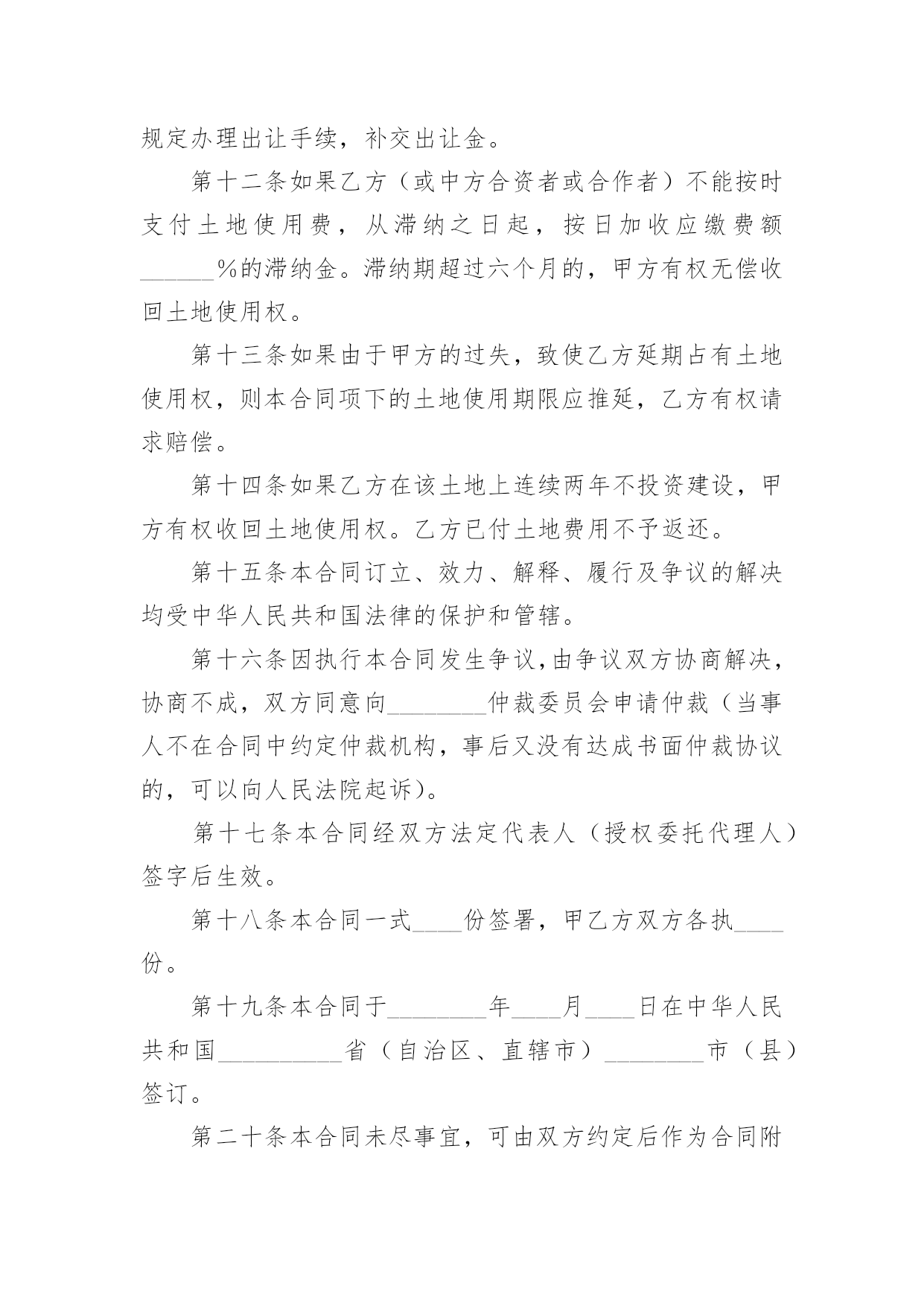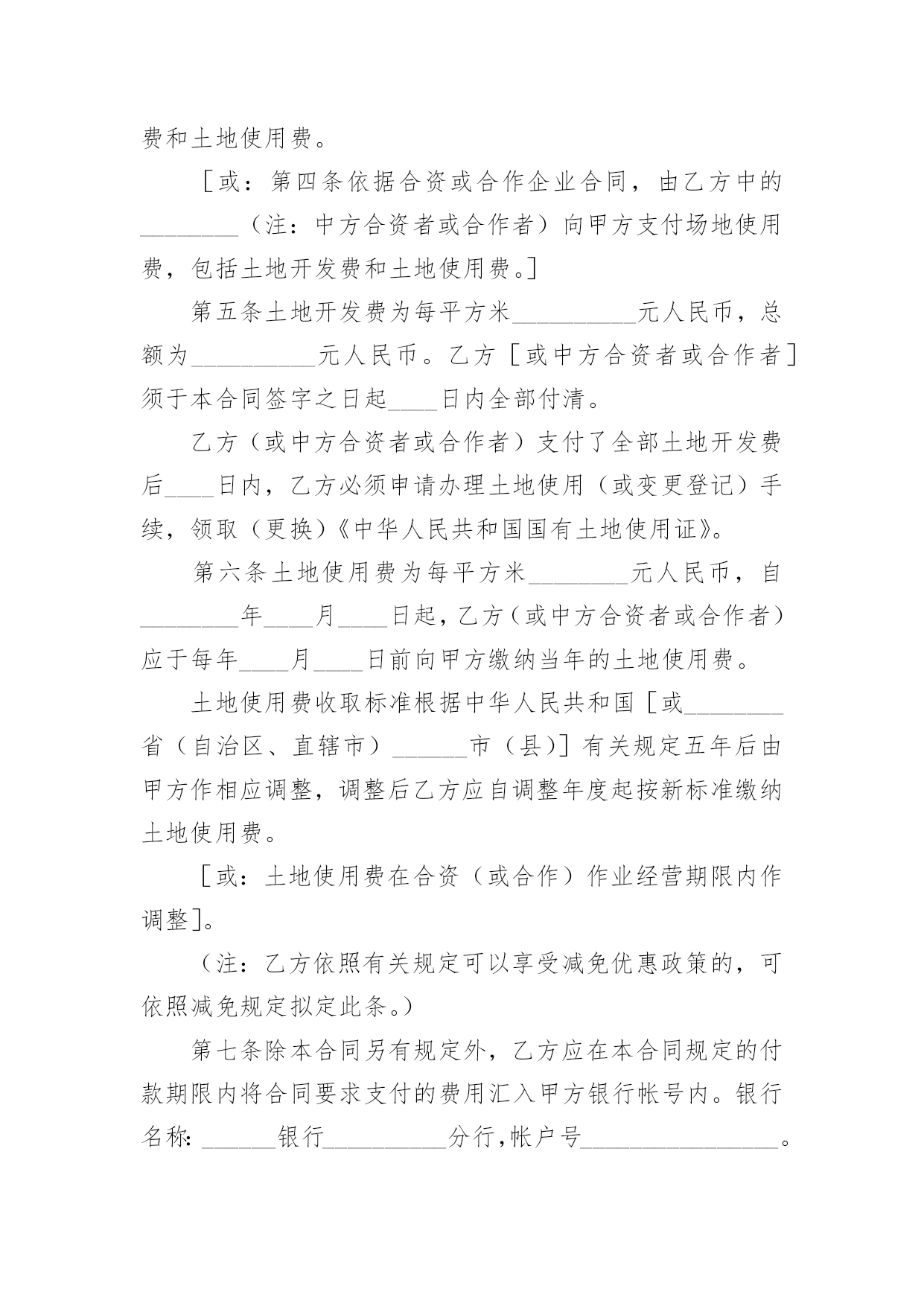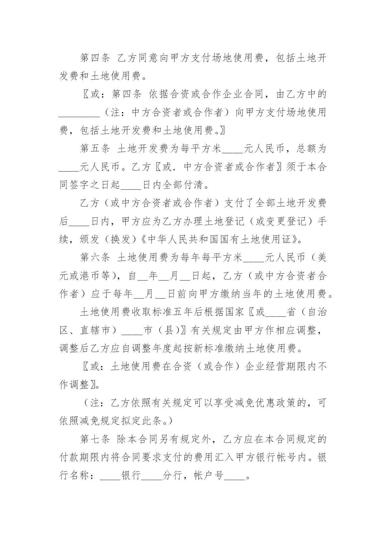 外商投资企业土地使用合同外商投资企业土地使用合同(11篇)随着时间的推移,合同起到的作用越来越大,合同是对双方的保障又是一种约束。相信很多朋友都对拟合同感到非常苦恼吧,下面是小编整理的外商投资企业土地使用合同,供大家参考借鉴,希望可以帮助到有需要的朋友。外商投资企业土地使用合同1第一条本合同双方当事人中华人民共和国________省(自治区、直辖市)________市(县)土地管理局(以下简称甲方),法人住所地________________;邮政编码______________。______________(以下简称乙方),法人住所地______________;邮政编码________________。根据中华人民共和国关于外商投资企业用地管理法律、法规和国家有关规定,双方通过友好协商订立本合同。第二条甲方提供给乙方使用的国有土地位于____________,面积为________平方米。其位置与四至范围如本合同附图所示。附图已经甲、乙双方确认。第三条本合同项下的土地使用年限为________年,自本合同签字之日起算。第四条乙方同意向甲方支付场地使用费,包括土地开发费和土地使用费。[或:第四条依据合资或合作企业合同,由乙方中的________(注:中方合资者或合作者)向甲方支付场地使用费,包括土地开发费和土地使用费。]第五条土地开发费为每平方米__________元人民币,总额为__________元人民币。乙方[或中方合资者或合作者]须于本合同签字之日起____日内全部付清。乙方(或中方合资者或合作者)支付了全部土地开发费后____日内,乙方必须申请办理土地使用(或变更登记)手续,领取(更换)《中华人民共和国国有土地使用证》。第六条土地使用费为每平方米________元人民币,自________年____月____日起,乙方(或中方合资者或合作者)应于每年____月____日前向甲方缴纳当年的土地使用费。土地使用费收取标准根据中华人民共和国[或________省(自治区、直辖市)______市(县)]有关规定五年后由甲方作相应调整,调整后乙方应自调整年度起按新标准缴纳土地使用费。[或:土地使用费在合资(或合作)作业经营期限内作调整]。(注:乙方依照有关规定可以享受减免优惠政策的,可依照减免规定拟定此条。)第七条除本合同另有规定外,乙方应在本合同规定的付款期限内将合同要求支付的费用汇入甲方银行帐号内。银行名称:______银行__________分行,帐户号________________。甲方银行帐户如有变更,应在变更后________天内以书面形式通知对方。由于甲方未及时通知此项变更而造成误期付款所引起的任何延迟收费。乙方概不承担违约责任。第八条该土地用于建设__________项目,乙方必须按规划要求和规定用途使用土地。在本合同期限内,乙方确需改变土地用途的,经甲方同意后办理变更土地用途的手续。第九条甲方同意承担该土地的征地、拆迁、界址定点具体事务,并于________年____月____日前交付土地。乙方应妥善保护界桩,不得私自改动,界桩遭受破坏或移动时,应及时书面报告当地土地管理部门,请求重新埋设,所需费用由乙方承担。[或:第九条乙方利用合资(或合作)企业中方原有场地,原有场地的界桩应由甲方重新核实。]第十条土地使用年限期满或乙方提前终止经营时,本合同同时终止履行。乙方应办理注销登记手续交还土地使用证。乙方对该土地内投资建设的建筑物、附着物有权处置,但时间不得超过________,逾期由甲方无偿取得。如乙方需继续使用该土地,须在期满六个月之前向甲方提交续期用地申请,经甲方同意后,须重新签订土地使用合同方可使用。第十一条乙方依据本合同通过划拨方式取得的土地使用权不得转让、出租、抵押。如需转让、出租、抵押,必须按《中华人民共和国城镇国有土地使用权出让和转让条例》规定办理出让手续,补交出让金。第十二条如果乙方(或中方合资者或合作者)不能按时支付土地使用费,从滞纳之日起,按日加收应缴费额______%的滞纳金。滞纳期超过六个月的,甲方有权无偿收回土地使用权。第十三条如果由于甲方的过失,致使乙方延期占有土地使用权,则本合同项下的土地使用期限应推延,乙方有权请求赔偿。第十四条如果乙方在该土地上连续两年不投资建设,甲方有权收回土地使用权。乙方已付土地费用不予返还。第十五条本合同订立、效力、解释、履行及争议的解决均受中华人民共和国法律的保护和管辖。第十六条因执行本合同发生争议,由争议双方协商解决,协商不成,双方同意向________仲裁委员会申请仲裁(当事人不在合同中约定仲裁机构,事后又没有达成书面仲裁协议的,可以向人民法院起诉)。第十七条本合同经双方法定代表人(授权委托代理人)签字后生效。第十八条本合同一式____份签署,