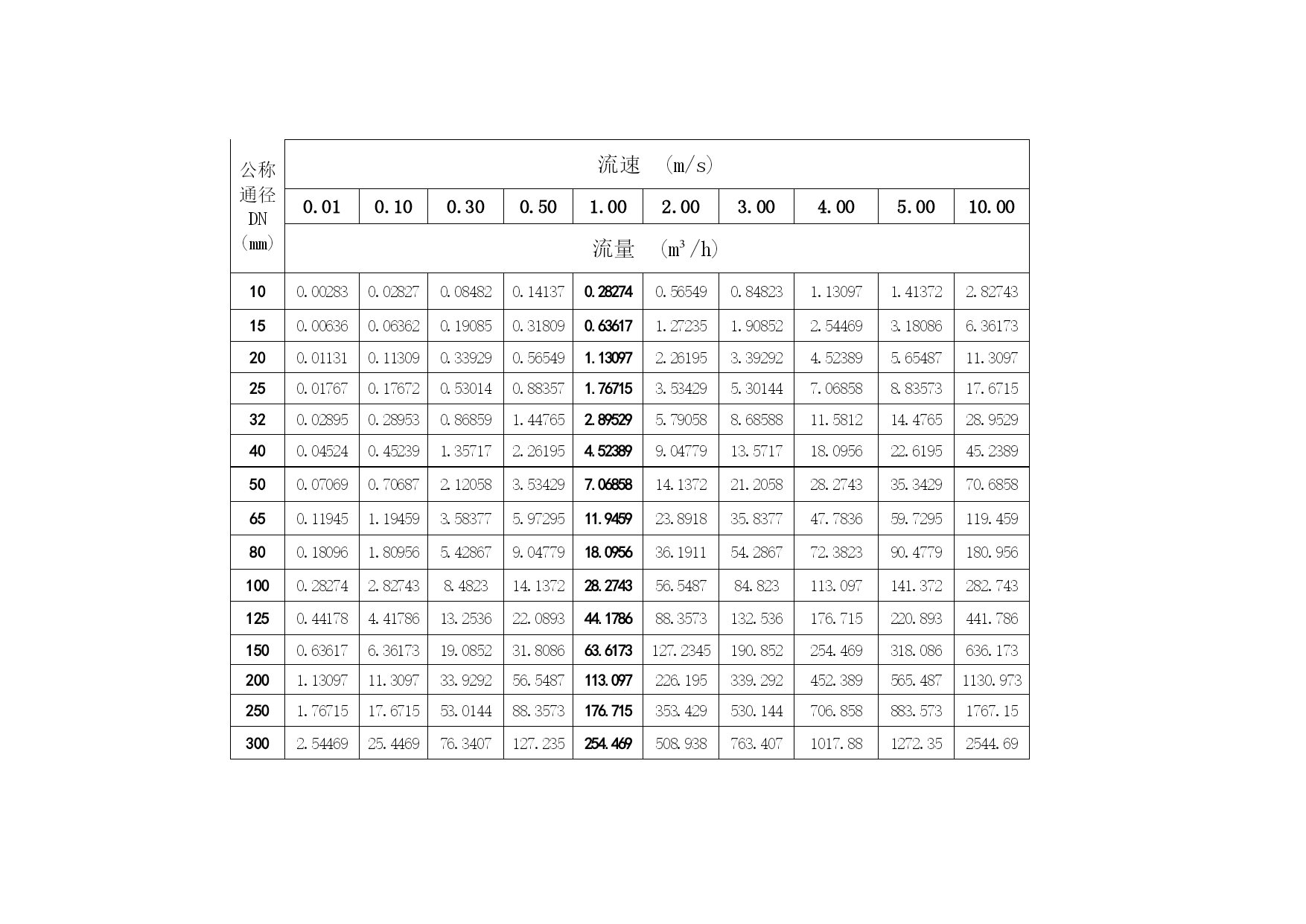 管道流量流速对照表和经济流速优质资料(可以直接使用,可编辑优质资料,欢迎下载)流速流量对照表公称通径DN(mm)流速(m/s)0.010.100.300.501.002.003.004.005.0010.00流量(m³/h)100.002830.028270.084820.141370.282740.565490.848231.130971.413722.82743150.006360.063620.190850.318090.636171.272351.908522.544693.180866.36173200.011310.113090.339290.565491.130972.261953.392924.523895.6548711.3097250.017670.176720.530140.883571.767153.534295.301447.068588.8357317.6715320.028950.289530.868591.447652.895295.790588.6858811.581214.476528.9529400.045240.452391.357172.261954.523899.0477913.571718.095622.619545.2389500.070690.706872.120583.534297.0685814.137221.205828.274335.342970.6858650.119451.194593.583775.9729511.945923.891835.837747.783659.7295119.459800.180961.809565.428679.0477918.095636.191154.286772.382390.4779180.9561000.282742.827438.482314.137228.274356.548784.823113.097141.372282.7431250.441784.4178613.253622.089344.178688.3573132.536176.715220.893441.7861500.636176.3617319.085231.808663.6173127.2345190.852254.469318.086636.1732001.1309711.309733.929256.5487113.097226.195339.292452.389565.4871130.9732501.7671517.671553.014488.3573176.715353.429530.144706.858883.5731767.153002.5446925.446976.3407127.235254.469508.938763.4071017.881272.352544.693503.4636134.6361103.908173.18346.361692.7211039.081385.441731.83463.614004.5238945.2389135.7168226.195452.389904.7791357.1681809.562261.954523.894505.7255557.2555171.766286.278572.5551145.111717.662290.222862.785725.555007.0686870.6868212.058353.429706.8581413.722120.582827.433534.297068.5860010.1788101.788305.363508.9381017.882035.753053.634071.55089.3810178.870013.8544138.544415.633692.7211385.442770.884156.335541.776927.2113854.480018.0956180.956542.867904.7791809.563619.115428.677238.239047.7918095.690022.9022229.022687.0661145.112290.224580.446870.669160.8811451.122902.2100028.2743282.743848.2311413.722827.435654.878482.311309.714137.228274.3120040.7150407.151221.452035.754071.58143.0112214.51628620357.540715140055.4177554.1771662.532770.885541.7711083.516625.322167.127708.855417.716