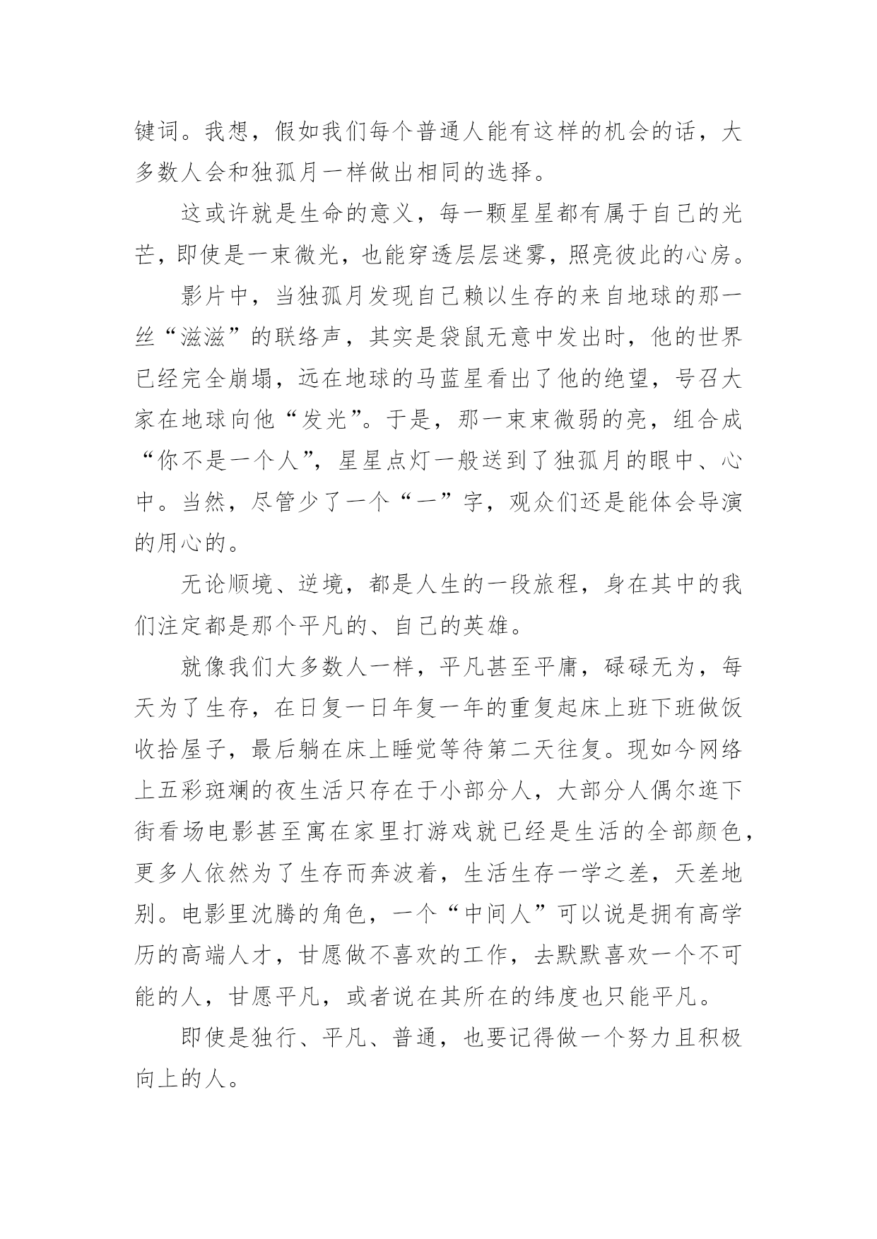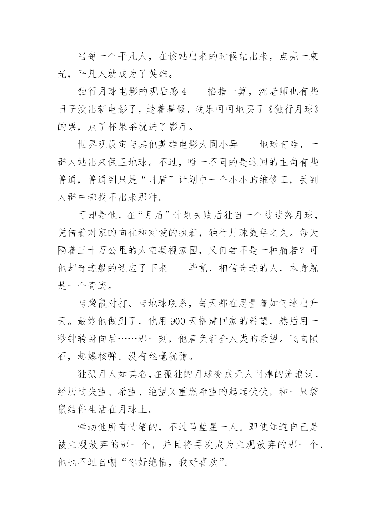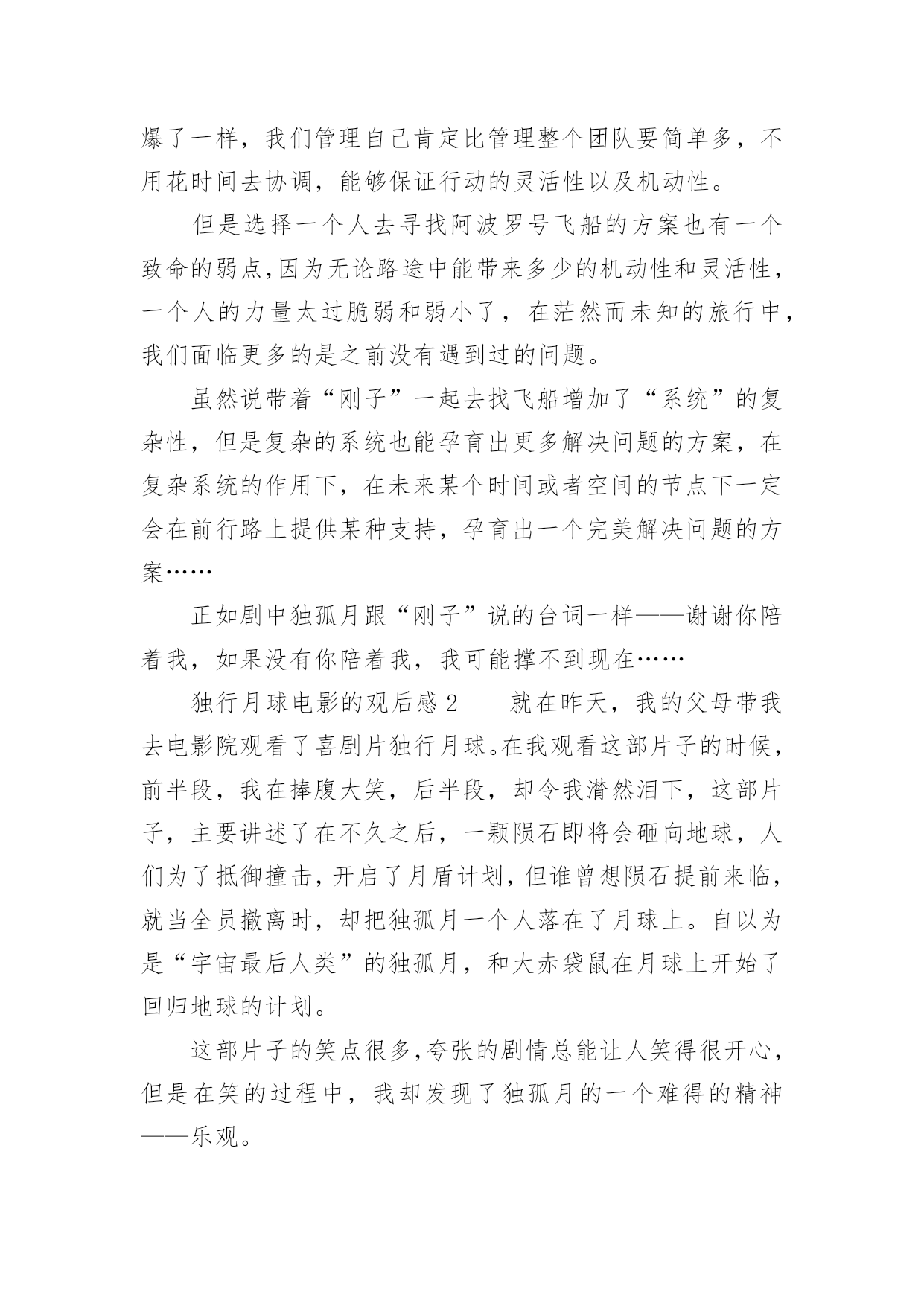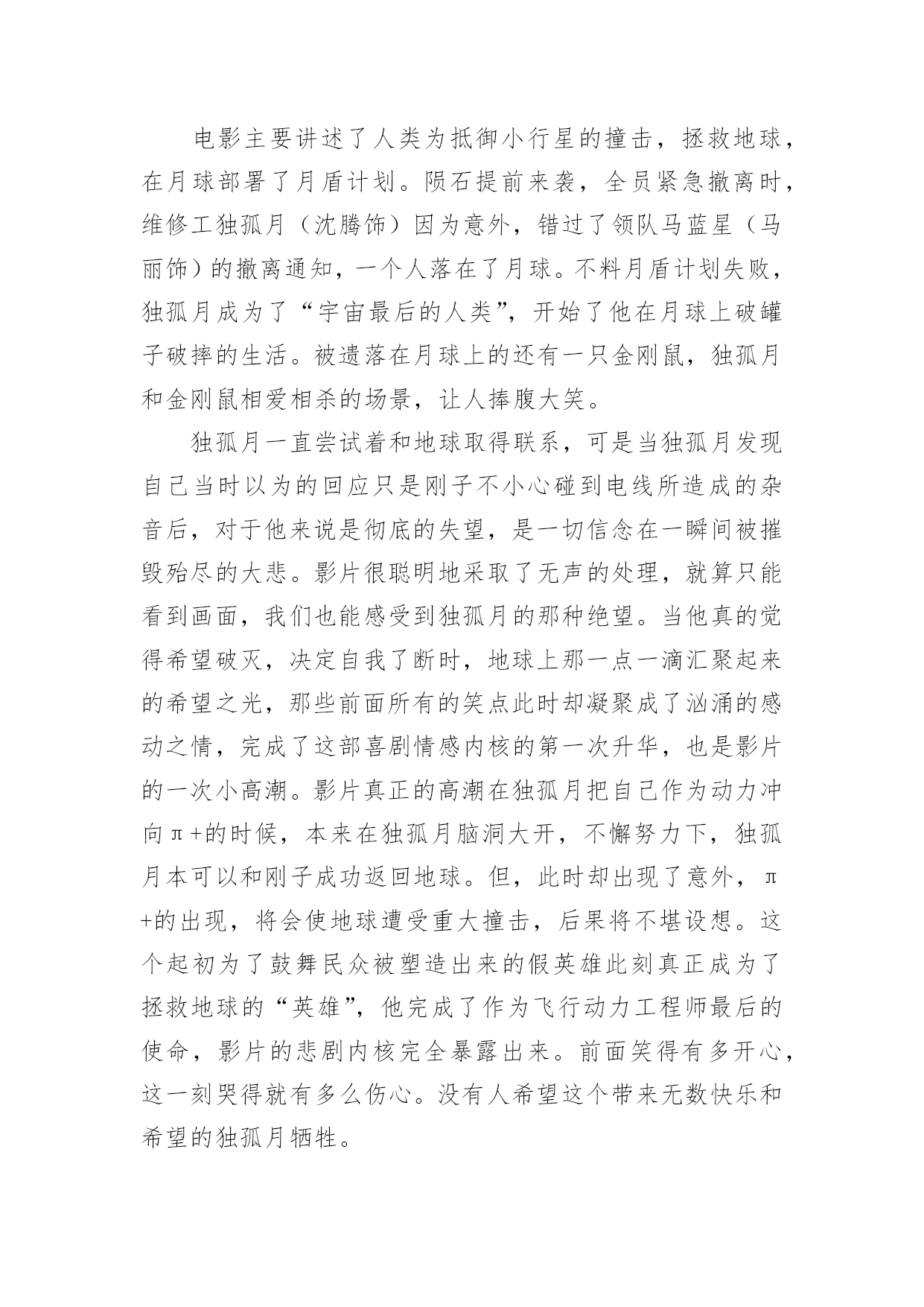 独行月球电影的观后感独行月球电影的观后感《独行月球》是由张吃鱼执导,沈腾、马丽主演的科幻喜剧片,改编自韩国漫画家赵石创作的同名漫画。以下是小编精心整理的独行月球电影的观后感(精选13篇),欢迎阅读与收藏。独行月球电影的观后感1《独行月球》我最喜欢的一句台词是——“在生活中,总有这样一种人,普普通通是他的人设,碌碌无为是他的日常,但在关键时刻总能挺身而出,逆光而行!”我最喜欢的一段情节是——独孤月带着“刚子”一起去寻找阿波罗号飞船,途中因为牵引链的因素,“刚子”落在途中了,主人公不顾车子动能耗尽的危险,毅然原路返回寻找“刚子”,然后再继续前行,在距离月球基地还有55公里处动能耗尽,眼看要谢幕了,“刚子”挽狂澜于既倒,扶大厦之将倾,通过“袋鼠拉雪橇”的方式把独孤月带回月球基地。其实按照人类的智慧,不管“刚子”多么凶猛,主人公还是有很多种方法不让他跟随自己去寻找阿波罗号飞船,因为从管理学的角度来看,主人公选择一个人去寻找阿波罗号飞船的方案会更好,而带上暴躁的“刚子”一起上路则有可能是带上了无尽的麻烦,就像“刚子”在途中差点把核弹引爆了一样,我们管理自己肯定比管理整个团队要简单多,不用花时间去协调,能够保证行动的灵活性以及机动性。但是选择一个人去寻找阿波罗号飞船的方案也有一个致命的弱点,因为无论路途中能带来多少的机动性和灵活性,一个人的力量太过脆弱和弱小了,在茫然而未知的旅行中,我们面临更多的是之前没有遇到过的问题。虽然说带着“刚子”一起去找飞船增加了“系统”的复杂性,但是复杂的系统也能孕育出更多解决问题的方案,在复杂系统的作用下,在未来某个时间或者空间的节点下一定会在前行路上提供某种支持,孕育出一个完美解决问题的方案……正如剧中独孤月跟“刚子”说的台词一样——谢谢你陪着我,如果没有你陪着我,我可能撑不到现在……独行月球电影的观后感2就在昨天,我的父母带我去电影院观看了喜剧片独行月球。在我观看这部片子的时候,前半段,我在捧腹大笑,后半段,却令我潸然泪下,这部片子,主要讲述了在不久之后,一颗陨石即将会砸向地球,人们为了抵御撞击,开启了月盾计划,但谁曾想陨石提前来临,就当全员撤离时,却把独孤月一个人落在了月球上。自以为是“宇宙最后人类”的独孤月,和大赤袋鼠在月球上开始了回归地球的计划。这部片子的笑点很多,夸张的剧情总能让人笑得很开心,但是在笑的过程中,我却发现了独孤月的一个难得的精神——乐观。大家不妨设想一下,假如被困在月球的是你,你会怎么办?是放弃,是对未来失去希望?但是独孤月没有。他始终没有放弃回到地球的希望,反观在地球上的人,因为灾难,所有人都失去了希望,如同行尸走肉一般。对于任何事情,不试试怎么知道?不抱有希望怎能成功?独孤说的这种精神非常难得,在平时,无论是谁遇到一点挫折,一点点烦恼都会去哭,但是主人公孤身一人,没有任何人相助,他却从未放弃过。有了希望,有了一腔热血,当然缺乏不了能力与努力。当一次次面临绝望时,当一次次心烦意乱时,主人公却总能平静下心来,不停的思考,不停的努力。在绝境中却仍然能平静下来。这才是他成功的关键。在后半段比较戳人的泪点就是独孤月舍身投弹炸陨石的时候,那时的他,一切准备就绪,一切都即将结束,终于能回到自己心心念念的地球,但是一个坏消息传来了,又有了一个新陨石。在这个时候,他毅然决然的将活下去的希望留给了那个“金刚鼠”明明一切都可以结束,但是她还是献身了。舍己为人的精神在此诠释的淋漓尽致!这应该是全片最感人的地方吧!这个电影真的是让人一边笑,一边哭,一边感悟。是一部值得一看的好片子!独行月球电影的观后感3奔着沈腾去看的《独行月球》,这部电影整体来说还是不错的,前半部分搞笑居多,后半部分感动为主。电影主要讲述了人类为抵御小行星的撞击,拯救地球,在月球部署了月盾计划。陨石提前来袭,全员紧急撤离时,维修工独孤月(沈腾饰)因为意外,错过了领队马蓝星(马丽饰)的撤离通知,一个人落在了月球。不料月盾计划失败,独孤月成为了“宇宙最后的人类”,开始了他在月球上破罐子破摔的生活。被遗落在月球上的还有一只金刚鼠,独孤月和金刚鼠相爱相杀的场景,让人捧腹大笑。独孤月一直尝试着和地球取得联系,可是当独孤月发现自己当时以为的回应只是刚子不小心碰到电线所造成的杂音后,对于他来说是彻底的失望,是一切信念在一瞬间被摧毁殆尽的大悲。影片很聪明地采取了无声的处理,就算只能看到画面,我们也能感受到独孤月的那种绝望。当他真的觉得希望破灭,决定自我了断时,地球上那一点一滴汇聚起来的希望之光,那些前面所有的笑点此时却凝聚成了汹涌的感动之情,完成了这部喜剧情感内核的第一次升华,也是影片的一次小高潮。影片真正的高潮在独孤月把自己作为动力冲向π+的时候,本来在独孤月脑洞大开,不懈努力下,独孤月本可以和刚子成功返回地球。但,此时却出现了意外,π+的出现,将