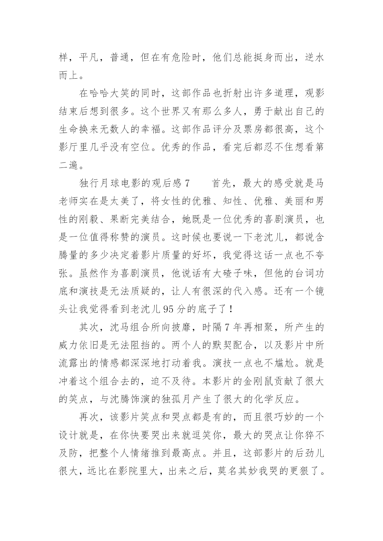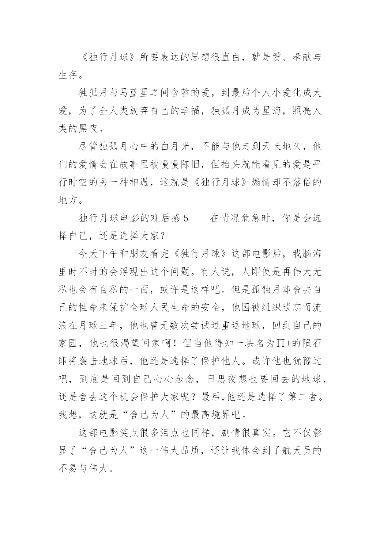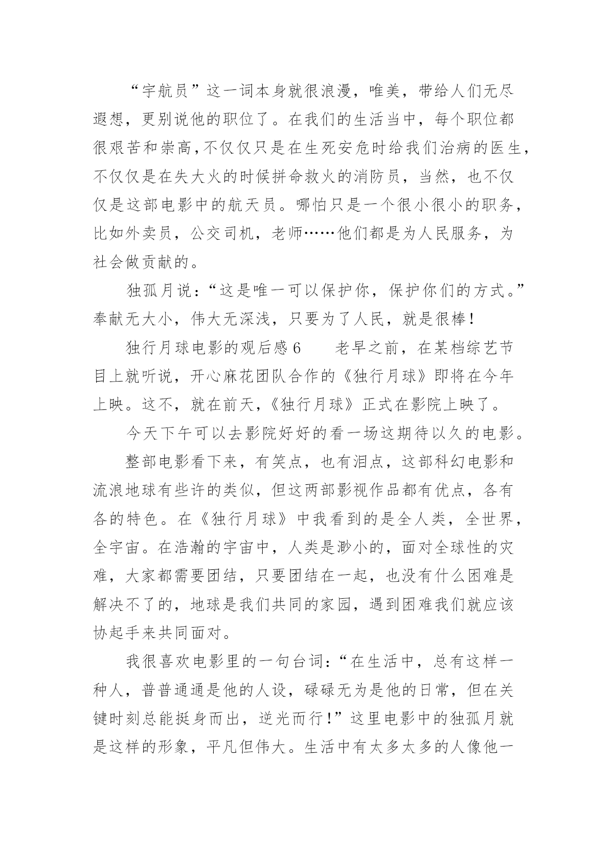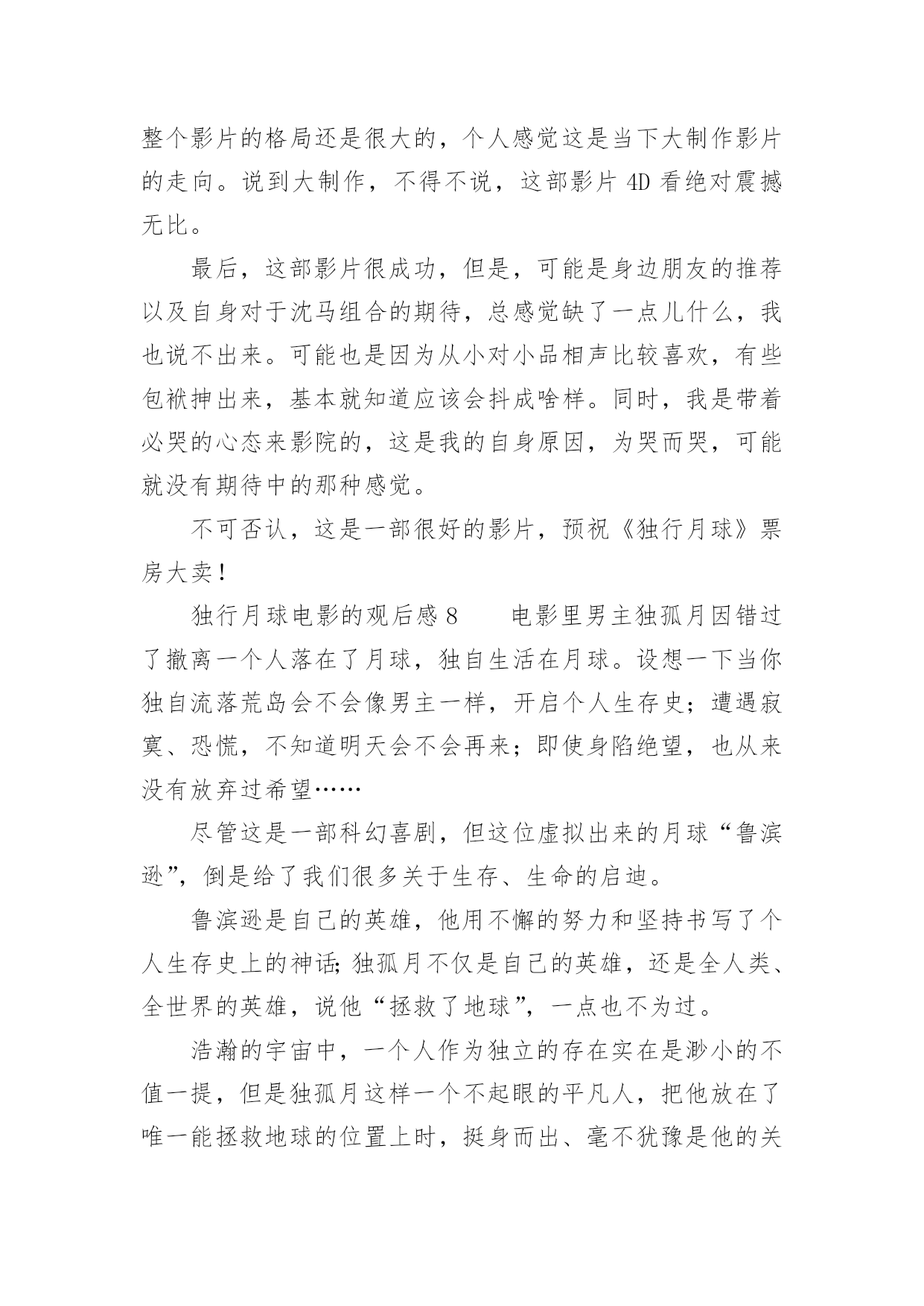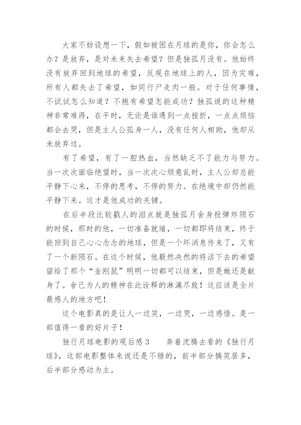独行月球电影的观后感独行月球电影的观后感《独行月球》是由张吃鱼执导,沈腾、马丽主演的科幻喜剧片,改编自韩国漫画家赵石创作的同名漫画。以下是小编精心整理的独行月球电影的观后感(精选13篇),欢迎阅读与收藏。独行月球电影的观后感1《独行月球》我最喜欢的一句台词是——“在生活中,总有这样一种人,普普通通是他的人设,碌碌无为是他的日常,但在关键时刻总能挺身而出,逆光而行!”我最喜欢的一段情节是——独孤月带着“刚子”一起去寻找阿波罗号飞船,途中因为牵引链的因素,“刚子”落在途中了,主人公不顾车子动能耗尽的危险,毅然原路返回寻找“刚子”,然后再继续前行,在距离月球基地还有55公里处动能耗尽,眼看要谢幕了,“刚子”挽狂澜于既倒,扶大厦之将倾,通过“袋鼠拉雪橇”的方式把独孤月带回月球基地。其实按照人类的智慧,不管“刚子”多么凶猛,主人公还是有很多种方法不让他跟随自己去寻找阿波罗号飞船,因为从管理学的角度来看,主人公选择一个人去寻找阿波罗号飞船的方案会更好,而带上暴躁的“刚子”一起上路则有可能是带上了无尽的麻烦,就像“刚子”在途中差点把核弹引爆了一样,我们管理自己肯定比管理整个团队要简单多,不用花时间去协调,能够保证行动的灵活性以及机动性。但是选择一个人去寻找阿波罗号飞船的方案也有一个致命的弱点,因为无论路途中能带来多少的机动性和灵活性,一个人的力量太过脆弱和弱小了,在茫然而未知的旅行中,我们面临更多的是之前没有遇到过的问题。虽然说带着“刚子”一起去找飞船增加了“系统”的复杂性,但是复杂的系统也能孕育出更多解决问题的方案,在复杂系统的作用下,在未来某个时间或者空间的节点下一定会在前行路上提供某种支持,孕育出一个完美解决问题的方案……正如剧中独孤月跟“刚子”说的台词一样——谢谢你陪着我,如果没有你陪着我,我可能撑不到现在……独行月球电影的观后感2就在昨天,我的父母带我去电影院观看了喜剧片独行月球。在我观看这部片子的时候,前半段,我在捧腹大笑,后半段,却令我潸然泪下,这部片子,主要讲述了在不久之后,一颗陨石即将会砸向地球,人们为了抵御撞击,开启了月盾计划,但谁曾想陨石提前来临,就当全员撤离时,却把独孤月一个人落在了月球上。自以为是“宇宙最后人类”的独孤月,和大赤袋鼠在月球上开始了回归地球的计划。这部片子的笑点很多,夸张的剧情总能让人笑得很开心,但是在笑的过程中,我却发现了独孤月的一个难得的精神——乐观。大家不妨设想一下,假如被困在月球的是你,你会怎么办?是放弃,是对未来失去希望?但是独孤月没有。他始终没有放弃回到地球的希望,反观在地球上的人,因为灾难,所有人都失去了希望,如同行尸走肉一般。对于任何事情,不试试怎么知道?不抱有希望怎能成功?独孤说的这种精神非常难得,在平时,无论是谁遇到一点挫折,一点点烦恼都会去哭,但是主人公孤身一人,没有任何人相助,他却从未放弃过。有了希望,有了一腔热血,当然缺乏不了能力与努力。当一次次面临绝望时,当一次次心烦意乱时,主人公却总能平静下心来,不停的思考,不停的努力。在绝境中却仍然能平静下来。这才是他成功的关键。在后半段比较戳人的泪点就是独孤月舍身投弹炸陨石的时候,那时的他,一切准备就绪,一切都即将结束,终于能回到自己心心念念的地球,但是一个坏消息传来了,又有了一个新陨石。在这个时候,他毅然决然的将活下去的希望留给了那个“金刚鼠”明明一切都可以结束,但是她还是献身了。舍己为人的精神在此诠释的淋漓尽致!这应该是全片最感人的地方吧!这个电影真的是让人一边笑,一边哭,一边感悟。是一部值得一看的好片子!独行月球电影的观后感3奔着沈腾去看的《独行月球》,这部电影整体来说还是不错的,前半部分搞笑居多,后半部分感动为主。电影主要讲述了人类为抵御小行星的撞击,拯救地球,在月球部署了月盾计划。陨石提前来袭,全员紧急撤离时,维修工独孤月(沈腾饰)因为意外,错过了领队马蓝星(马丽饰)的撤离通知,一个人落在了月球。不料月盾计划失败,独孤月成为了“宇宙最后的人类”,开始了他在月球上破罐子破摔的生活。被遗落在月球上的还有一只金刚鼠,独孤月和金刚鼠相爱相杀的场景,让人捧腹大笑。独孤月一直尝试着和地球取得联系,可是当独孤月发现自己当时以为的回应只是刚子不小心碰到电线所造成的杂音后,对于他来说是彻底的失望,是一切信念在一瞬间被摧毁殆尽的大悲。影片很聪明地采取了无声的处理,就算只能看到画面,我们也能感受到独孤月的那种绝望。当他真的觉得希望破灭,决定自我了断时,地球上那一点一滴汇聚起来的希望之光,那些前面所有的笑点此时却凝聚成了汹涌的感动之情,完成了这部喜剧情感内核的第一次升华,也是影片的一次小高潮。影片真正的高潮在独孤月把自己作为动力冲向π+的时候,本来在独孤月脑洞大开,不懈努力下,独孤月本可以和刚子成功返回地球。但,此时却出现了意外,π+的出现,将