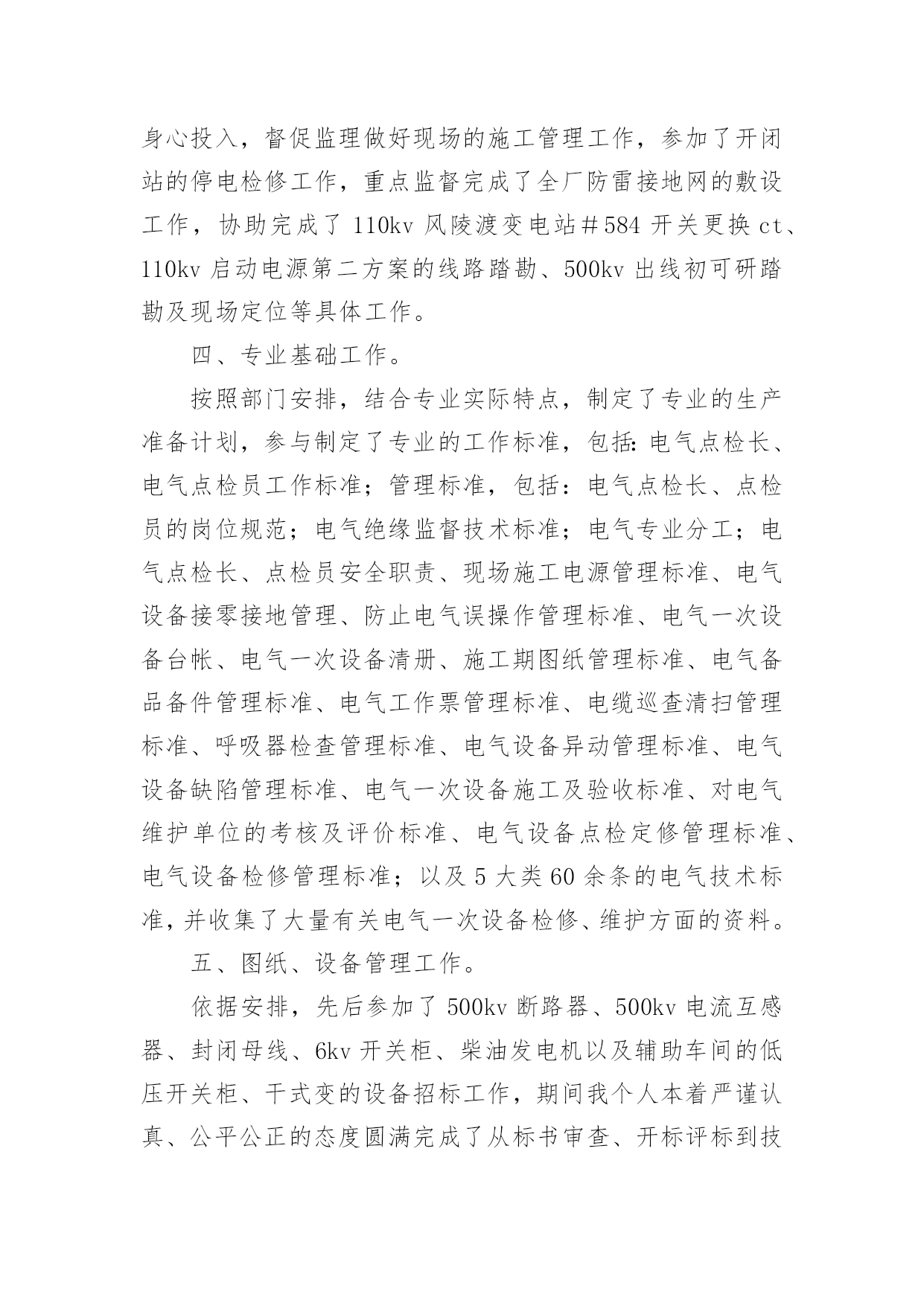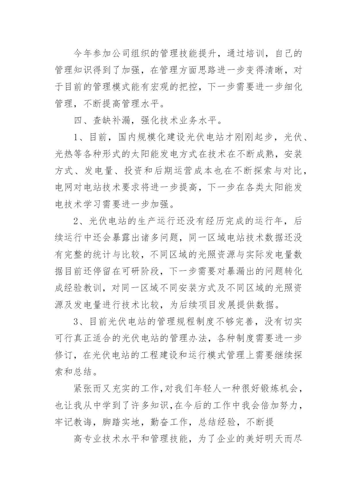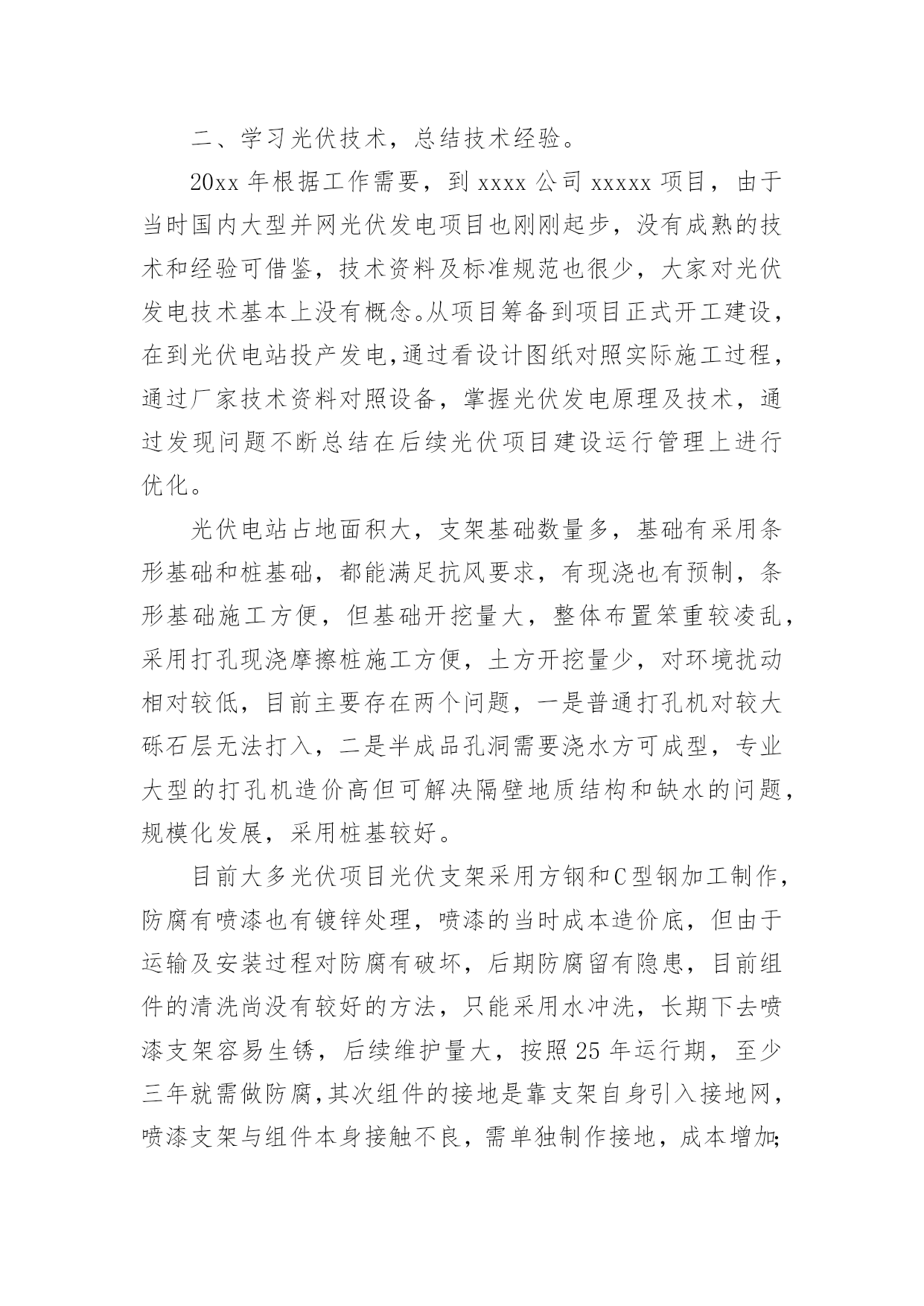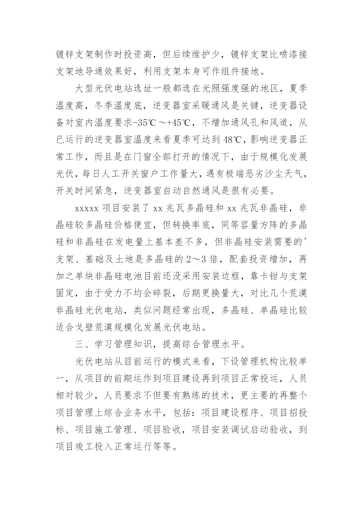 电力专业技术个人工作总结【热门】电力专业技术个人工作总结总结是对某一阶段的工作、学习或思想中的经验或情况进行分析研究的书面材料,它能使我们及时找出错误并改正,因此,让我们写一份总结吧。那么总结要注意有什么内容呢?以下是小编为大家整理的电力专业技术个人工作总结,仅供参考,大家一起来看看吧。电力专业技术个人工作总结1我于20xx年7月毕业于xxxxx学校电力系统自动化技术专业,工作三年以来,主要从事风力发电技术和光伏发电专业技术工作,现主要从事光伏电站工程建设、电站技术和综合管理工作,现对所从事的专业技术工作总结如下:一、学习风电知识,不断强化专业水平从毕业到xx年7月,主要从事风电专业技术工作,刚参加工作对风电场知识了解不多,在风电场主要通过单位组织的风电理论知识学习、厂家培训和现场设备的安装调试对设备不断熟悉,在风电专业技术上,主要掌握了风电机组的启停基本操作和异常事故处理、升压站内线路及站用电系统的倒闸操作、风电机组的就地巡视检查、登机维护、缺陷异常处理、风电场技术管理、安全管理及风电场运行倒班方式,理论结合实际,电力技术专业进一步得到了提高。二、学习光伏技术,总结技术经验。20xx年根据工作需要,到xxxx公司xxxxx项目,由于当时国内大型并网光伏发电项目也刚刚起步,没有成熟的技术和经验可借鉴,技术资料及标准规范也很少,大家对光伏发电技术基本上没有概念。从项目筹备到项目正式开工建设,在到光伏电站投产发电,通过看设计图纸对照实际施工过程,通过厂家技术资料对照设备,掌握光伏发电原理及技术,通过发现问题不断总结在后续光伏项目建设运行管理上进行优化。光伏电站占地面积大,支架基础数量多,基础有采用条形基础和桩基础,都能满足抗风要求,有现浇也有预制,条形基础施工方便,但基础开挖量大,整体布置笨重较凌乱,采用打孔现浇摩擦桩施工方便,土方开挖量少,对环境扰动相对较低,目前主要存在两个问题,一是普通打孔机对较大砾石层无法打入,二是半成品孔洞需要浇水方可成型,专业大型的打孔机造价高但可解决隔壁地质结构和缺水的问题,规模化发展,采用桩基较好。目前大多光伏项目光伏支架采用方钢和C型钢加工制作,防腐有喷漆也有镀锌处理,喷漆的当时成本造价底,但由于运输及安装过程对防腐有破坏,后期防腐留有隐患,目前组件的清洗尚没有较好的方法,只能采用水冲洗,长期下去喷漆支架容易生锈,后续维护量大,按照25年运行期,至少三年就需做防腐,其次组件的接地是靠支架自身引入接地网,喷漆支架与组件本身接触不良,需单独制作接地,成本增加;镀锌支架制作时投资高,但后续维护少,镀锌支架比喷漆接支架地导通效果好,利用支架本身可作组件接地。大型光伏电站选址一般都选在光照强度强的地区,夏季温度高,冬季温度底,逆变器室采暖通风是关键,逆变器设备对室内温度要求-35℃~+45℃,不增加通风孔和风道,从已运行的逆变器室温度来看夏季可达到48℃,影响逆变器正常工作,而且是在门窗全部打开的情况下,由于规模化发展光伏,每日人工开关窗户工作量大,遇有极端恶劣沙尘天气,开关时间紧急,逆变器室自动自然通风是很有必要。xxxxx项目安装了xx兆瓦多晶硅和xx兆瓦非晶硅,非晶硅较多晶硅价格便宜,但转换率底,同等容量方阵的多晶硅和非晶硅在发电量上基本差不多,但非晶硅安装需要的'支架、基础及土地是多晶硅的2~3倍,配套投资增加,再加之单块非晶硅电池目前还没采用安装边框,靠卡钳与支架固定,由于受力不均会碎裂,后期更换量大,对比几个荒漠非晶硅光伏电站,类似问题经常出现,多晶硅、单晶硅比较适合戈壁荒漠规模化发展光伏电站。三、学习管理知识,提高综合管理水平。光伏电站从目前运行的模式来看,下设管理机构比较单一,从项目的前期运作到项目建设再到项目正常投运,人员相对较少,人员要求不但要有熟练的技术,更主要的再整个项目管理上综合业务水平,包括:项目建设程序、项目招投标、项目施工管理、项目验收,项目安装调试启动验收,到项目竣工投入正常运行等等。今年参加公司组织的管理技能提升,通过培训,自己的管理知识得到了加强,在管理方面思路进一步变得清晰,对于目前的管理模式能有宏观的把控,下一步需要进一步细化管理,不断提高管理水平。四、查缺补漏,强化技术业务水平。1、目前,国内规模化建设光伏电站才刚刚起步,光伏、光热等各种形式的太阳能发电方式在技术在不断成熟,安装方式、发电量、投资和后期运营成本也在不断探索与对比,电网对电站技术要求将进一步提高,下一步在各类太阳能发电技术学习需要进一步加强。2、光伏电站的生产运行还没有经历完成的运行年,后续运行中还会暴露出诸多问题,同一区域电站技术数据还没有完整的统计与比较,不同区域的光照资源与实际发电量数据目前还停留在可研阶段,下一步需要对暴漏出的问题转化成经验教训,对同一区域不同安装方式及不同区域的光照资源