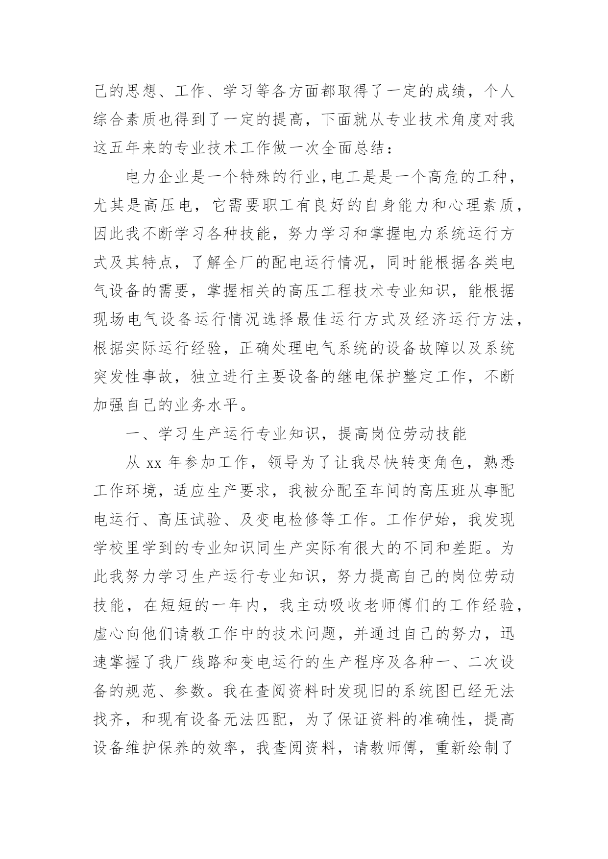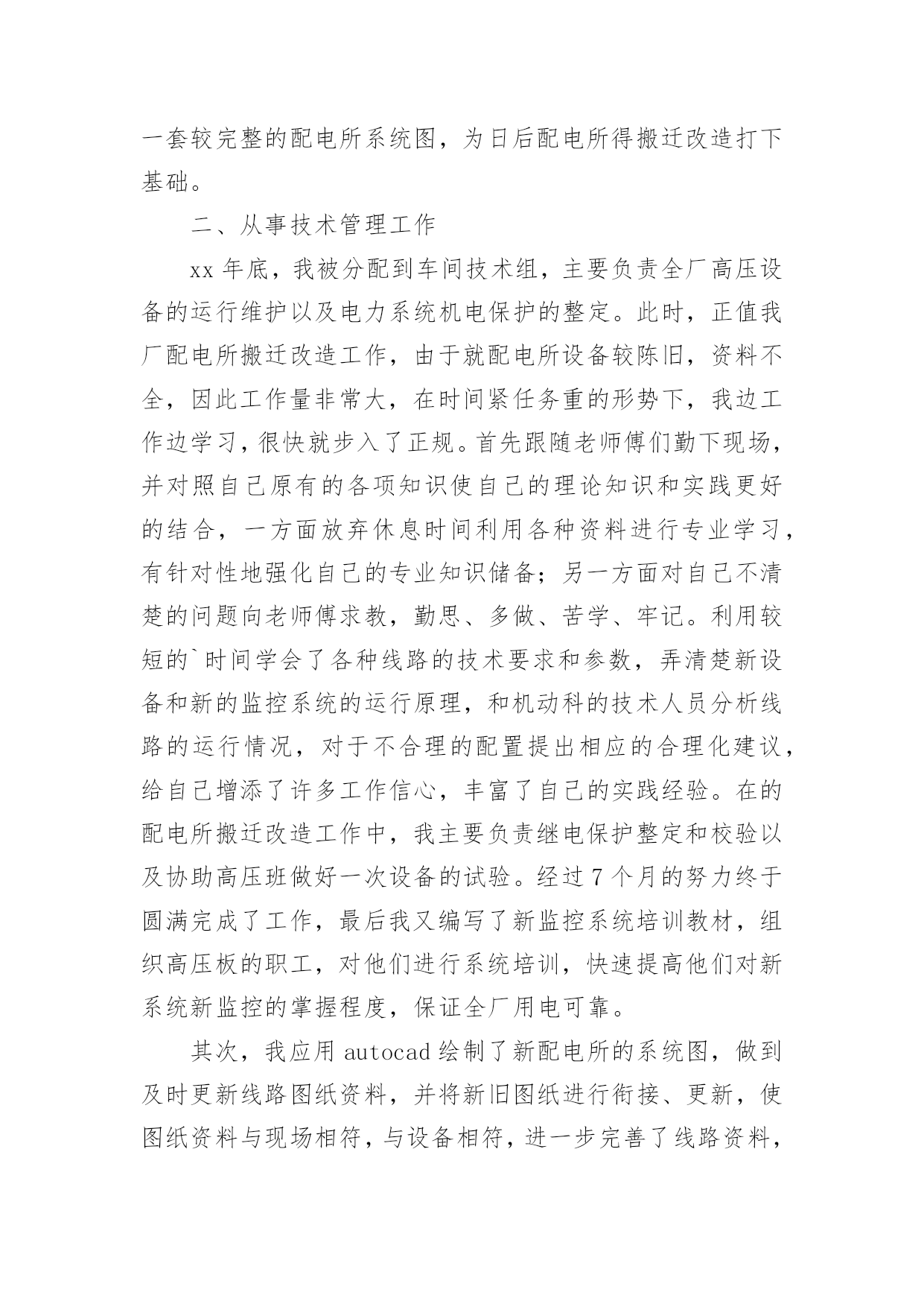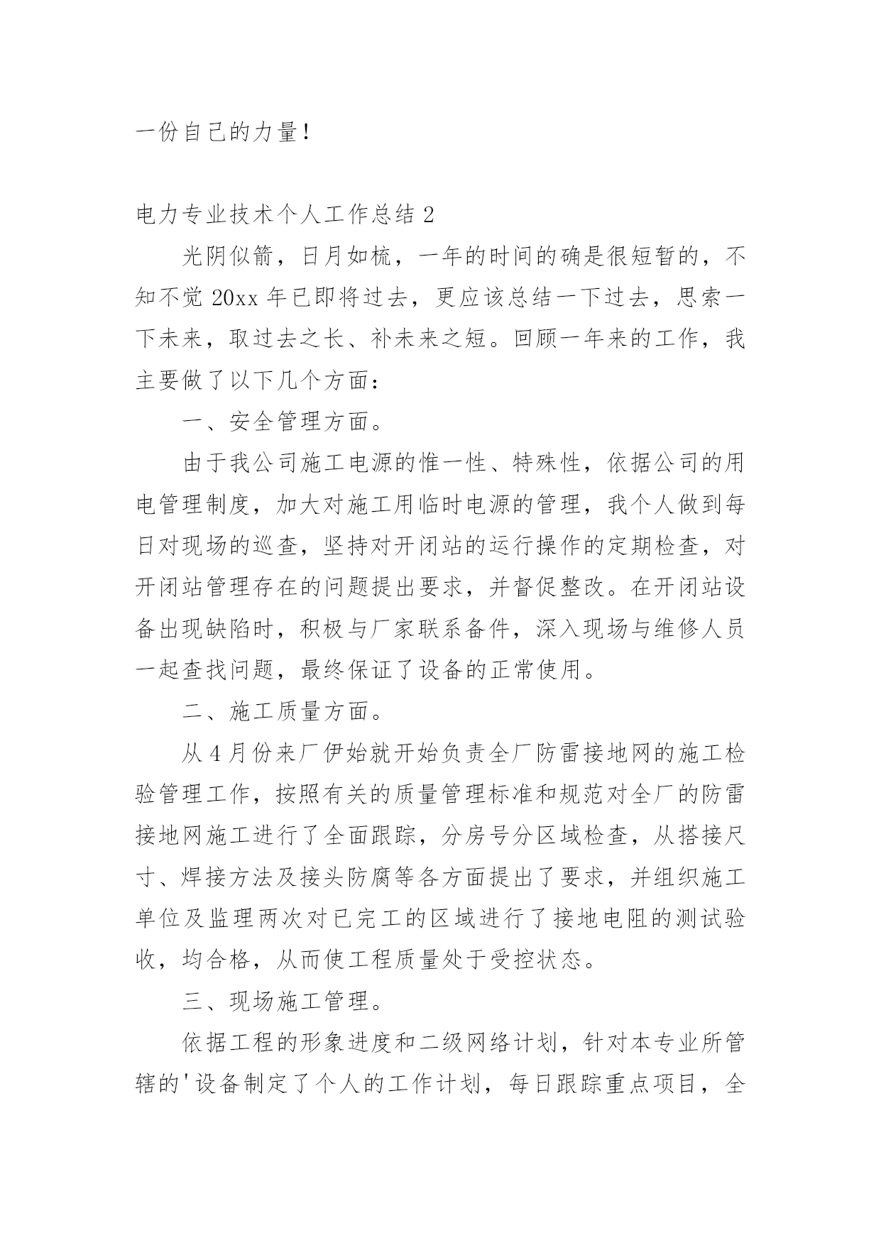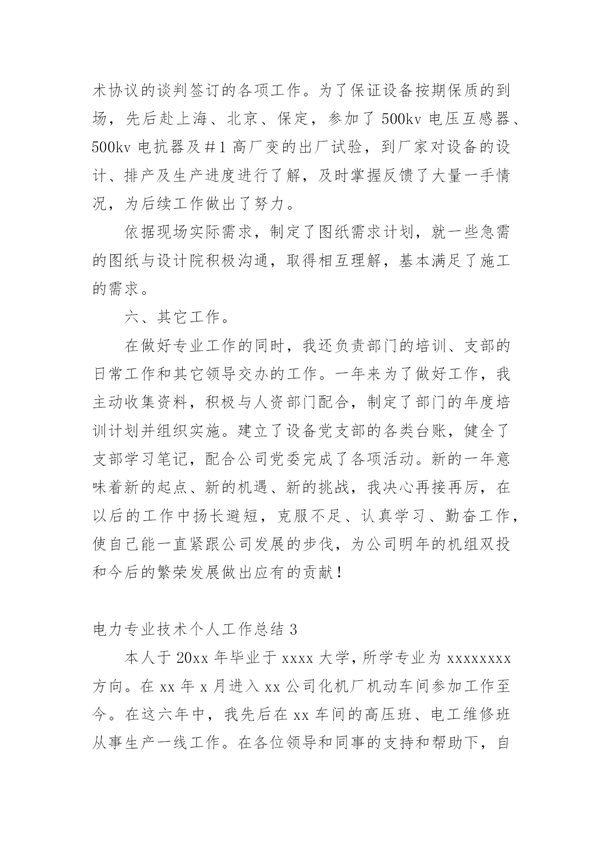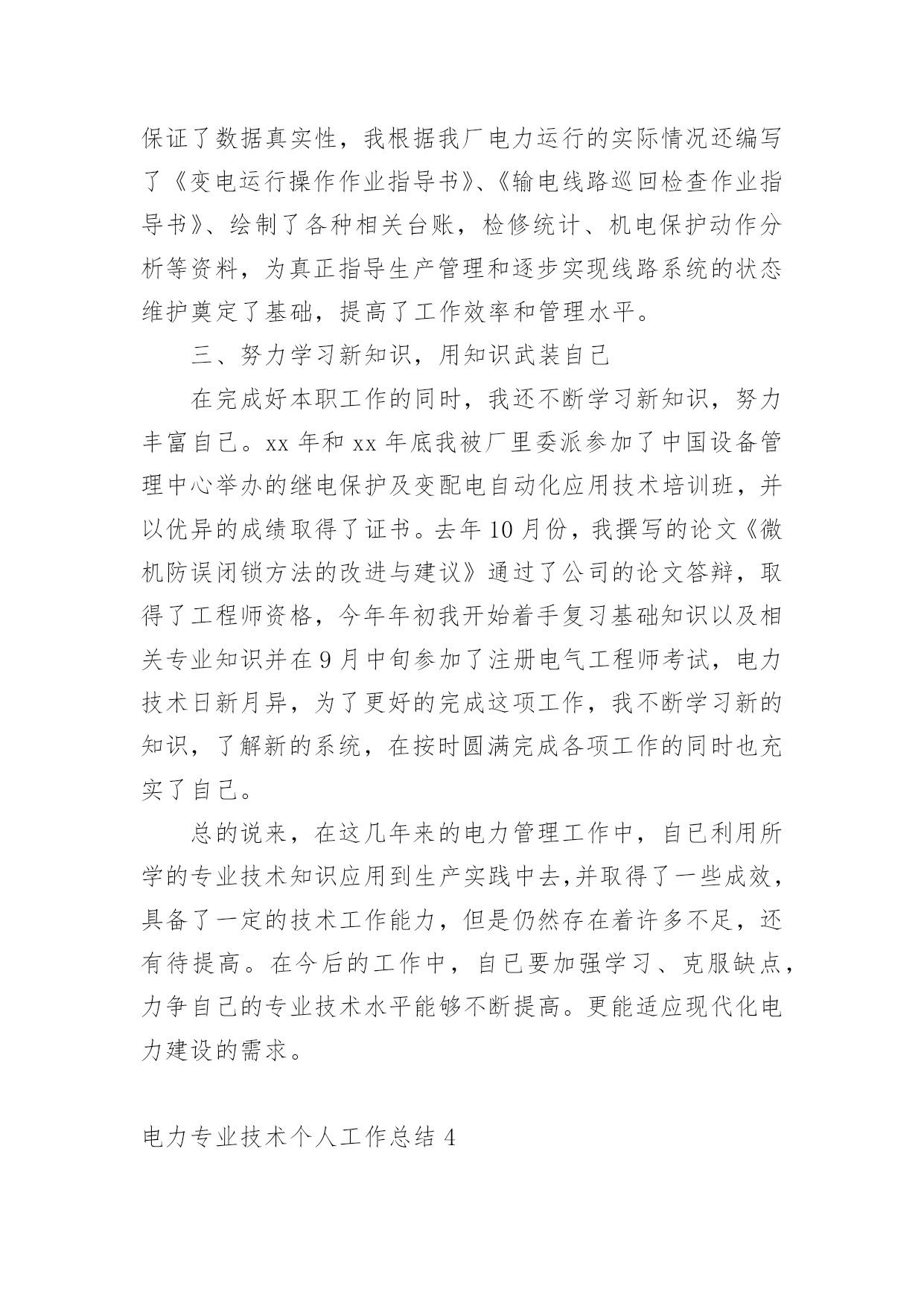 电力专业技术个人工作总结【热门】电力专业技术个人工作总结总结是对某一阶段的工作、学习或思想中的经验或情况进行分析研究的书面材料,它能使我们及时找出错误并改正,因此,让我们写一份总结吧。那么总结要注意有什么内容呢?以下是小编为大家整理的电力专业技术个人工作总结,仅供参考,大家一起来看看吧。电力专业技术个人工作总结1我于20xx年7月毕业于xxxxx学校电力系统自动化技术专业,工作三年以来,主要从事风力发电技术和光伏发电专业技术工作,现主要从事光伏电站工程建设、电站技术和综合管理工作,现对所从事的专业技术工作总结如下:一、学习风电知识,不断强化专业水平从毕业到xx年7月,主要从事风电专业技术工作,刚参加工作对风电场知识了解不多,在风电场主要通过单位组织的风电理论知识学习、厂家培训和现场设备的安装调试对设备不断熟悉,在风电专业技术上,主要掌握了风电机组的启停基本操作和异常事故处理、升压站内线路及站用电系统的倒闸操作、风电机组的就地巡视检查、登机维护、缺陷异常处理、风电场技术管理、安全管理及风电场运行倒班方式,理论结合实际,电力技术专业进一步得到了提高。二、学习光伏技术,总结技术经验。20xx年根据工作需要,到xxxx公司xxxxx项目,由于当时国内大型并网光伏发电项目也刚刚起步,没有成熟的技术和经验可借鉴,技术资料及标准规范也很少,大家对光伏发电技术基本上没有概念。从项目筹备到项目正式开工建设,在到光伏电站投产发电,通过看设计图纸对照实际施工过程,通过厂家技术资料对照设备,掌握光伏发电原理及技术,通过发现问题不断总结在后续光伏项目建设运行管理上进行优化。光伏电站占地面积大,支架基础数量多,基础有采用条形基础和桩基础,都能满足抗风要求,有现浇也有预制,条形基础施工方便,但基础开挖量大,整体布置笨重较凌乱,采用打孔现浇摩擦桩施工方便,土方开挖量少,对环境扰动相对较低,目前主要存在两个问题,一是普通打孔机对较大砾石层无法打入,二是半成品孔洞需要浇水方可成型,专业大型的打孔机造价高但可解决隔壁地质结构和缺水的问题,规模化发展,采用桩基较好。目前大多光伏项目光伏支架采用方钢和C型钢加工制作,防腐有喷漆也有镀锌处理,喷漆的当时成本造价底,但由于运输及安装过程对防腐有破坏,后期防腐留有隐患,目前组件的清洗尚没有较好的方法,只能采用水冲洗,长期下去喷漆支架容易生锈,后续维护量大,按照25年运行期,至少三年就需做防腐,其次组件的接地是靠支架自身引入接地网,喷漆支架与组件本身接触不良,需单独制作接地,成本增加;镀锌支架制作时投资高,但后续维护少,镀锌支架比喷漆接支架地导通效果好,利用支架本身可作组件接地。大型光伏电站选址一般都选在光照强度强的地区,夏季温度高,冬季温度底,逆变器室采暖通风是关键,逆变器设备对室内温度要求-35℃~+45℃,不增加通风孔和风道,从已运行的逆变器室温度来看夏季可达到48℃,影响逆变器正常工作,而且是在门窗全部打开的情况下,由于规模化发展光伏,每日人工开关窗户工作量大,遇有极端恶劣沙尘天气,开关时间紧急,逆变器室自动自然通风是很有必要。xxxxx项目安装了xx兆瓦多晶硅和xx兆瓦非晶硅,非晶硅较多晶硅价格便宜,但转换率底,同等容量方阵的多晶硅和非晶硅在发电量上基本差不多,但非晶硅安装需要的'支架、基础及土地是多晶硅的2~3倍,配套投资增加,再加之单块非晶硅电池目前还没采用安装边框,靠卡钳与支架固定,由于受力不均会碎裂,后期更换量大,对比几个荒漠非晶硅光伏电站,类似问题经常出现,多晶硅、单晶硅比较适合戈壁荒漠规模化发展光伏电站。三、学习管理知识,提高综合管理水平。光伏电站从目前运行的模式来看,下设管理机构比较单一,从项目的前期运作到项目建设再到项目正常投运,人员相对较少,人员要求不但要有熟练的技术,更主要的再整个项目管理上综合业务水平,包括:项目建设程序、项目招投标、项目施工管理、项目验收,项目安装调试启动验收,到项目竣工投入正常运行等等。今年参加公司组织的管理技能提升,通过培训,自己的管理知识得到了加强,在管理方面思路进一步变得清晰,对于目前的管理模式能有宏观的把控,下一步需要进一步细化管理,不断提高管理水平。四、查缺补漏,强化技术业务水平。1、目前,国内规模化建设光伏电站才刚刚起步,光伏、光热等各种形式的太阳能发电方式在技术在不断成熟,安装方式、发电量、投资和后期运营成本也在不断探索与对比,电网对电站技术要求将进一步提高,下一步在各类太阳能发电技术学习需要进一步加强。2、光伏电站的生产运行还没有经历完成的运行年,后续运行中还会暴露出诸多问题,同一区域电站技术数据还没有完整的统计与比较,不同区域的光照资源与实际发电量数据目前还停留在可研阶段,下一步需要对暴漏出的问题转化成经验教训,对同一区域不同安装方式及不同区域的光照资源