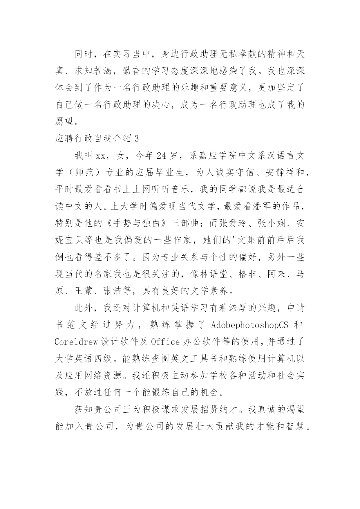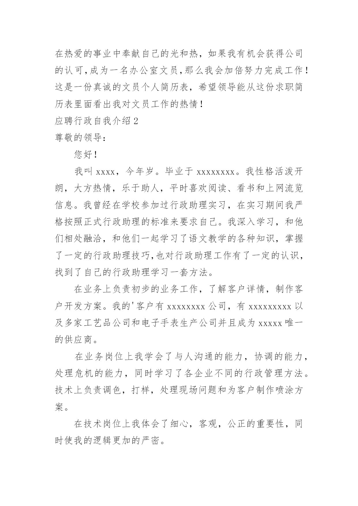 应聘行政自我介绍应聘行政自我介绍当来到一个新环境中,我们有必要对自己进行适当的介绍,自我介绍是一种认识自我的手段。那么什么样的自我介绍才合适呢?以下是小编为大家整理的应聘行政自我介绍,欢迎阅读与收藏。应聘行政自我介绍1各位面试官:您们好!我叫,毕业于大学专业。性格开朗,稳重,诚实守信,有较强的团队合作意识及集体荣誉感;在生活中严于律己,勤于动手。曾取得了英语4级证书。在实习期间的工作中,能够运用所学知识进行听说读写。能够熟练的运用MicrosofOffice进行高效的办公室日常工作。在外地求学的'四年中,我养成了坚强的性格,这种性格使我克服了学习和生活中的一些困难,积极进取。如果我有机会被录用的话,我一定能够在工作中得到锻炼并实现自身的价值,文员自我介绍范文争当工作精英,做合格的员工。同时,我也认识到,人和工作的关系是建立在自我认知的基础上的,我认为自己有能力也有信心做好这份工作。将要踏上另一个生旅程,我会努力完善自己,提高自己,在热爱的事业中奉献自己的光和热,如果我有机会获得公司的认可,成为一名办公室文员,那么我会加倍努力完成工作!这是一份真诚的文员个人简历表,希望领导能从这份求职简历表里面看出我对文员工作的热情!应聘行政自我介绍2尊敬的领导:您好!我叫xxxx,今年岁。毕业于xxxxxxxx。我性格活泼开朗,大方热情,乐于助人,平时喜欢阅读、看书和上网流览信息。我曾经在学校参加过行政助理实习,在实习期间我严格按照正式行政助理的标准来要求自己。我深入学习,和他们相处融洽,和他们一起学习了语文教学的各种知识,掌握了一定的行政助理技巧,也对行政助理工作有了一定的认识,找到了自己的行政助理学习一套方法。在业务上负责初步的业务工作,了解客户详情,制作客户开发方案。我的'客户有xxxxxxxx公司,有xxxxxxxxx以及多家工艺品公司和电子手表生产公司并且成为xxxxx唯一的供应商。在业务岗位上我学会了与人沟通的能力,协调的能力,处理危机的能力,同时学习了各企业不同的行政管理方法。技术上负责调色,打样,处理现场问题和为客户制作喷涂方案。在技术岗位上我体会了细心,客观,公正的重要性,同时使我的逻辑更加的严密。同时,在实习当中,身边行政助理无私奉献的精神和天真、求知若渴,勤奋的学习态度深深地感染了我。我也深深体会到了作为一名行政助理的乐趣和重要意义,更加坚定了自己做一名行政助理的决心,成为一名行政助理也成了我的愿望。应聘行政自我介绍3我叫xx,女,今年24岁,系嘉应学院中文系汉语言文学(师范)专业的应届毕业生,为人诚实守信、安静祥和,平时最爱看看书上上网听听音乐,我的同学都说我是最适合读中文的人。上大学时偏爱现当代文学,最爱看潘军的作品,特别是他的《手势与独白》三部曲;而张爱玲、张小娴、安妮宝贝等也是我偏爱的一些作家,她们的'文集前前后后我倒也看得差不多了。因为专业关系与个性的偏好,另外一些现当代的名家我也是很关注的,像林语堂、格非、阿来、马原、王蒙、张洁等,具有良好的文学素养。此外,我还对计算机和英语学习有着浓厚的兴趣,申请书范文经过努力,熟练掌握了AdobephotoshopCS和Coreldrew设计软件及Office办公软件等的使用,并通过了大学英语四级。能熟练查阅英文工具书和熟练使用计算机以及应用网络资源。我还积极主动参加学校各种活动和社会实践,不放过任何一个能锻炼自己的机会。获知贵公司正为积极谋求发展招贤纳才。我真诚的渴望能加入贵公司,为贵公司的发展壮大贡献我的才能和智慧。