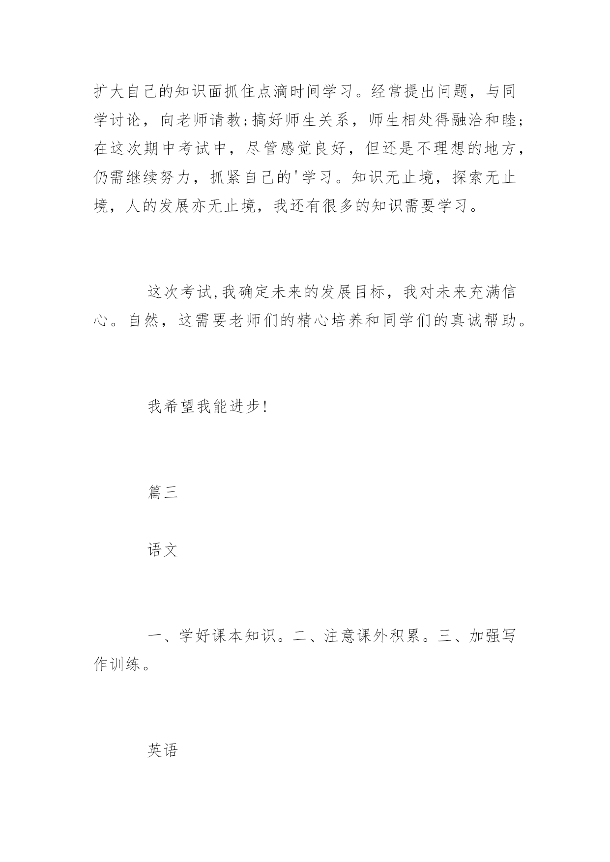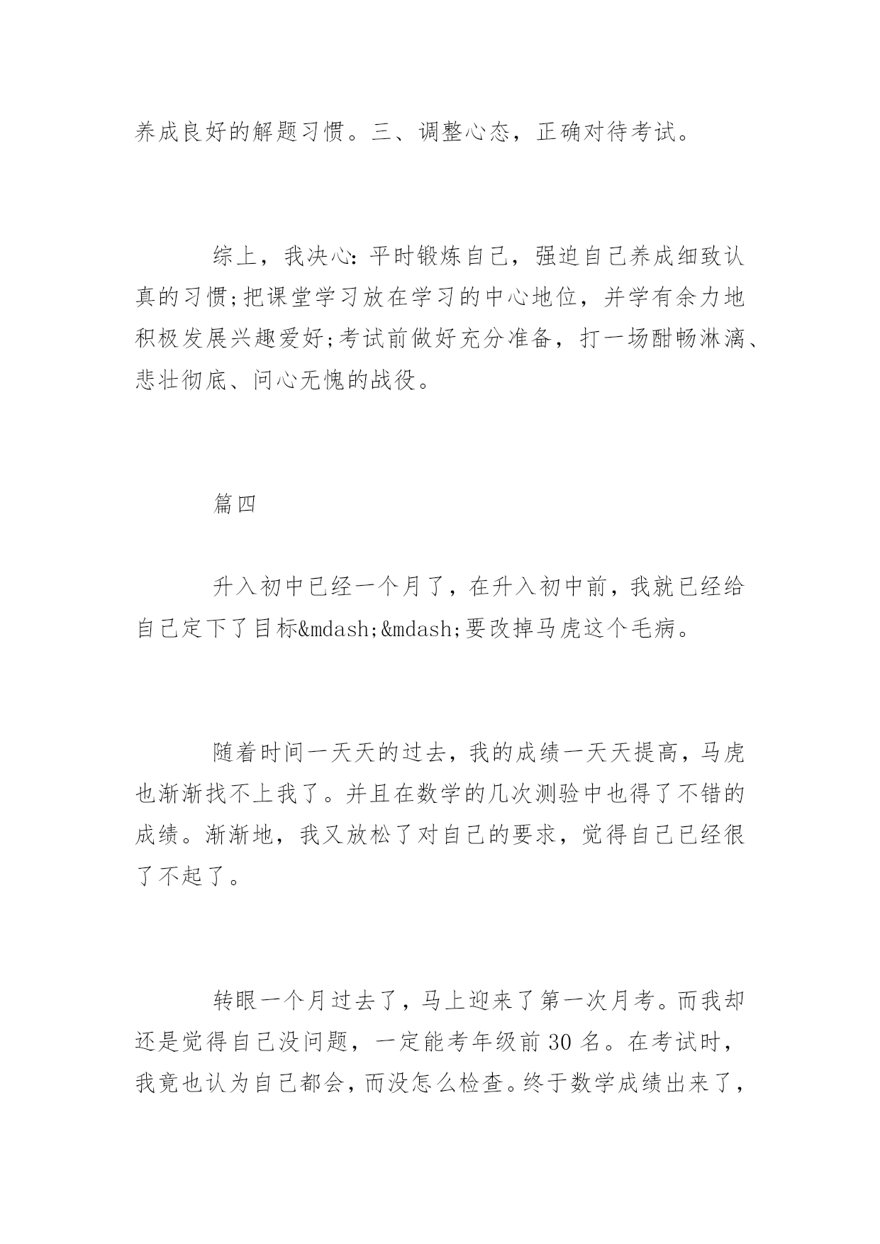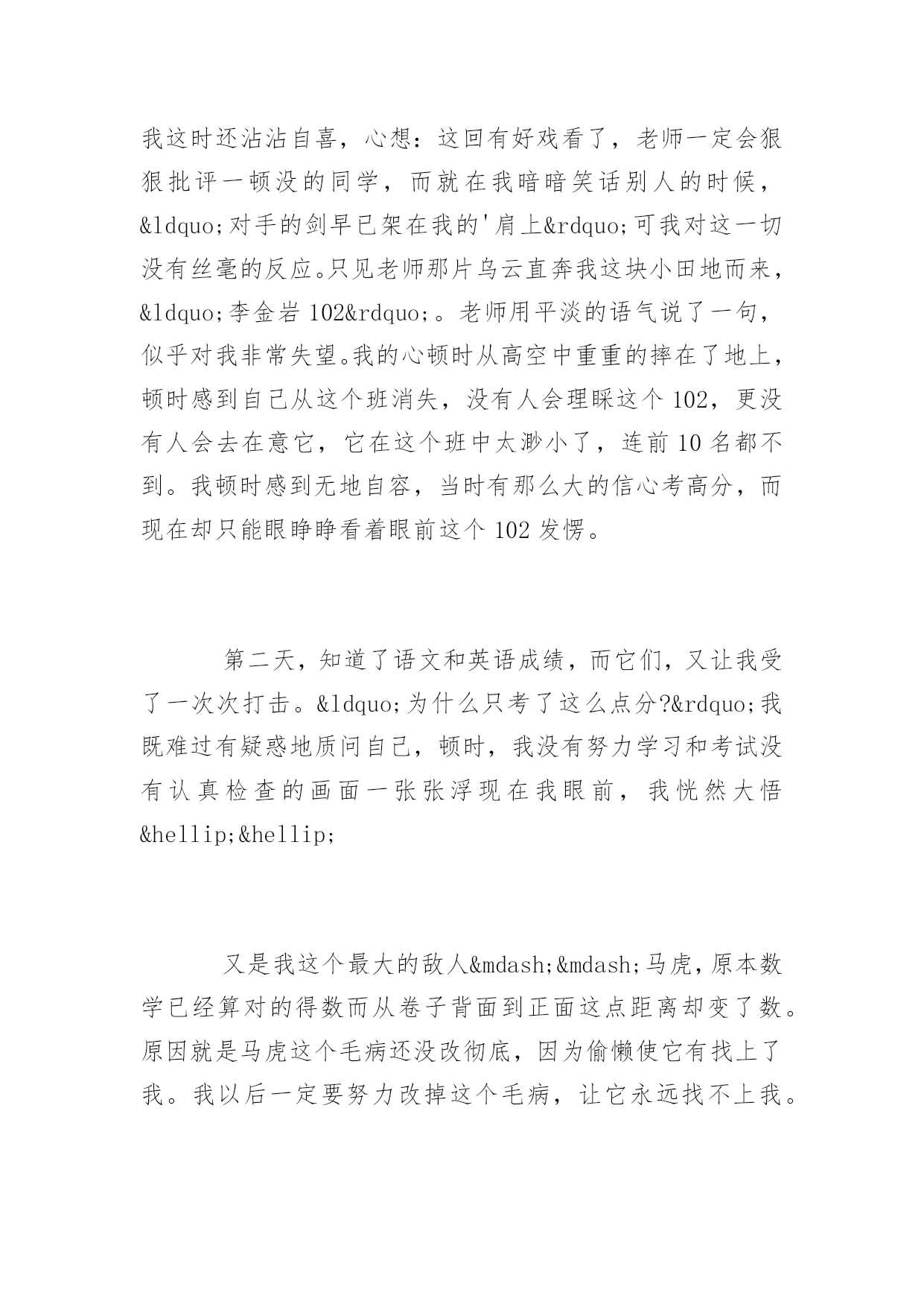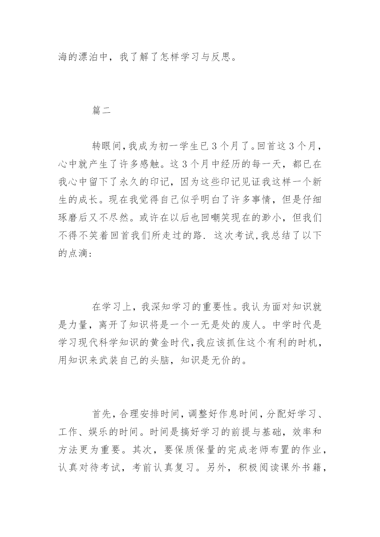 初一考试反思作文初一考试反思作文避免失败的最稳当办法,就是下决心获得成功。以下是小编为大家搜索整理的初一考试反思作文,欢迎大家阅读!更多精彩内容请及时关注我们应届毕业生考试网!篇一时间仿佛过的很快,一眨眼的功夫,却已学期过半。我仔细的倾听钟表的声音,仿佛感到了时光的流淌,生命的流逝。时间仿佛是一片大海,我仿佛是在大海中行舟的那个人。我在着大海中慢慢的成长,进步。刚上海时,由于不适应海上的生活,很长时间里,没有找到行舟的诀窍,因此,并没有比别人划得更好。等到花了六分之一时,才发觉原来划船在海中遨游是如此愉快,虽然需要费力,虽然需要慢慢的学习划船的技巧和精确度。但,我却依然感到快乐无比。因为在这个探究的过程中,我发现了一种超越自我的快乐。行舟不也正如学习一样吗?需要一个适应的过程,才能取得好成绩。可仔细想想,我真的只是因为不适应的关系么?我想有这个原因,但,完全归咎于它么?应该不吧!很多时候,本该当天学会的知识,由于自己的意志并不鉴定,也因为没有明确的奋斗目标,所以一拖再拖。拖到周末再学,导致很多该学的东西没有时间复习,最终有些东西一知半解学的不扎实,考试自然就会显露出这些不足之处。那么,既然知道了自己的问题出在哪里,就要加以改正与完善。从现在开始,只要我们能够每天学好当天学到的东西,并加以复习、巩固,这样日积月累,到了周末就会有足够多的时间来复习其他科目,保证万无一失,考试测验时,便会成竹在胸,十拿九稳,而且无论如何测验,都无所畏惧。还要给自己确立一个奋斗的目标,而这个目标,不能太高,也不能太低;太高的`话,当没有超过这个目标时,便会灰心丧气;太低的话,太过轻易的超过自己的标准,便没有超越自己的快感。所以,给自己你定目标也是必不可少的。我继续在学习的海洋中行舟前进着,慢慢地积累着在行舟过程中所找到的经验,努力地熟悉并掌握着。在这知识的积累中,我感到了时光的流淌,生命的流逝。而在这片大海的漂泊中,我了解了怎样学习与反思。篇二转眼间,我成为初一学生已3个月了。回首这3个月,心中就产生了许多感触。这3个月中经历的每一天,都已在我心中留下了永久的印记,因为这些印记见证我这样一个新生的成长。现在我觉得自己似乎明白了许多事情,但是仔细琢磨后又不尽然。或许在以后也回嘲笑现在的渺小,但我们不得不笑着回首我们所走过的路.这次考试,我总结了以下的点滴:在学习上,我深知学习的重要性。我认为面对知识就是力量,离开了知识将是一个一无是处的废人。中学时代是学习现代科学知识的黄金时代,我应该抓住这个有利的时机,用知识来武装自己的头脑,知识是无价的。首先,合理安排时间,调整好作息时间,分配好学习、工作、娱乐的时间。时间是搞好学习的前提与基础,效率和方法更为重要。其次,要保质保量的完成老师布置的作业,认真对待考试,考前认真复习。另外,积极阅读课外书籍,扩大自己的知识面抓住点滴时间学习。经常提出问题,与同学讨论,向老师请教;搞好师生关系,师生相处得融洽和睦;在这次期中考试中,尽管感觉良好,但还是不理想的地方,仍需继续努力,抓紧自己的'学习。知识无止境,探索无止境,人的发展亦无止境,我还有很多的知识需要学习。这次考试,我确定未来的发展目标,我对未来充满信心。自然,这需要老师们的精心培养和同学们的真诚帮助。我希望我能进步!篇三语文一、学好课本知识。二、注意课外积累。三、加强写作训练。英语在课堂上我们应该做到以下几点:1.静听。上课认真听讲,做好笔记,无论听、说、读、写都要使自己始终活跃。2.积极参与。要大胆地练习,敢说、敢读,积极回答老师提出的问题。3.勤动笔。把教师的重点及时迅速记在课堂记录本上。4.多开口。历史首先,学历史的人,必须明白为什么要学,学来有什么用。第二,学习历史要实事求是,可以去猜想和联想,但不要任意妄想,甚至毫无根据的乱加猜测。生物一、树立正确的生物学观点二、掌握科学的学习方法三、注重理论联系实际生物学的理论知识与自然、生产、生活都有较密切的.关系,在生物学学习中,要注意联系自然实际生产实际生活实际。政治(1)先看目录,不看正文,根据目录回忆相应的内容。(2)政治不能死记硬背,因为这样只会增加你对政治的厌恶。学好一门科的前提是喜欢他,最起码不能厌恶他!(3)记住一定要有一个知识体系,这样就会使你的思路清晰。地理首先,要认识学地理的重要性,才能自觉地对待学习。要学好地理,最重要的是读图和学习绘图,用图来帮助自己理解和记忆,做到“心中有图”。其次,要用联系的观点学习。数学一、课内重视听讲,课后及时复习。二、适当多做题,养成良好的解题习惯。三、调整心态,正确对待考试。综上,我决心:平时锻炼自己,强迫自己养成细致认真的习惯;把课堂学习放在学习的中心地位,并学有余力地积极发