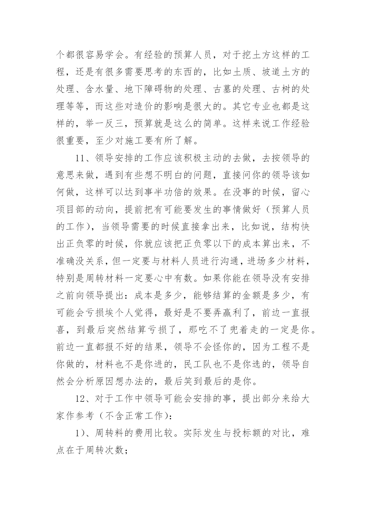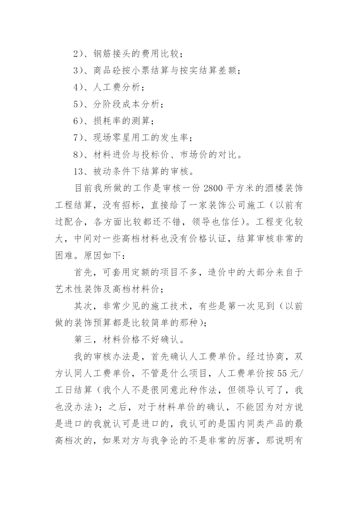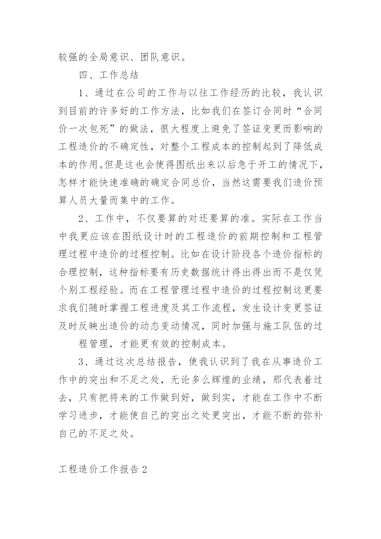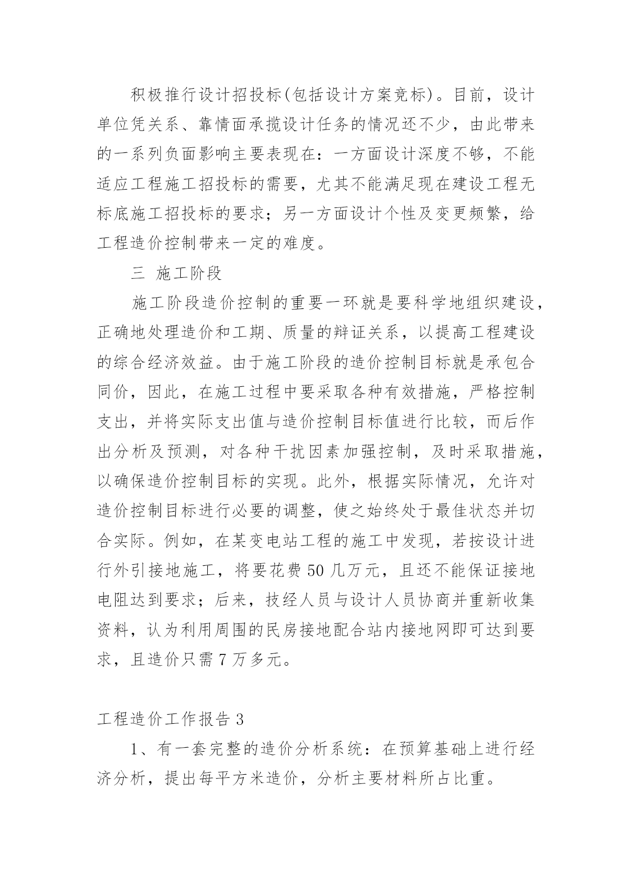 工程造价工作报告在经济发展迅速的今天,我们使用报告的情况越来越多,报告具有双向沟通性的特点。那么你真正懂得怎么写好报告吗?下面是小编为大家收集的工程造价工作报告,供大家参考借鉴,希望可以帮助到有需要的朋友。工程造价工作报告1我自10月参加工作以来,工作中,时常接触到与机电安装有关的工程结算和预算工作,在20xx年取得造价证之后,我可以作为一名造价人员正式参与到日常的预算工作中,转瞬即逝,三年来我也在工作中不断的学习进步,以下是我在这三年的工作总结,希望在总结经验的过程中,为以后的工作打下坚实的基础,不断提高自己的能力。一、工作业绩方面1、负责三水平转弯胶带输送机的基本建设零星安装工程,工程结算总造价35.6万元。2、负责-520胶带输送机安装,工程结算总造价20.4万元。3、负责3304下顺槽胶带输送机安装,工程结算总造价12万元。4、全程参与2208转向胶带输送机安装的过程造价、设计以及安装工作,包括图纸设计、加工、造价等,工程结算总造价50万元。这三年来,我对造价有了初步的了解,感觉到了学习的重要性,认识到好的业绩离不开领导正确的决策和个人的辛勤劳动,只有善于只有善于及时总结过去的成绩与过失,才能更好的提高我们的工作能力。二、继续教育培训方面1、在平时的工作中,收集有关造价、定额、工程量计算等方面的资料。熟悉有关预算等软件知识,不断提高自己的工作效率。了解有关定额各方面的知识,不断扩展自己的知识领域。2、积极参加有关造价的培训,增强自己的学习能力,认识从事造价工作的其他人员,加强自己的人际交流能力。三、职业道德方面1、态度决定质量。工作时的态度决定了工作的质量,在工作中,我时刻以造价员的职业道德为准则,始终保持严谨的工作态度,强烈的责任心,忠于职守,以公司的利益最大为最高行动准则。通过学习造价员如何进行预算、如何有效的节省成本以及在预算中如何使公司的利益最大化,让我真正的理解了造价预算在工作中的重要性。我深深的体会到每个员工的“执行力”就是企业的前进车轮,每一个员工的“结果第一,理由第二”就是企业的目标的实现。2、工作中需要团队精神。团队精神是我们企业能面对风雨更加从容,团队精神是我们部门工作更加完整迅速,因而我为融入到公司的团队之中并为建立一个良好的团队而努力感到而荣幸。所以,我在工作中,与同事密切协作,为工作顺利的完成尽最大的努力,能够很好的团结同事,具有较强的全局意识、团队意识。四、工作总结1、通过在公司的工作与以往工作经历的比较,我认识到目前的许多好的工作方法,比如我们在签订合同时“合同价一次包死”的做法,很大程度上避免了签证变更而影响的工程造价的不确定性,对整个工程成本的控制起到了降低成本的作用。但是这也会使得图纸出来以后急于开工的情况下,怎样才能快速准确的确定合同总价,当然这需要我们造价预算人员大量而集中的工作。2、工作中,不仅要算的对还要算的准。实际在工作当中我更应该在图纸设计时的工程造价的前期控制和工程管理过程中造价的过程控制。比如在设计阶段各个造价指标的合理控制,这种指标要有历史数据统计得出得出而不是仅凭个别工程经验。而在工程管理过程中造价的过程控制这更要求我们随时掌握工程进度及其工作流程,发生设计变更签证及时反映出造价的动态变动情况,同时加强与施工队伍的过程管理,才能更有效的控制成本。3、通过这次总结报告,使我认识到了我在从事造价工作中的突出和不足之处,无论多么辉煌的业绩,那代表着过去,只有把将来的工作做到好,做到实,才能在工作中不断学习进步,才能使自己的突出之处更突出,才能不断的弥补自己的不足之处。工程造价工作报告2建设单位对工程造价的控制就是在满足项目合理的质量标准的前提下,在投资决策阶段、设计阶段和建设项目实施阶段中把工程项目发生控制在批准的限额内,力求在各个建设项目中合理使用人力、物力、财力,取得较好的投资效益和社会效益。工程造价的控制与管理是一个动态的过程。市场经济的变化多端,使工程投资的确定与控制变得更为复杂,这就需要建设单位对工程造价的管理始终贯穿于项目的全过程,既要全面又要有侧重点。项目的实施阶段。实施阶段的工程造价管理是实施建设工程全过程管理的重点。关键词:业主工程造价造价管理工程造价的直意就是工程的建造价格。工程是指一切建设工程。对业主而言,工程造价的含义就是指一项工程预期开支或实际开支的全部固定资产投资费用,即工程投资费用。一般来说,建设工程都具有周期长、生产要素价格变化频繁、产品单件性、固定性等特征,使得建设工程的造价复杂多变,因此,业主方对其管理应贯穿于工程建设的全过程。包括建设工程的立项决策阶段、设计阶段、招阶段和施工阶段。下面我仅根据我的工作经验及一些设想,针对以上四个方面分别谈谈业主方在工程造价管理过程中的作用和应注意的问题。一、立项决策阶段在这一阶段,业主对工程造价