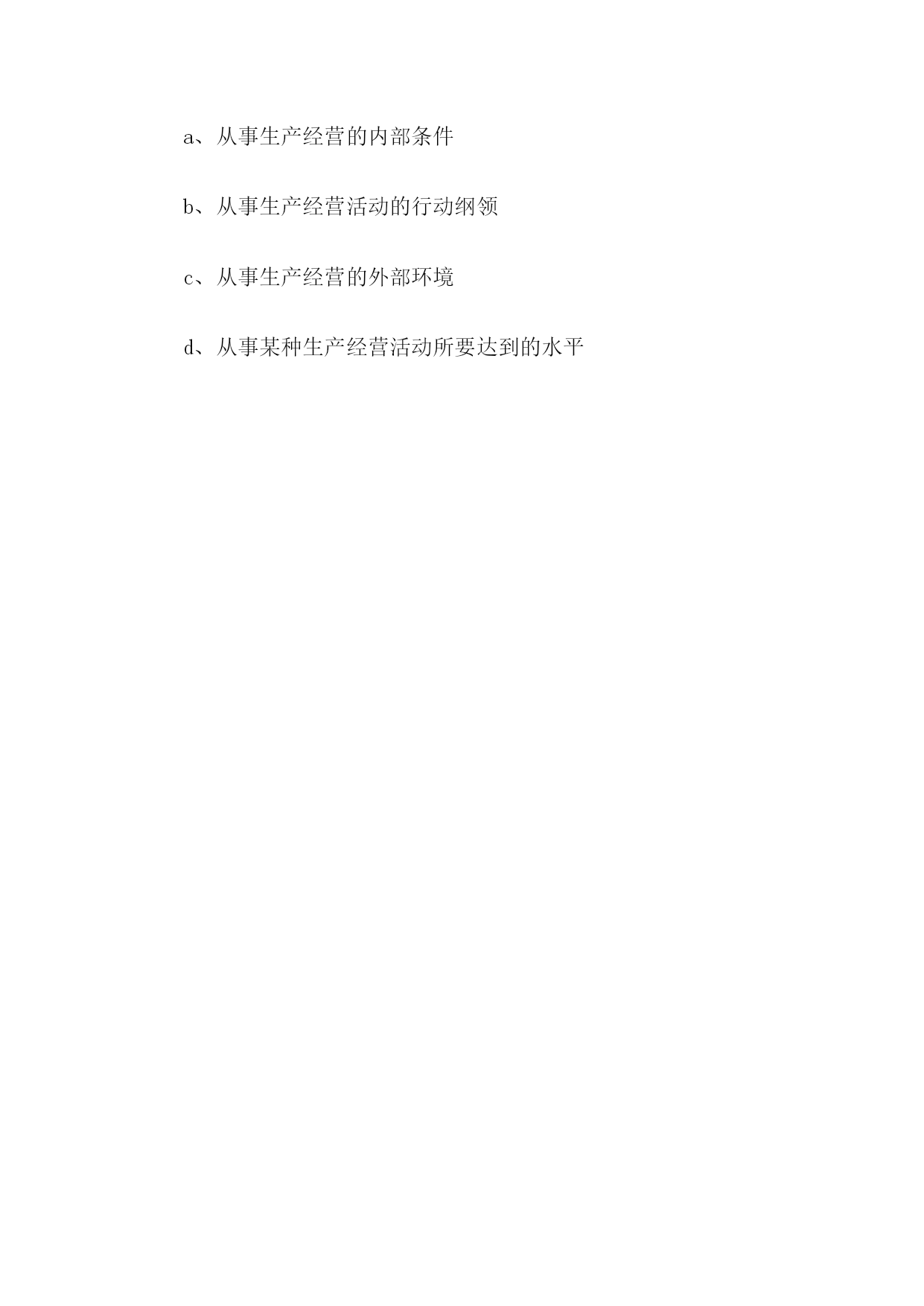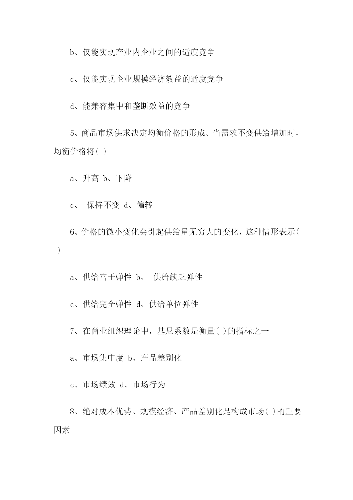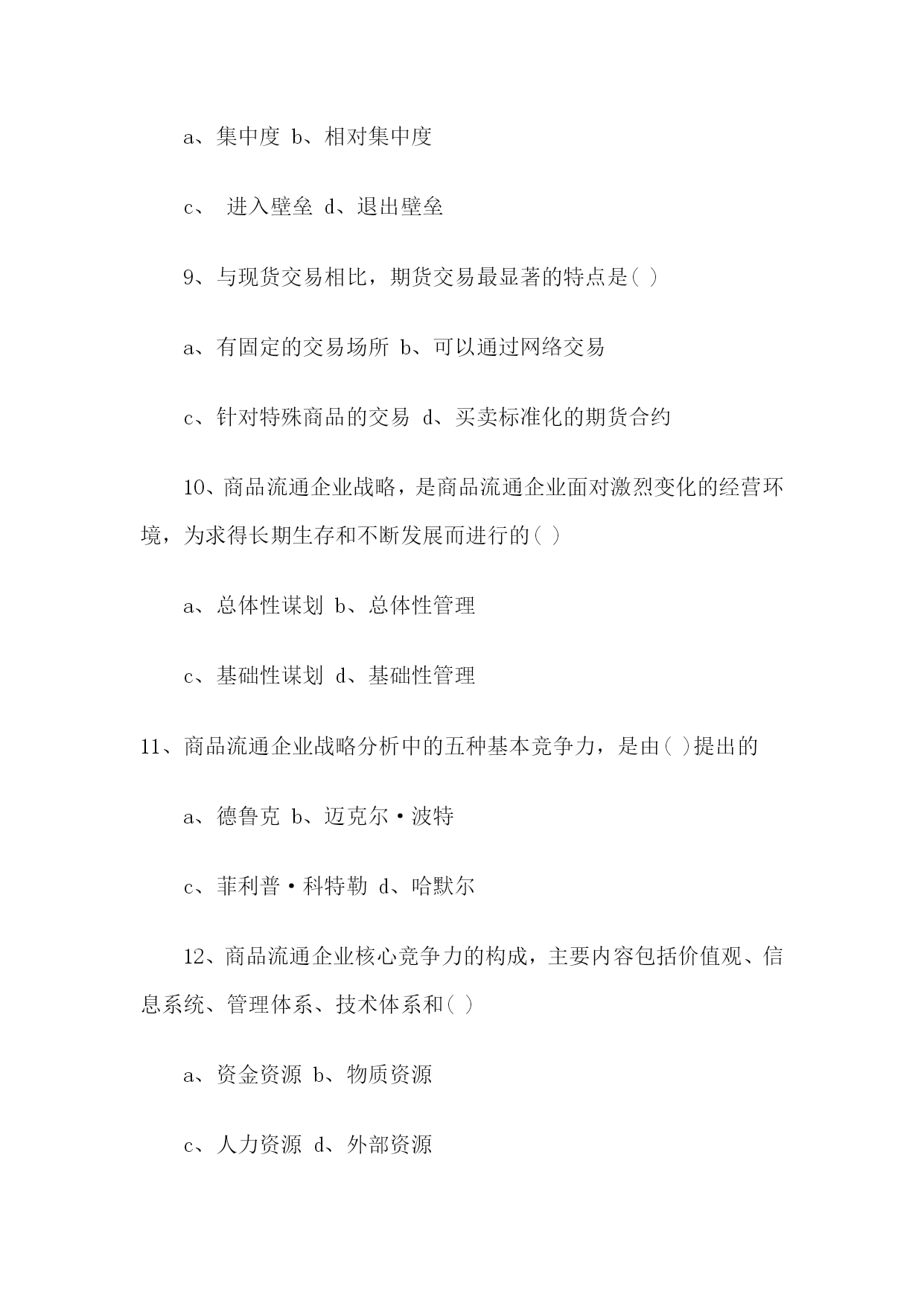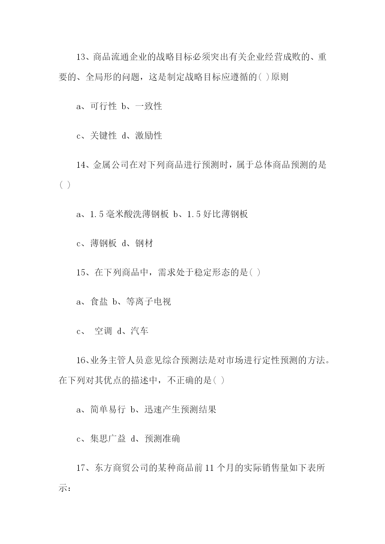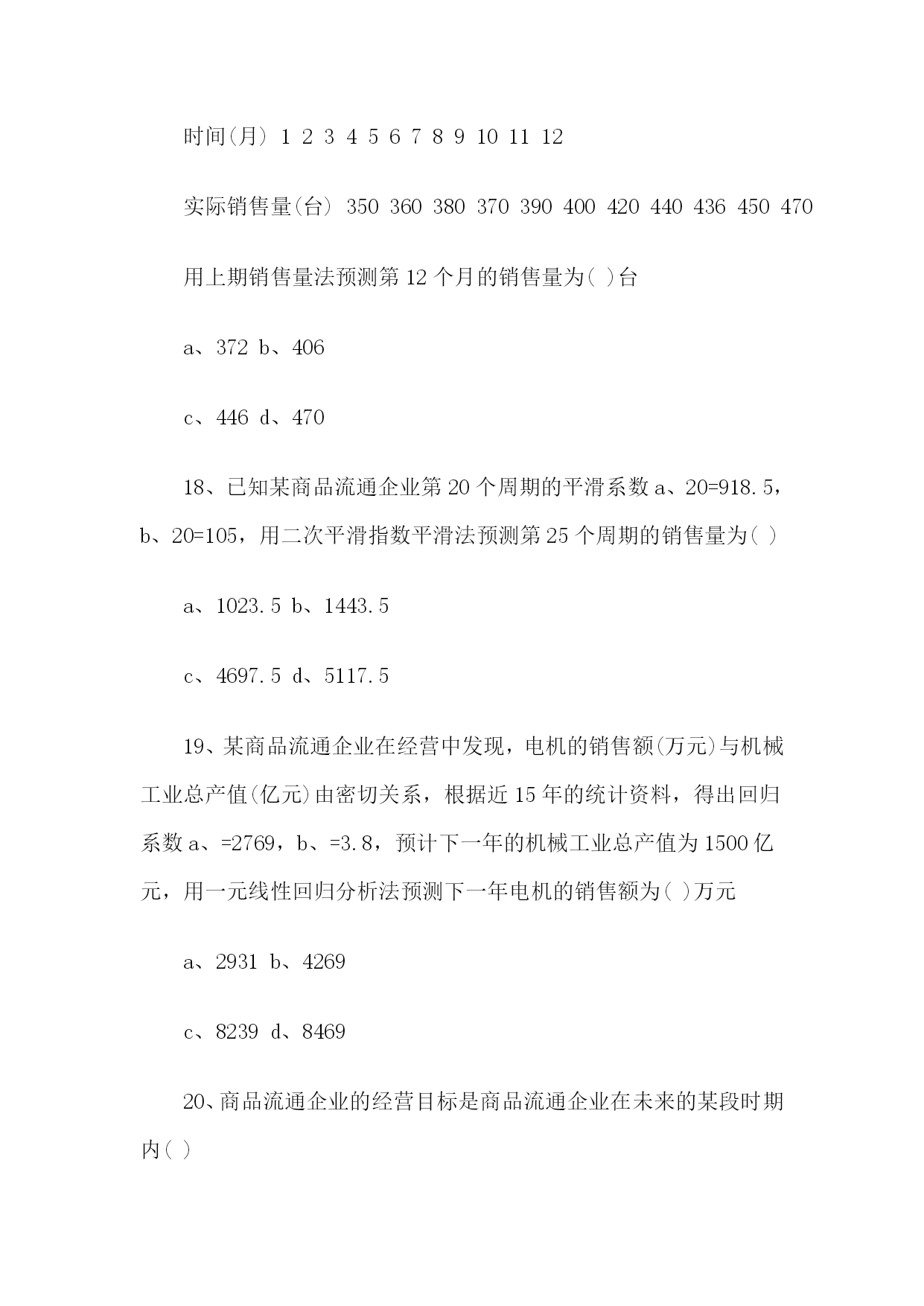 2004年HYPERLINK"http://www.jjsexam.com/"中级经济师商业经济专业知识与实务试题一、单选题(只有1个最符合题意)1、在商品流通过程中,流通信息在实现其使用价值的同时,还会实现其()a、价值b、交换价值c、价值增值d、价值转化2、用“重心法”确定配送中心的位置,就是要确定本地区商品()所在的位置,并使配送中心的选址靠近这一重点a、运输费重心b、运输距离重心c、运输量重心d、运输服务重心3、零售商店选址的第一步是要描述和评估可供选择的()a、位置b、商圈c、业态d、顾客群4、流通产业组织政策的一般目标是促进有效竞争,其中的有效竞争是指()a、能兼容竞争活力和规模经济效益的竞争b、仅能实现产业内企业之间的适度竞争c、仅能实现企业规模经济效益的适度竞争d、能兼容集中和垄断效益的竞争5、商品市场供求决定均衡价格的形成。当需求不变供给增加时,均衡价格将()a、升高b、下降c、保持不变d、偏转6、价格的微小变化会引起供给量无穷大的变化,这种情形表示()a、供给富于弹性b、供给缺乏弹性c、供给完全弹性d、供给单位弹性7、在商业组织理论中,基尼系数是衡量()的指标之一a、市场集中度b、产品差别化c、市场绩效d、市场行为8、绝对成本优势、规模经济、产品差别化是构成市场()的重要因素a、集中度b、相对集中度c、进入壁垒d、退出壁垒9、与现货交易相比,期货交易最显著的特点是()a、有固定的交易场所b、可以通过网络交易c、针对特殊商品的交易d、买卖标准化的期货合约10、商品流通企业战略,是商品流通企业面对激烈变化的经营环境,为求得长期生存和不断发展而进行的()a、总体性谋划b、总体性管理c、基础性谋划d、基础性管理11、商品流通企业战略分析中的五种基本竞争力,是由()提出的a、德鲁克b、迈克尔·波特c、菲利普·科特勒d、哈默尔12、商品流通企业核心竞争力的构成,主要内容包括价值观、信息系统、管理体系、技术体系和()a、资金资源b、物质资源c、人力资源d、外部资源13、商品流通企业的战略目标必须突出有关企业经营成败的、重要的、全局形的问题,这是制定战略目标应遵循的()原则a、可行性b、一致性c、关键性d、激励性14、金属公司在对下列商品进行预测时,属于总体商品预测的是()a、1.5毫米酸洗薄钢板b、1.5好比薄钢板c、薄钢板d、钢材15、在下列商品中,需求处于稳定形态的是()a、食盐b、等离子电视c、空调d、汽车16、业务主管人员意见综合预测法是对市场进行定性预测的方法。在下列对其优点的描述中,不正确的是()a、简单易行b、迅速产生预测结果c、集思广益d、预测准确17、东方商贸公司的某种商品前11个月的实际销售量如下表所示:时间(月)123456789101112实际销售量(台)350360380370390400420440436450470用上期销售量法预测第12个月的销售量为()台a、372b、406c、446d、47018、已知某商品流通企业第20个周期的平滑系数a、20=918.5,b、20=105,用二次平滑指数平滑法预测第25个周期的销售量为()a、1023.5b、1443.5c、4697.5d、5117.519、某商品流通企业在经营中发现,电机的销售额(万元)与机械工业总产值(亿元)由密切关系,根据近15年的统计资料,得出回归系数a、=2769,b、=3.8,预计下一年的机械工业总产值为1500亿元,用一元线性回归分析法预测下一年电机的销售额为()万元a、2931b、4269c、8239d、8469HYPERLINK"http://www.jjsexam.com/"经济师考试20、商品流通企业的经营目标是商品流通企业在未来的某段时期内()a、从事生产经营的内部条件b、从事生产经营活动的行动纲领c、从事生产经营的外部环境d、从事某种生产经营活动所要达到的水平