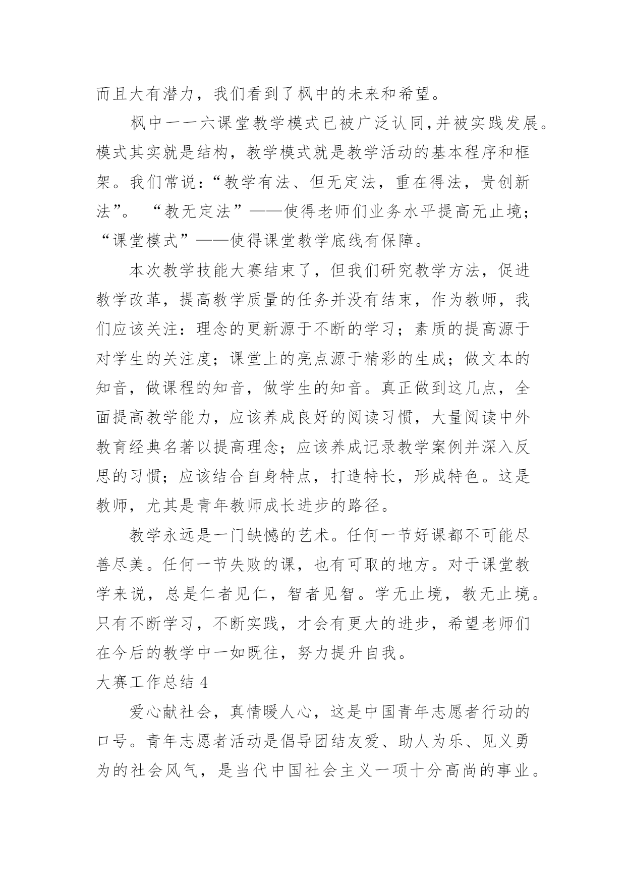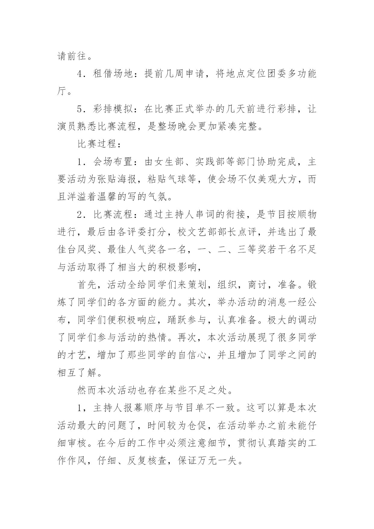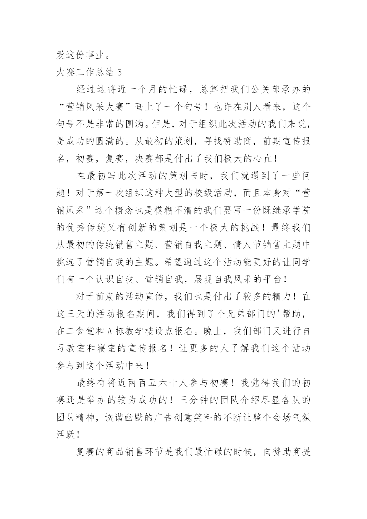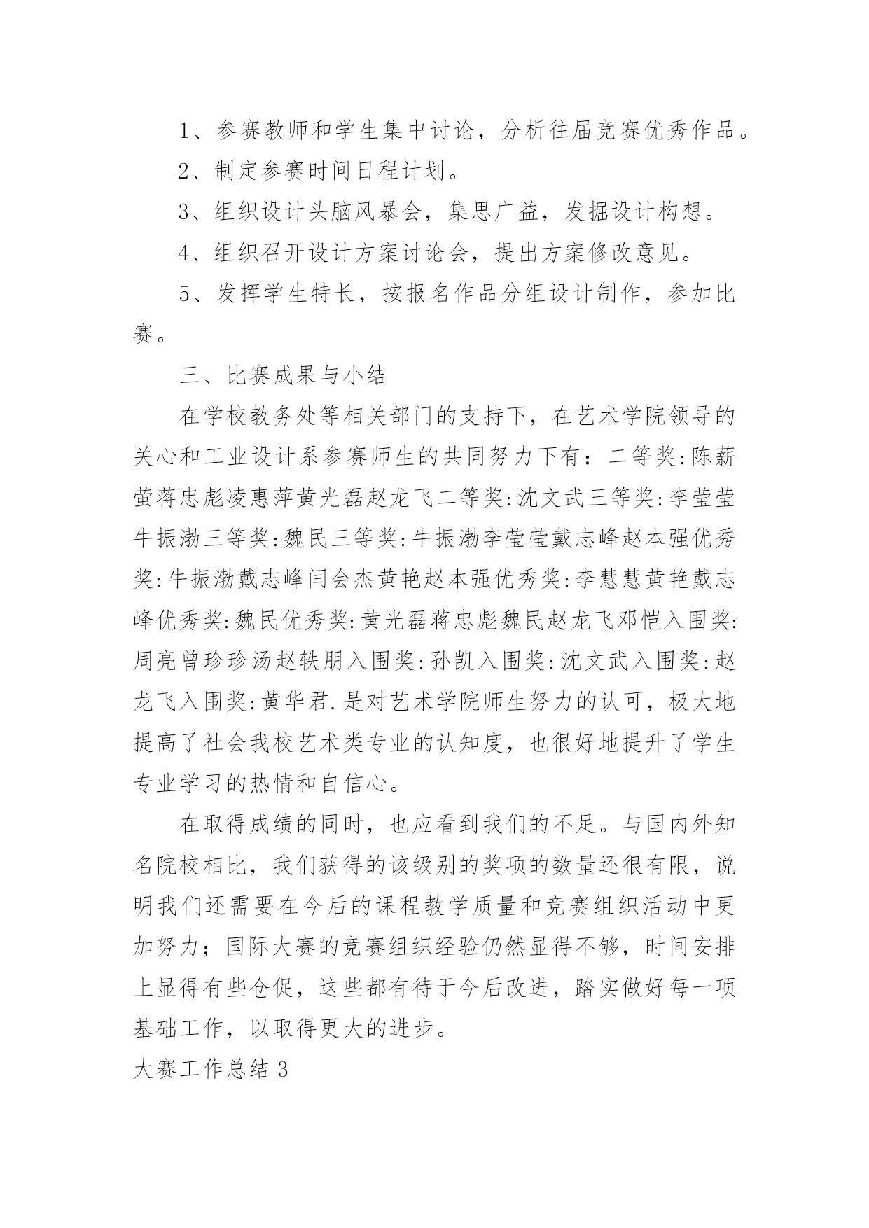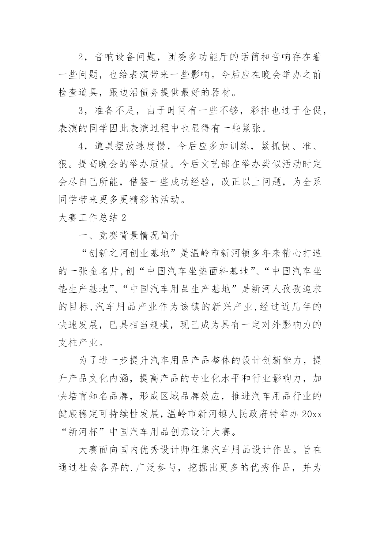 大赛工作总结大赛工作总结总结是对某一阶段的工作、学习或思想中的经验或情况进行分析研究的书面材料,它可以有效锻炼我们的语言组织能力,因此我们需要回头归纳,写一份总结了。那么你真的懂得怎么写总结吗?下面是小编为大家收集的大赛工作总结,仅供参考,希望能够帮助到大家。大赛工作总结120xx年11月13日,我部在校团委、院党委老师的指导下,举办了属于11级新生自己的才艺大赛,旨在发掘新生才艺,活跃校园文化氛围。整个活动有条不紊地进行,展现了大一新生的个人风采与艺术魅力。参赛节目形式多样,内容丰富,洋溢着青春与朝气,表现了当代大学生较高的艺术文化修养,获得了到场嘉宾的一致好评。将工作总结如下:赛前准备:1.材料、表格制作:材料包括节目信息汇总、节目单、评委打分条。评分标准等等。每一份材料的制作,都包含着文艺部成员的心血。2.召开会议安排工作:在学生会例会上,邀请其他部门协助并配合,安排与分配其他部门的工作。3.邀请其他各院的评委及本院的`老师,送达请柬,邀请前往。4.租借场地:提前几周申请,将地点定位团委多功能厅。5.彩排模拟:在比赛正式举办的几天前进行彩排,让演员熟悉比赛流程,是整场晚会更加紧凑完整。比赛过程:1.会场布置:由女生部、实践部等部门协助完成,主要活动为张贴海报,粘贴气球等,使会场不仅美观大方,而且洋溢着温馨的写的气氛。2.比赛流程:通过主持人串词的衔接,是节目按顺物进行,最后由各评委打分,校文艺部部长点评,并选出了最佳台风奖、最佳人气奖各一名,一、二、三等奖若干名不足与活动取得了相当大的积极影响,首先,活动全给同学们来策划,组织,商讨,准备。锻炼了同学们的各方面的能力。其次,举办活动的消息一经公布,同学们便积极响应,踊跃参与,认真准备。极大的调动了同学们参与活动的热情。再次,本次活动展现了很多同学的才艺,增加了那些同学的自信心,并且增加了同学之间的相互了解。然而本次活动也存在某些不足之处。1,主持人报幕顺序与节目单不一致。这可以算是本次活动最大的问题了,时间较为仓促,在活动举办之前未能仔细审核。在今后的工作中必须注意细节,贯彻认真踏实的工作作风,仔细、反复核查,保证万无一失。2,音响设备问题,团委多功能厅的话筒和音响存在着一些问题,也给表演带来一些影响。今后应在晚会举办之前检查道具,跟边沿债务提供最好的器材。3,准备不足,由于时间有一些不够,彩排也过于仓促,表演的同学因此表演过程中也显得有一些紧张。4,道具摆放速度慢,今后应多加训练,紧抓快、准、狠。提高晚会的举办质量。今后文艺部在举办类似活动时定会尽自己所能,借鉴一些成功经验,改正以上问题,为全系同学带来更多更精彩的活动。大赛工作总结2一、竞赛背景情况简介“创新之河创业基地”是温岭市新河镇多年来精心打造的一张金名片,创“中国汽车坐垫面料基地”、“中国汽车坐垫生产基地”、“中国汽车用品生产基地”是新河人孜孜追求的目标,汽车用品产业作为该镇的新兴产业,经过近几年的快速发展,已具相当规模,现已成为具有一定对外影响力的支柱产业。为了进一步提升汽车用品产品整体的设计创新能力,提升产品文化内涵,提高产品的专业化水平和行业影响力,加快培育知名品牌,形成区域品牌效应,推进汽车用品行业的健康稳定可持续性发展,温岭市新河镇人民政府特举办20xx“新河杯”中国汽车用品创意设计大赛。大赛面向国内优秀设计师征集汽车用品设计作品。旨在通过社会各界的.广泛参与,挖掘出更多的优秀作品,并为汽车用品企业寻找到优秀设计人才,搭建起创作者、科研院校、企业间交流与合作的互动平台,共同促进汽车用品产业发展壮大,创作人才不断涌现,产业链健康发展。“创新之河创业基地”是温岭市新河镇多年来精心打造的一张金名片,创“中国汽车坐垫面料基地”、“中国汽车坐垫生产基地”、“中国汽车用品生产基地”是新河人孜孜追求的目标,汽车用品产业作为该镇的新兴产业,经过近几年的快速发展,已具相当规模,现已成为具有一定对外影响力的支柱产业。为了进一步提升汽车用品产品整体的设计创新能力,提升产品文化内涵,提高产品的专业化水平和行业影响力,加快培育知名品牌,形成区域品牌效应,推进汽车用品行业的健康稳定可持续性发展,温岭市新河镇人民政府特举办20xx“新河杯”中国汽车用品创意设计大赛。大赛面向国内优秀设计师征集汽车用品设计作品。旨在通过社会各界的广泛参与,挖掘出更多的优秀作品,并为汽车用品企业寻找到优秀设计人才,搭建起创作者、科研院校、企业间交流与合作的互动平台,共同促进汽车用品产业发展壮大,创作人才不断涌现,产业链健康发展。二、设计竞赛组织工作安排艺术学院非常重视此次竞赛参赛组织工作,由教学副院长罗时武统一领导,工业设计系主任况宇翔、教师韩吉安负责具体实施,带领创新人才培养工作室学生参与该项竞赛。竞赛组织工作主要从以下几方面展开:1、参赛教师和